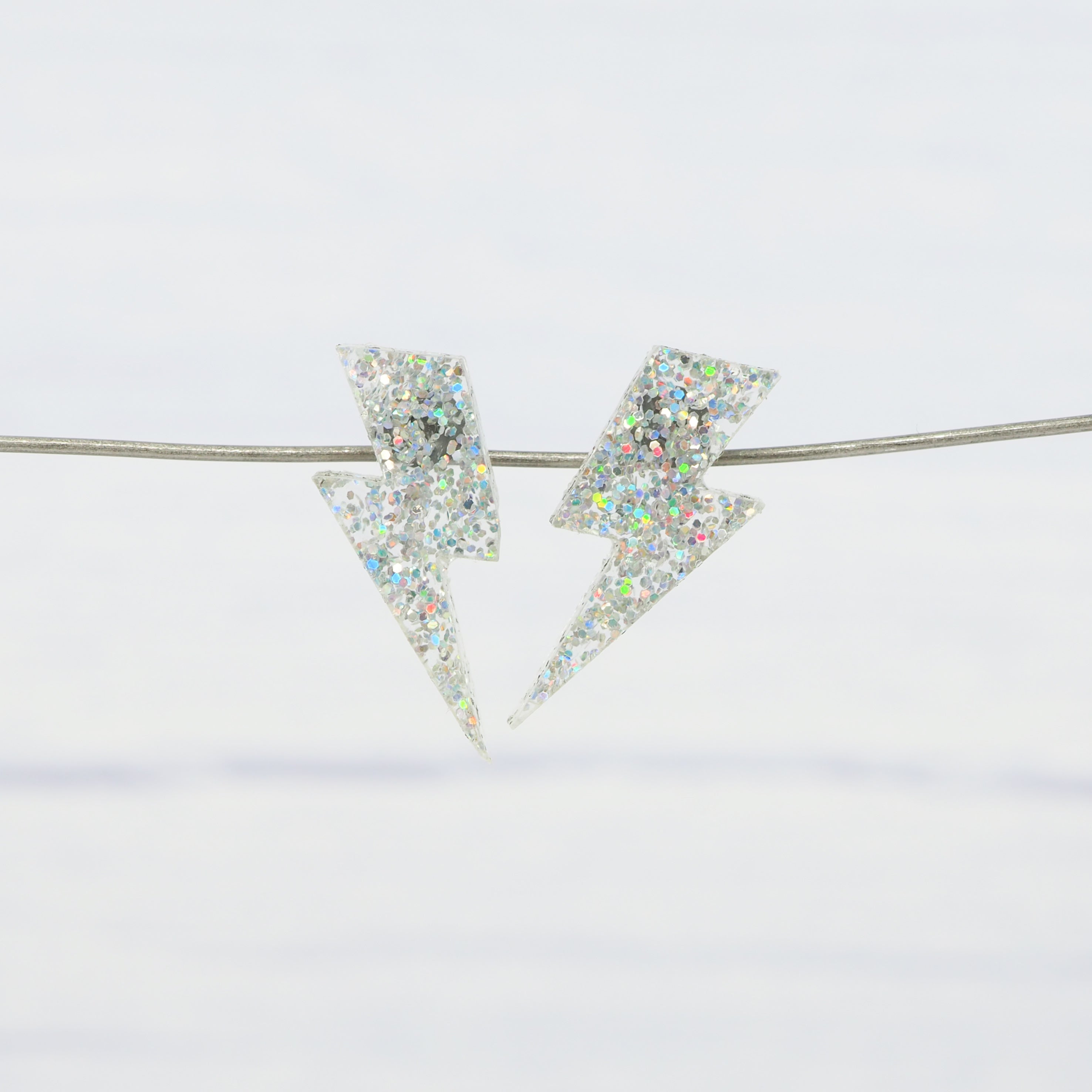 Holographic glitter lightning bolt studs with 0.7mm ear stems.