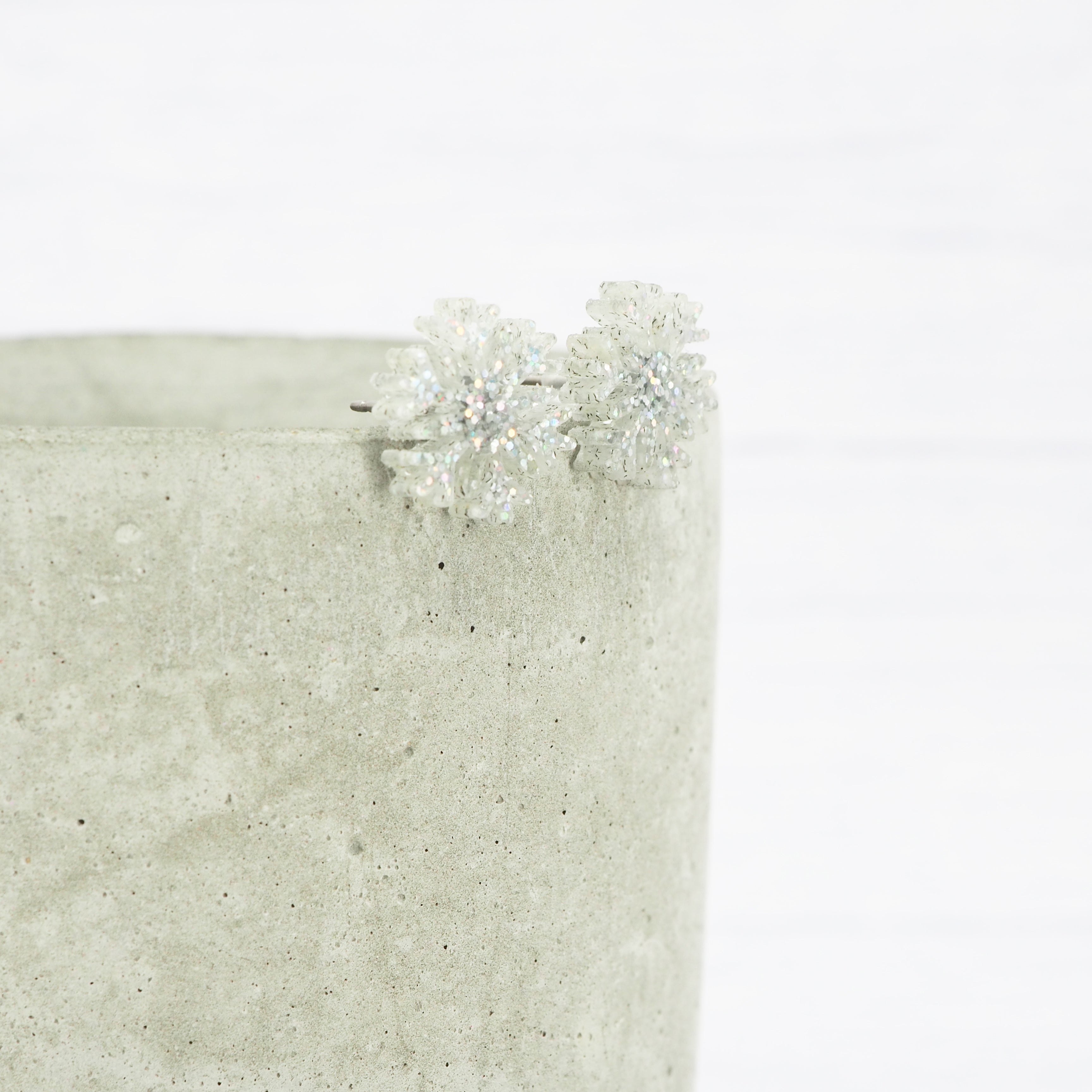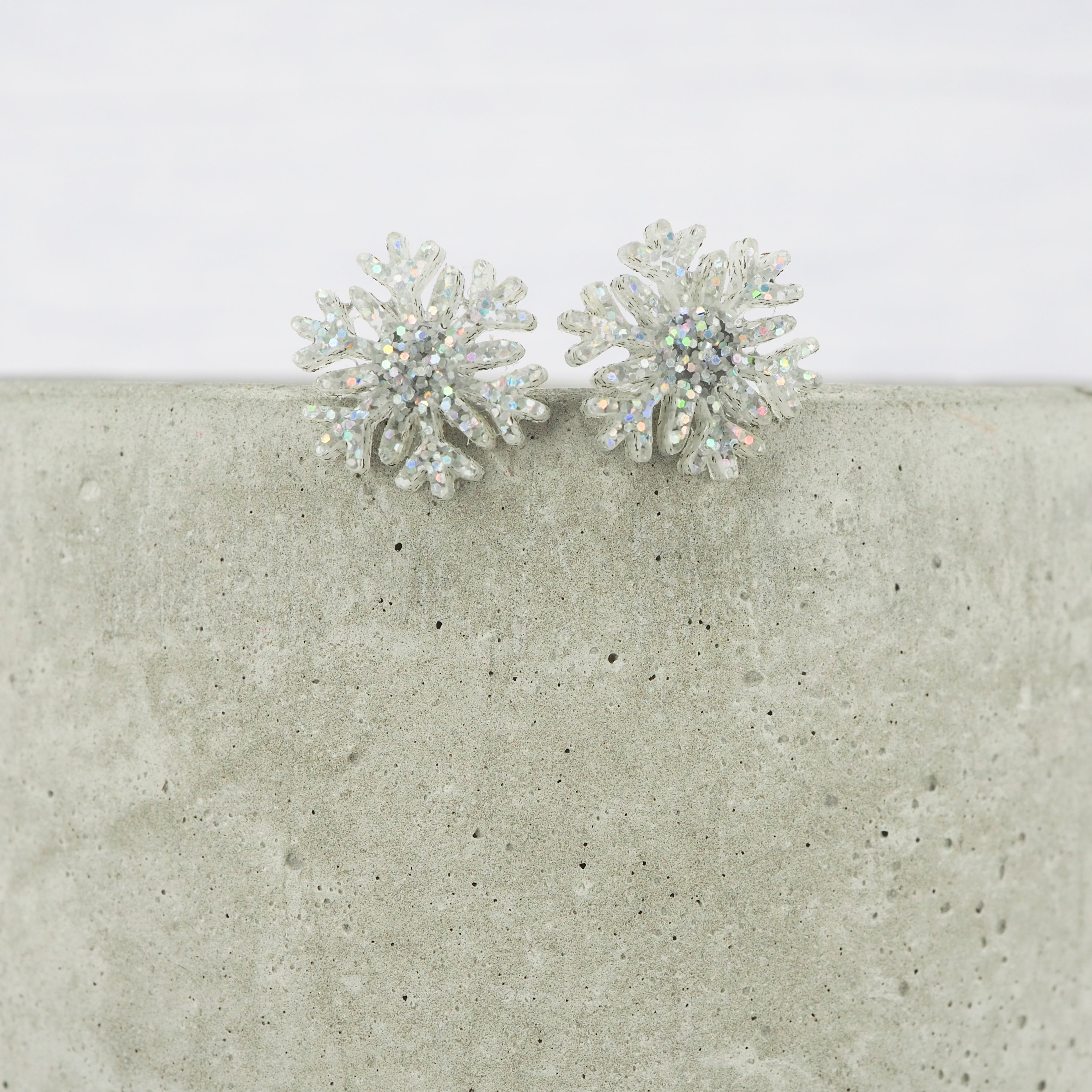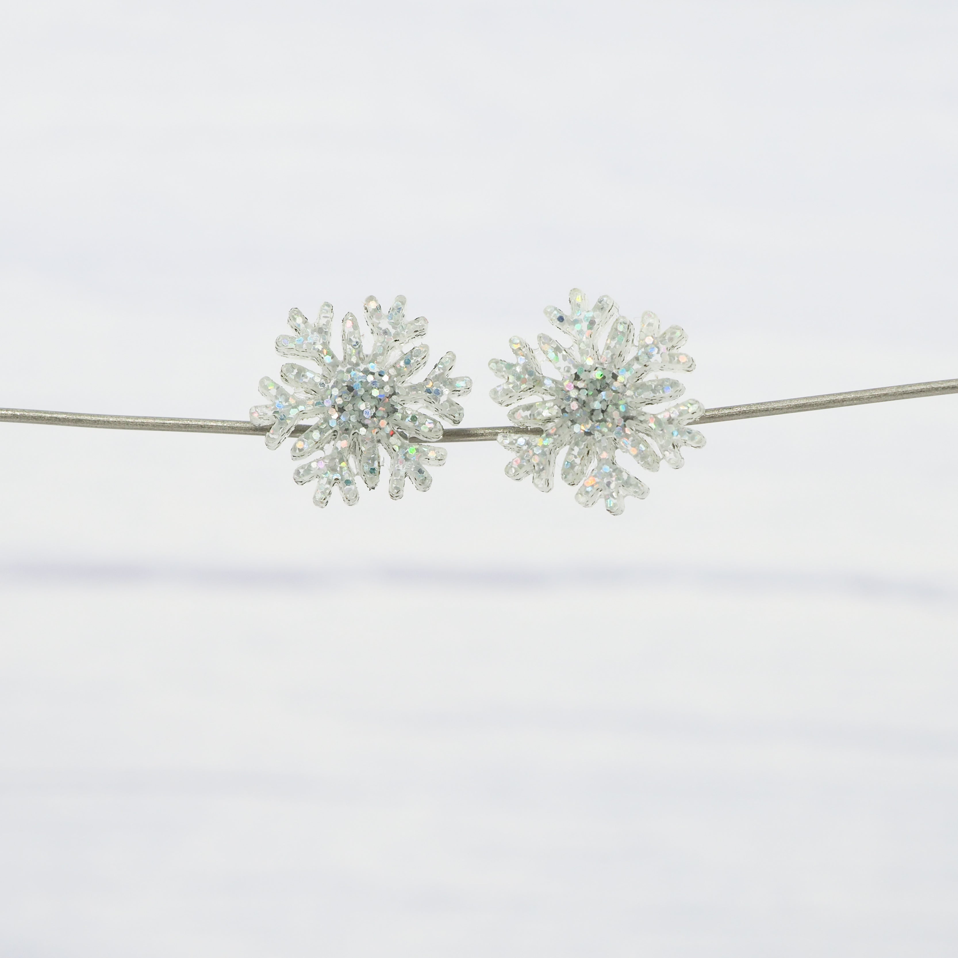 Holographic glitter snowflake acrylic studs with 0.7mm ear stems.