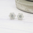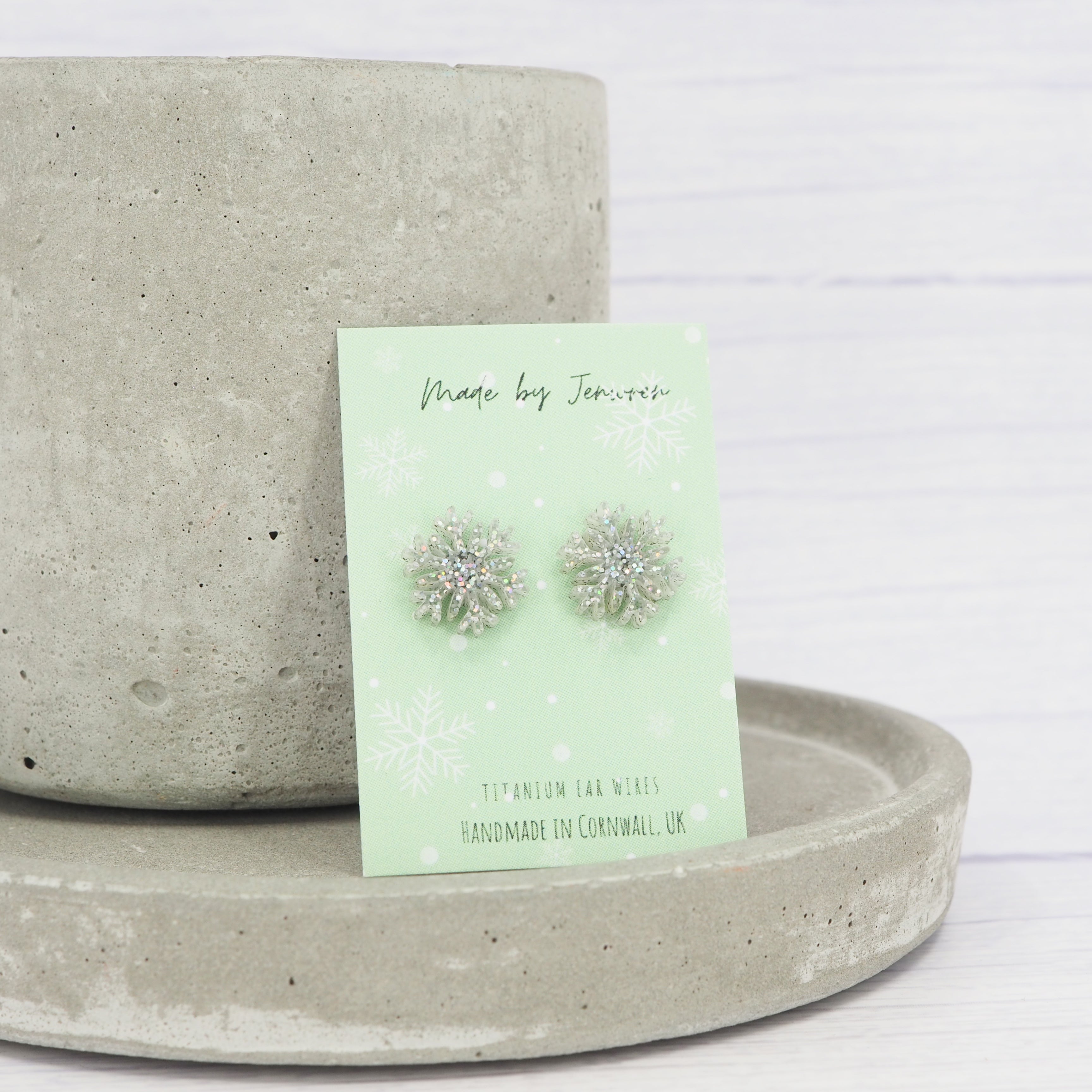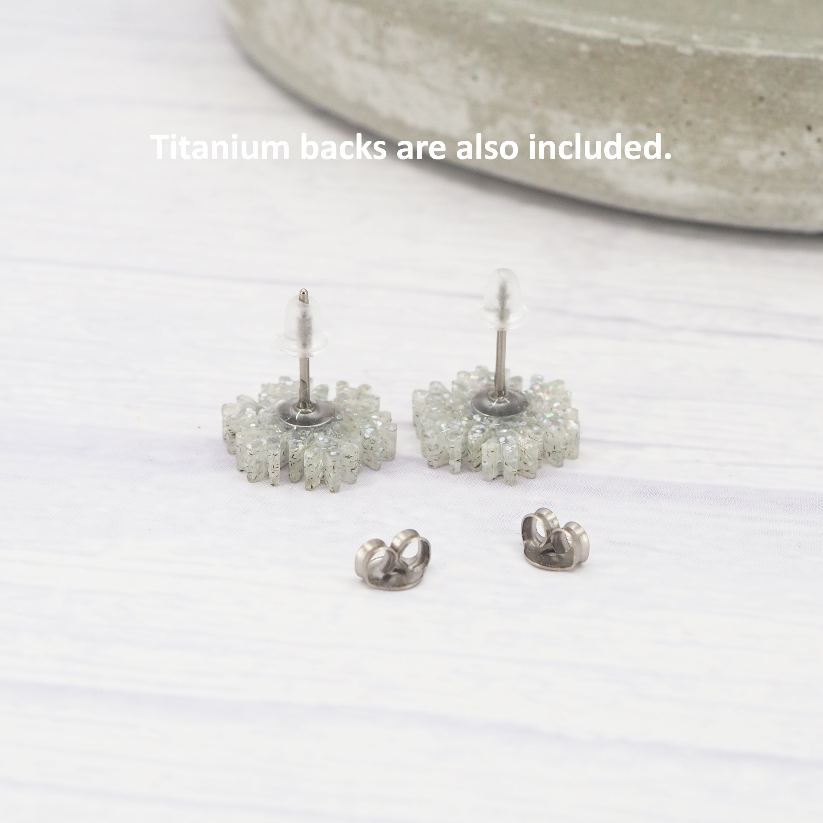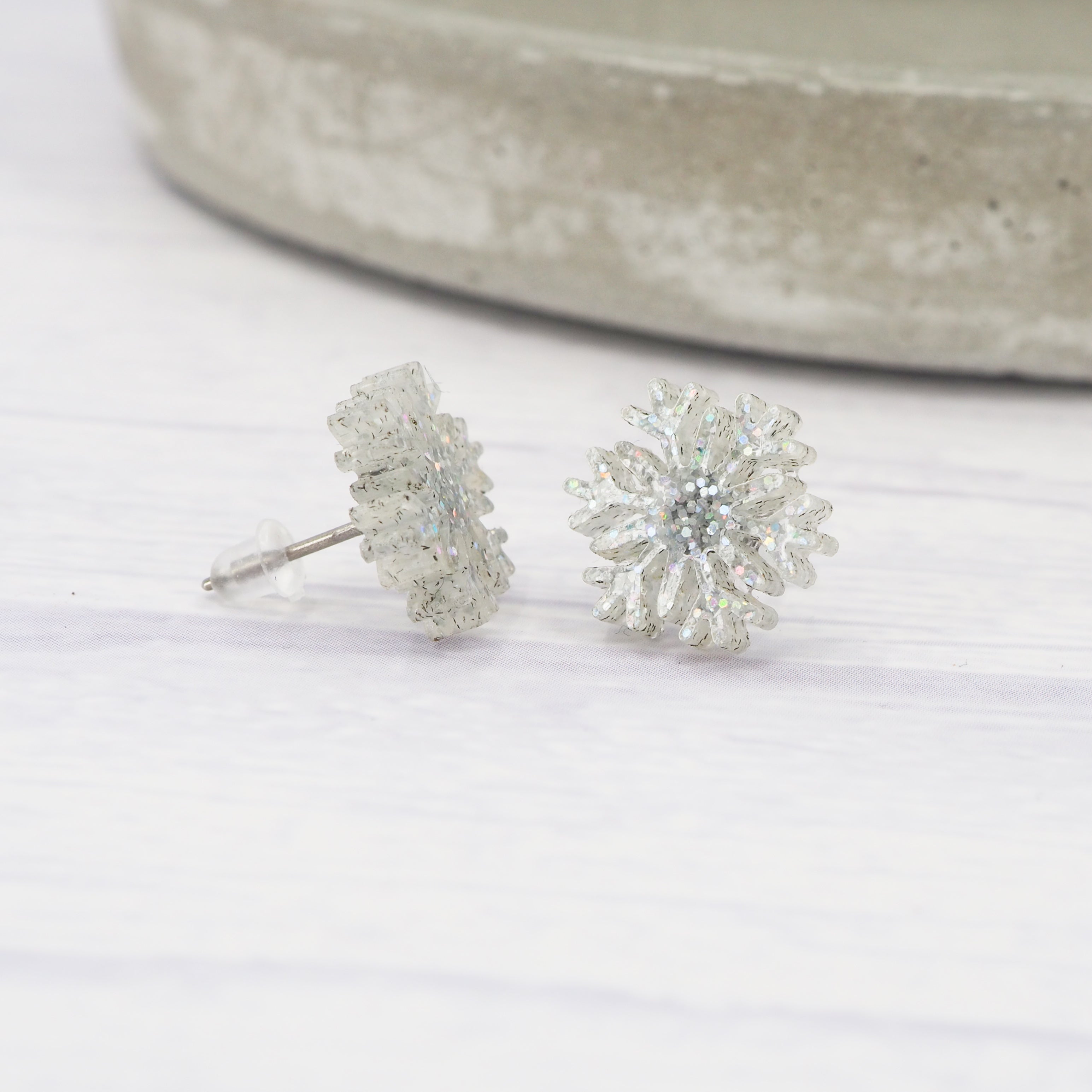 Holographic glitter snowflake acrylic studs with 0.7mm ear stems.