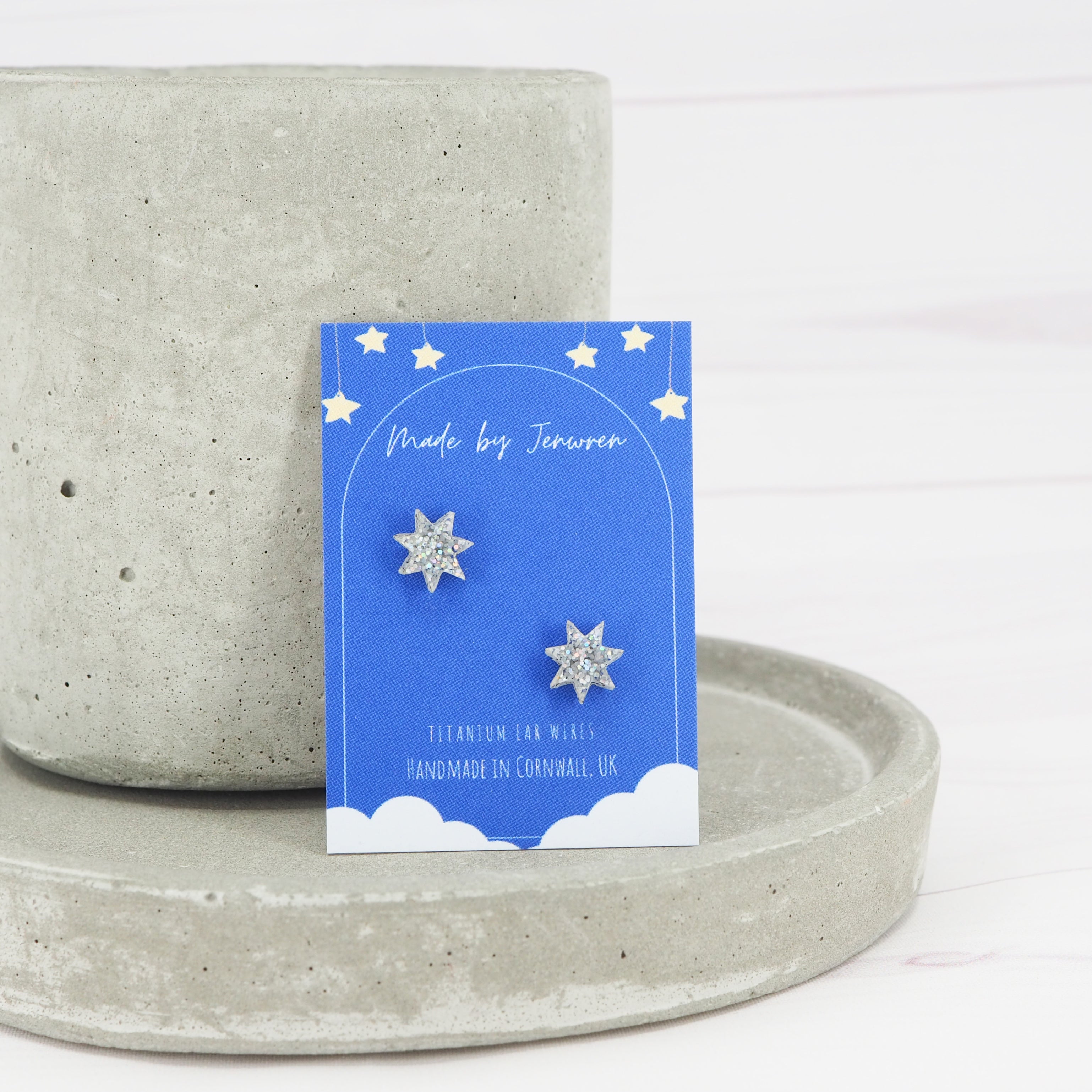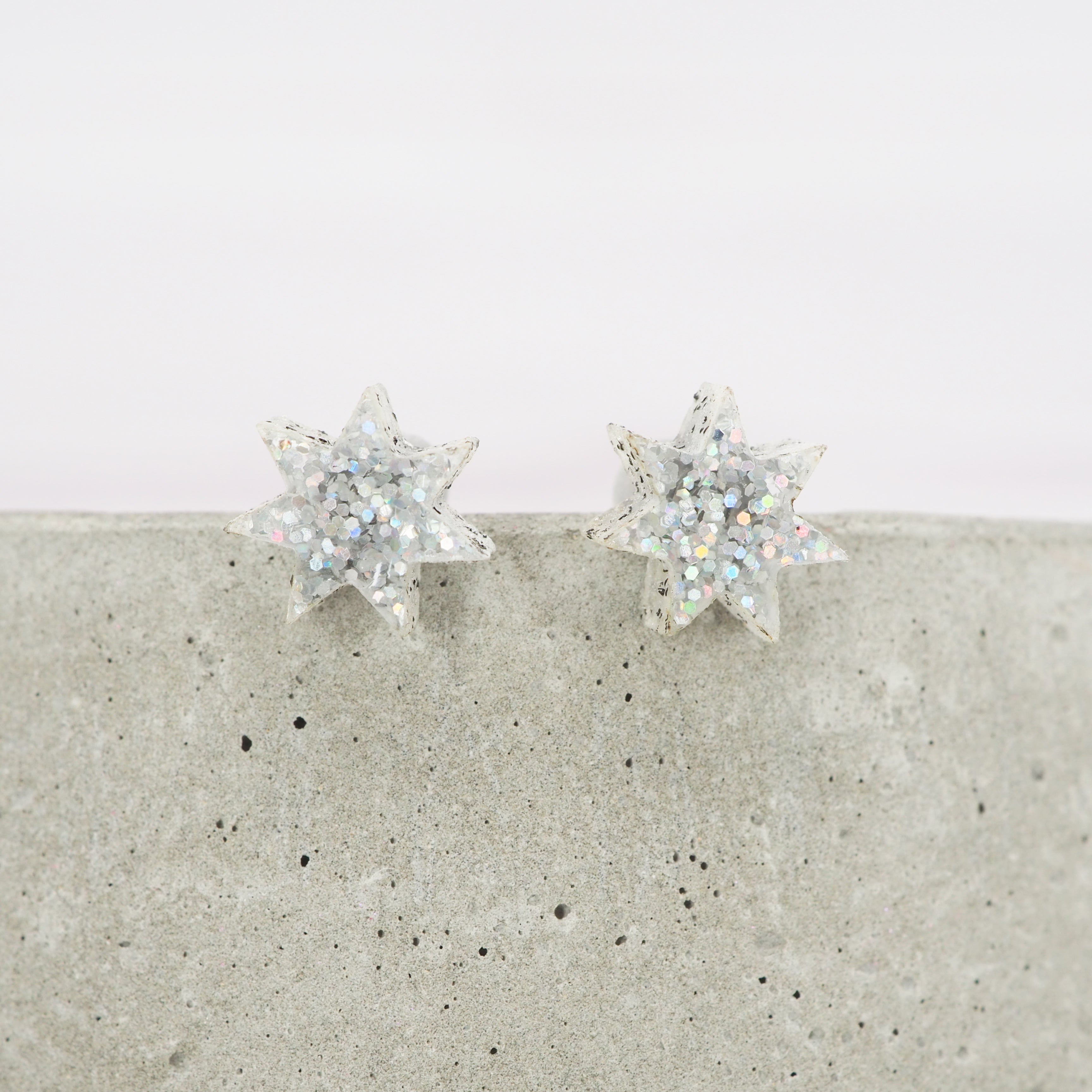 Holographic glitter star acrylic studs with 0.7mm ear stems.