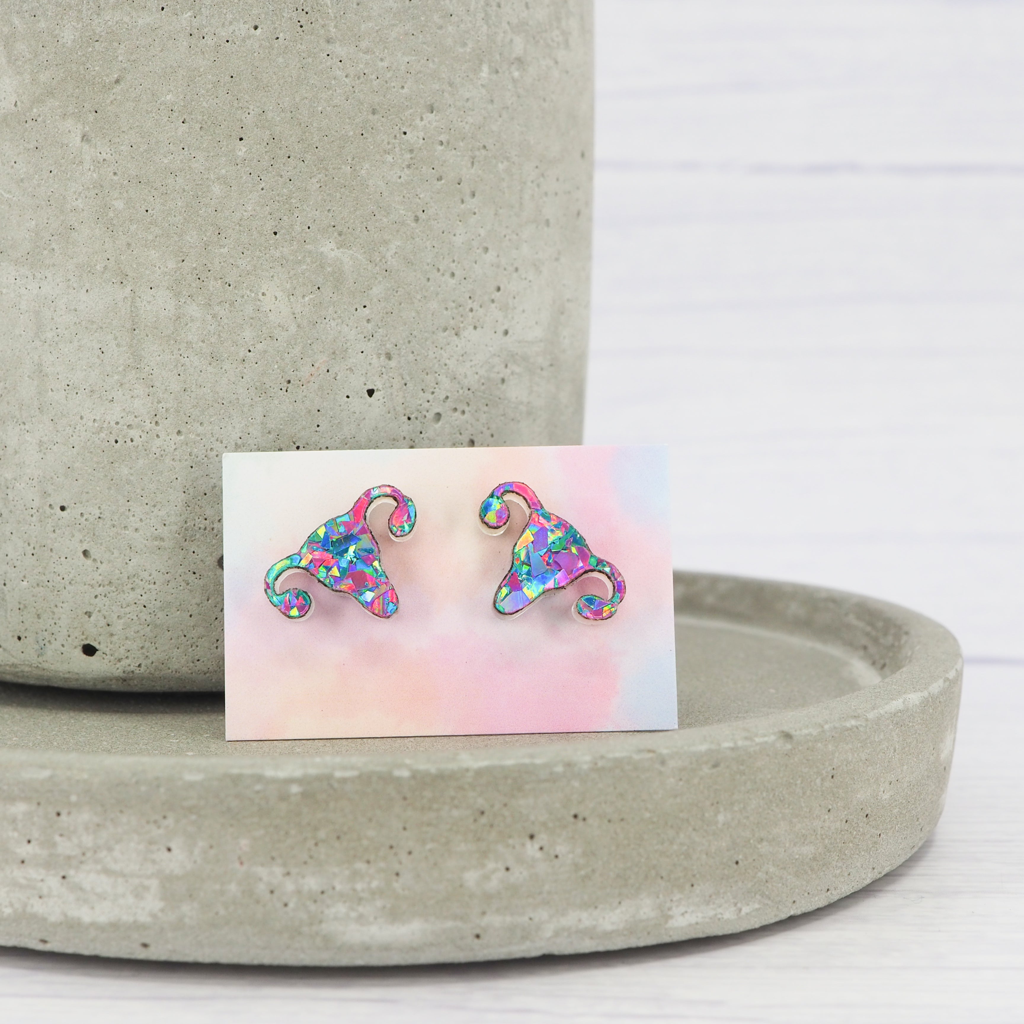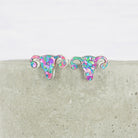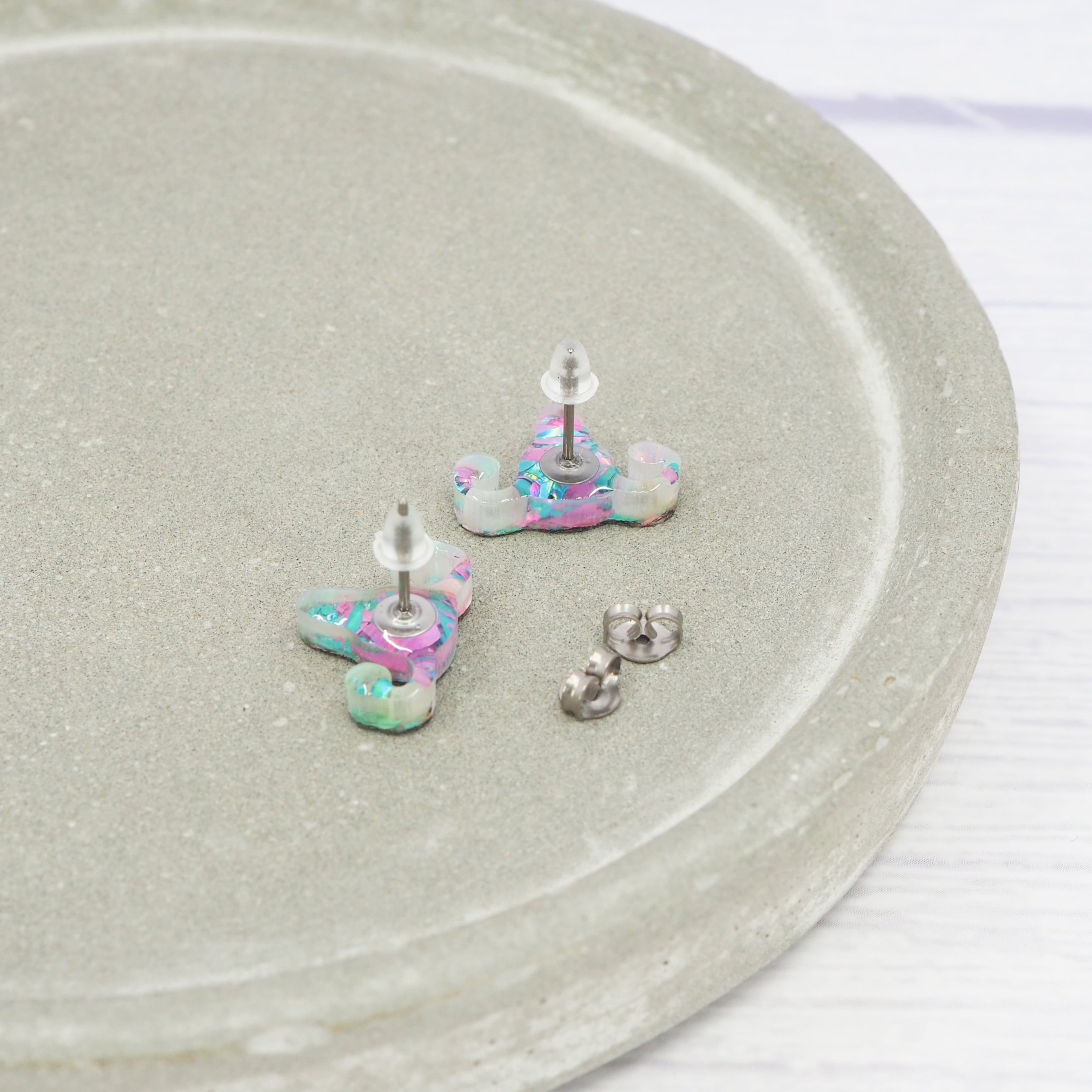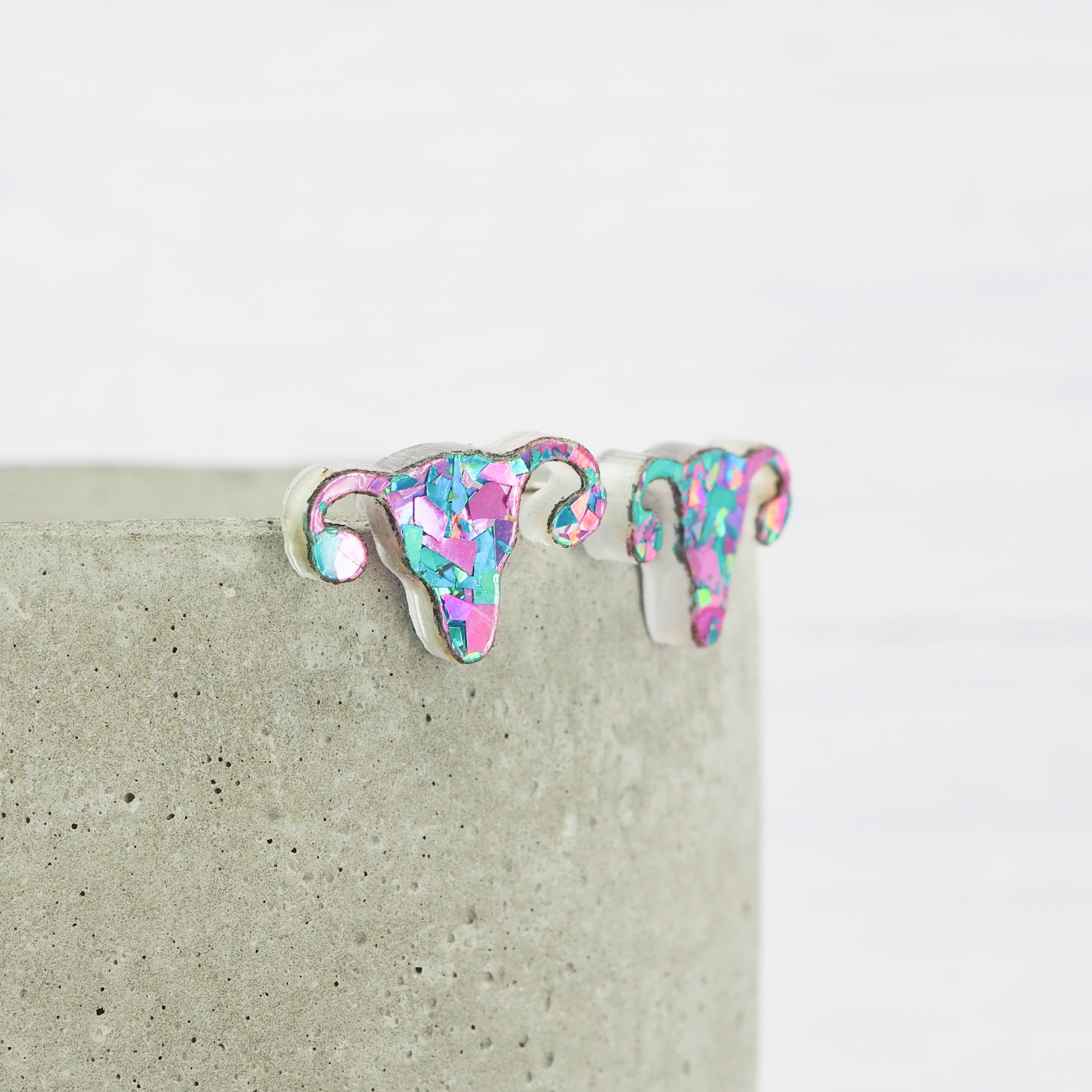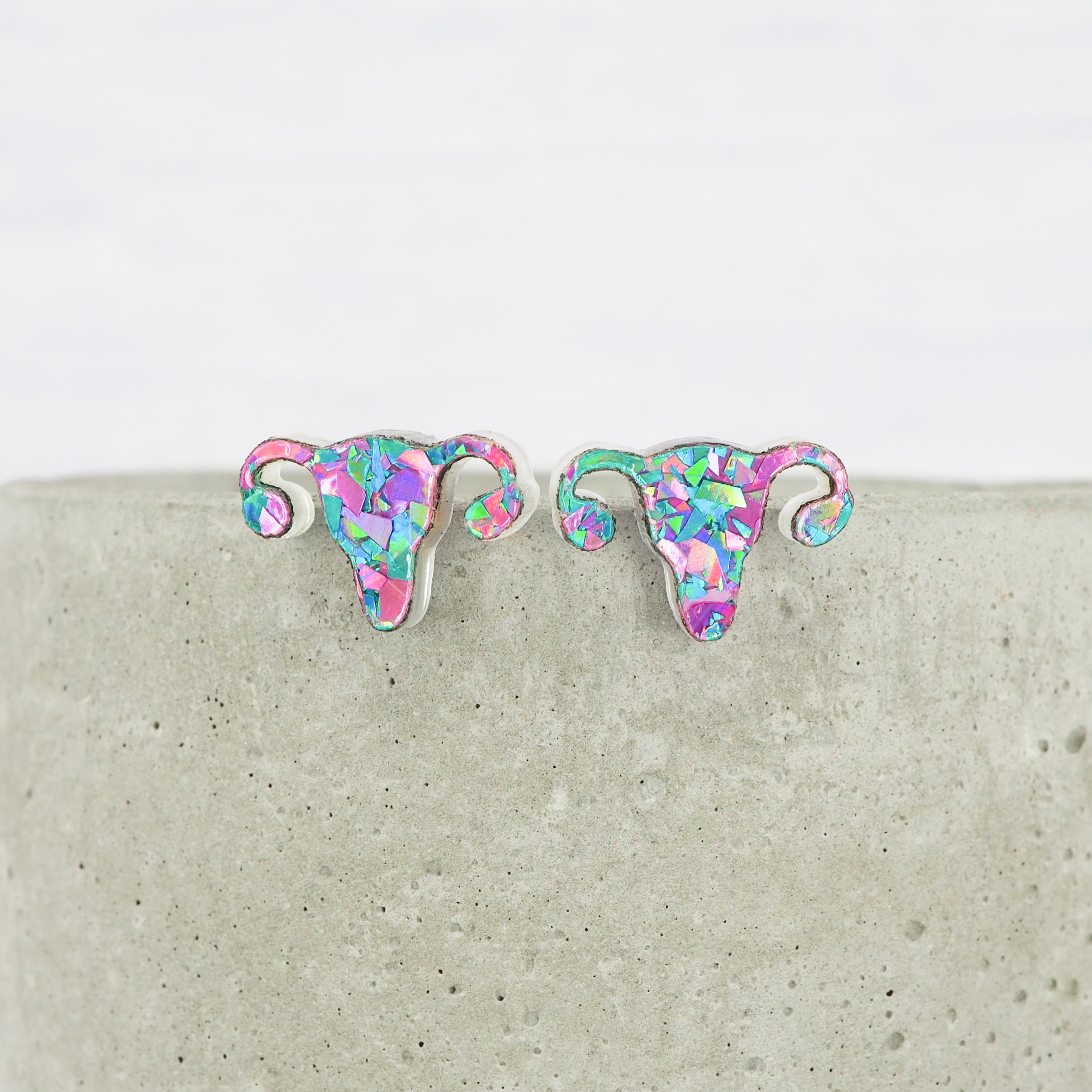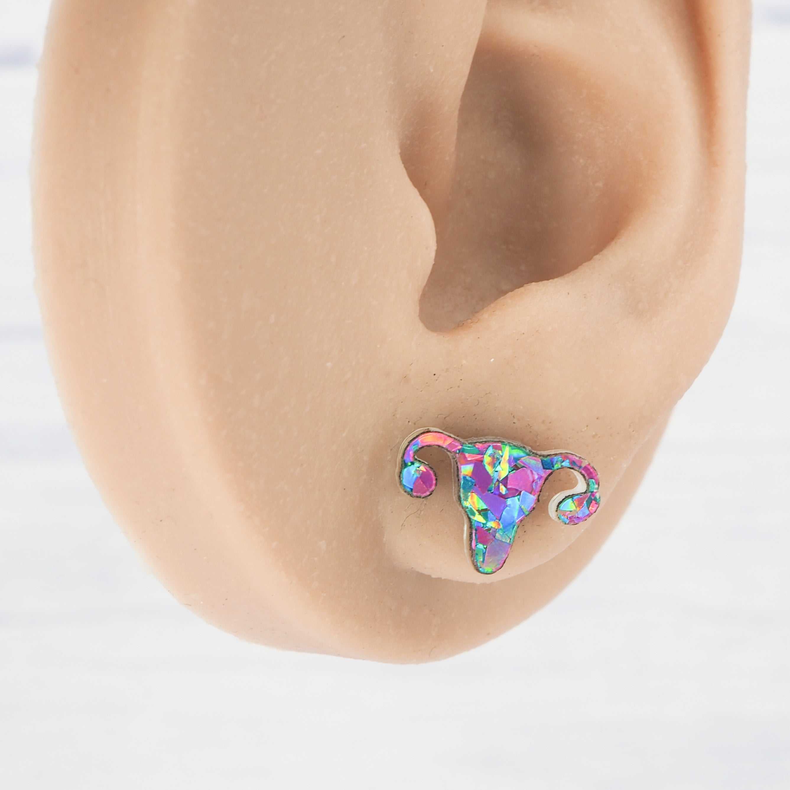 Holographic Pink and Blue glitter uterus studs with 0.7mm ear stems.