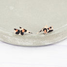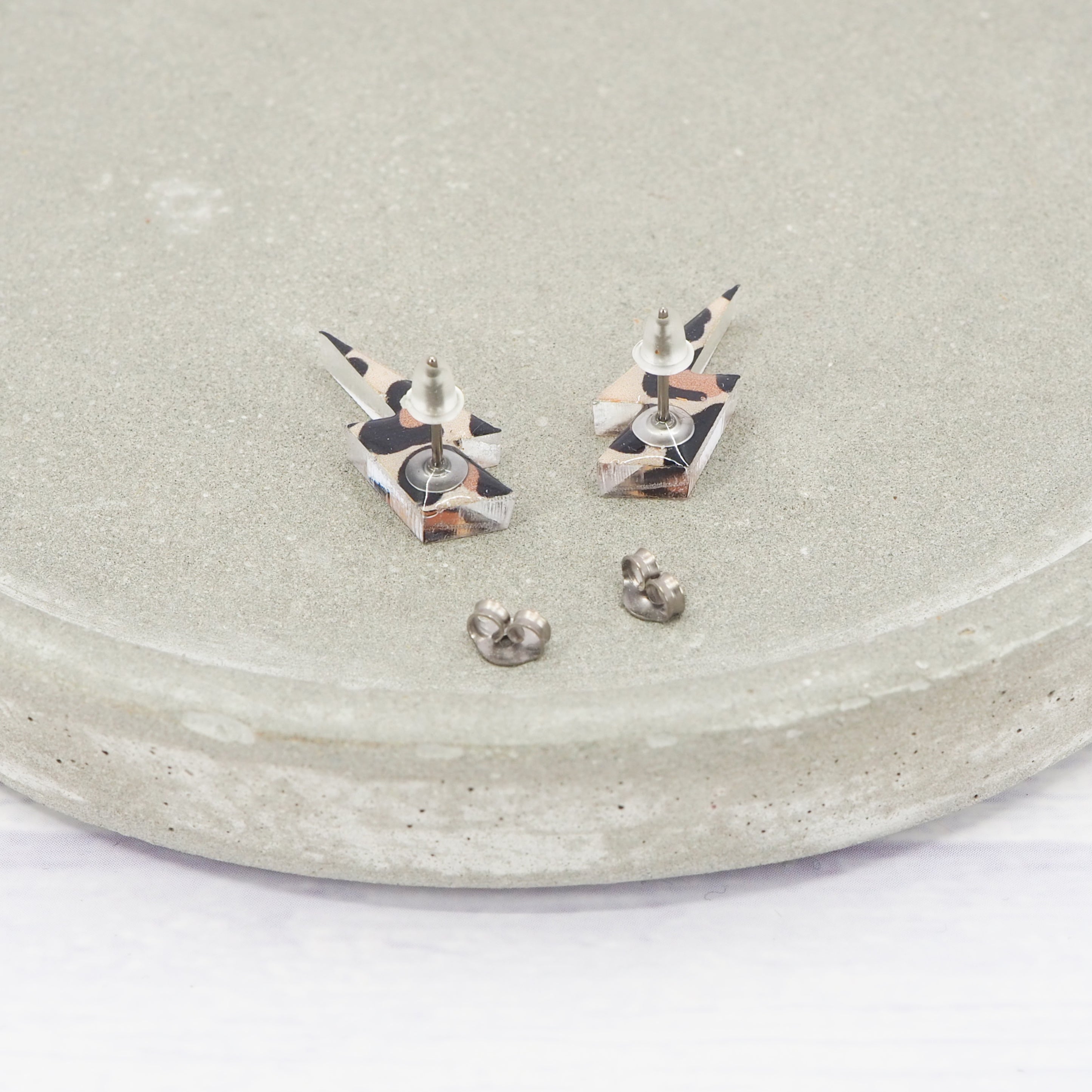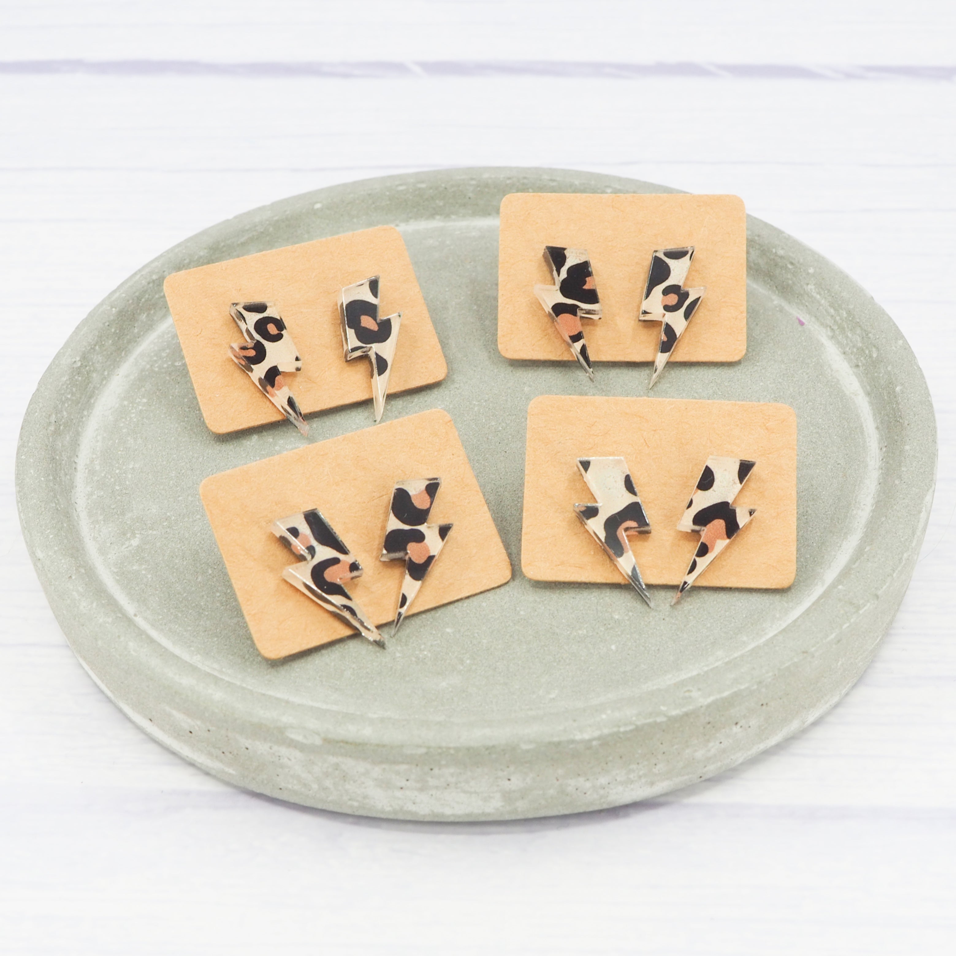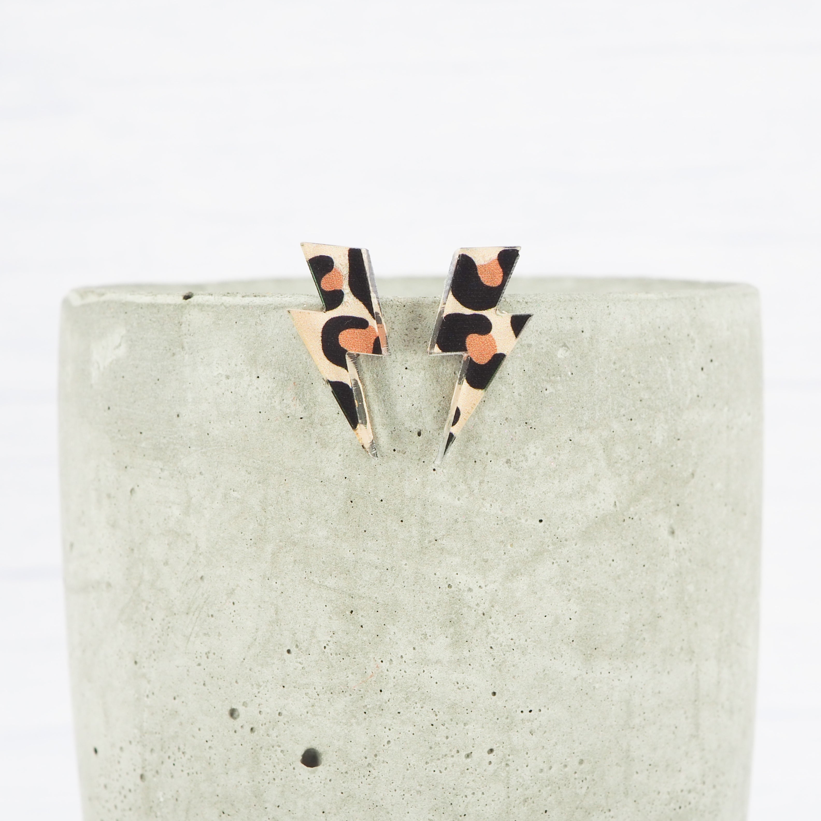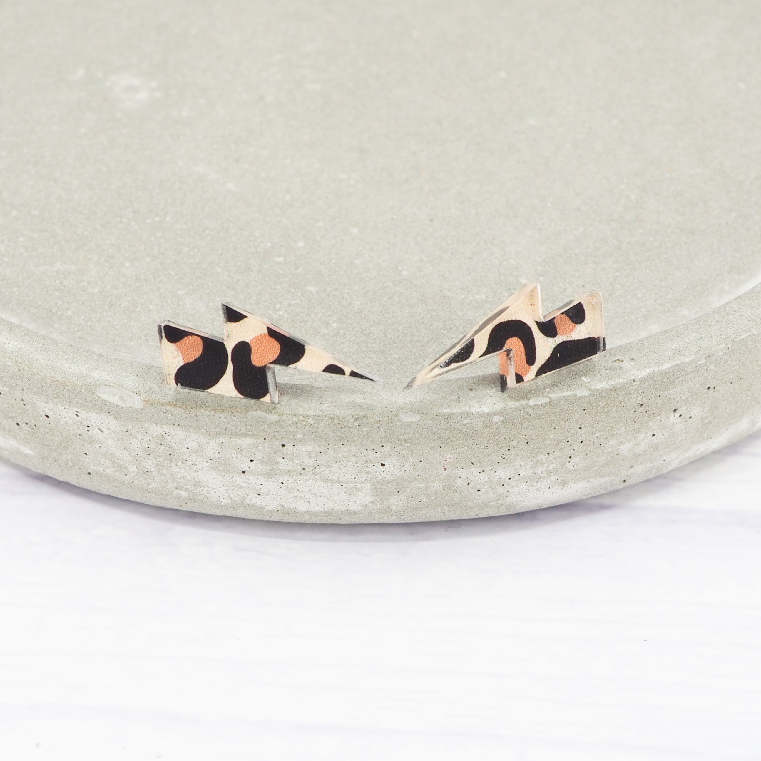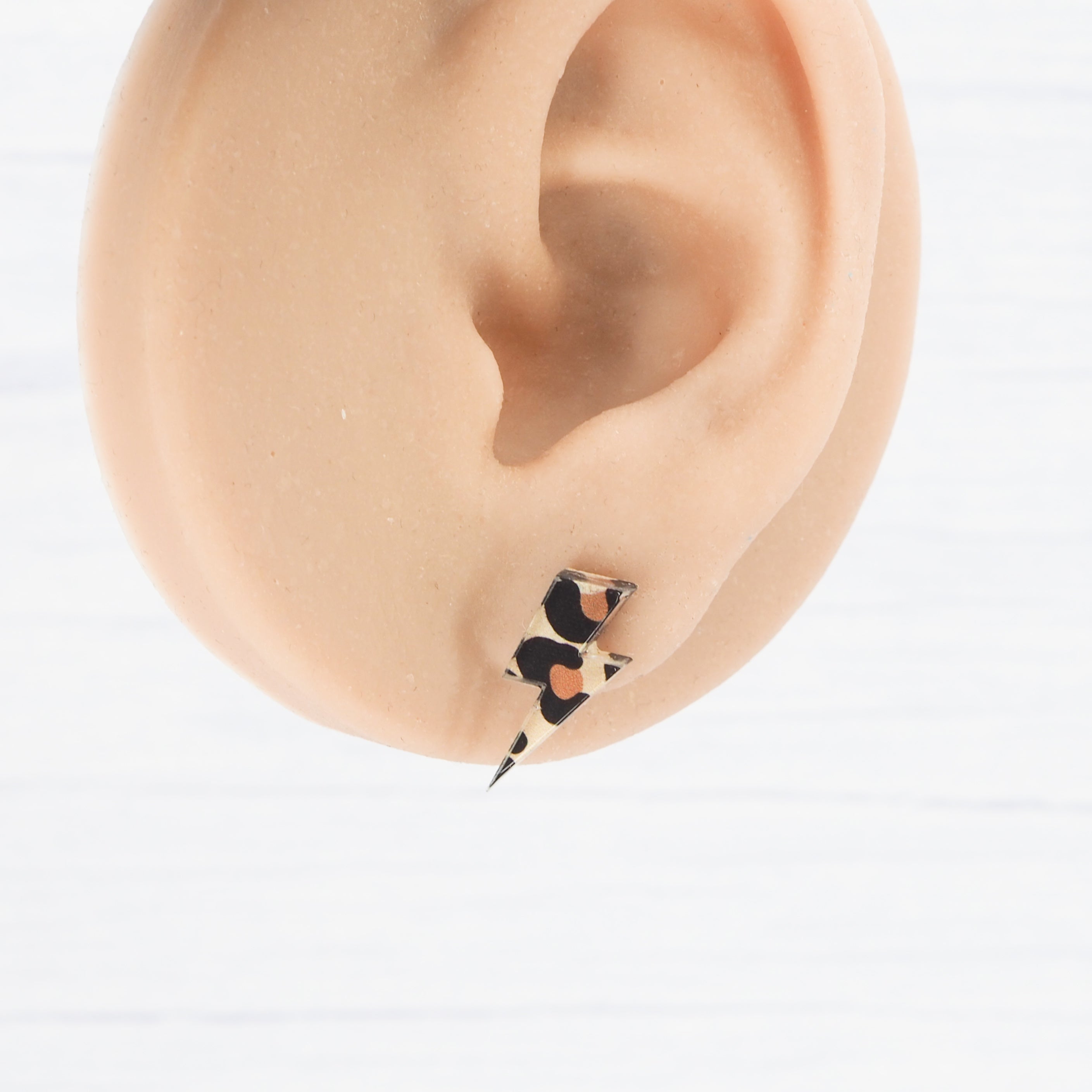 Leopard print lightning bolt studs with 0.7mm ear stems.