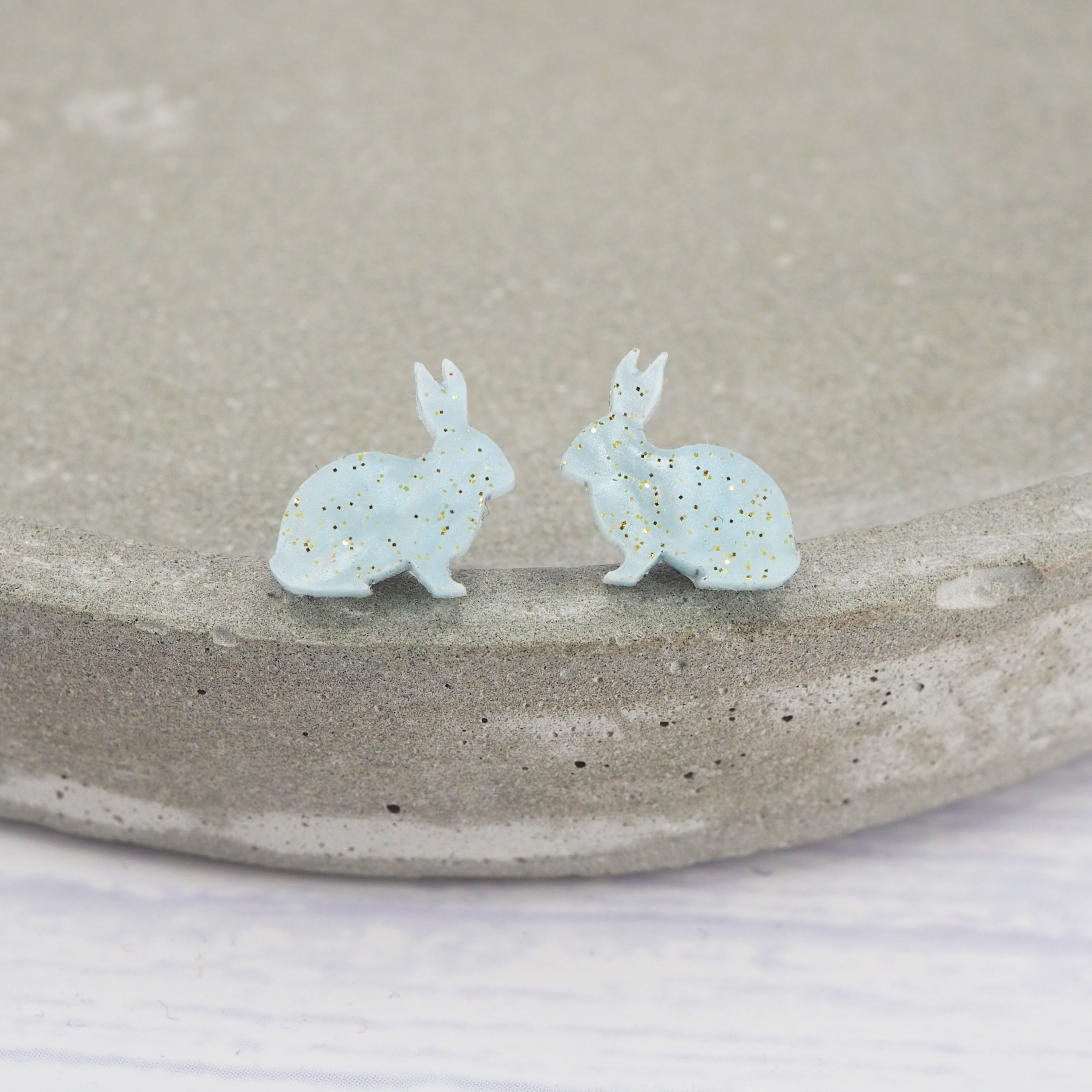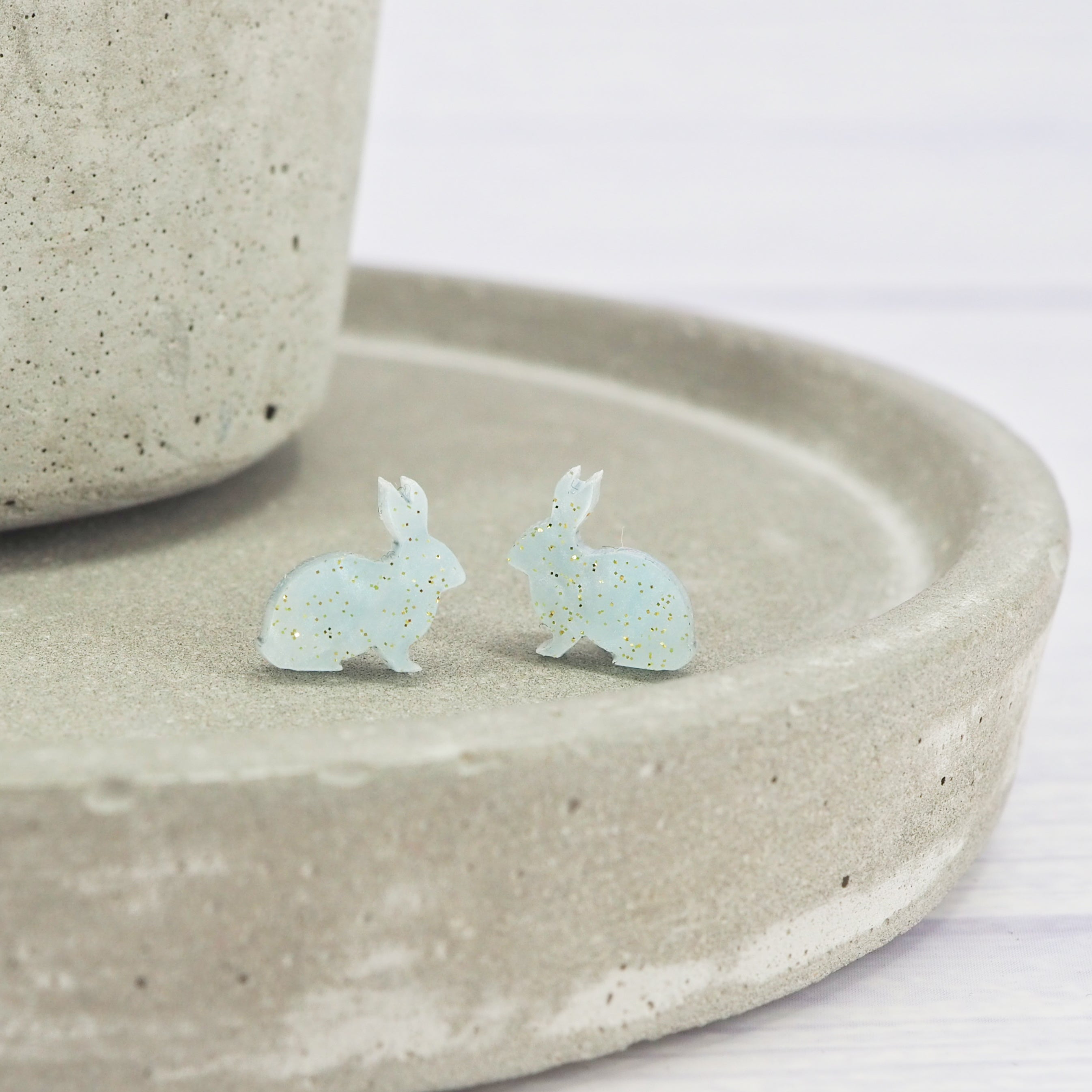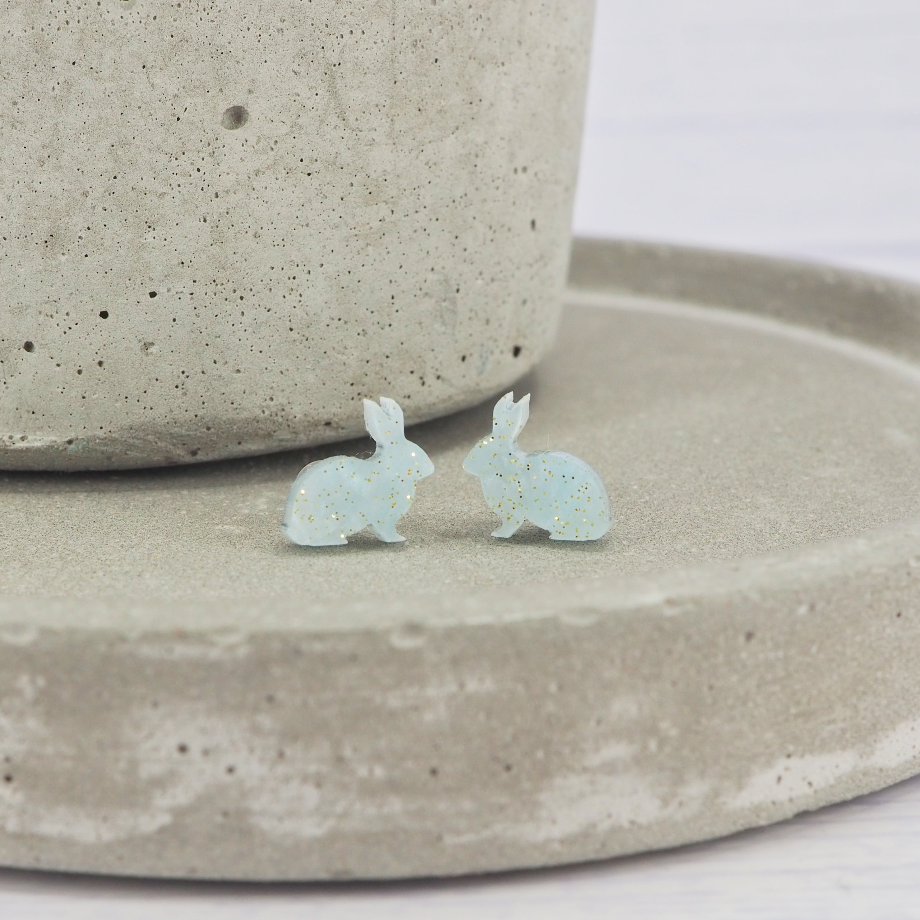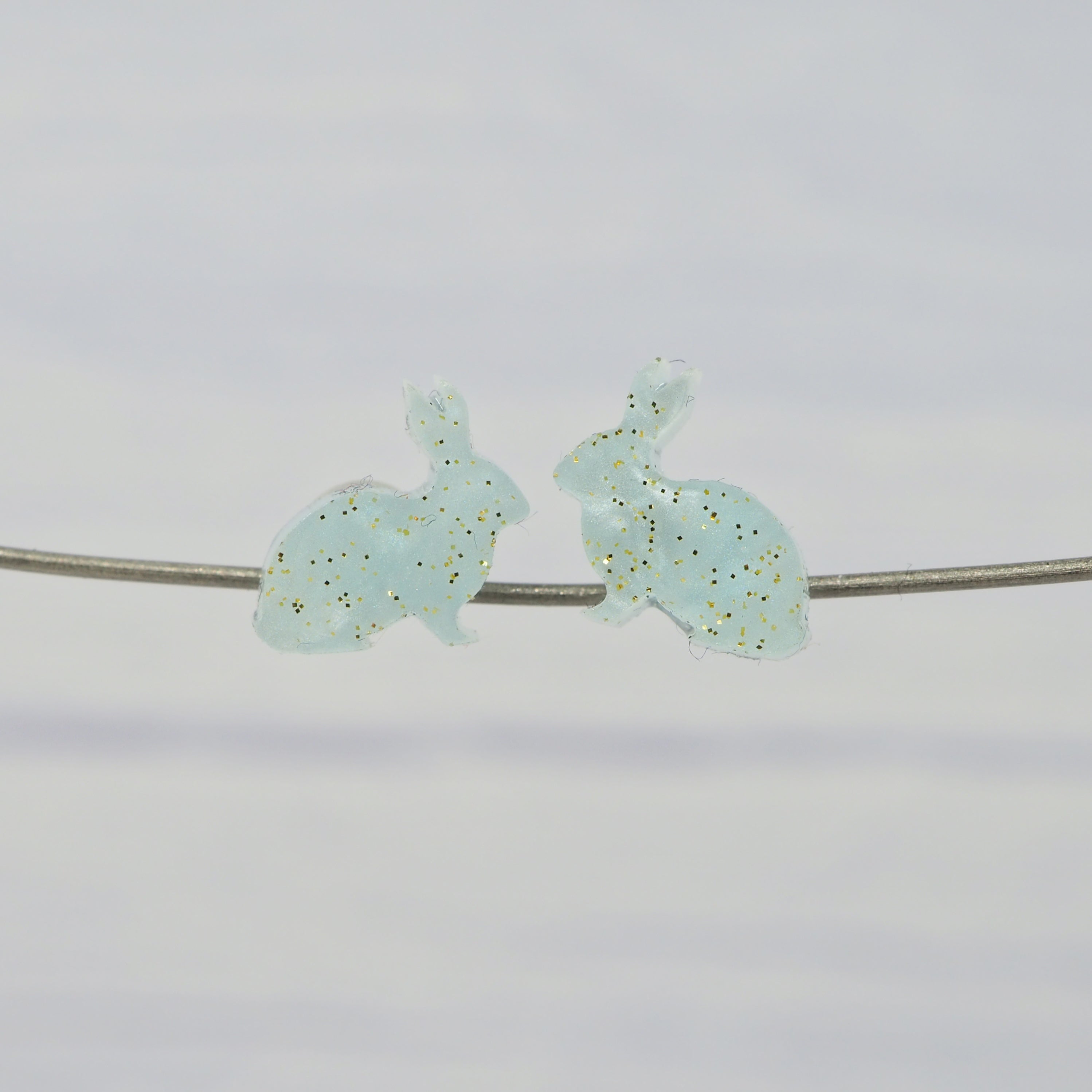 Light blue acrylic with gold glitter bunny studs with 0.7mm ear stems.