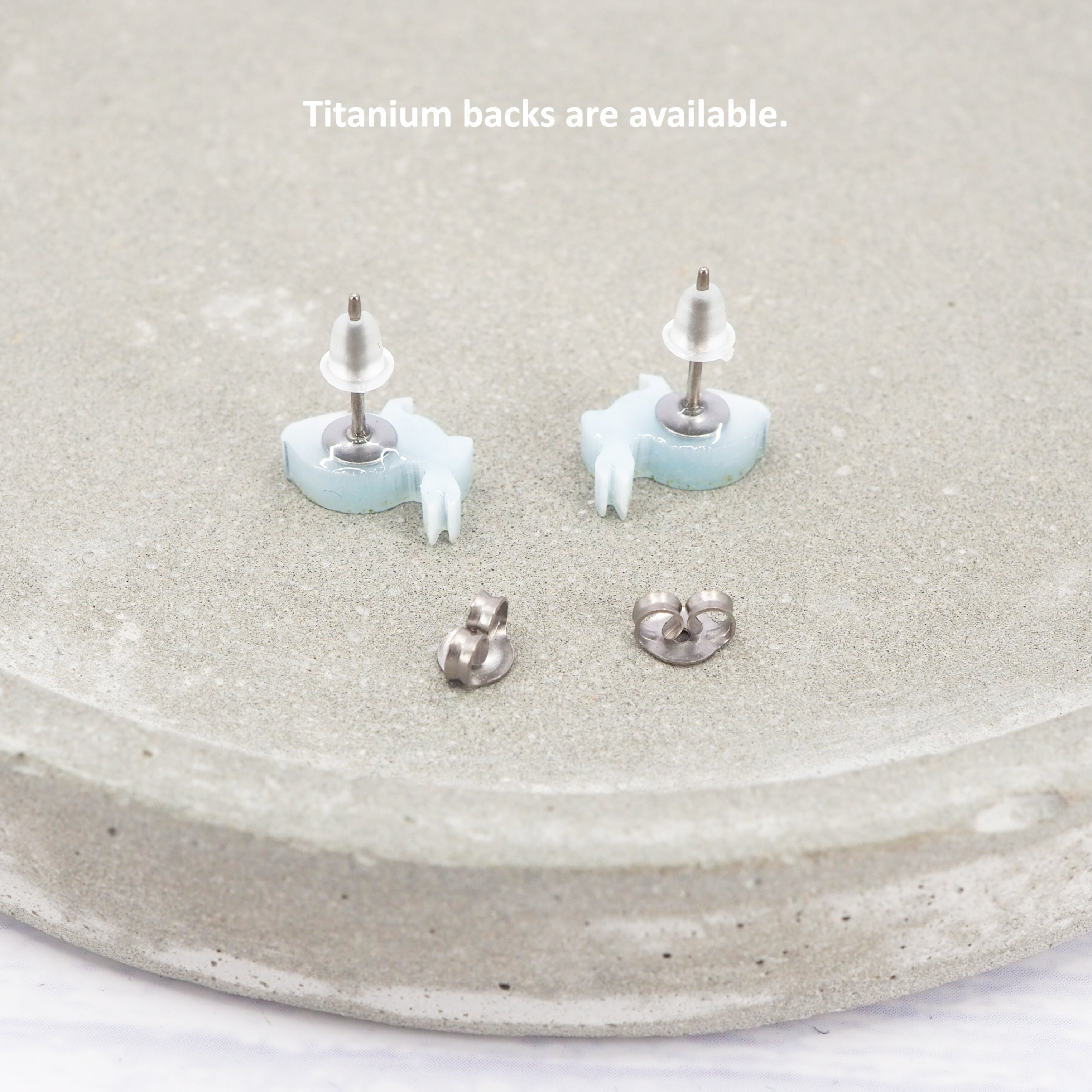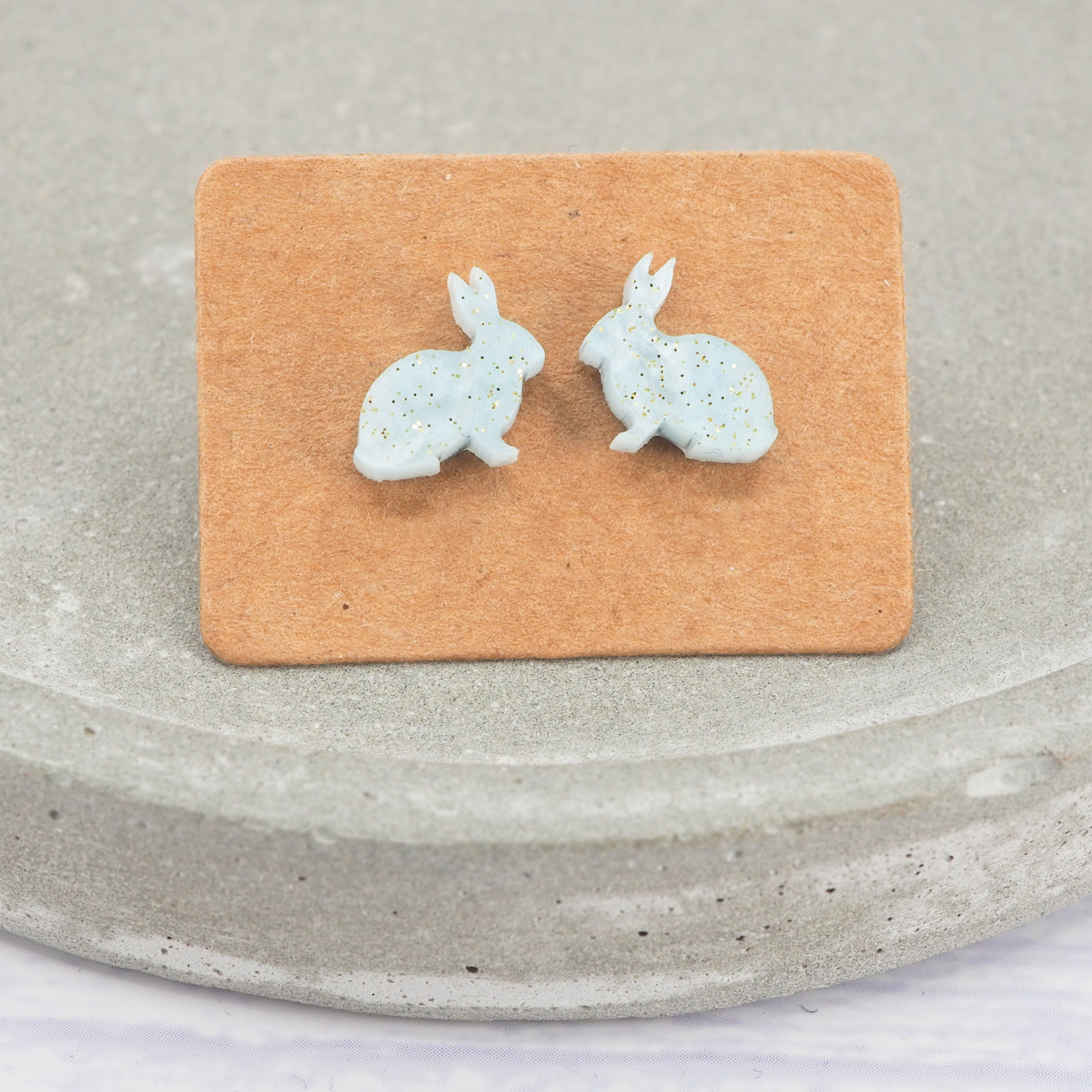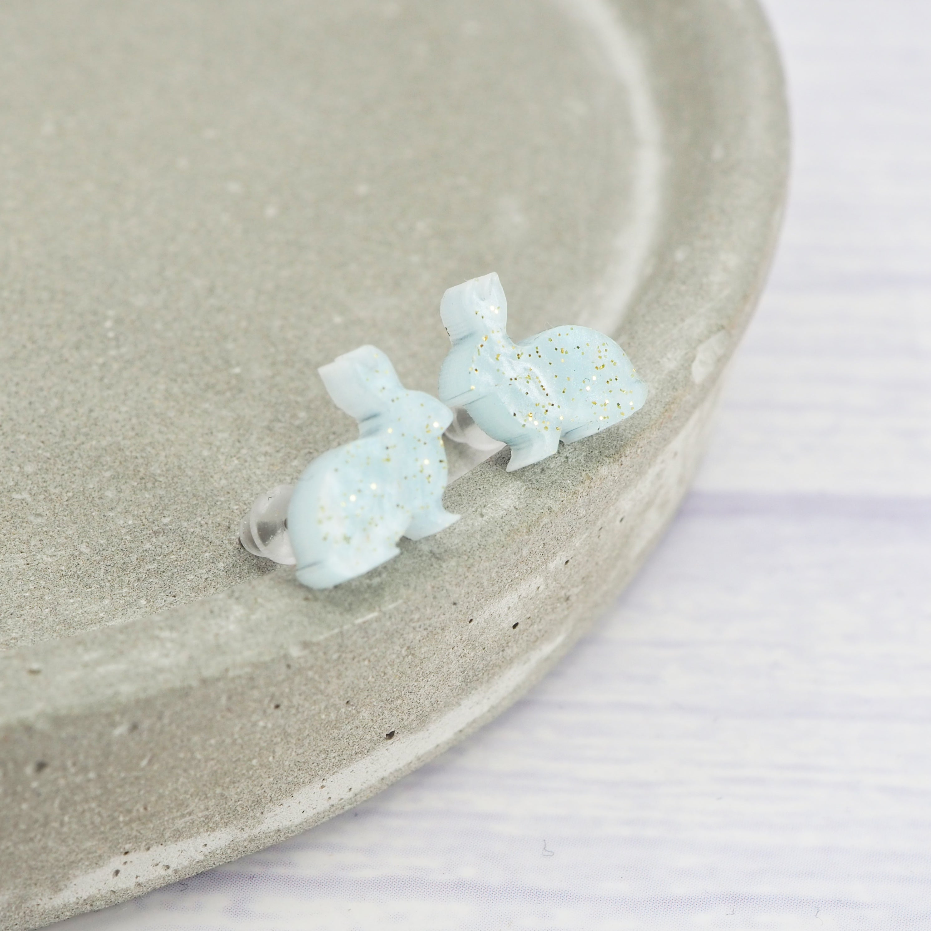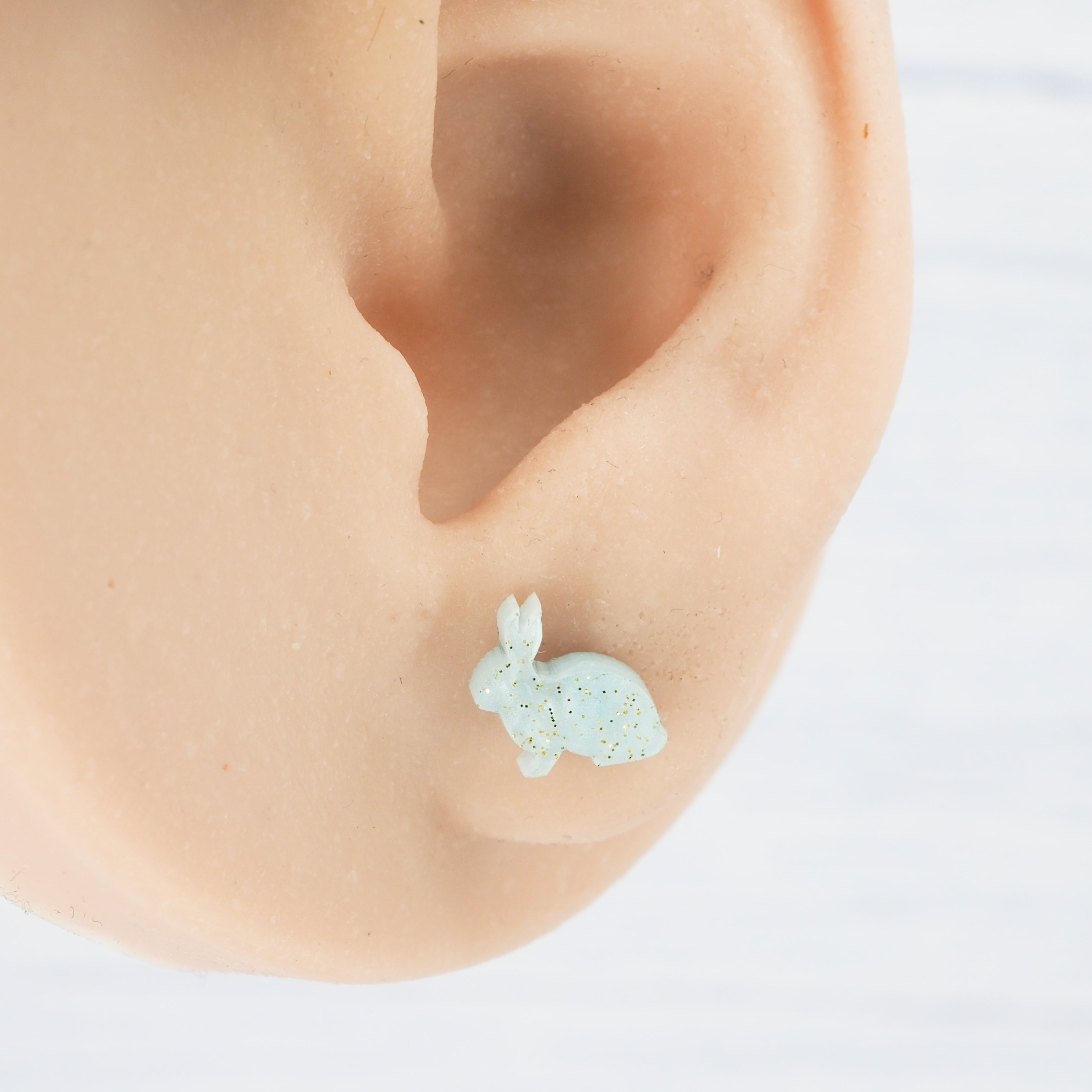 Light blue acrylic with gold glitter bunny studs with 0.7mm ear stems.