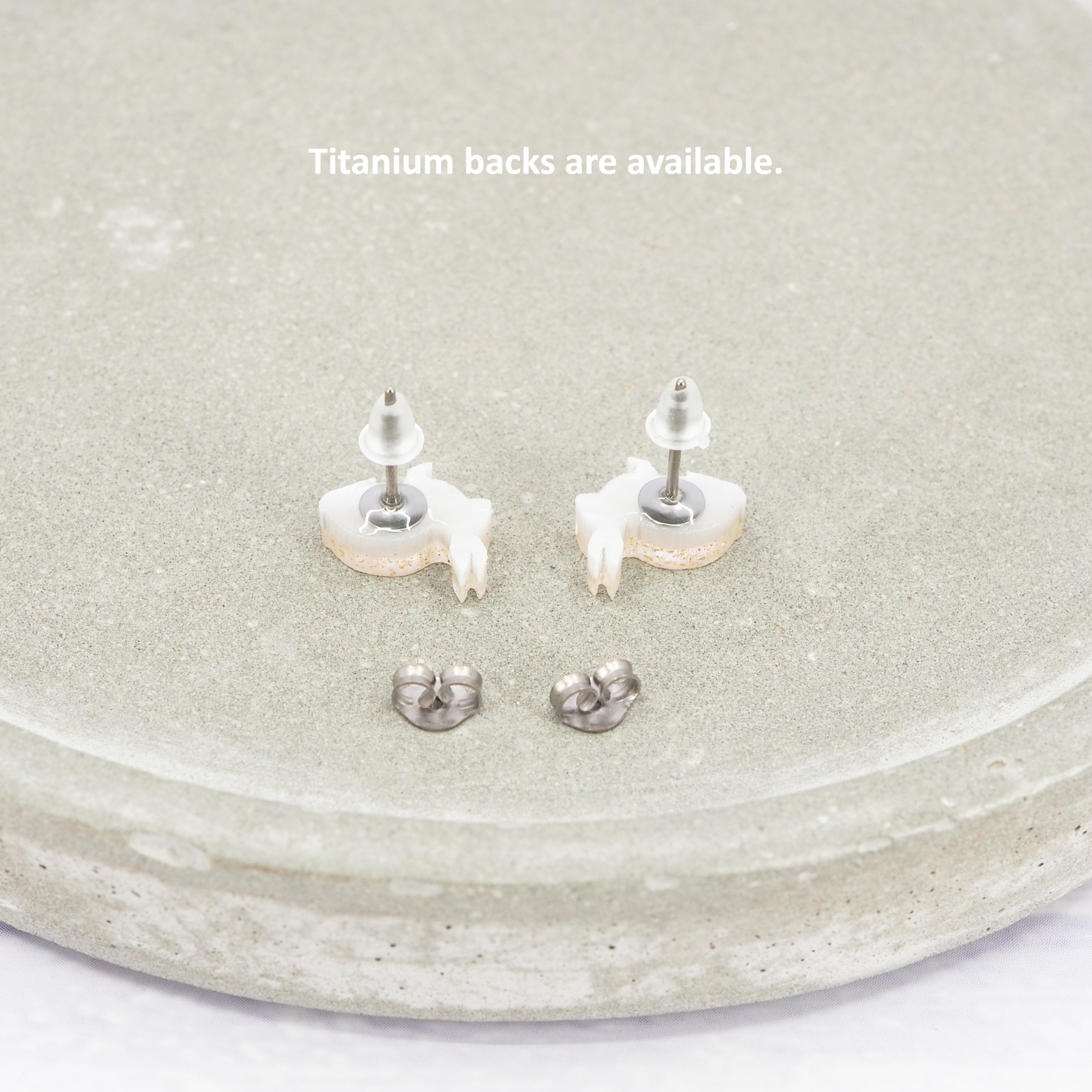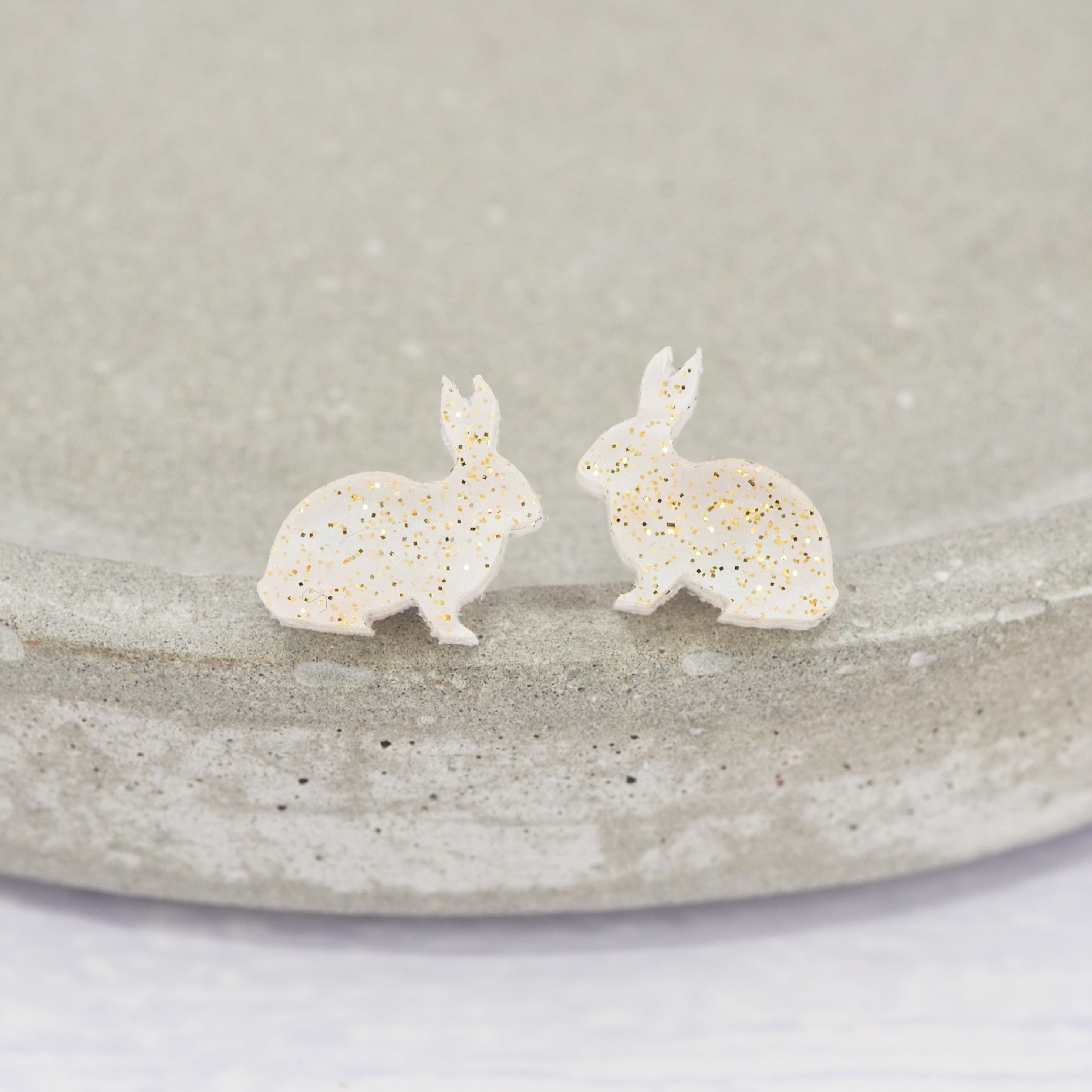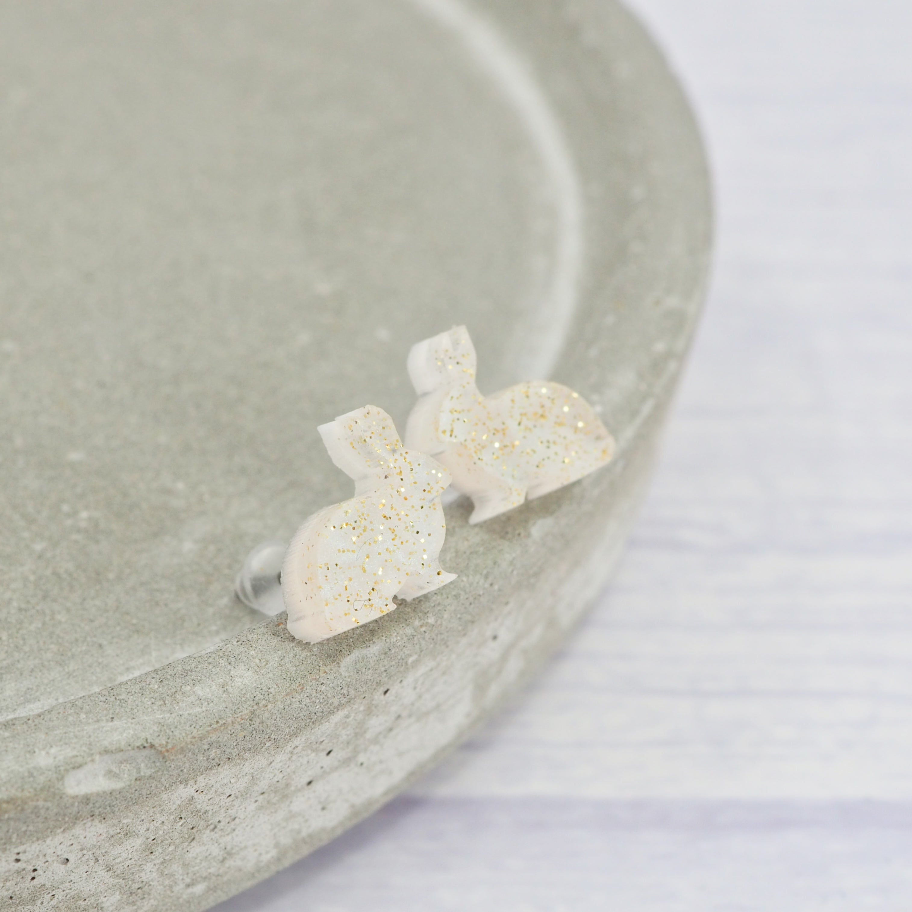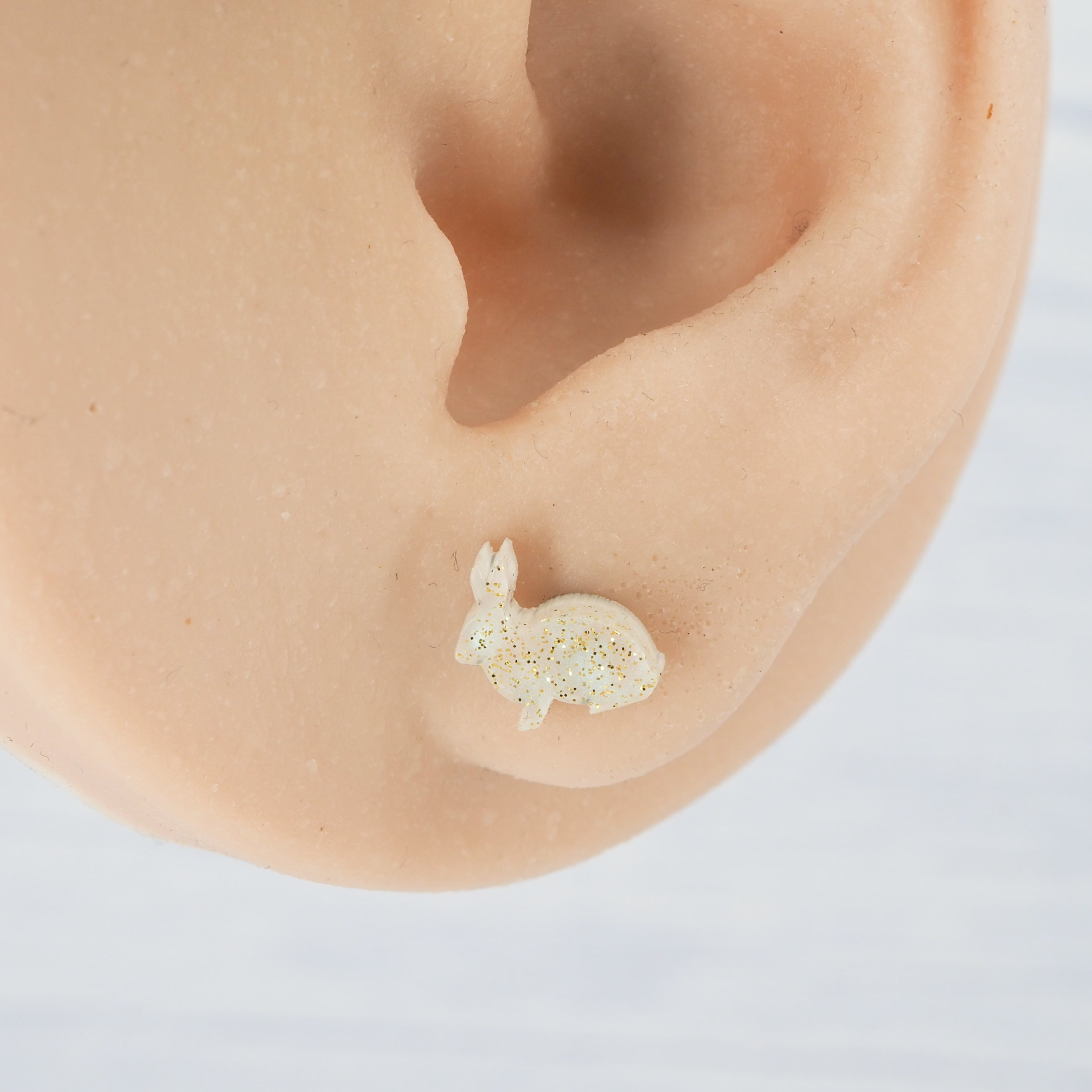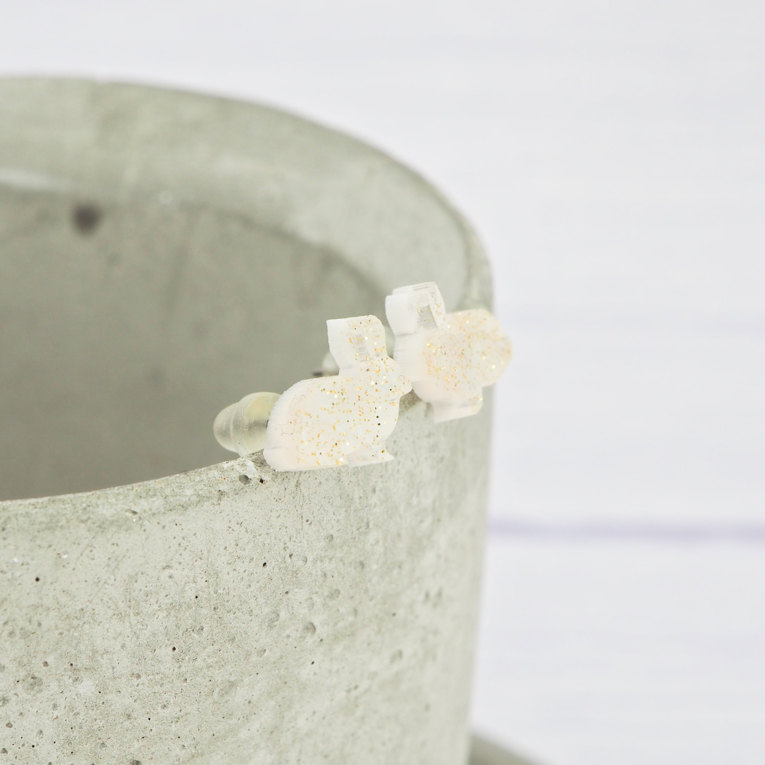 Light peachy acrylic with gold glitter bunny studs with 0.7mm ear stems.