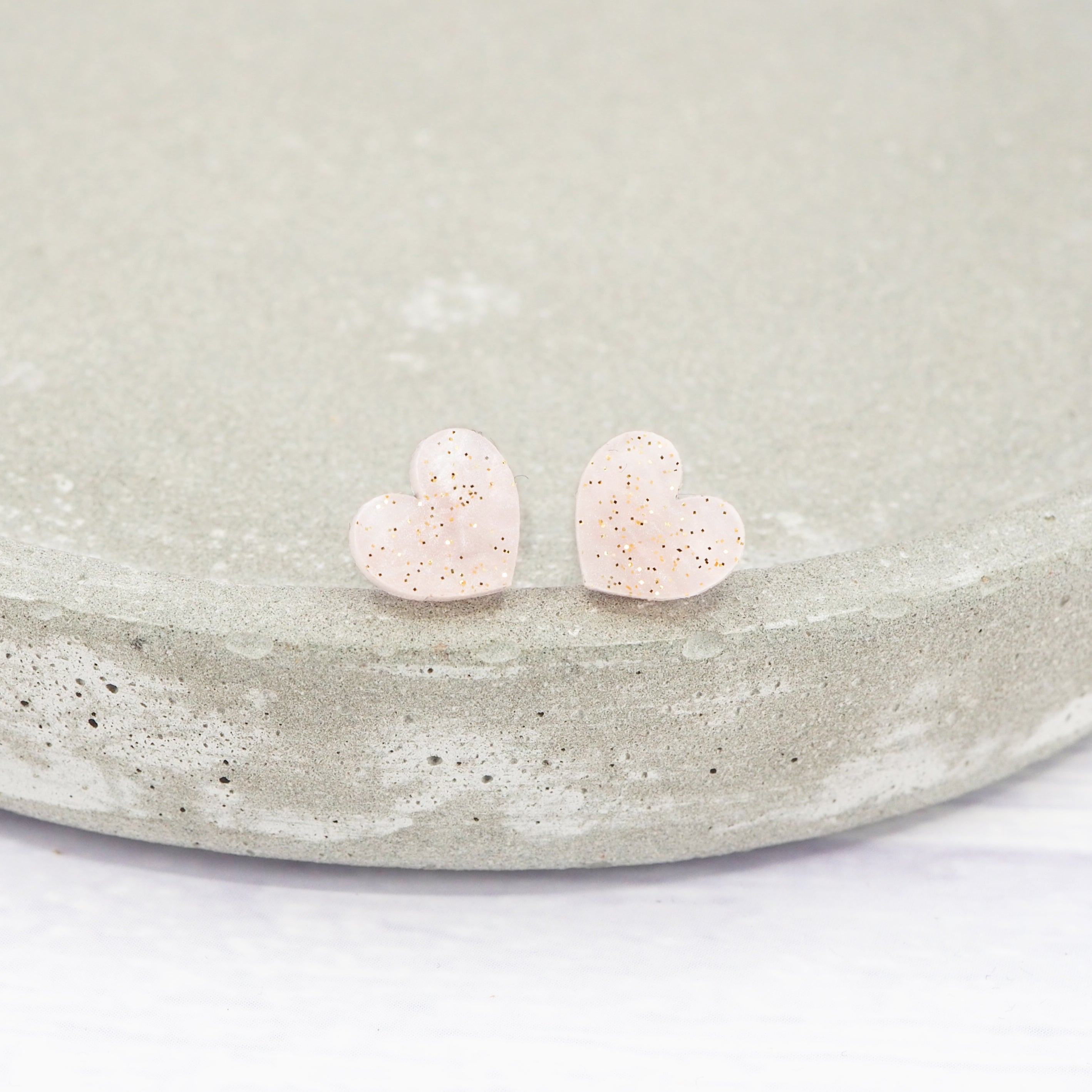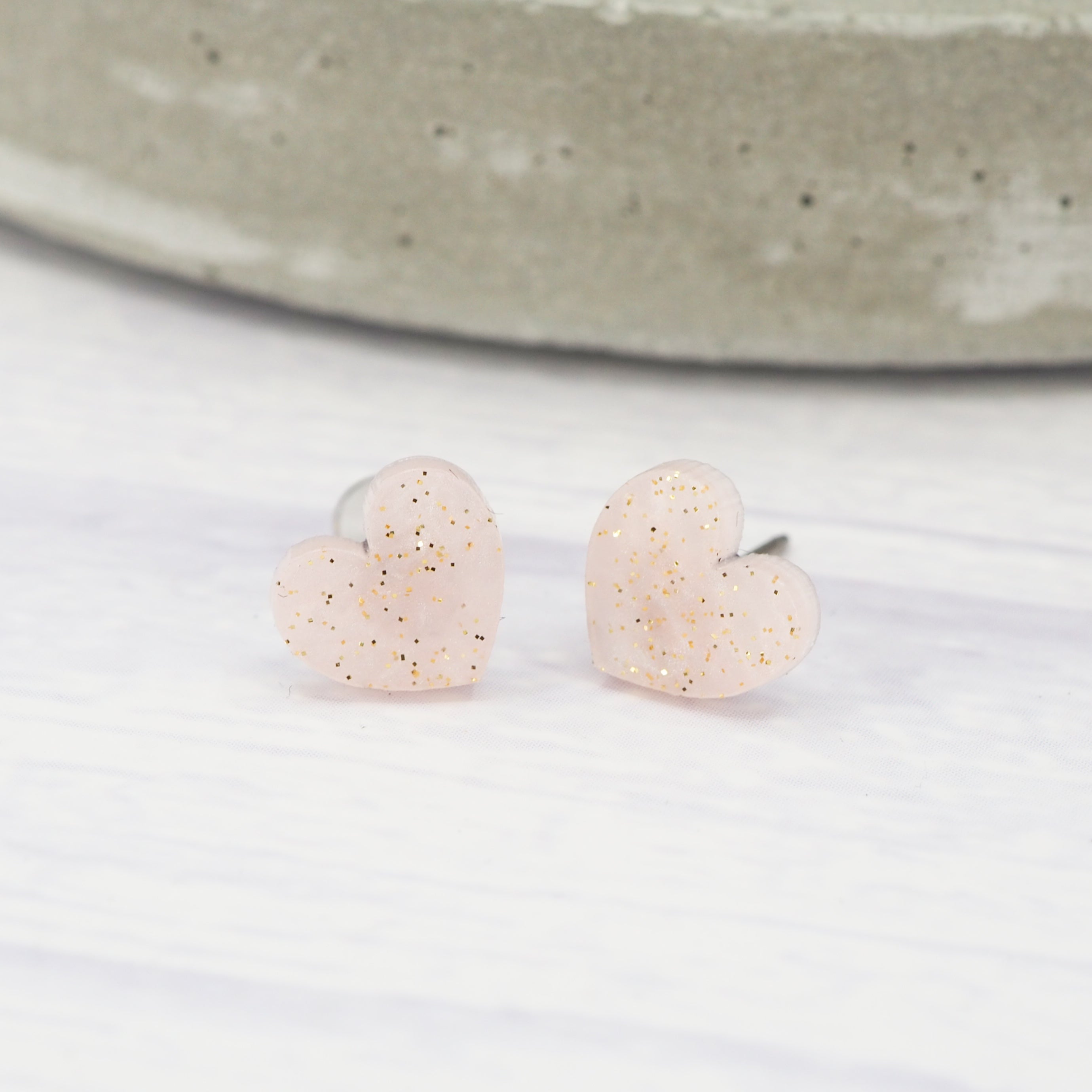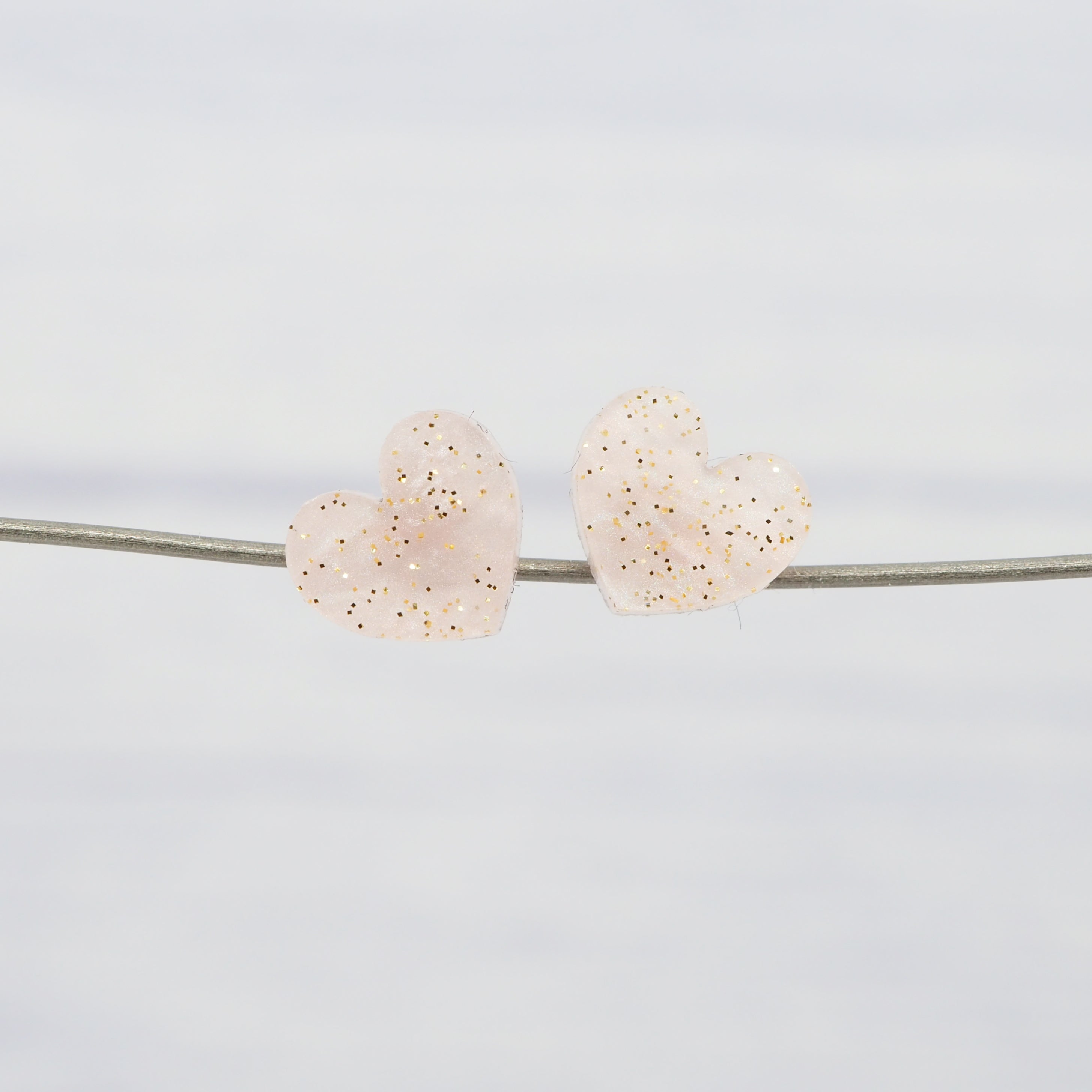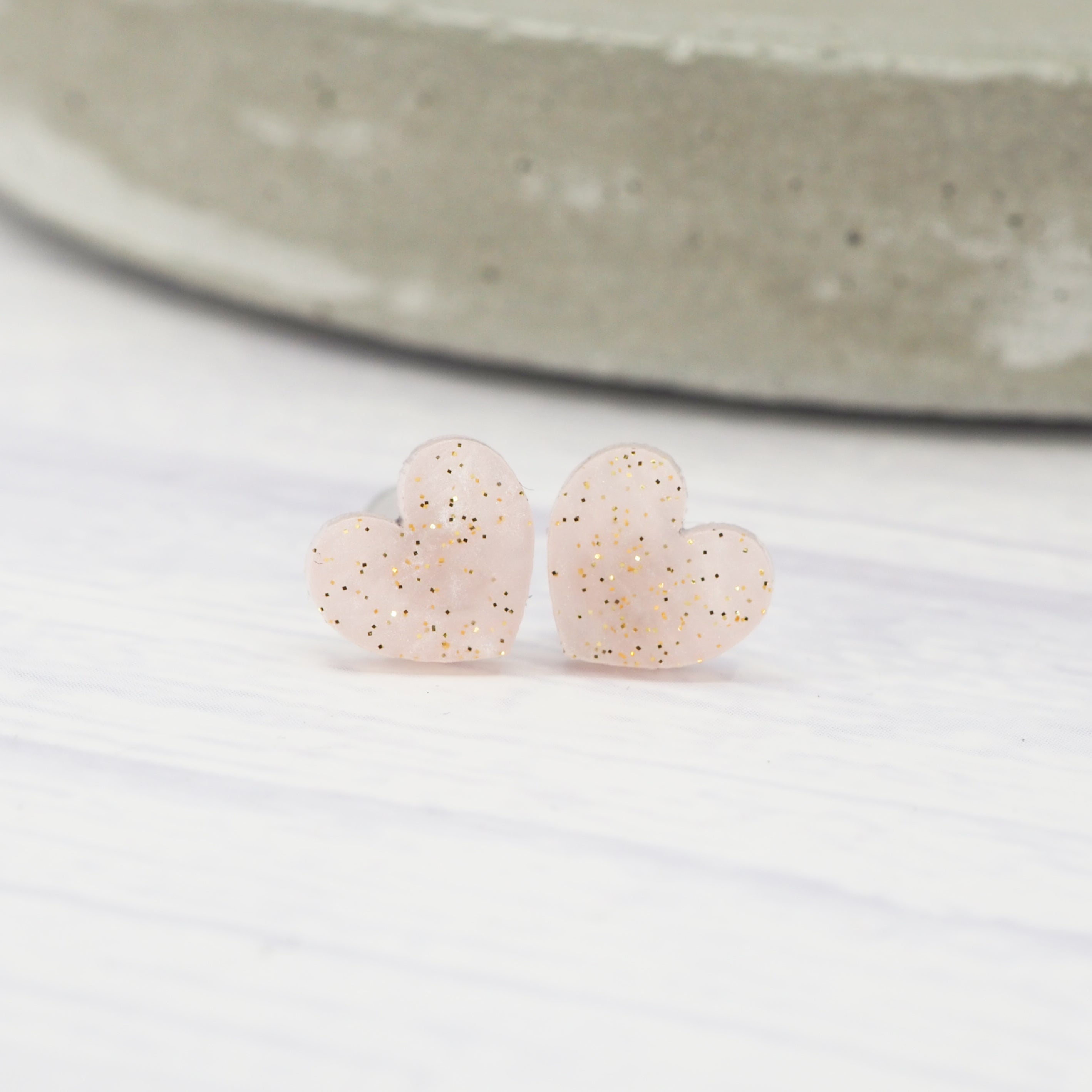 Light Pink galaxy glitter small heart acrylic studs with 0.7mm ear stems.