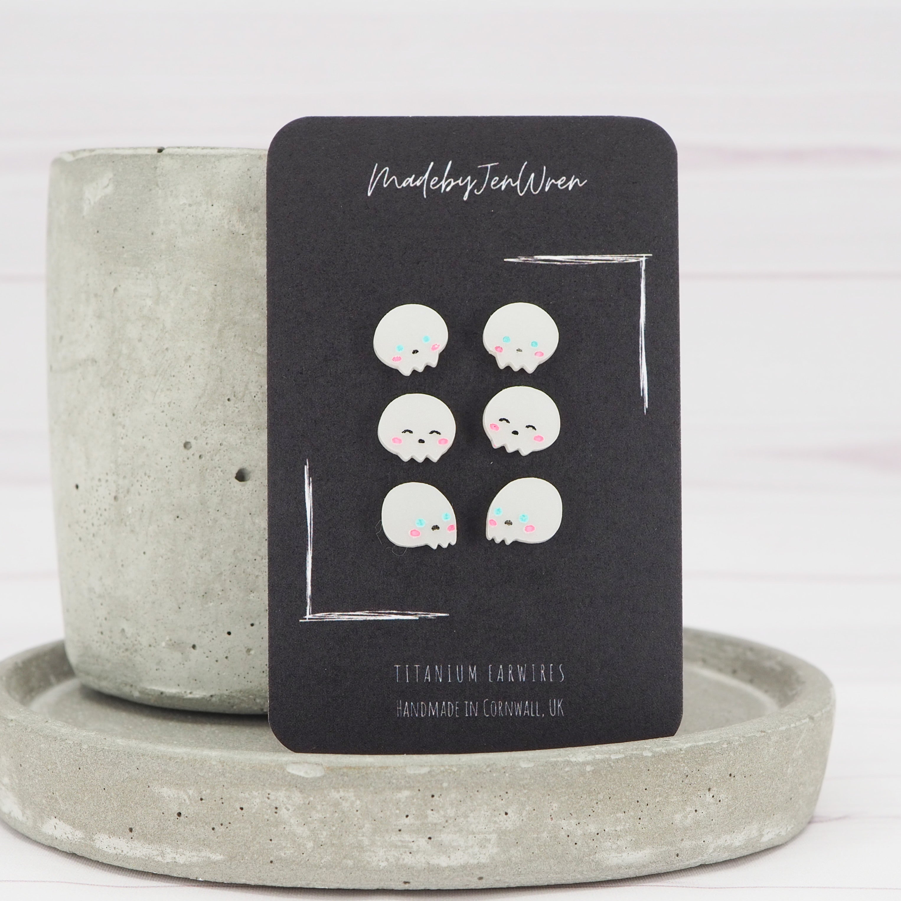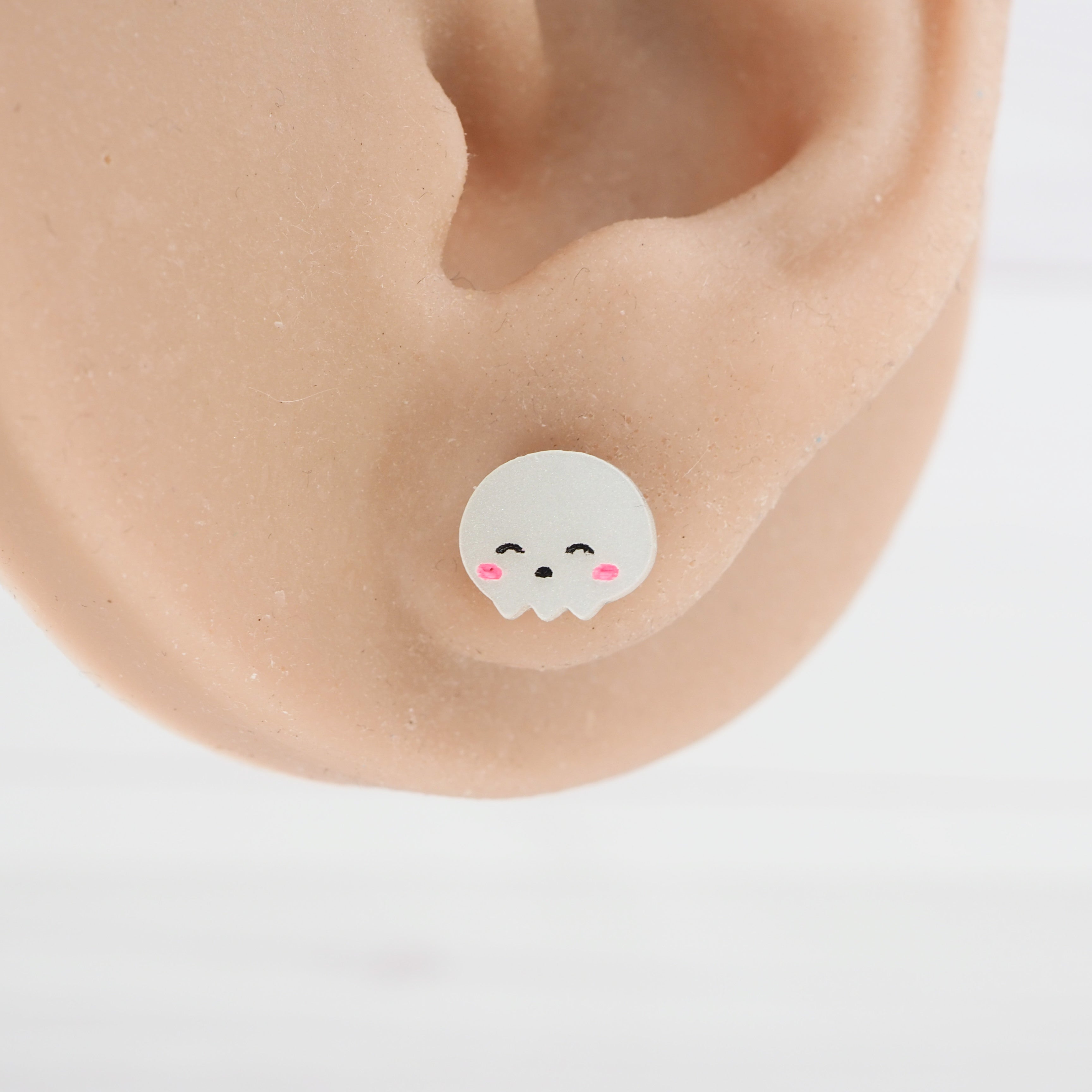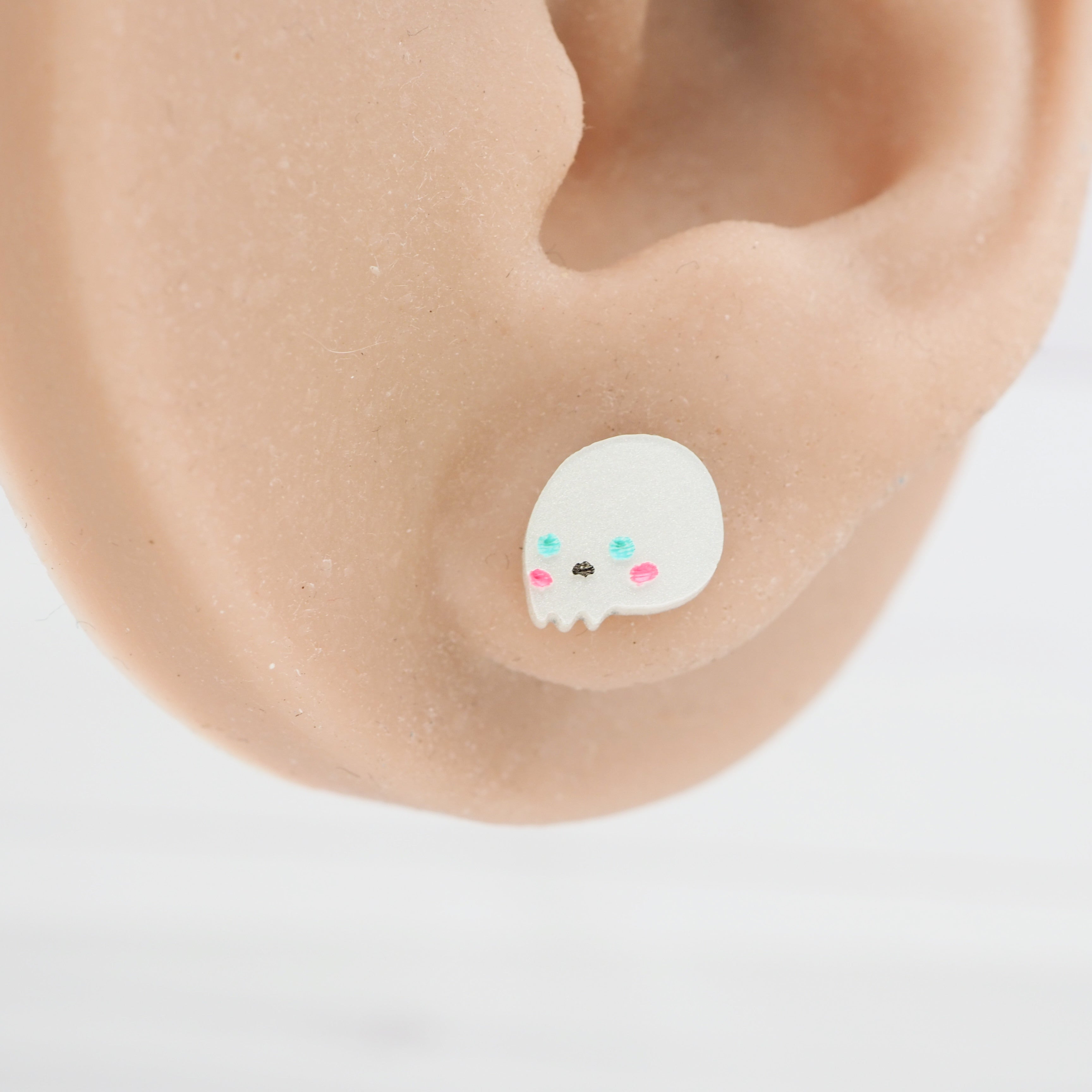 Metallic white cute skull studs with 0.7mm Grade 1 titanium ear stems.