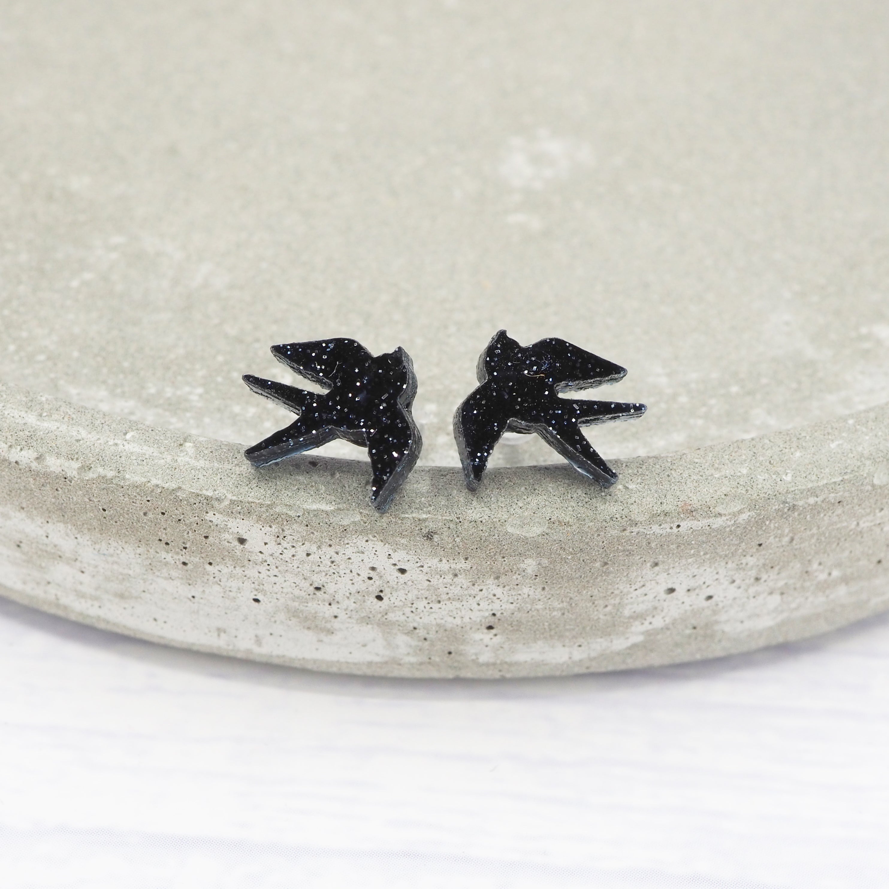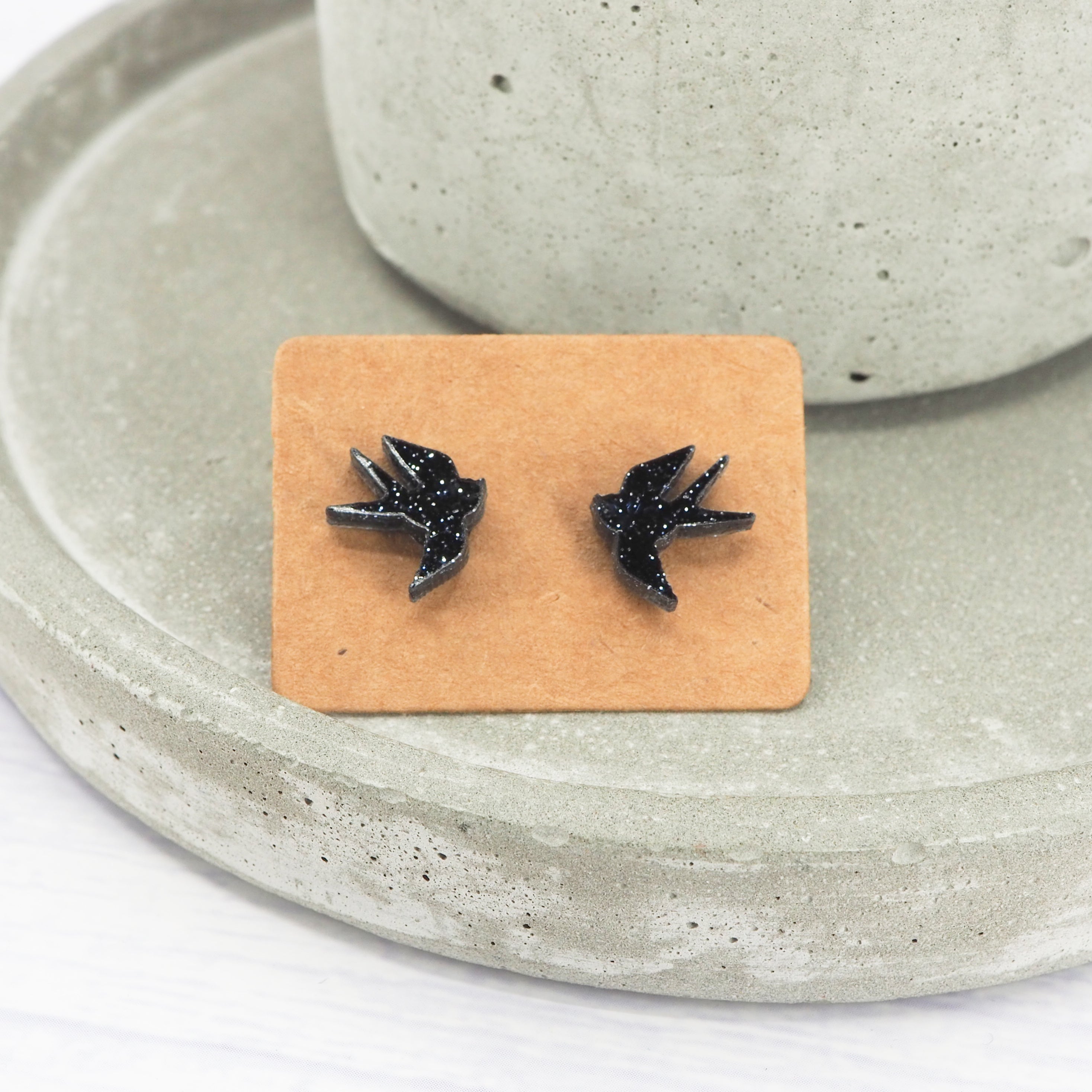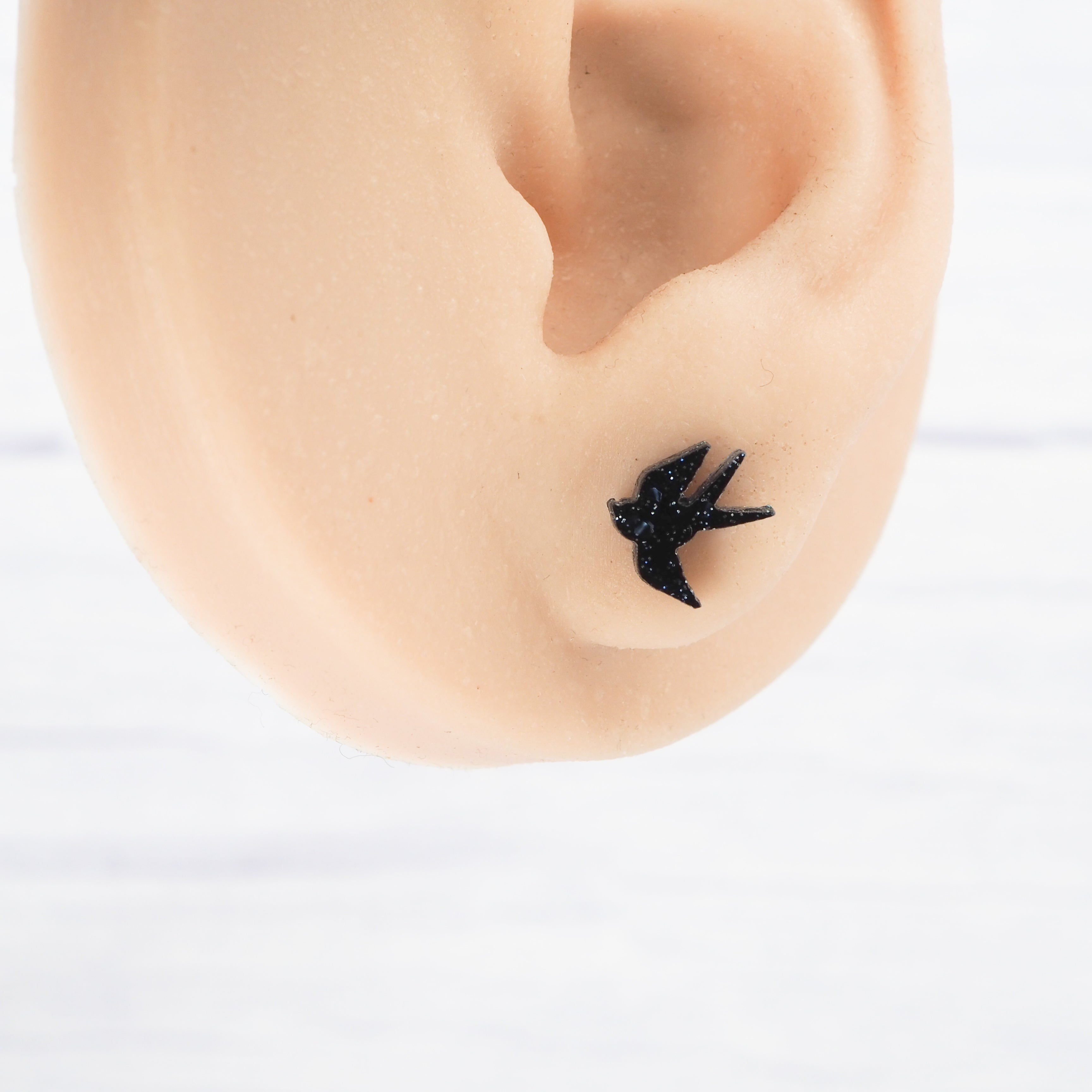 Mini Black glitter acrylic swallow bird studs with 0.7mm ear stems.