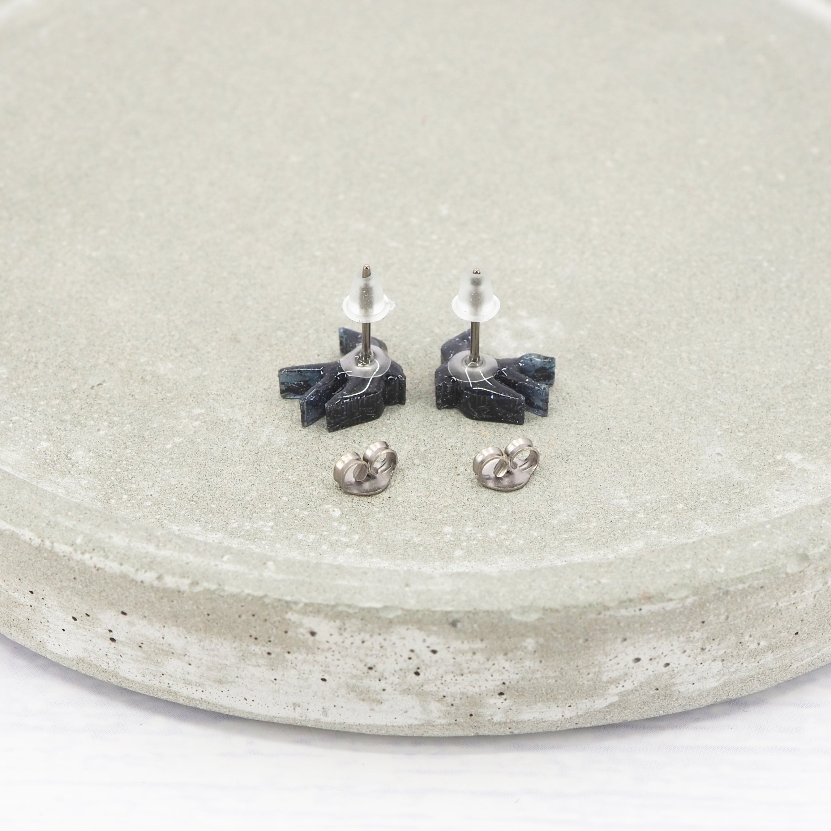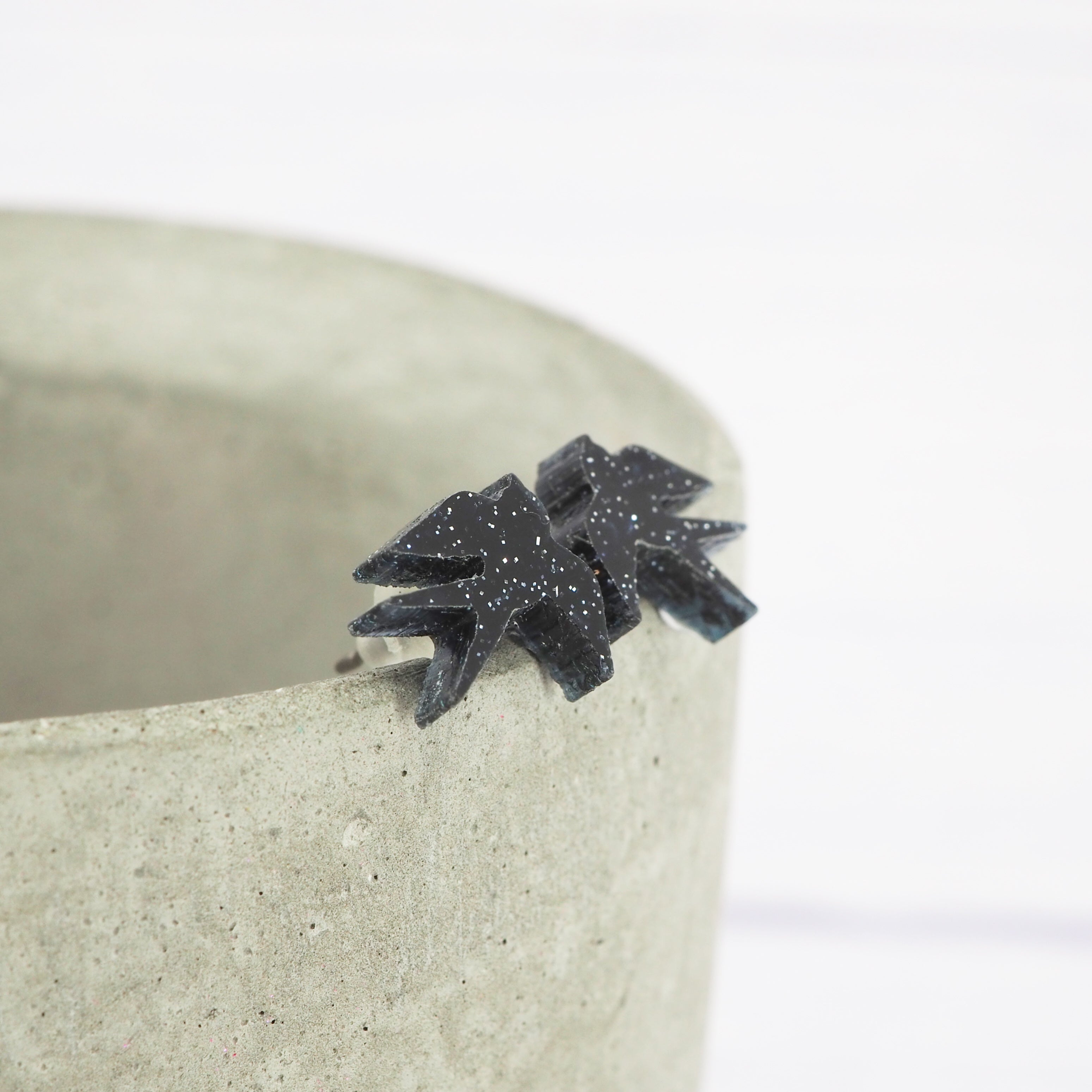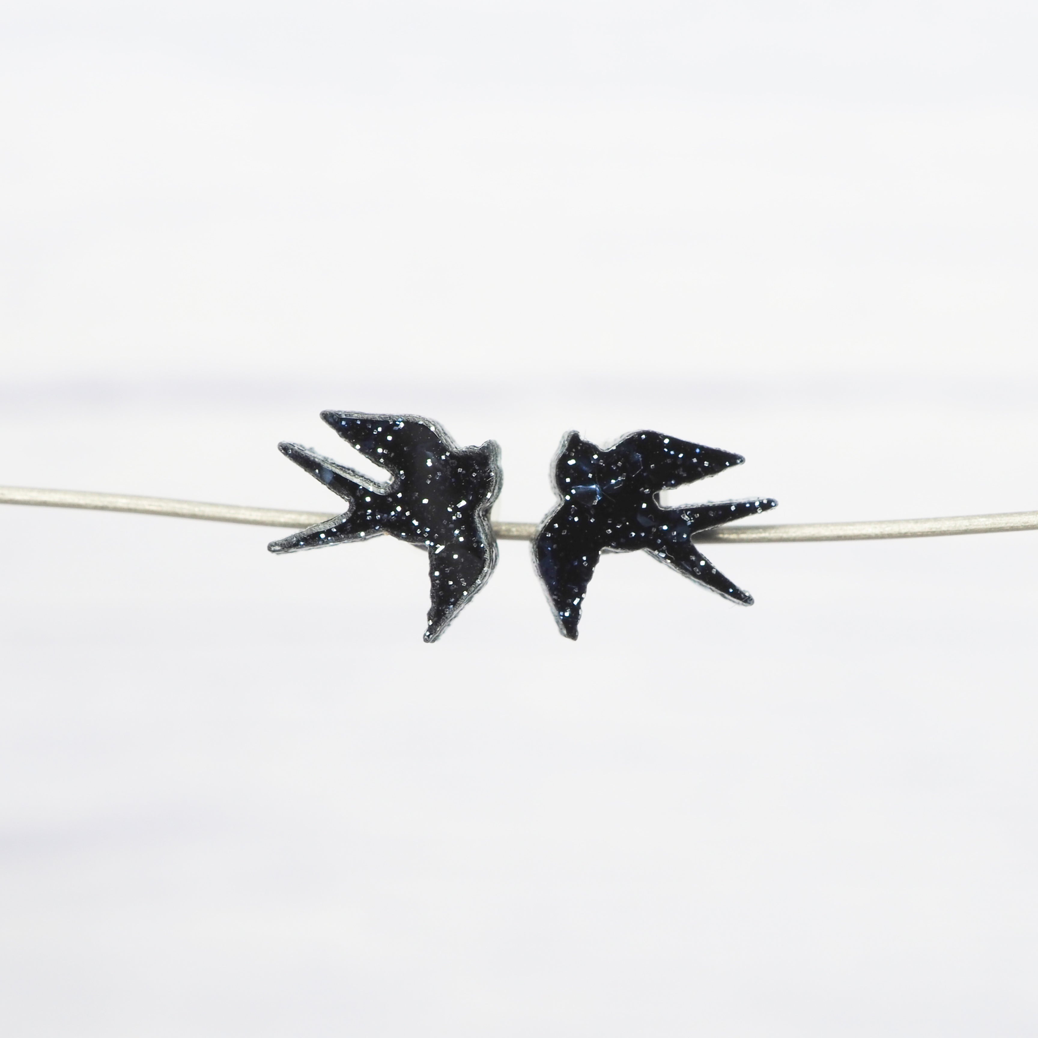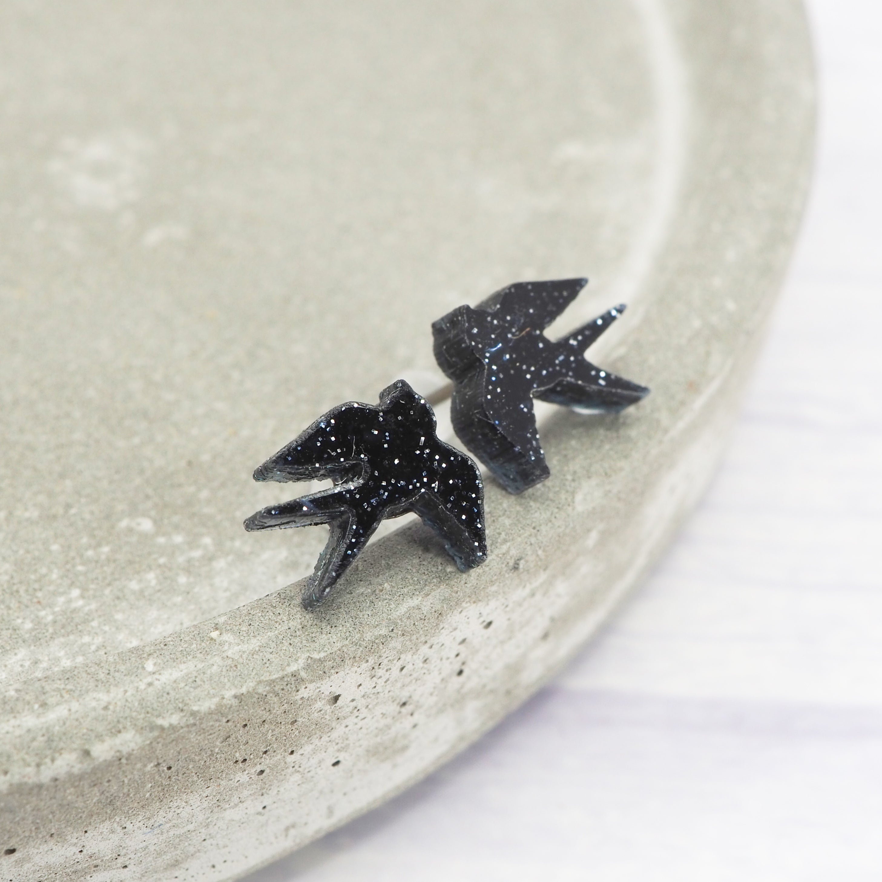 Mini Black glitter acrylic swallow bird studs with 0.7mm ear stems.