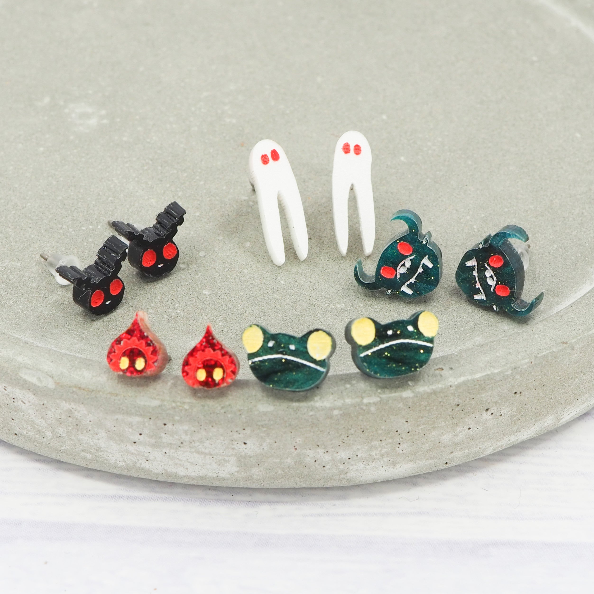Mini Flatwoods monster acrylic studs with 0.7mm ear stems.