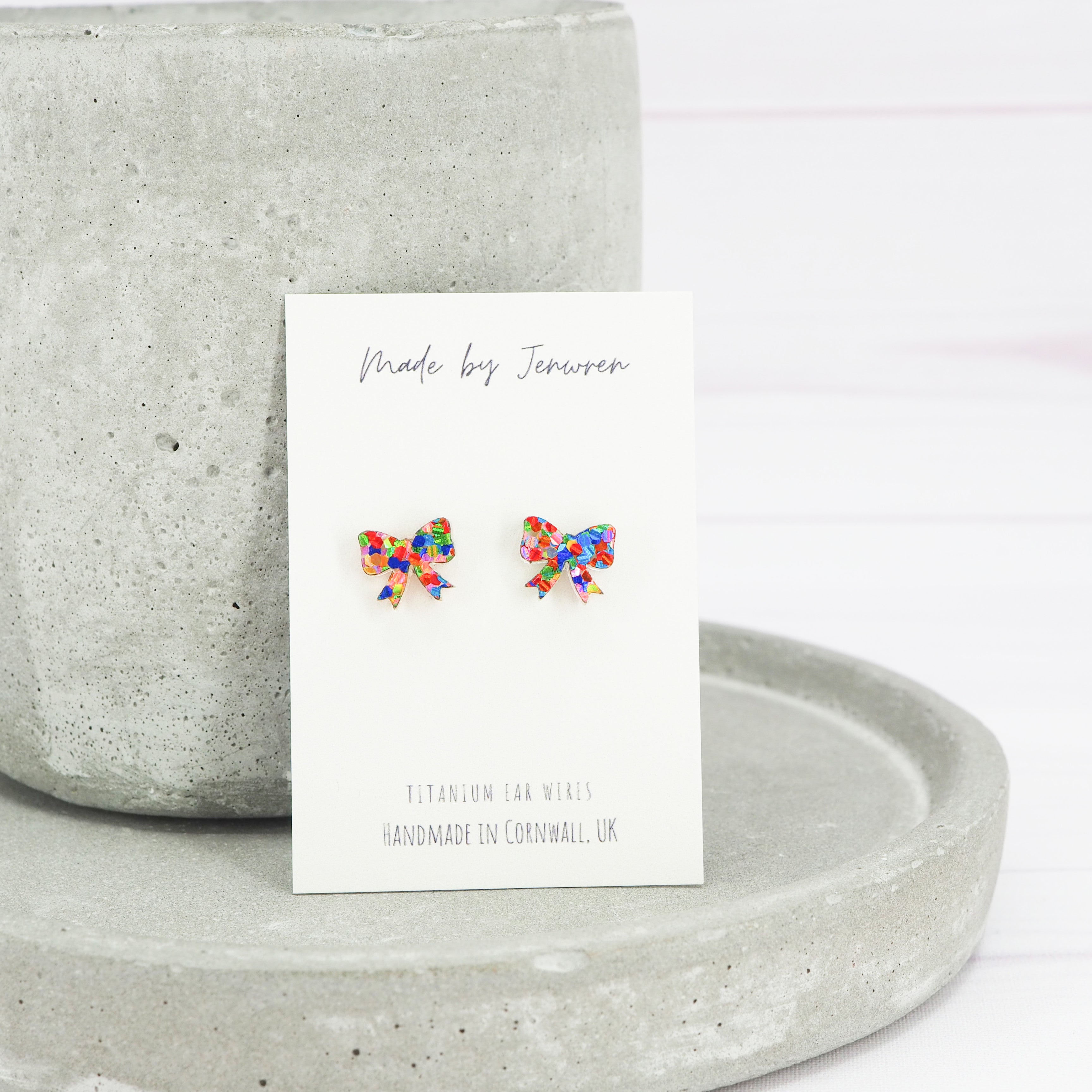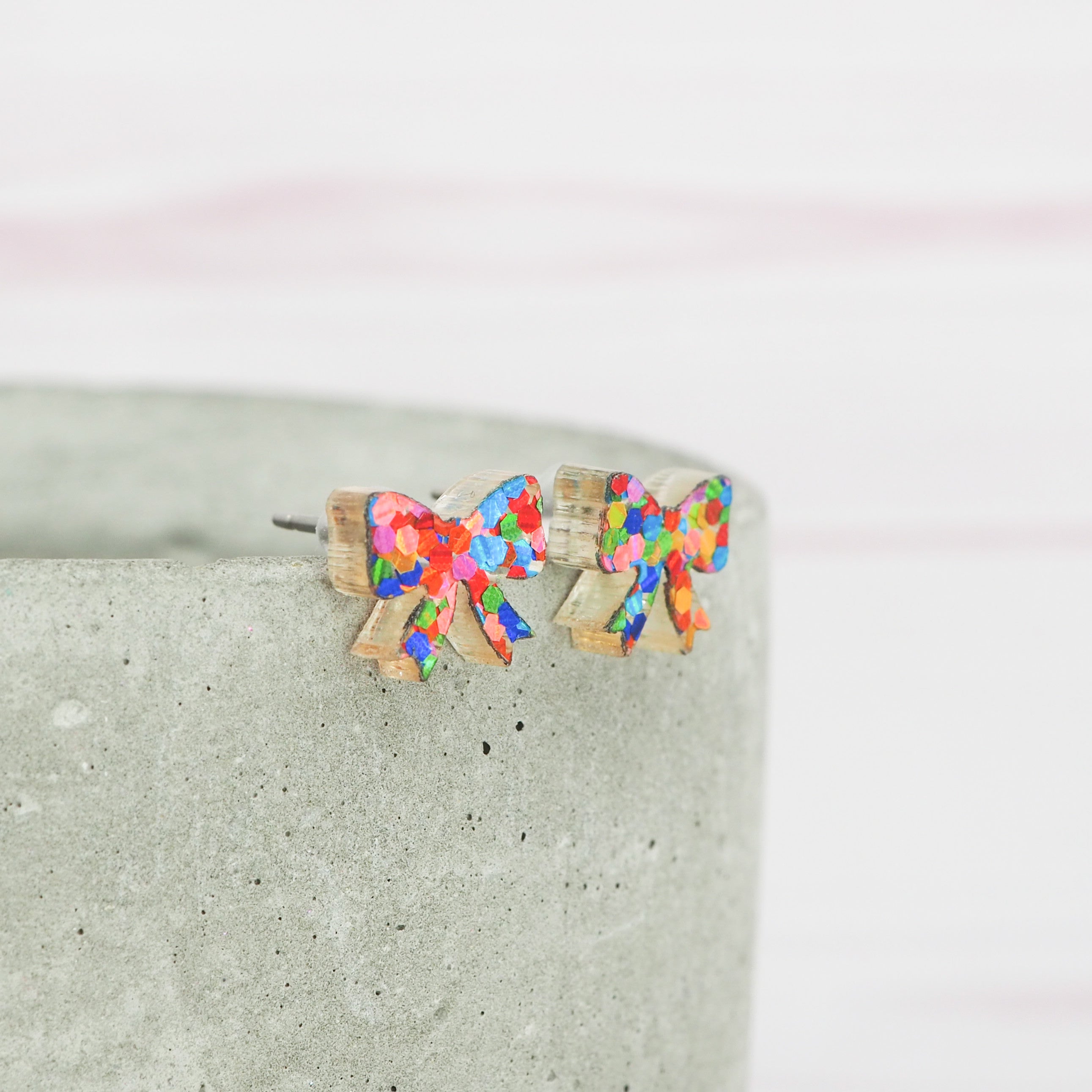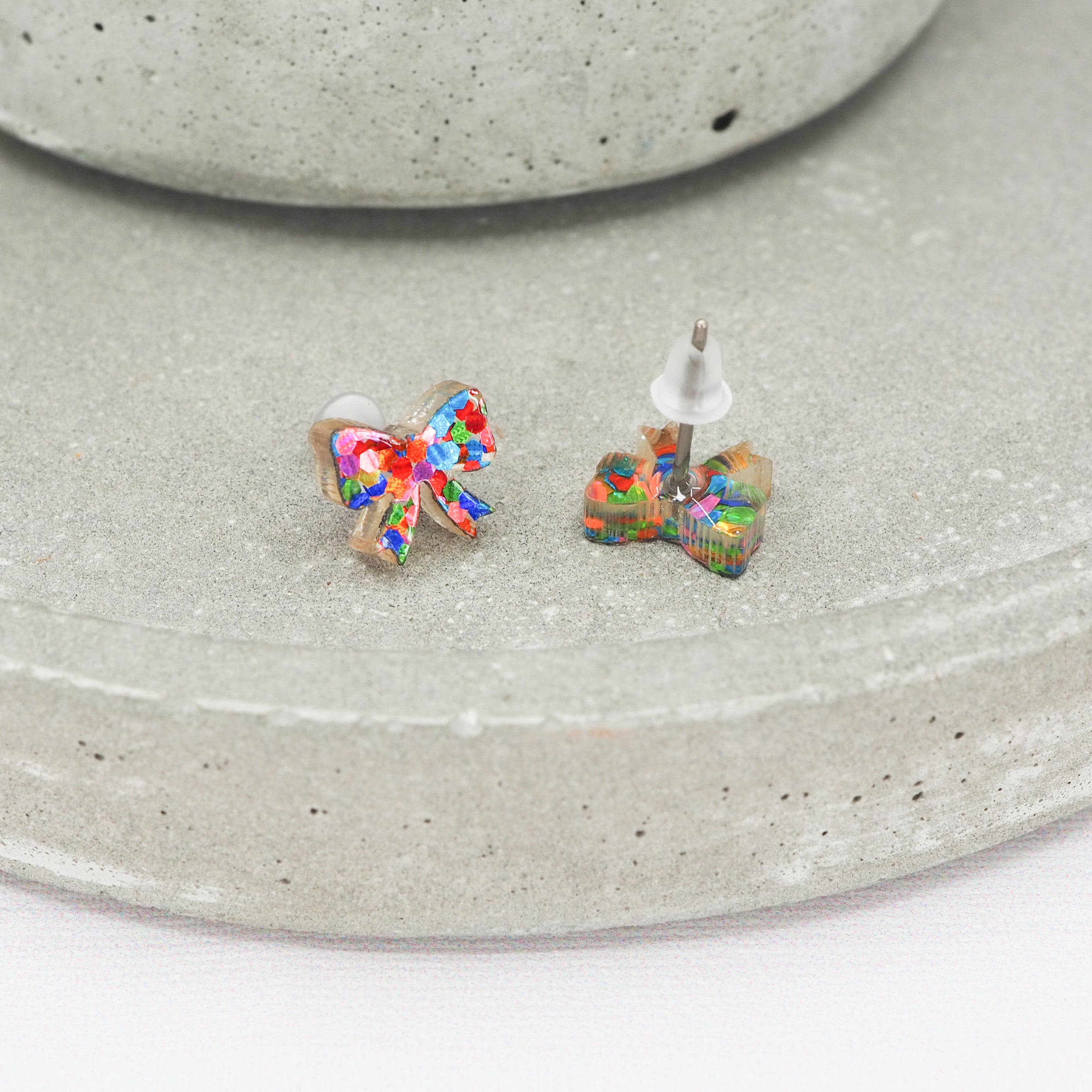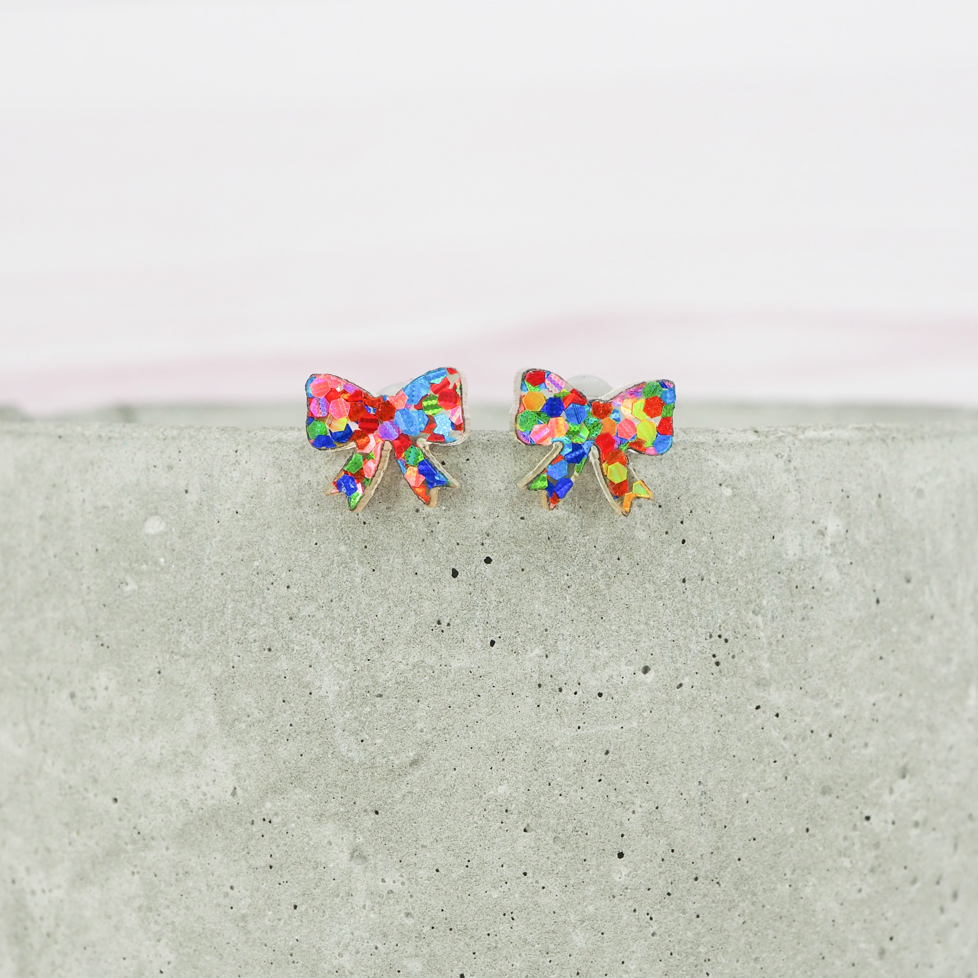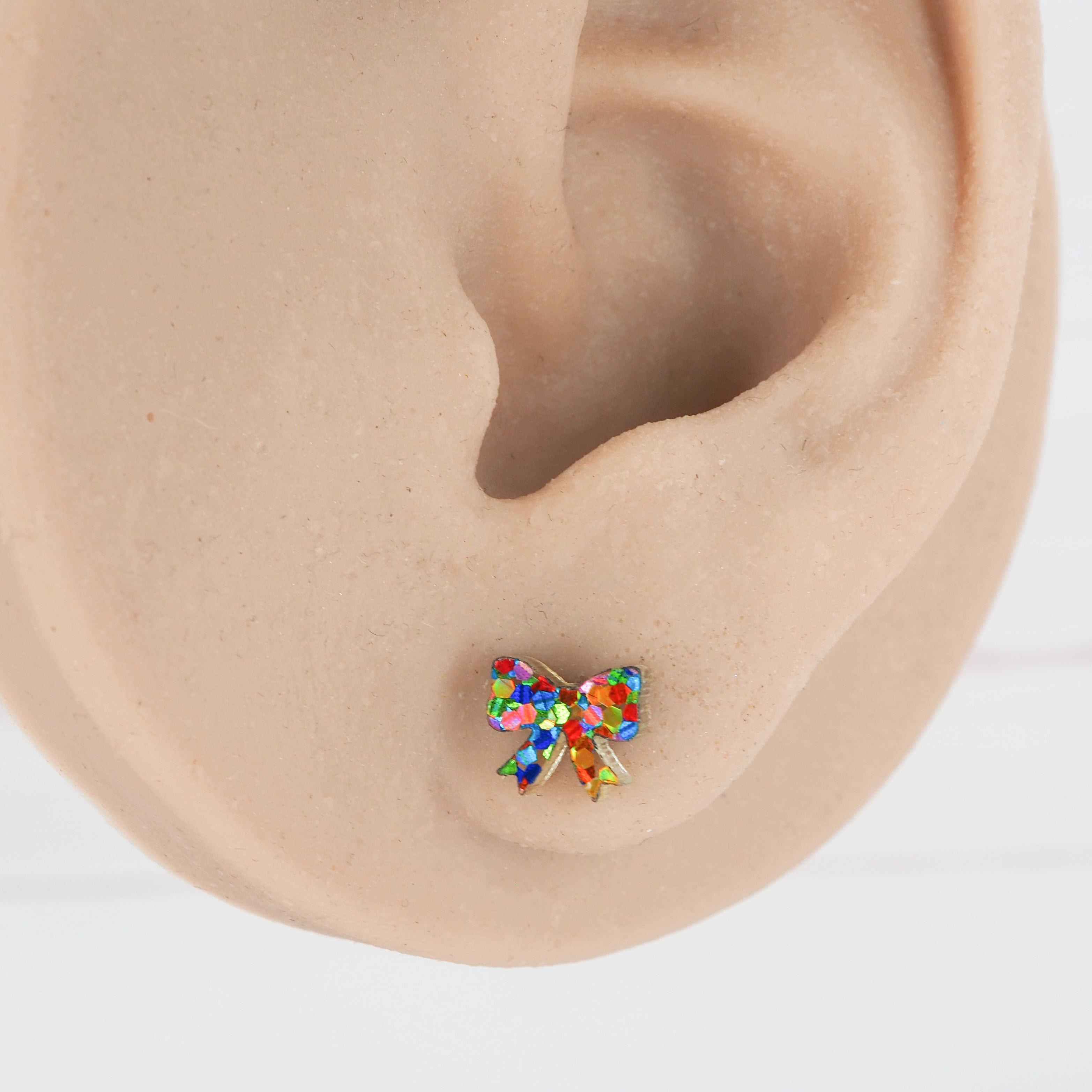 Mini mixed glitter bow studs with 0.7mm ear stems.