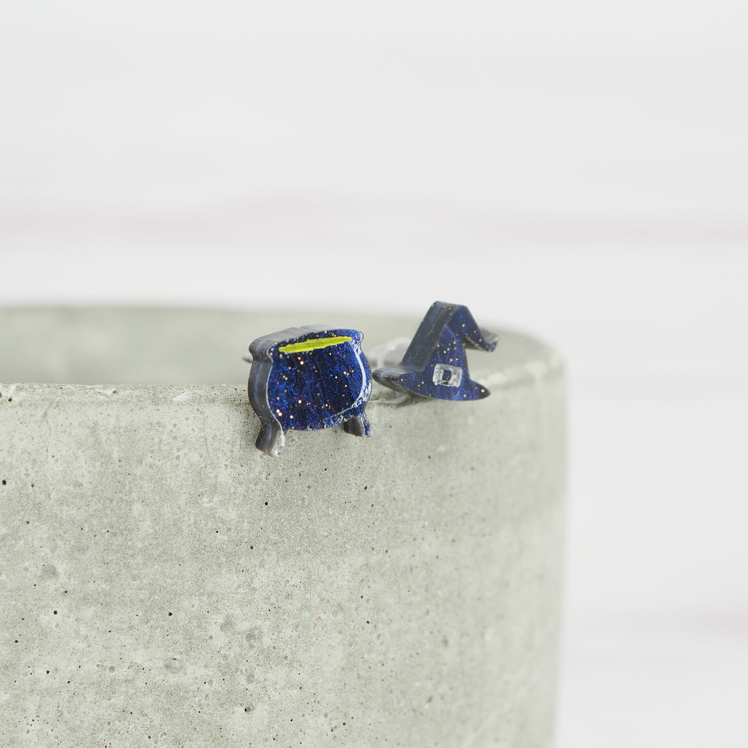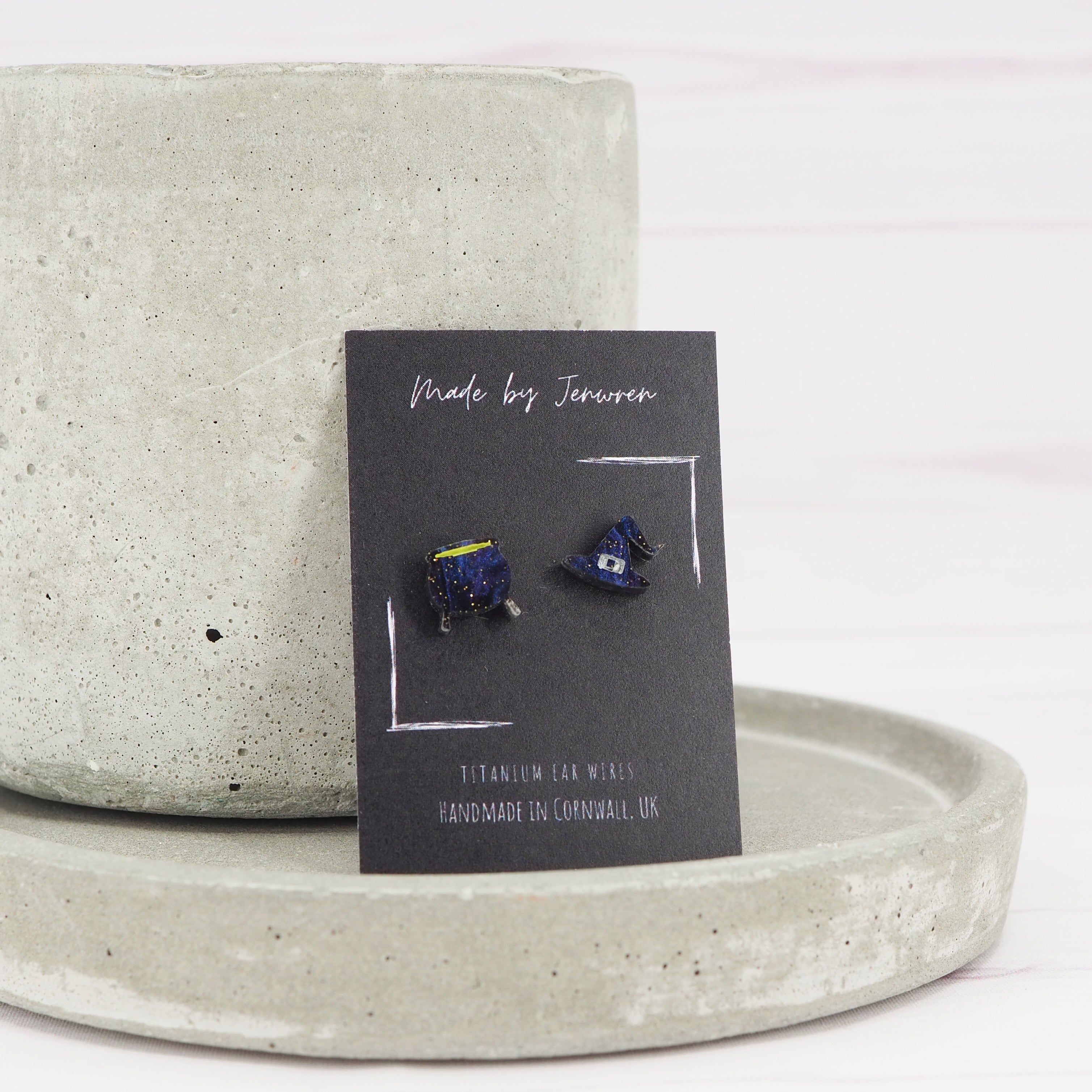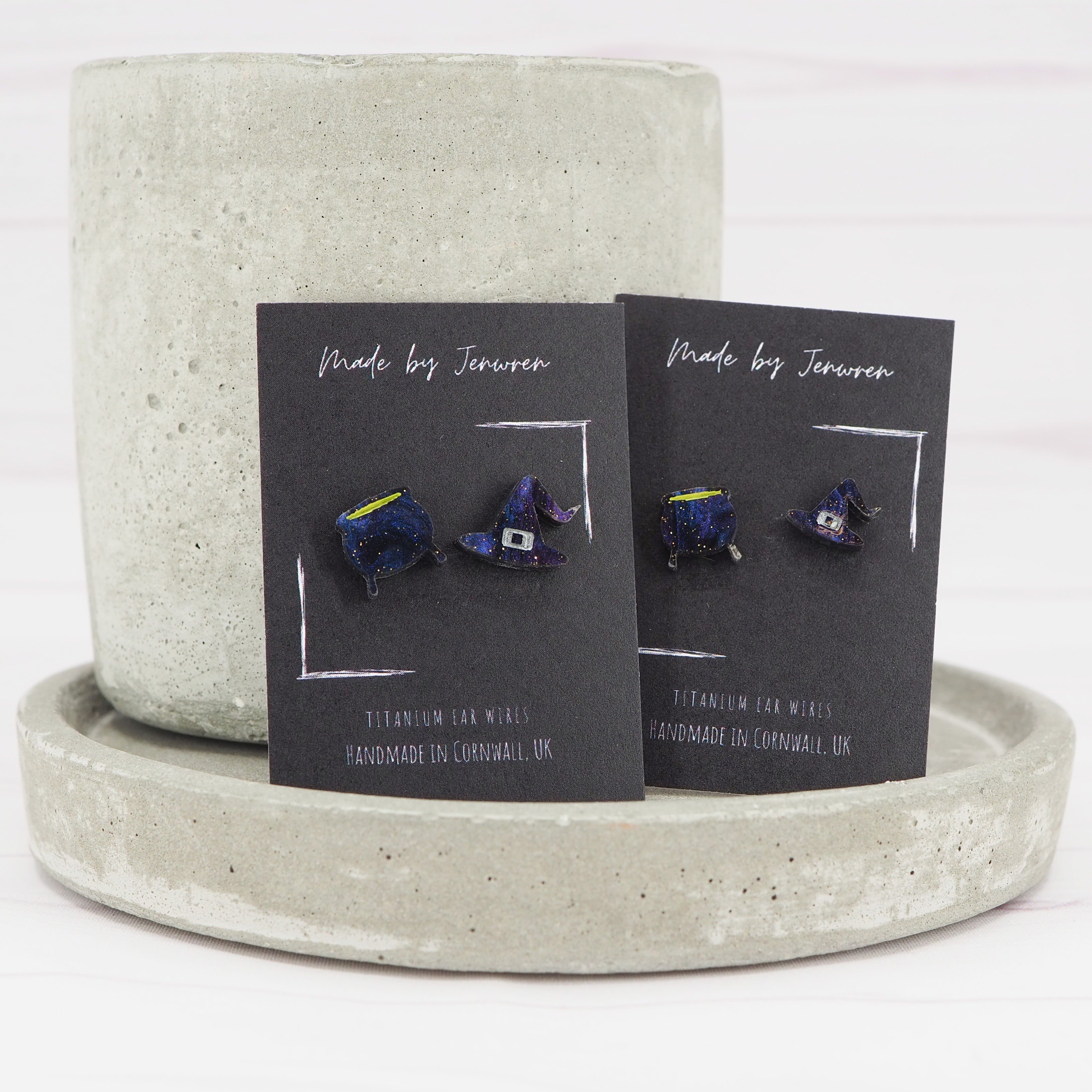 Mini Purple galaxy witches hat and cauldron studs with 0.7mm Grade 1 titanium ear stems.
