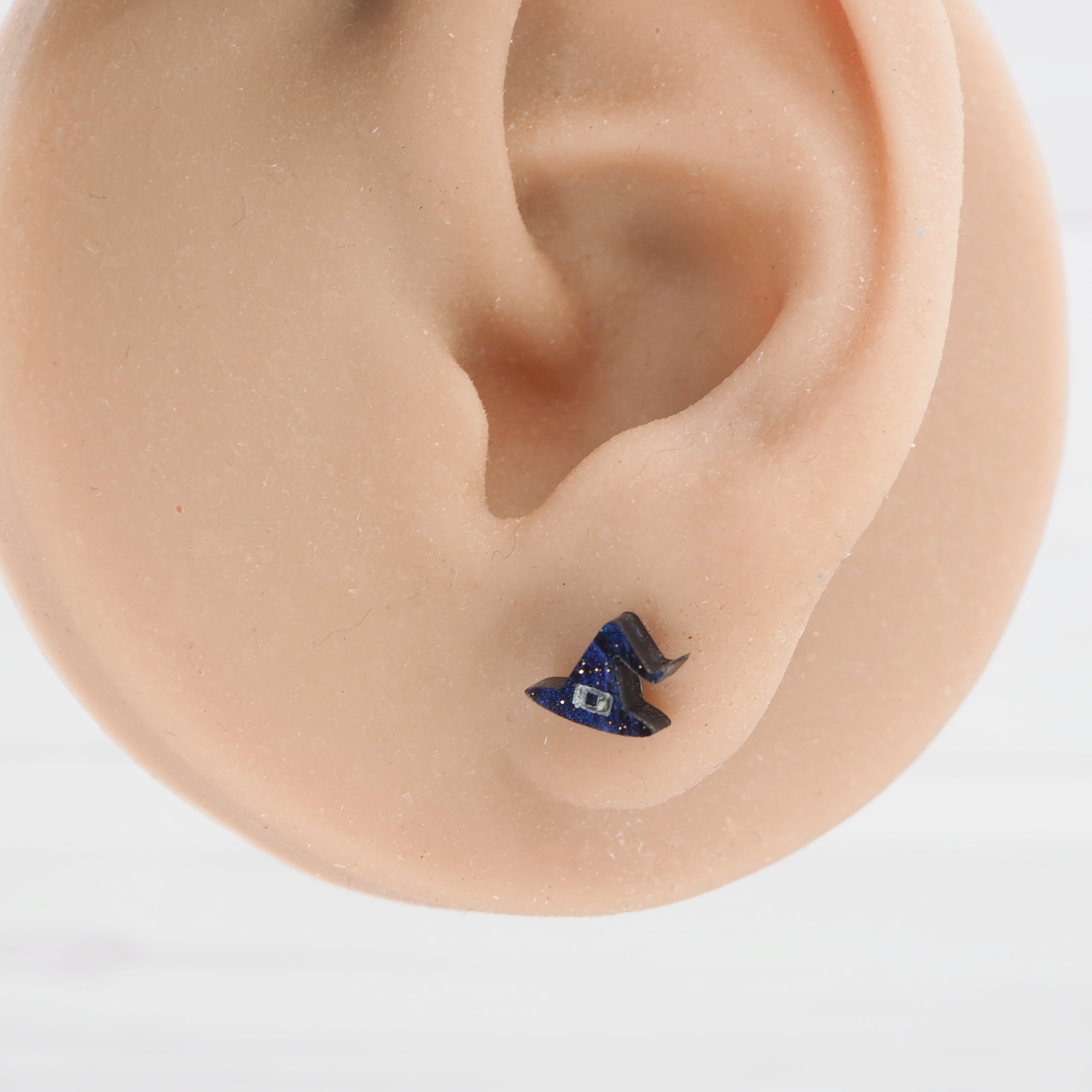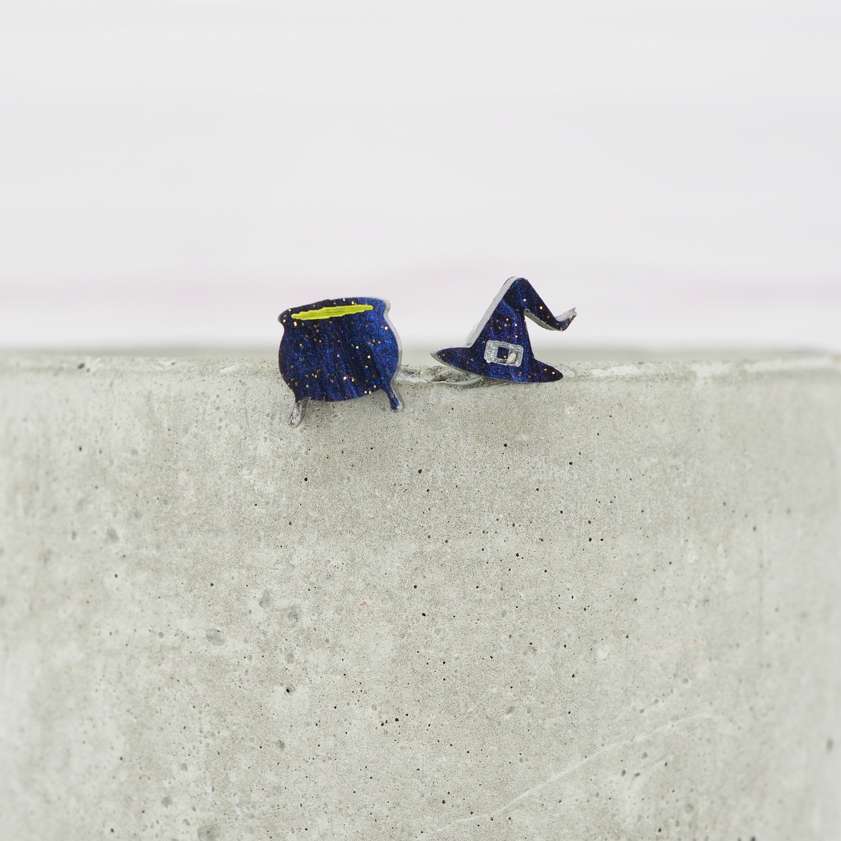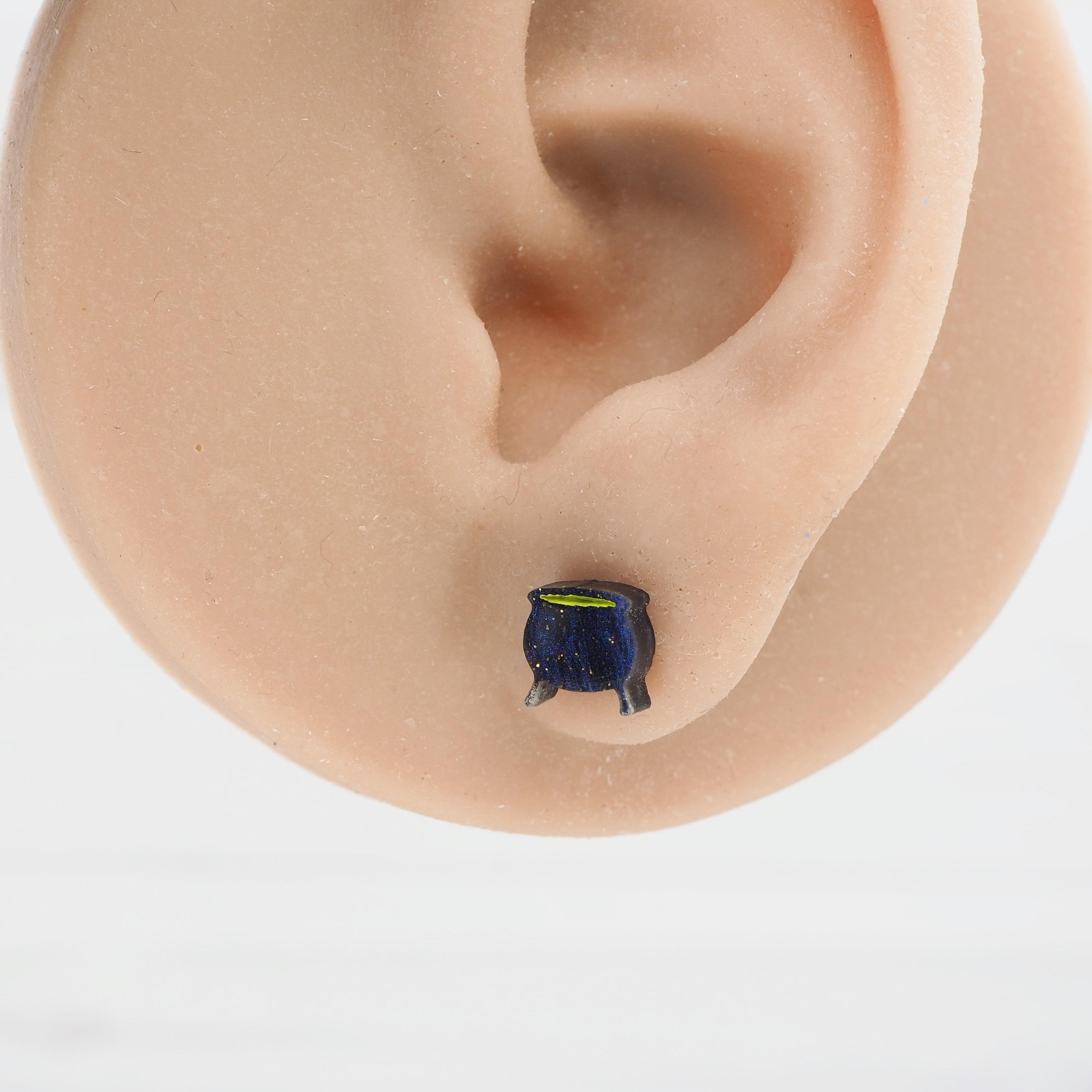 Mini Purple galaxy witches hat and cauldron studs with 0.7mm Grade 1 titanium ear stems.
