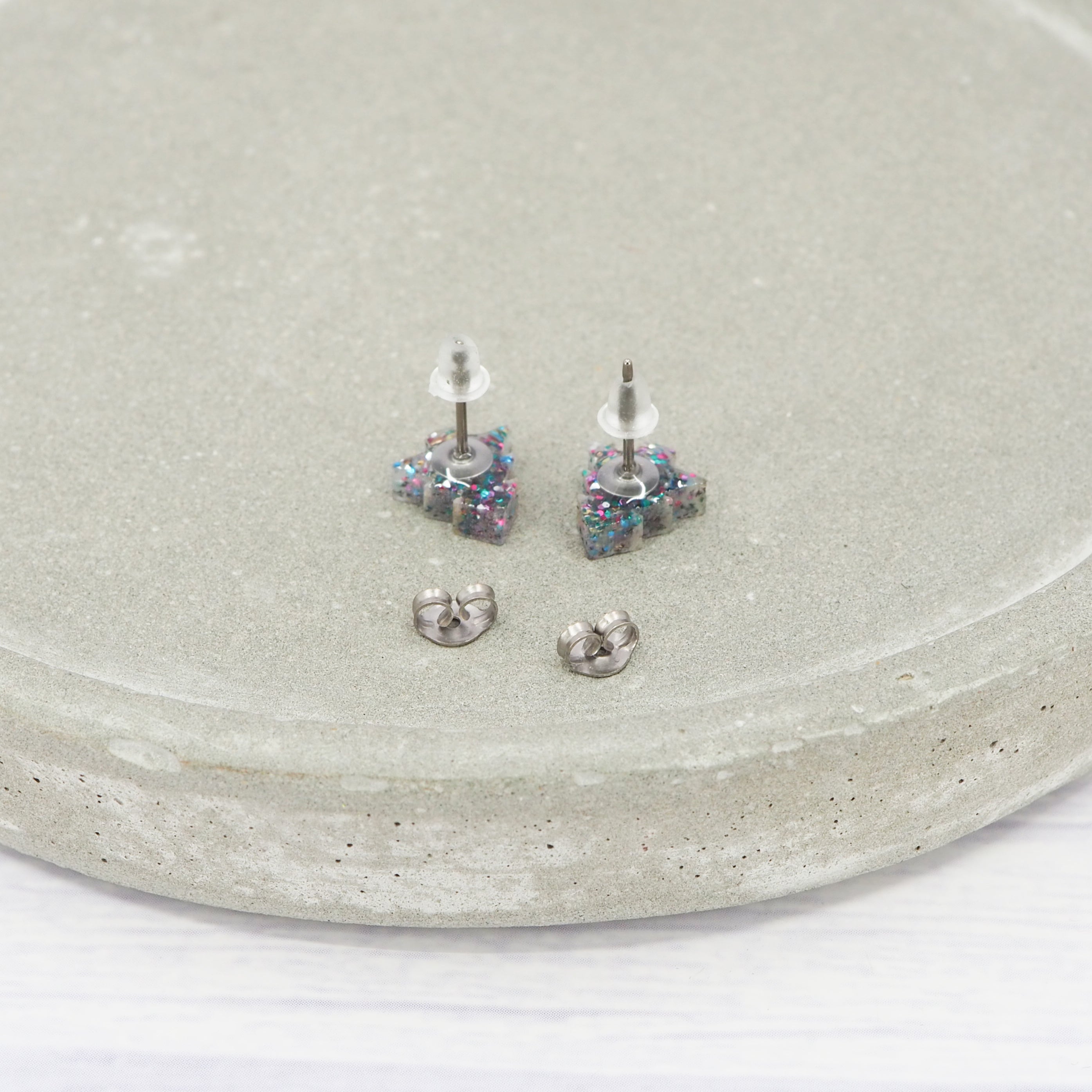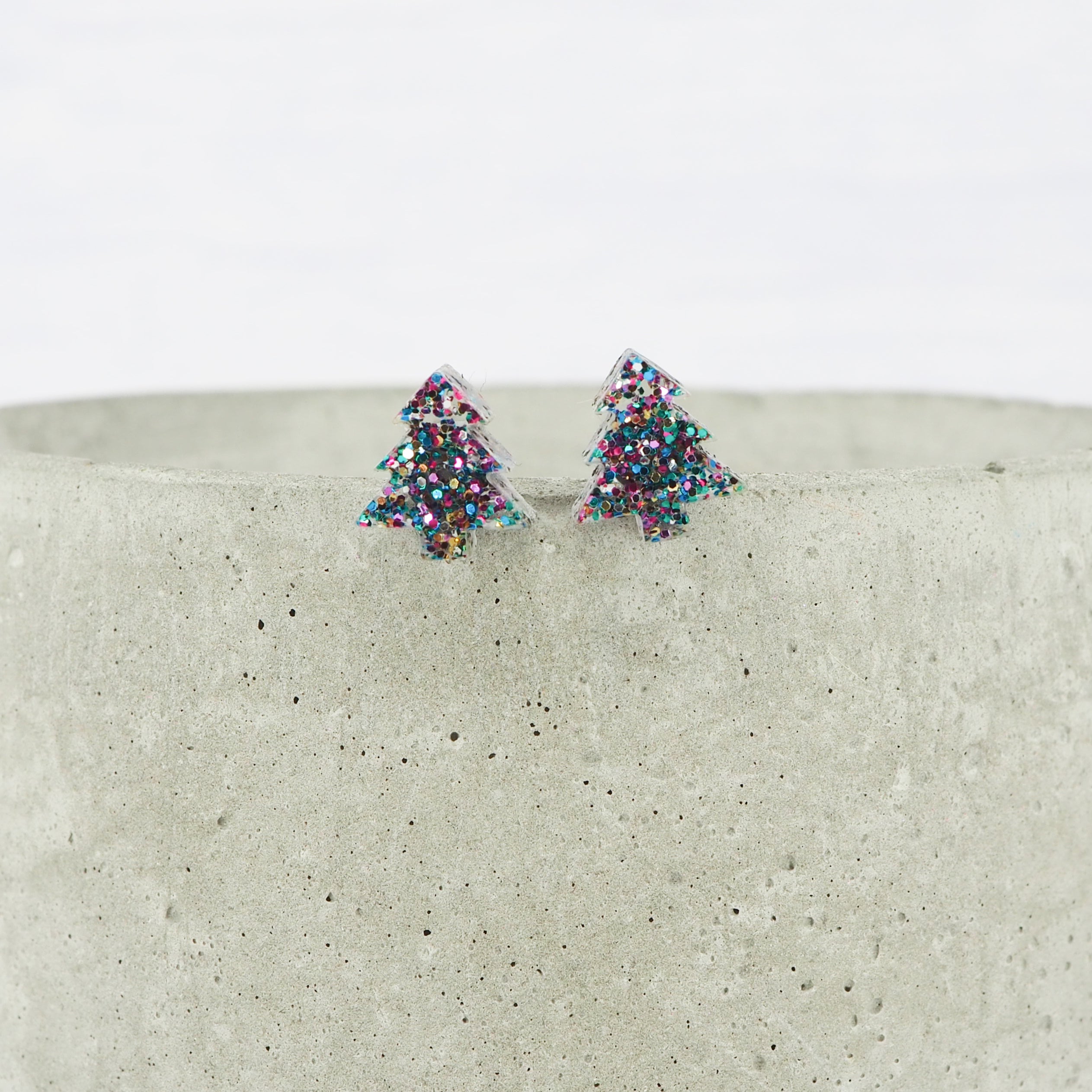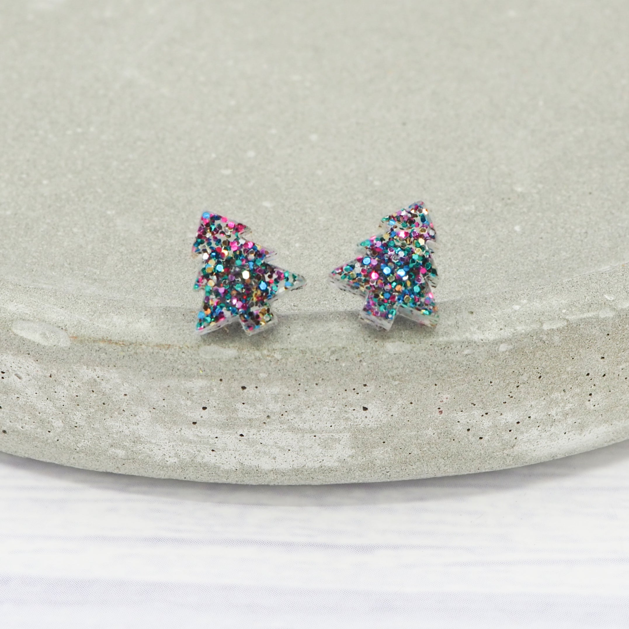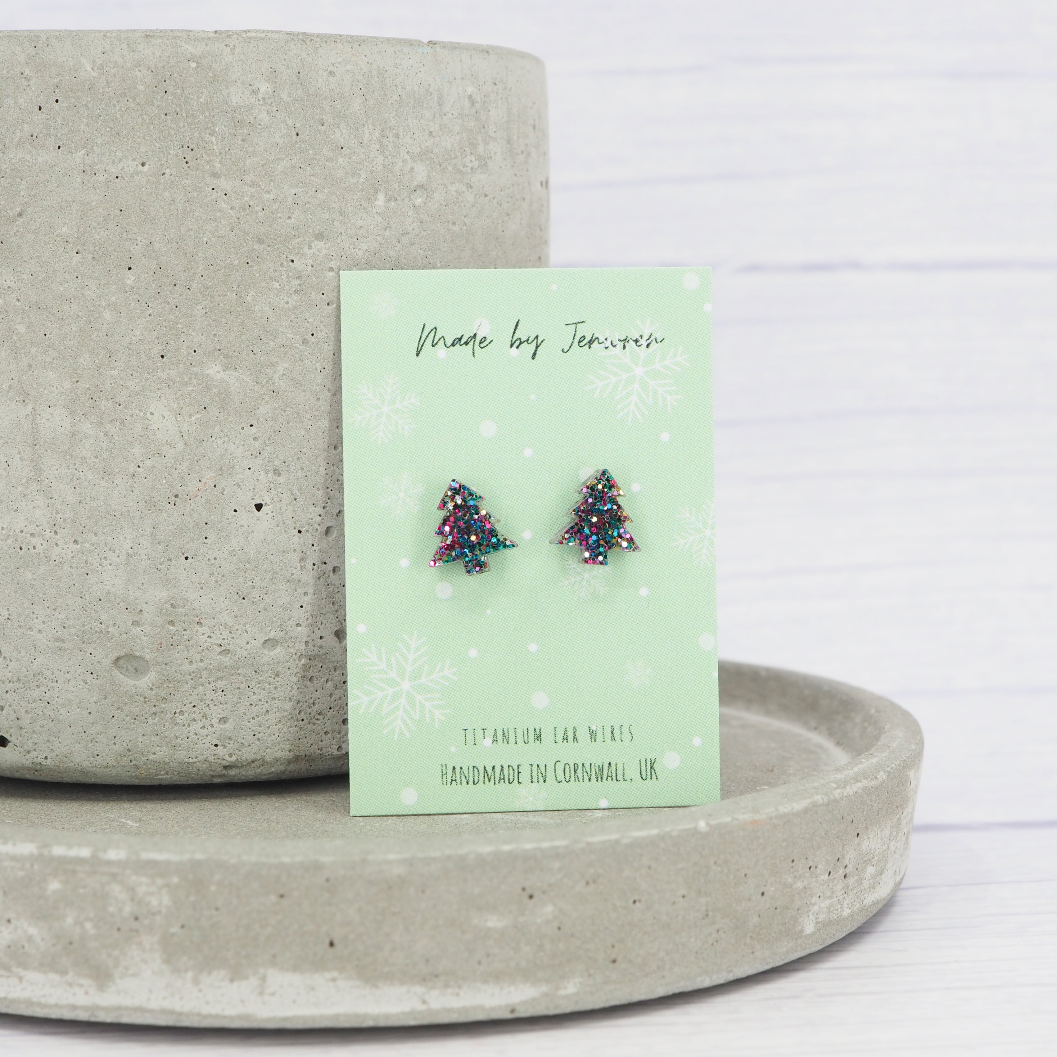 Mixed glitter Christmas tree studs with 0.7mm ear stems.