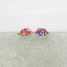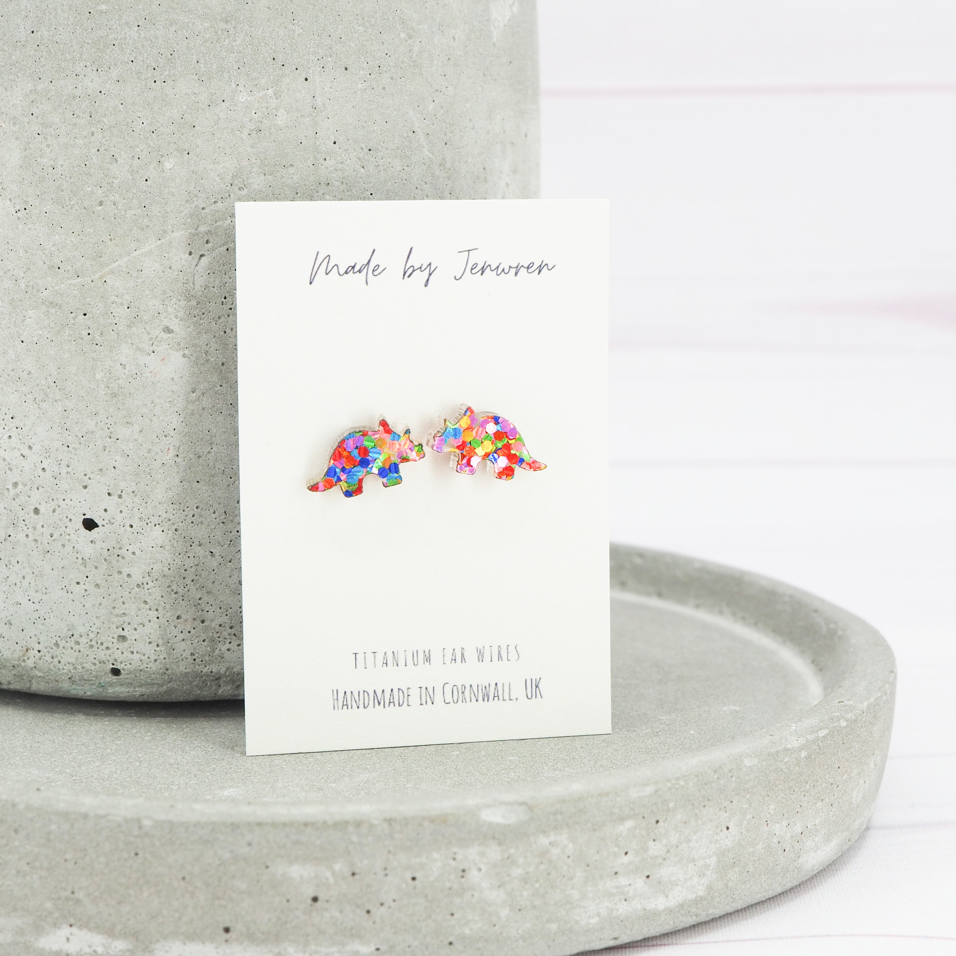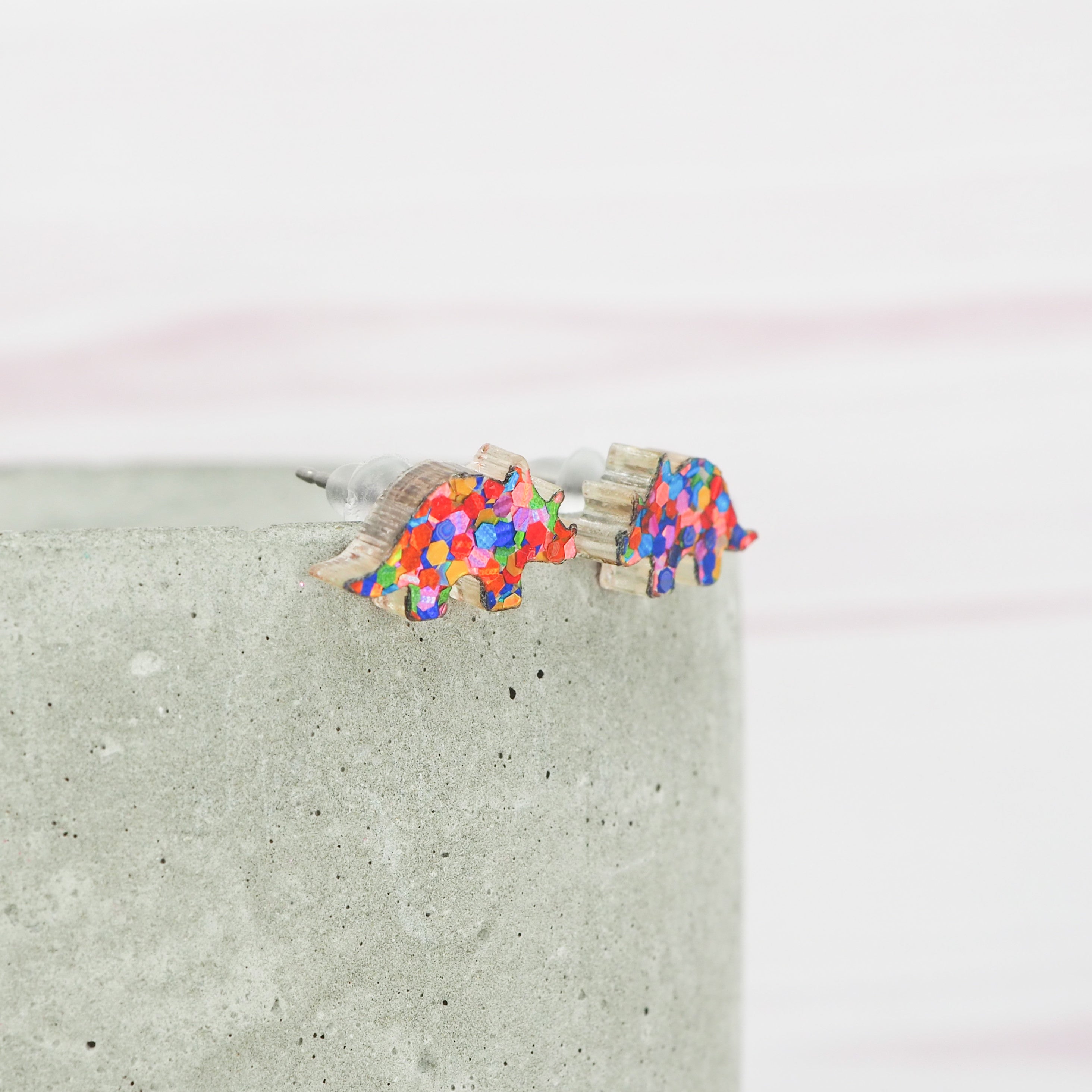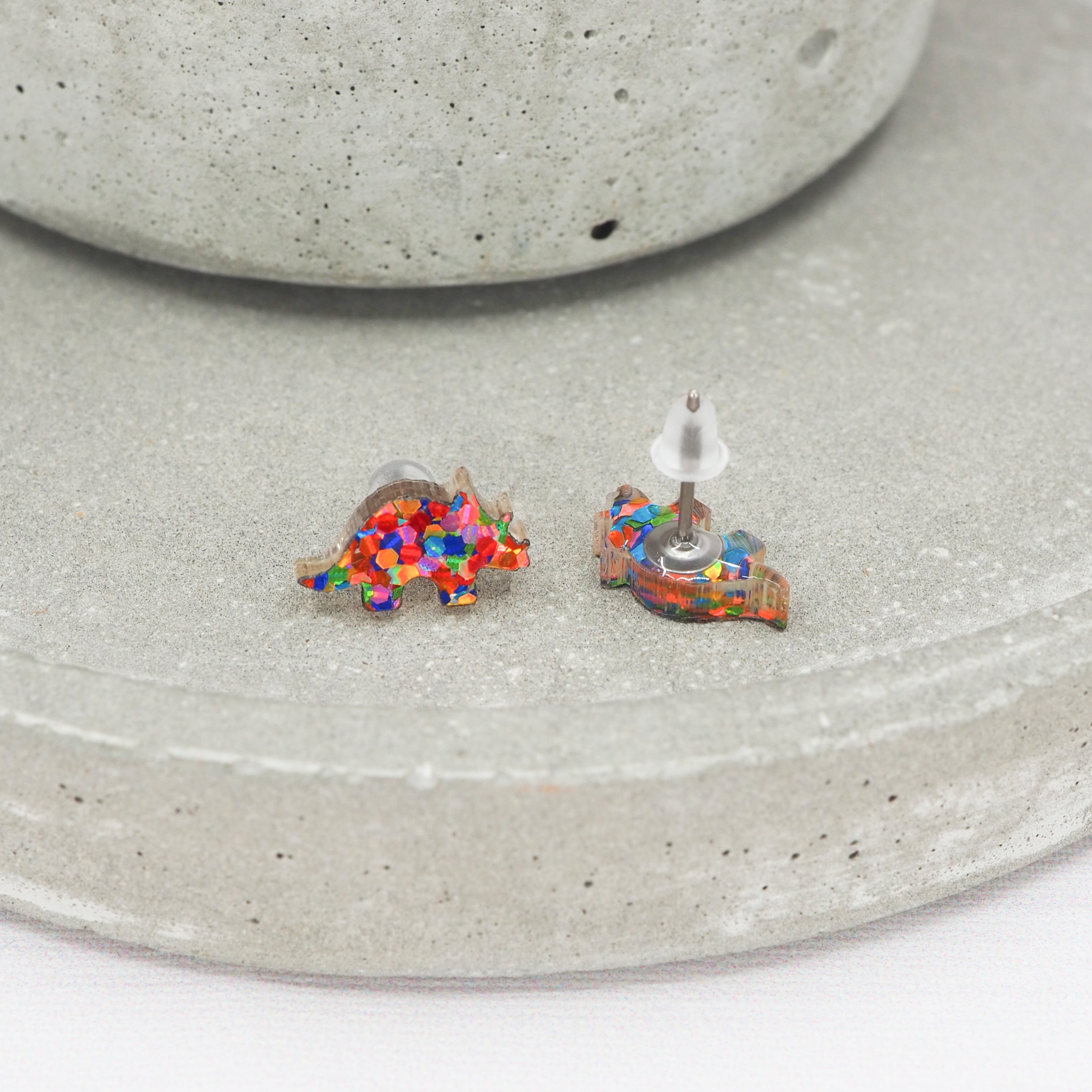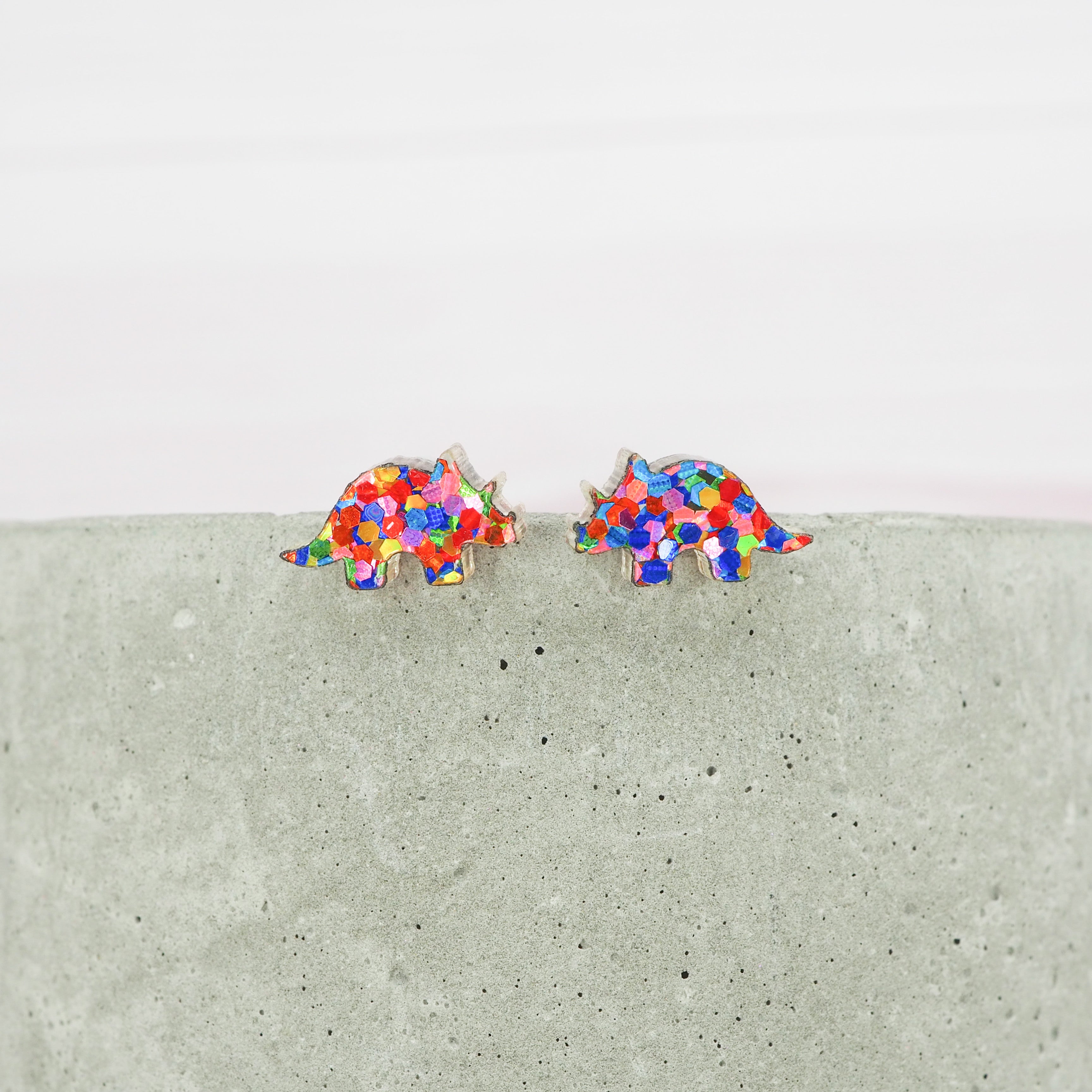 Mixed glitter acrylic Triceratops studs with 0.7mm ear stems.