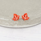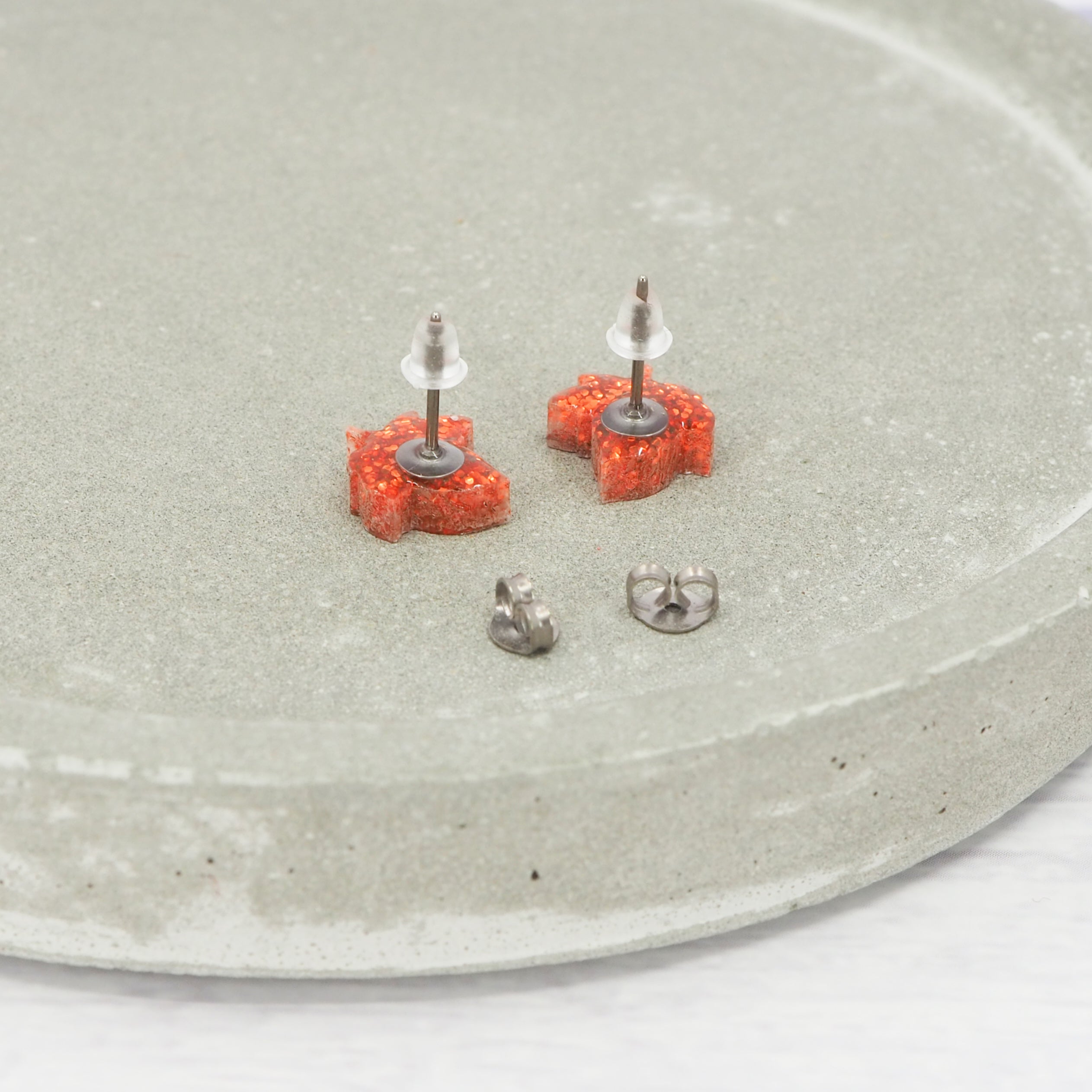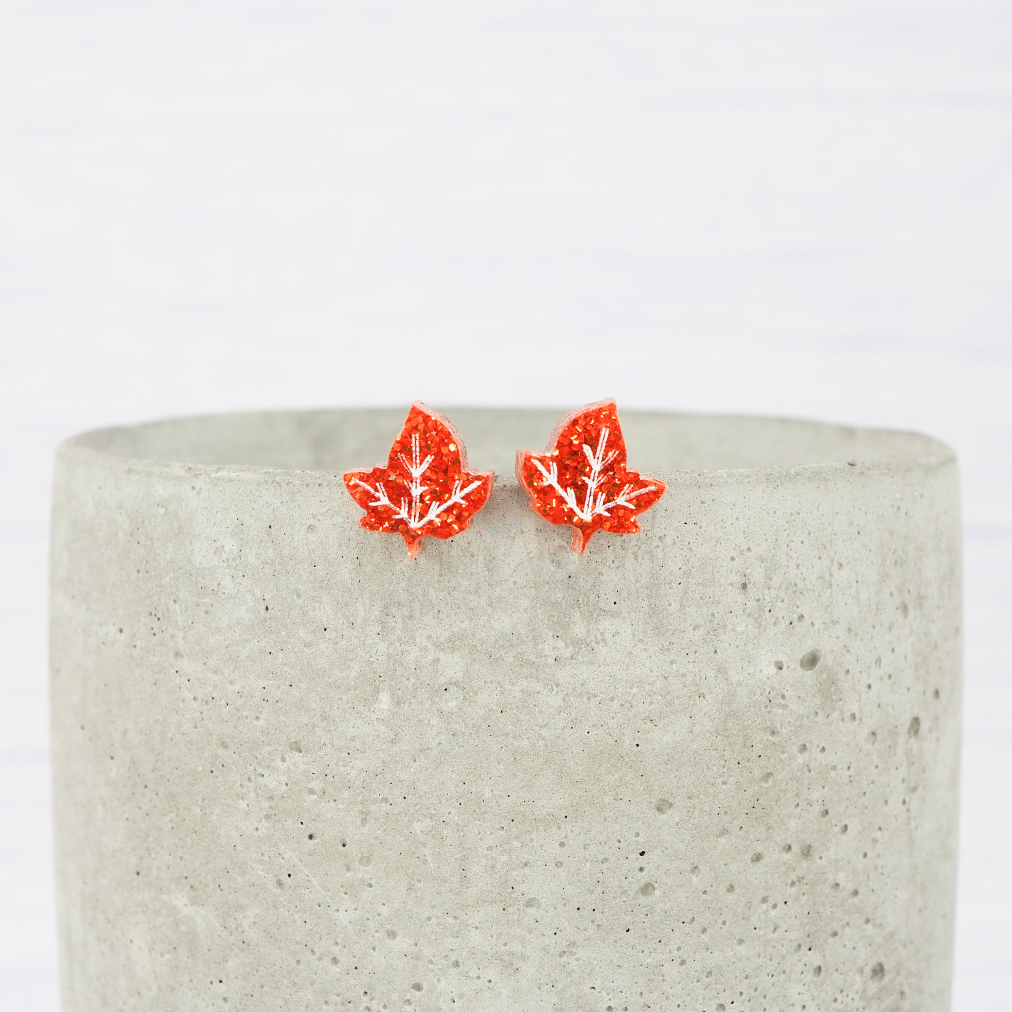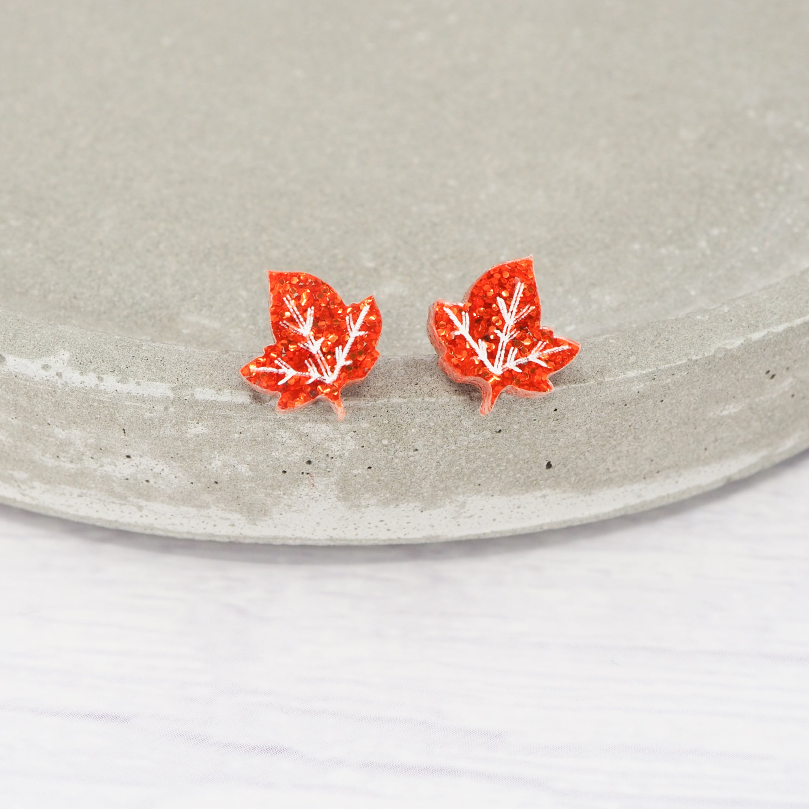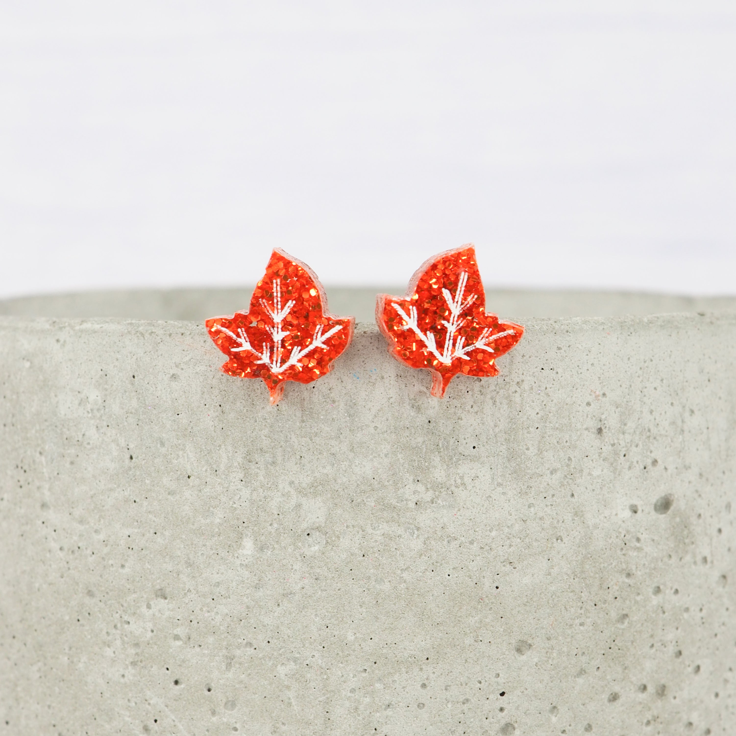 Orange glitter autumn leaf acrylic studs with 0.7mm ear stems.