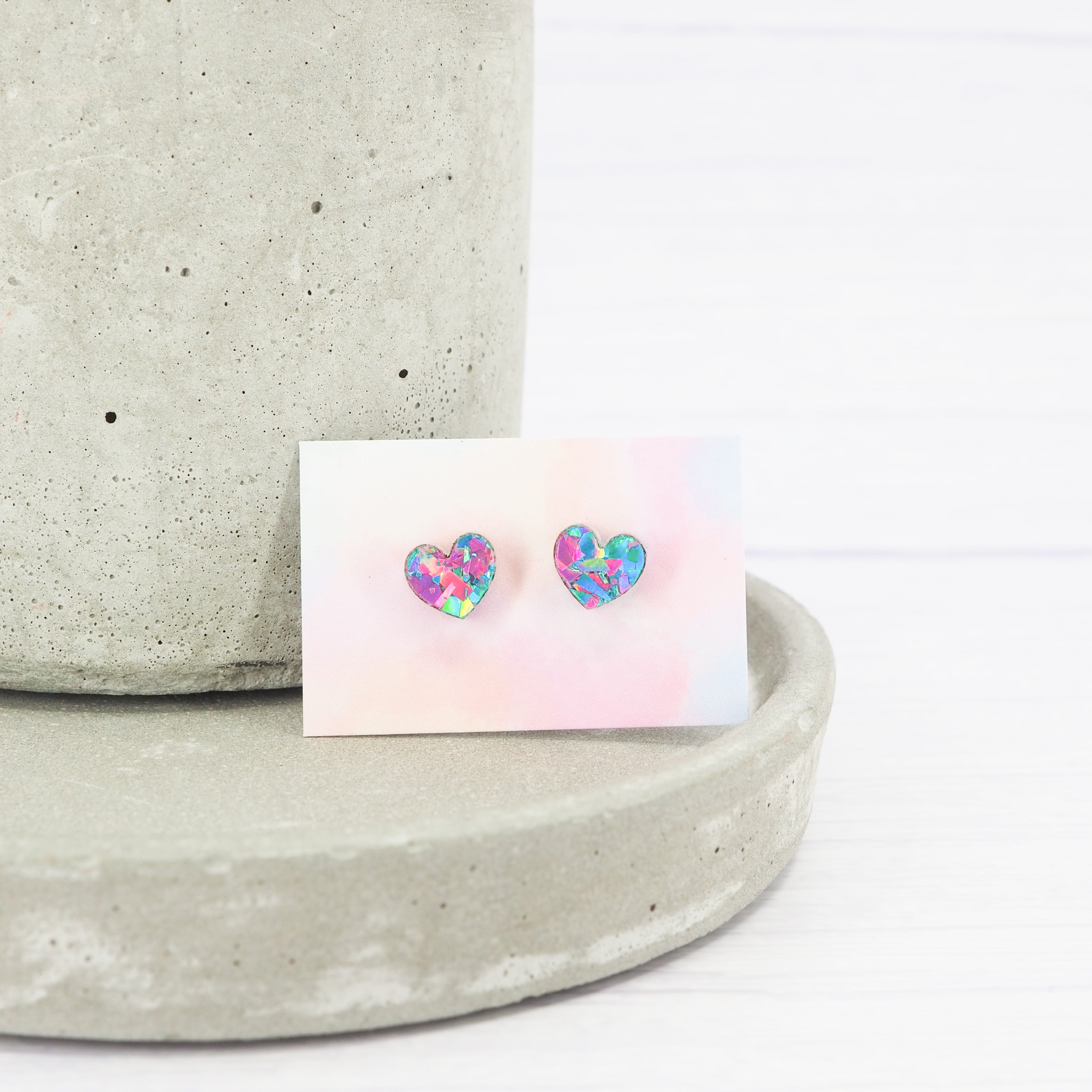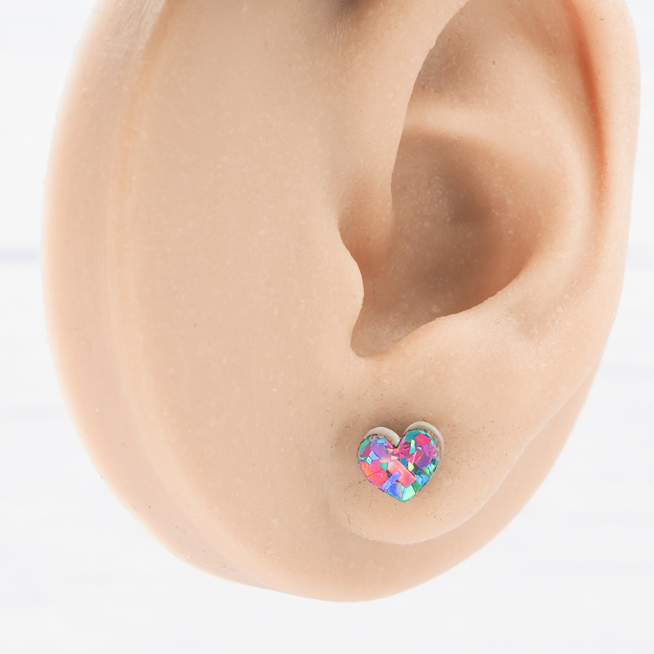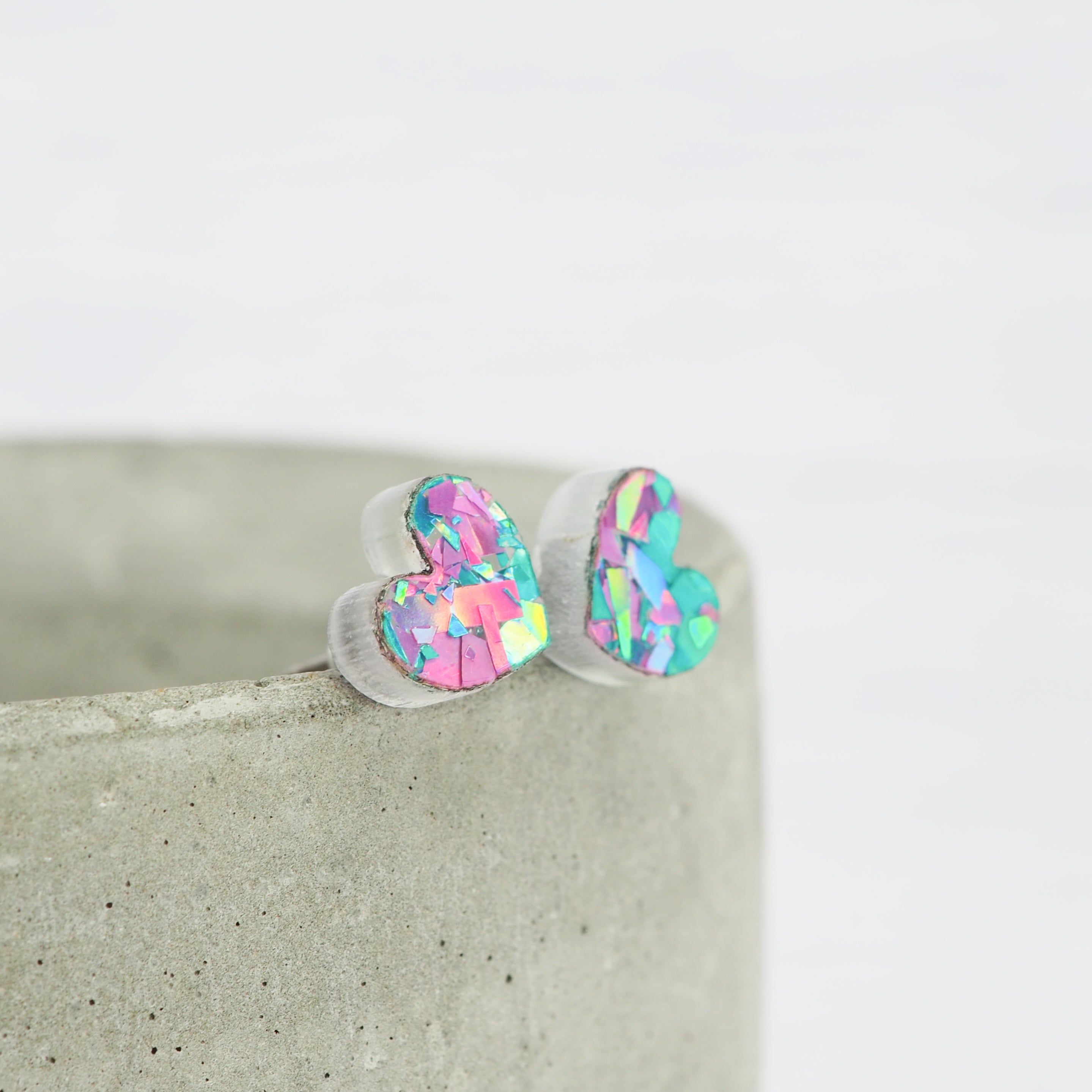 Pink and Blue flake glitter small heart acrylic studs with 0.7mm ear stems.