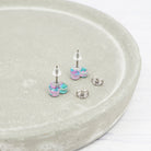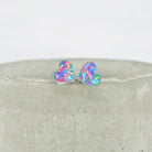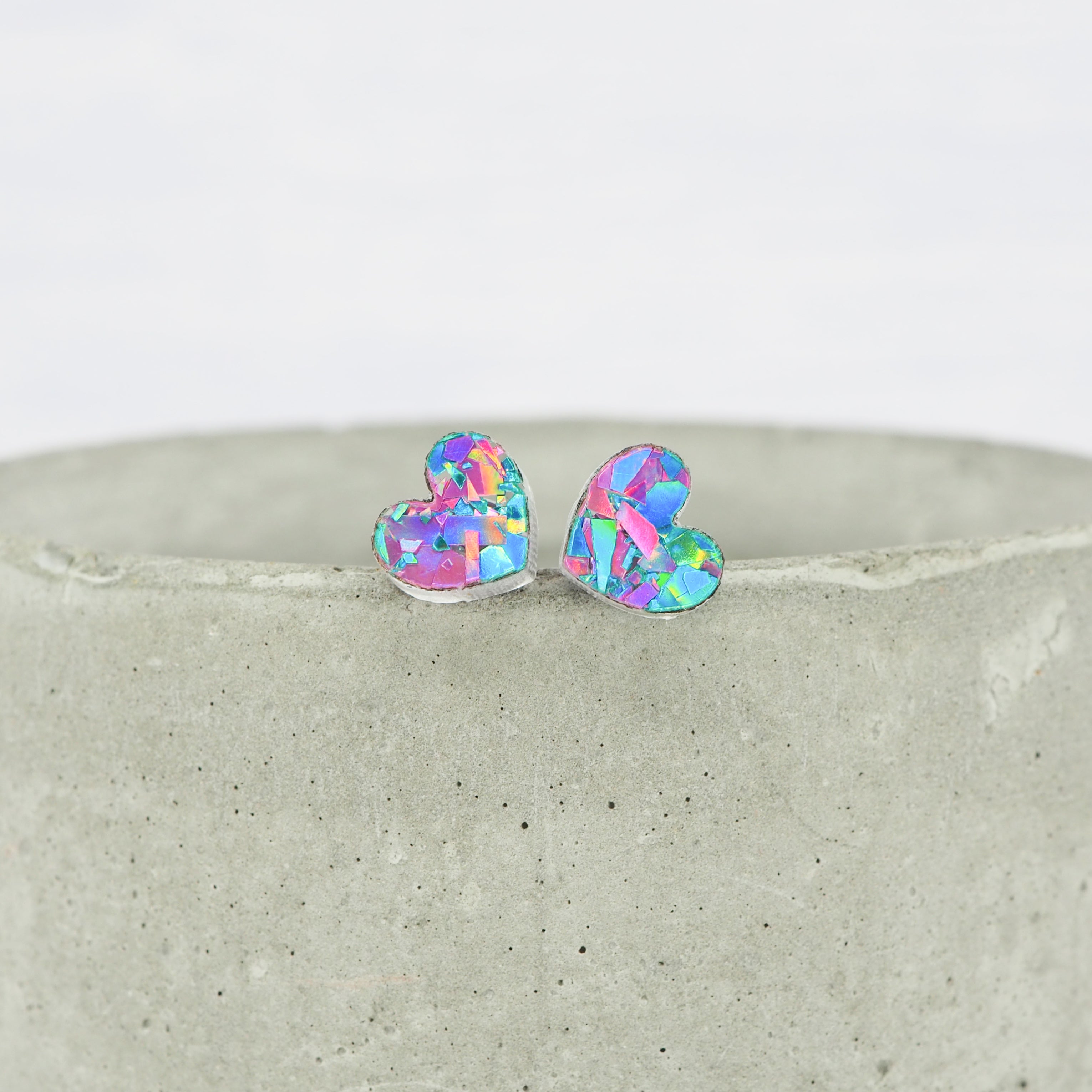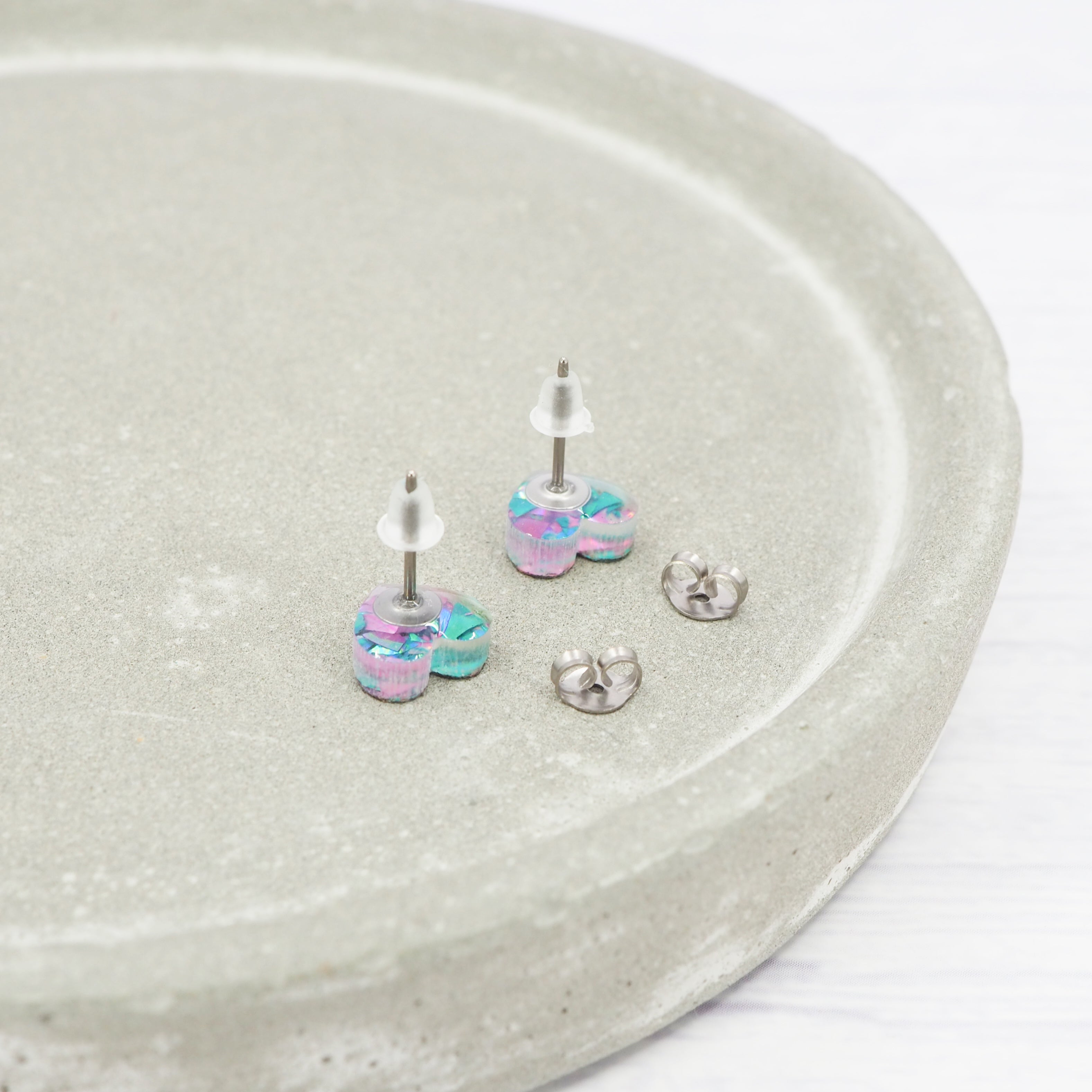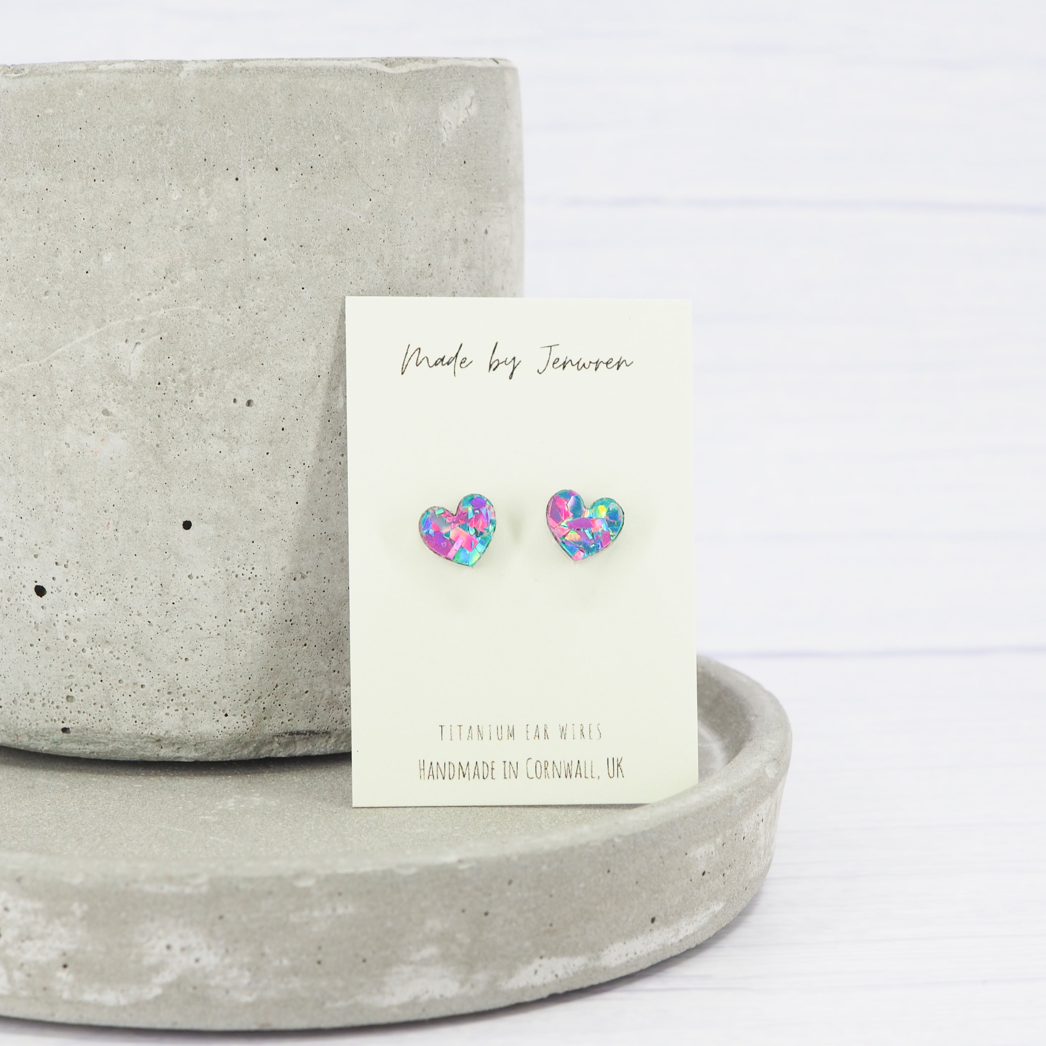 Pink and Blue flake glitter small heart acrylic studs with 0.7mm ear stems.