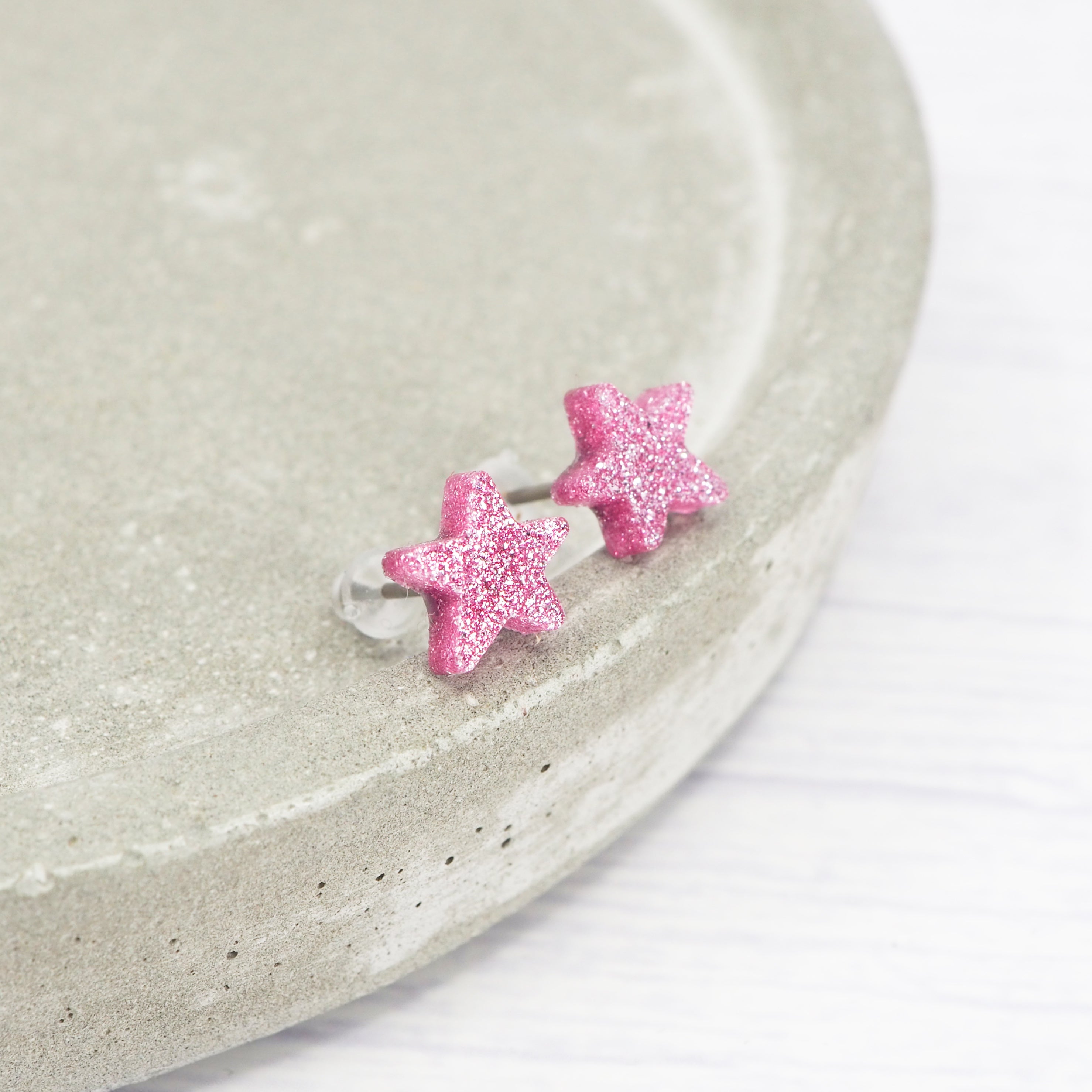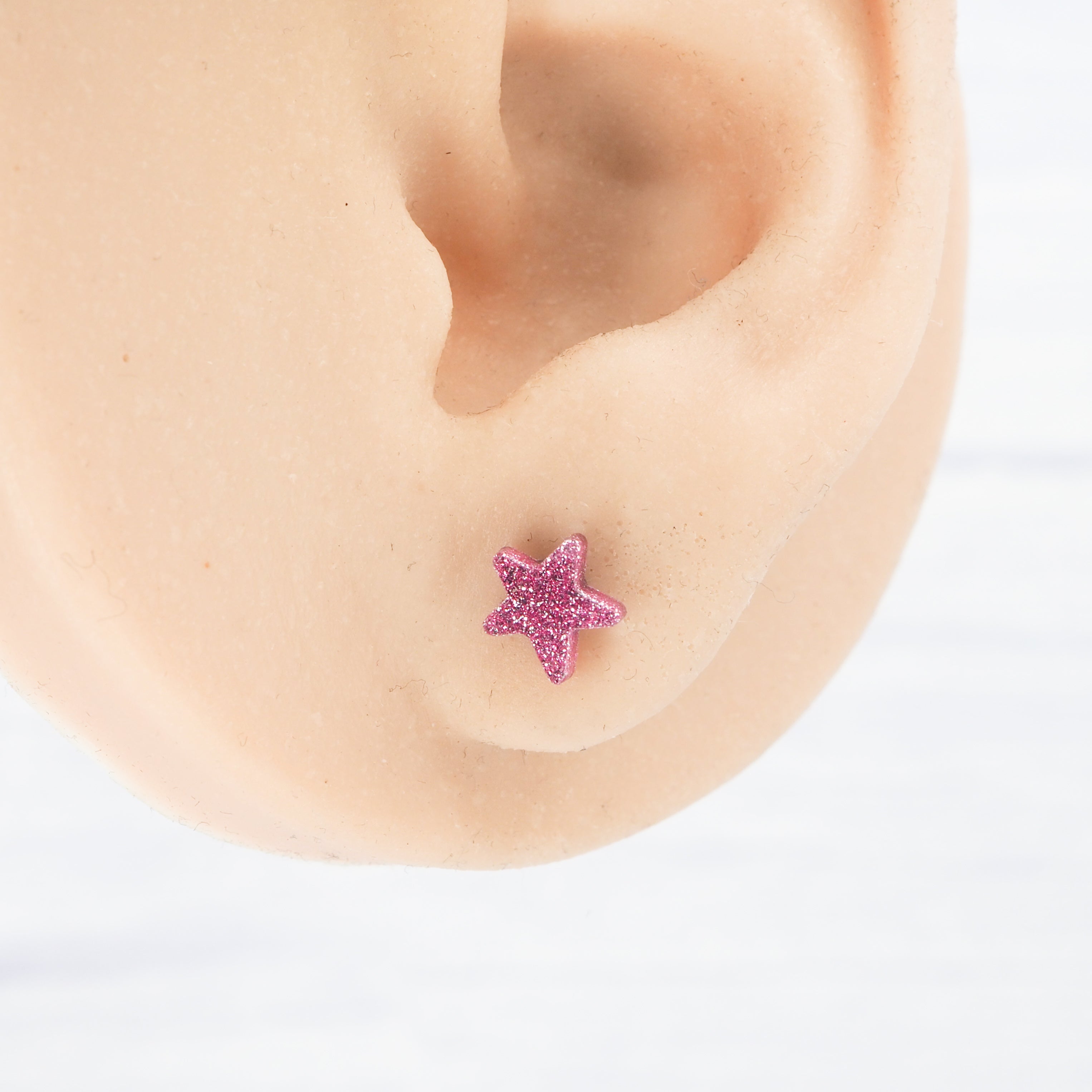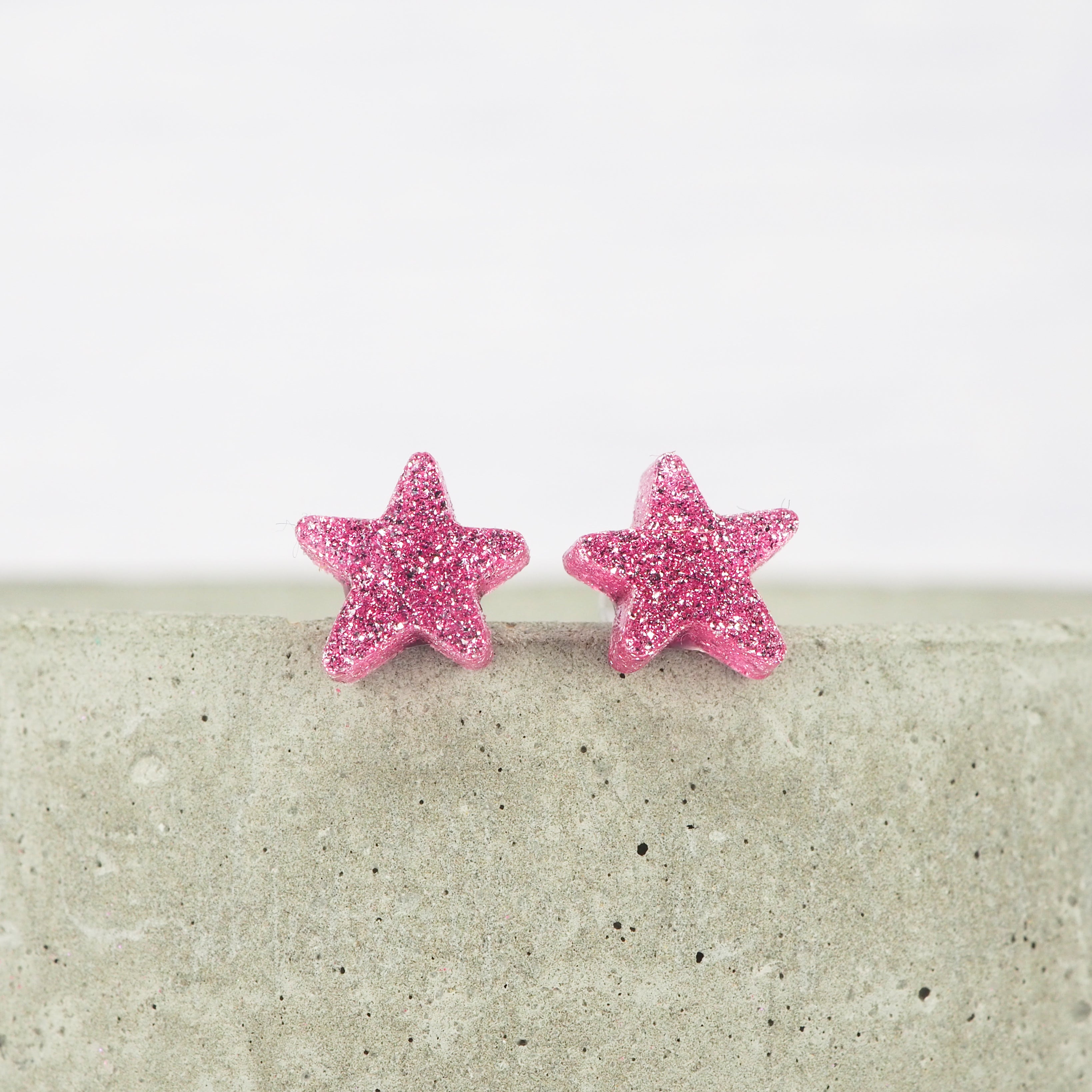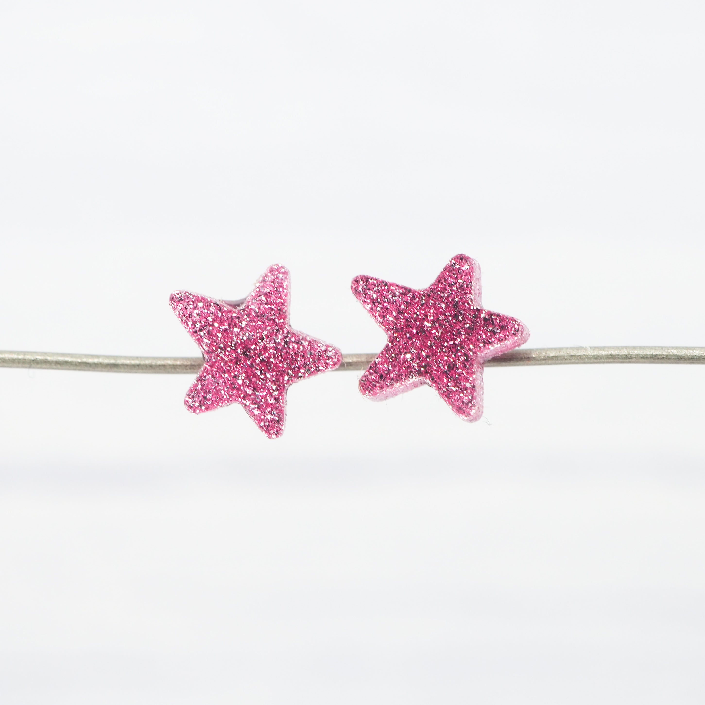 These pink glitter small star stud earrings are perfect for any outfit.