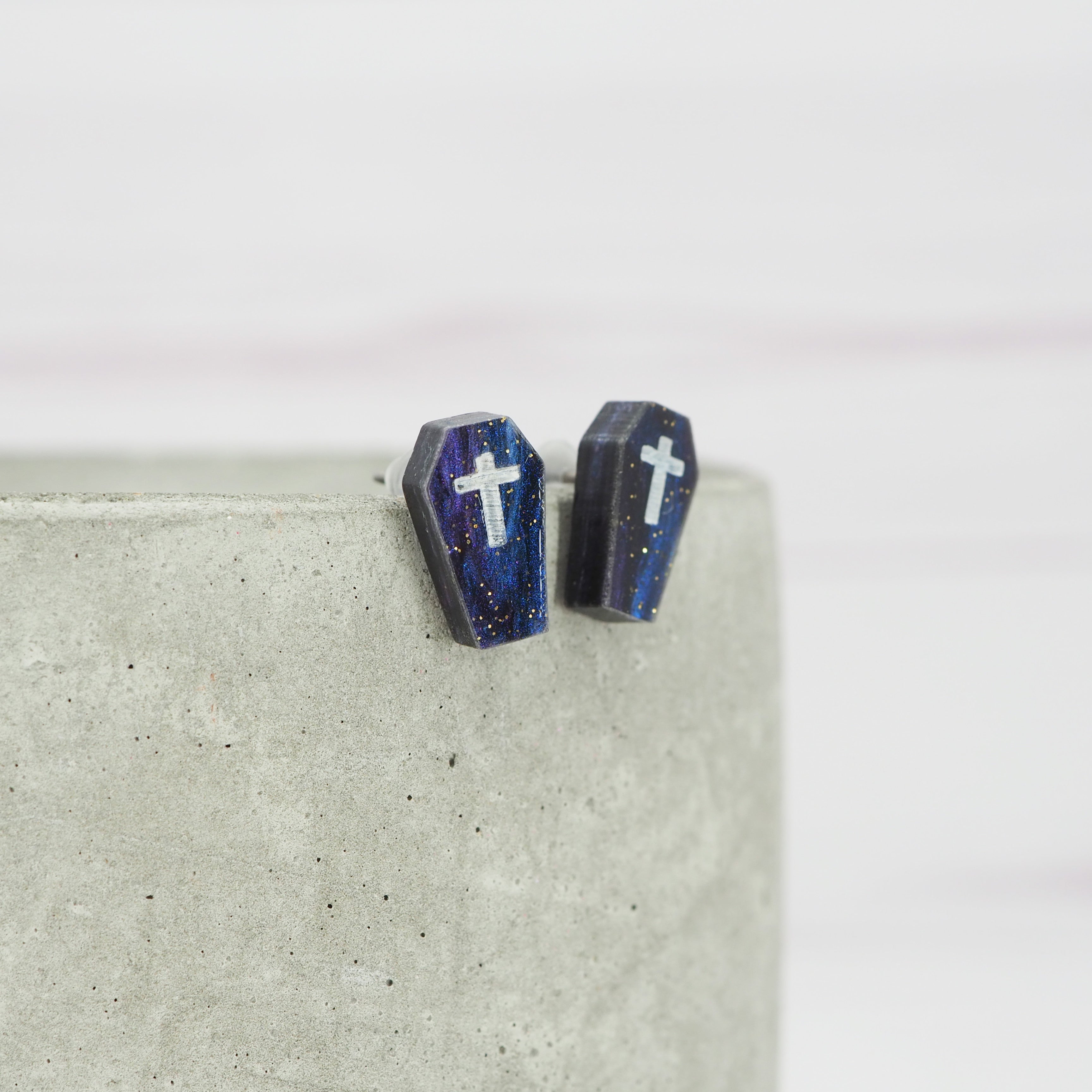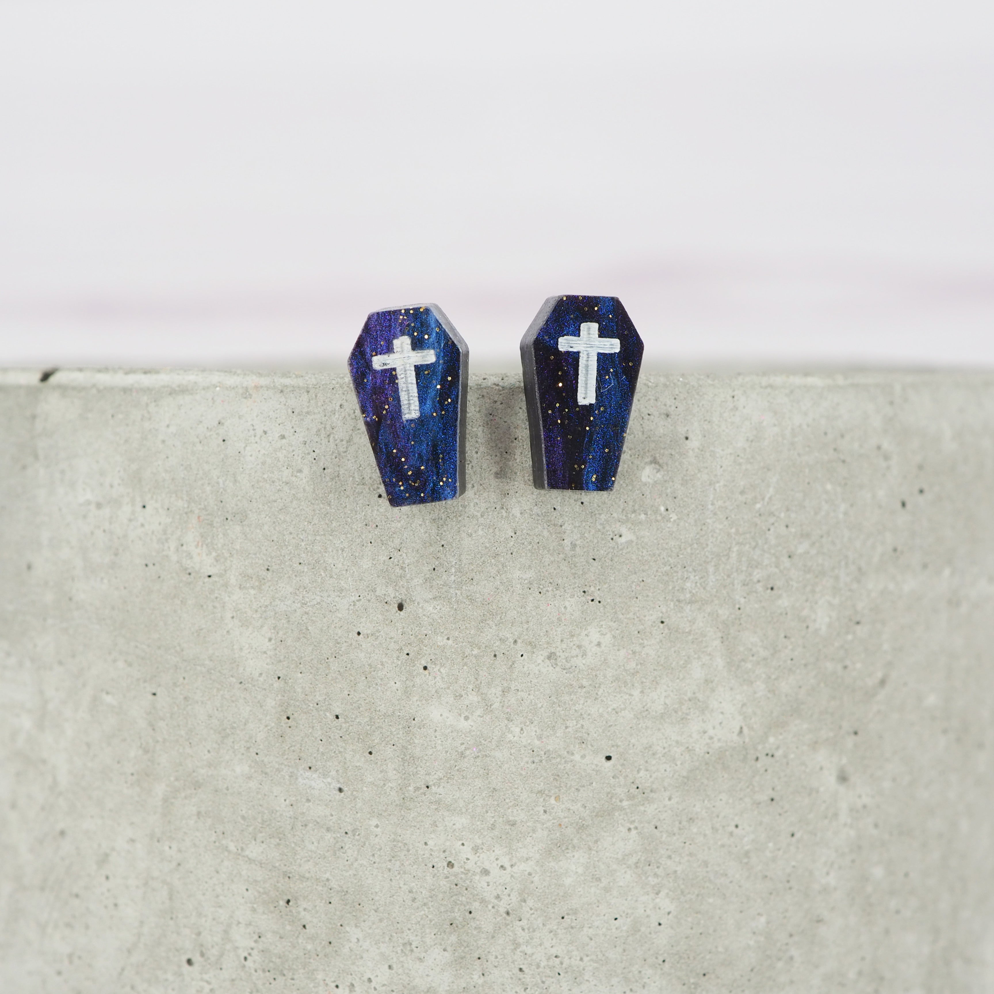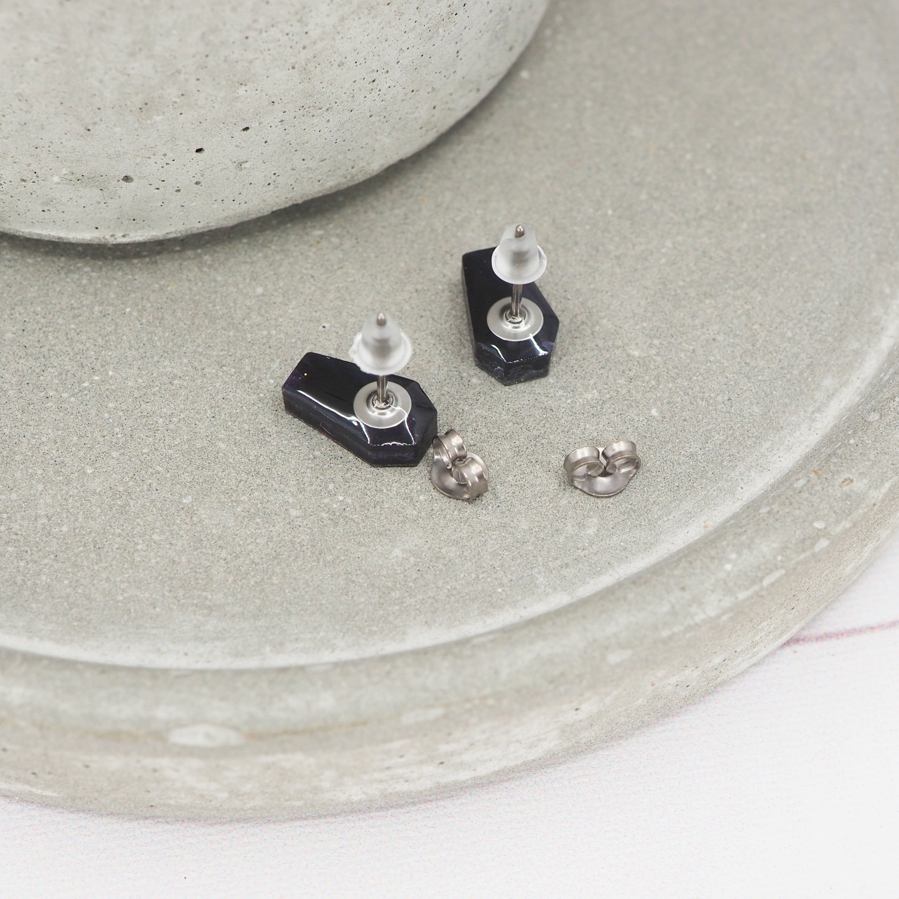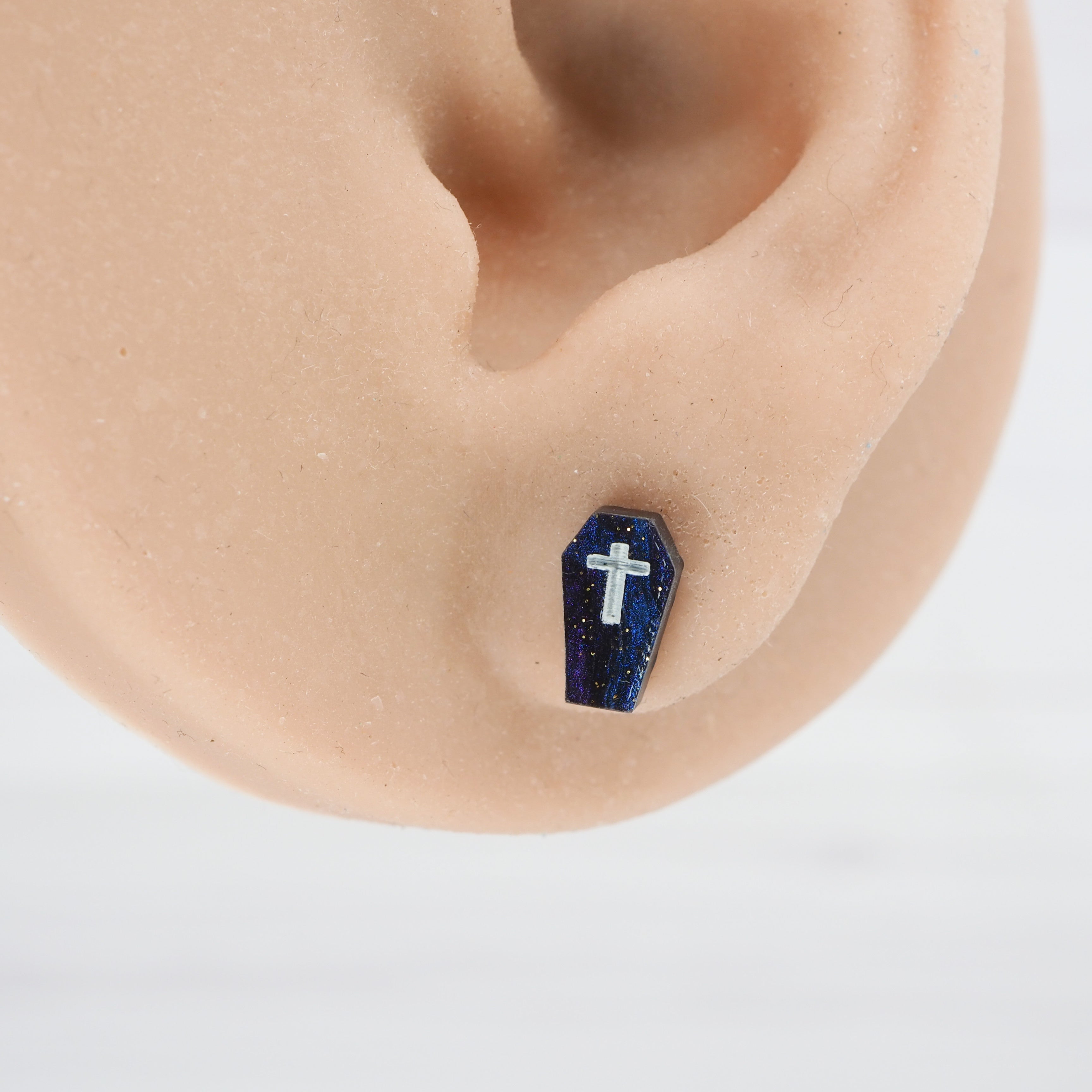 Purple galaxy coffin studs with 0.7mm ear stems.
