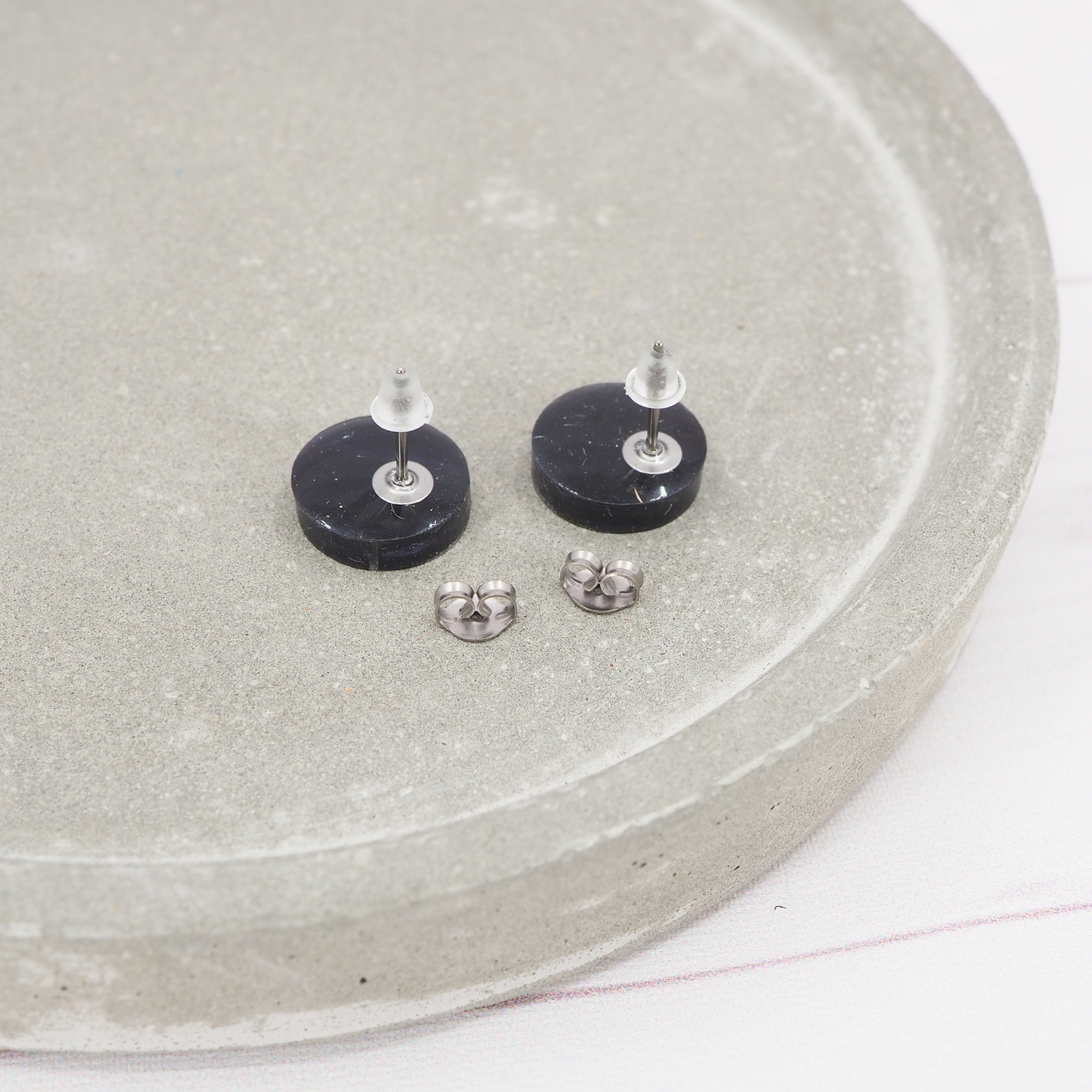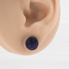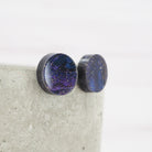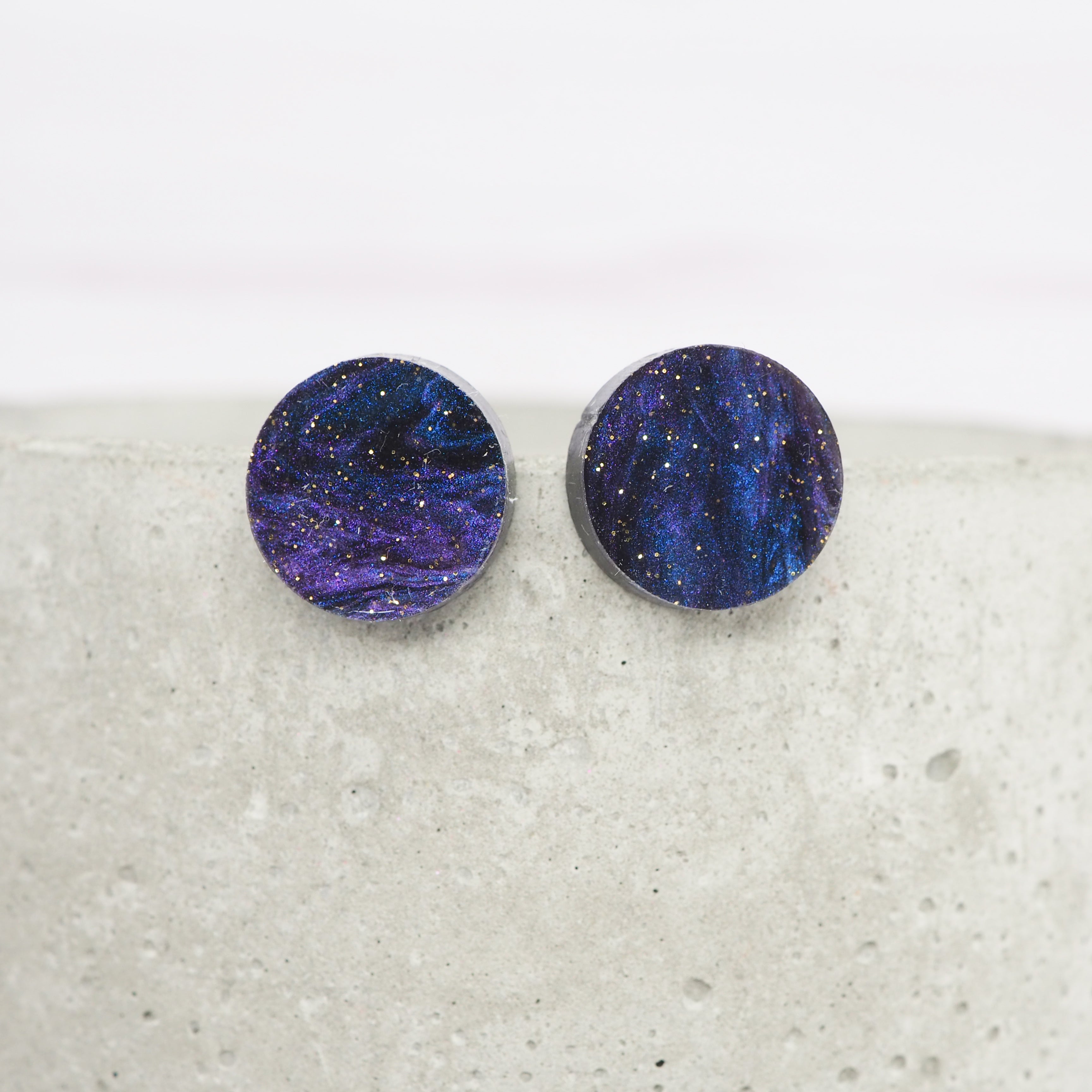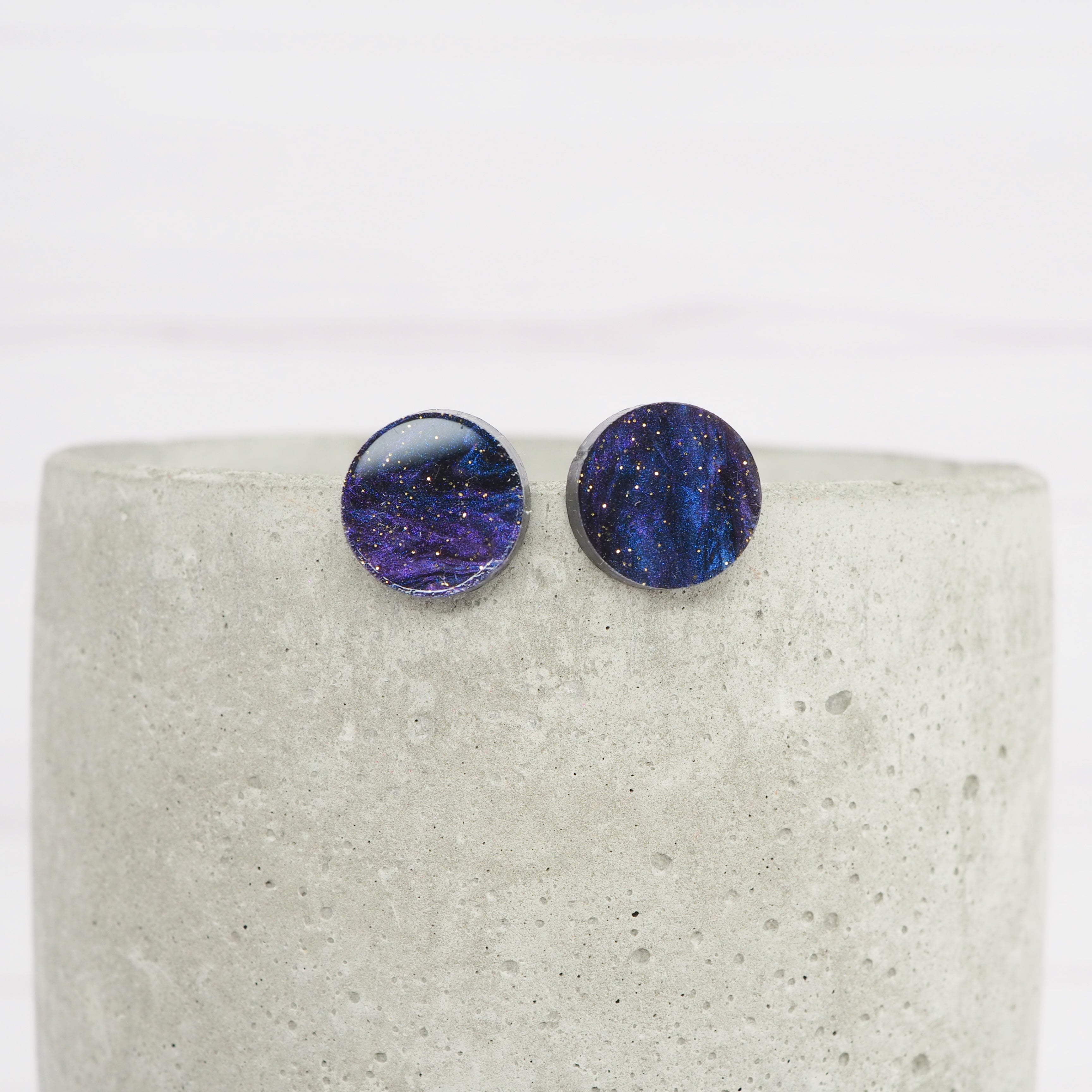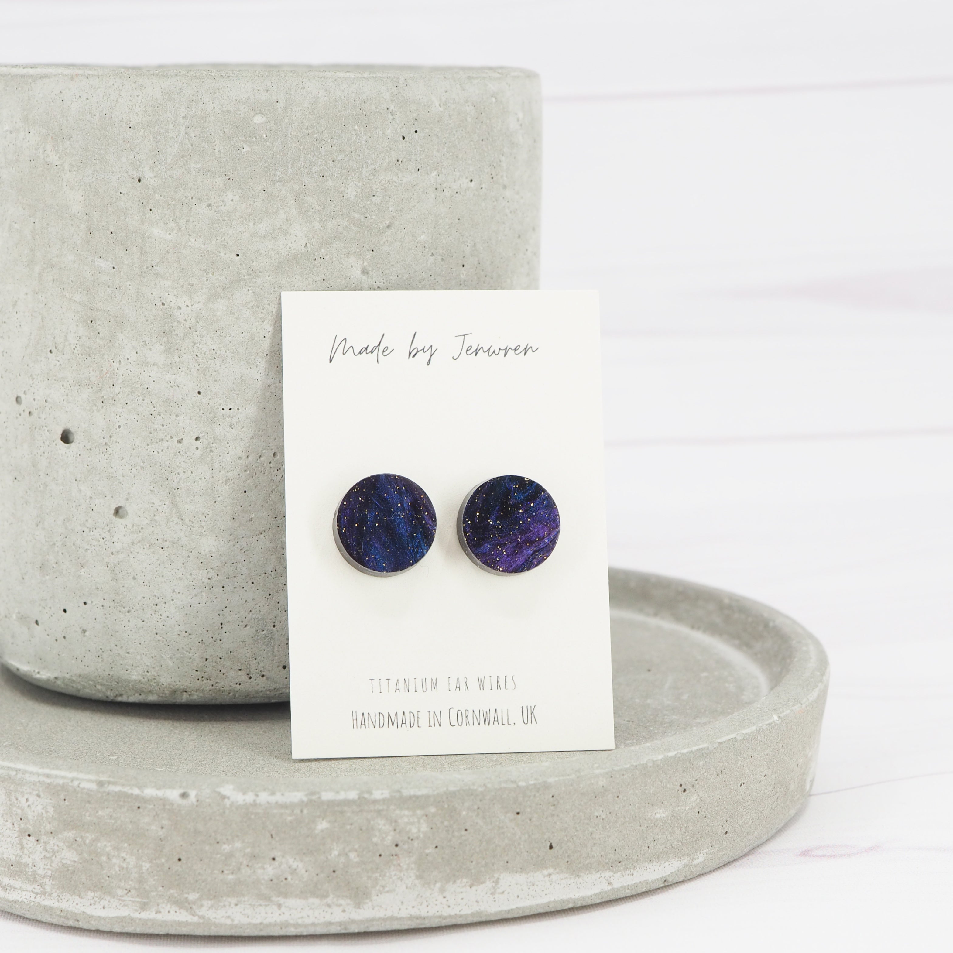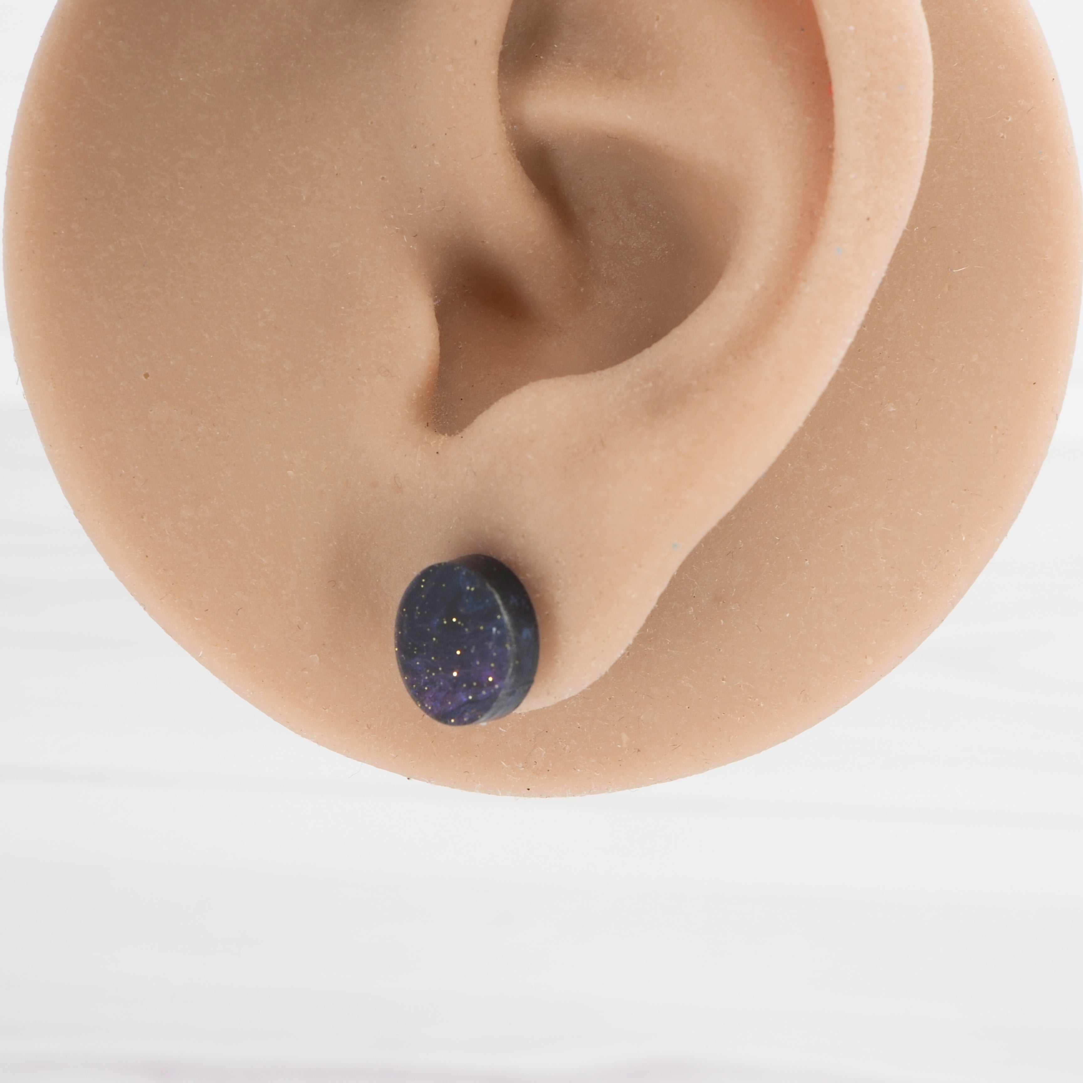 Purple galaxy glitter acrylic round studs with 0.7mm ear stems.
