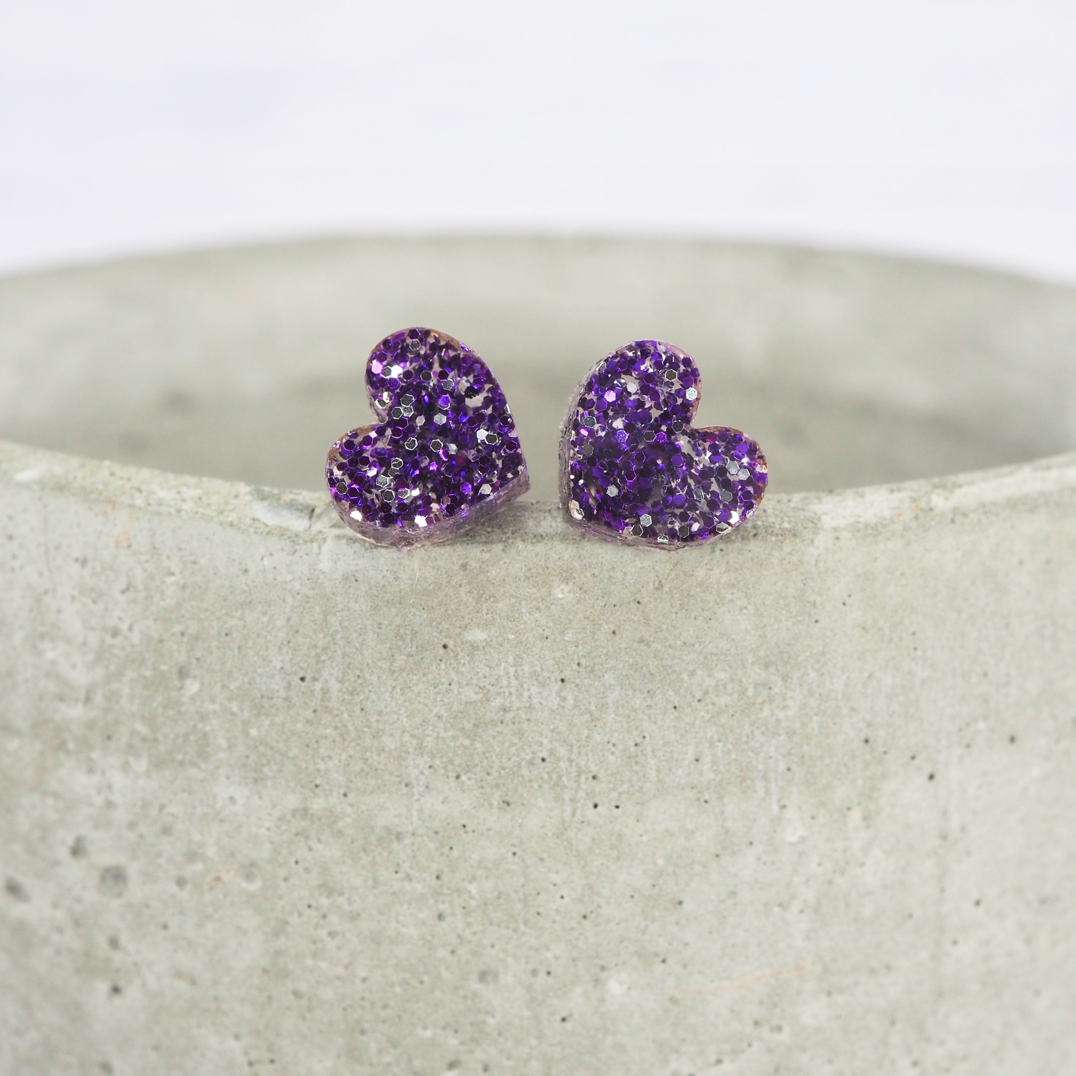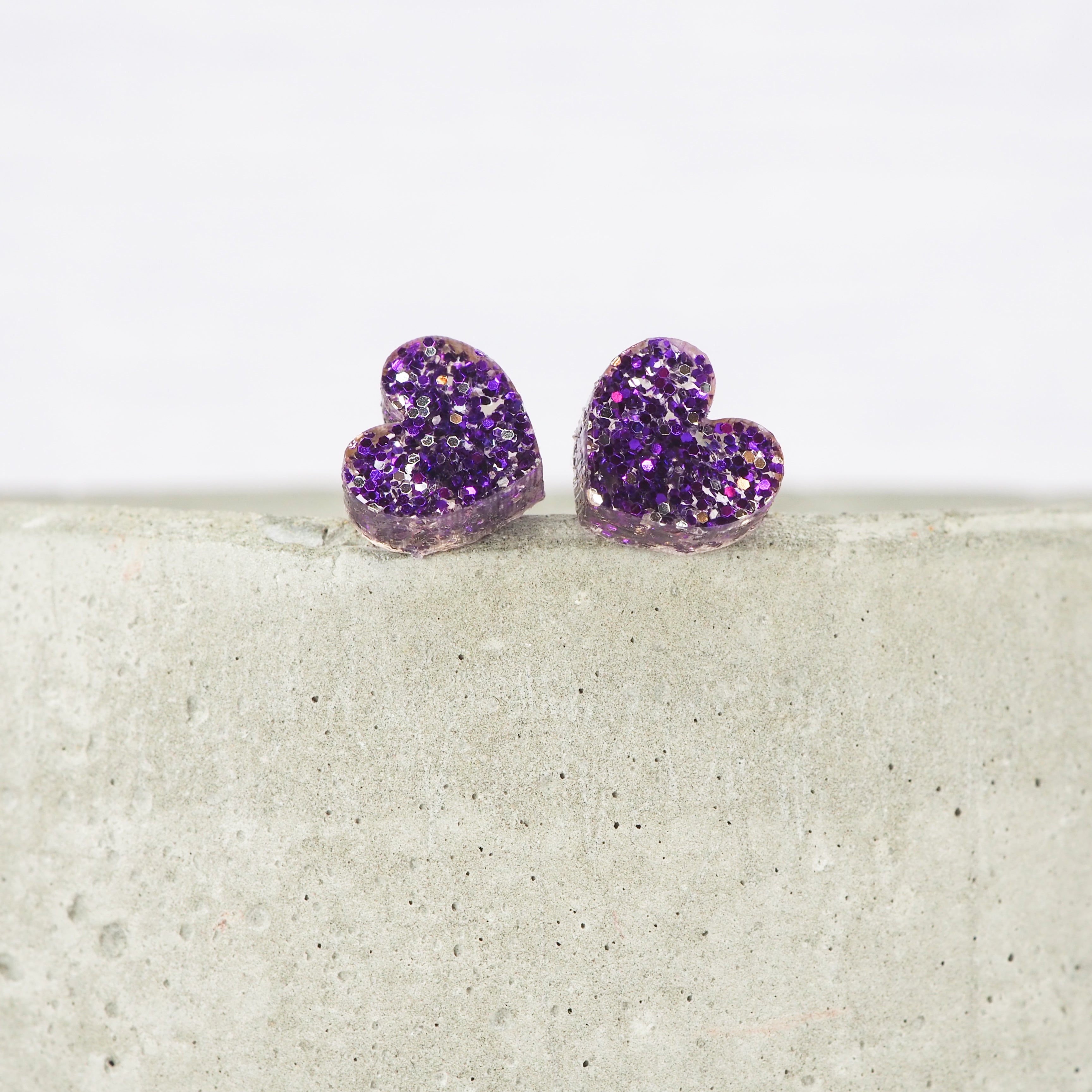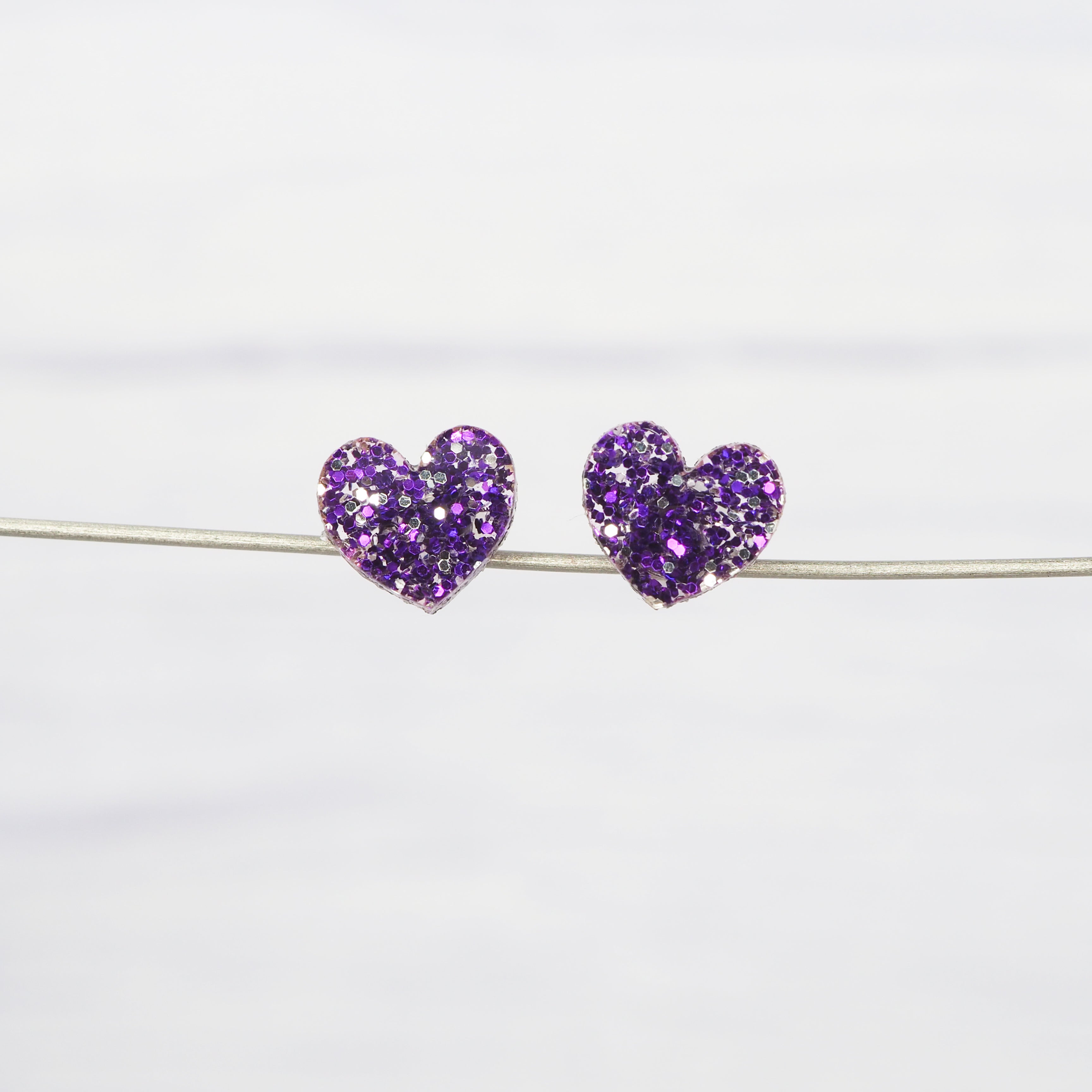Purple glitter small heart acrylic studs with 0.7mm ear stems.