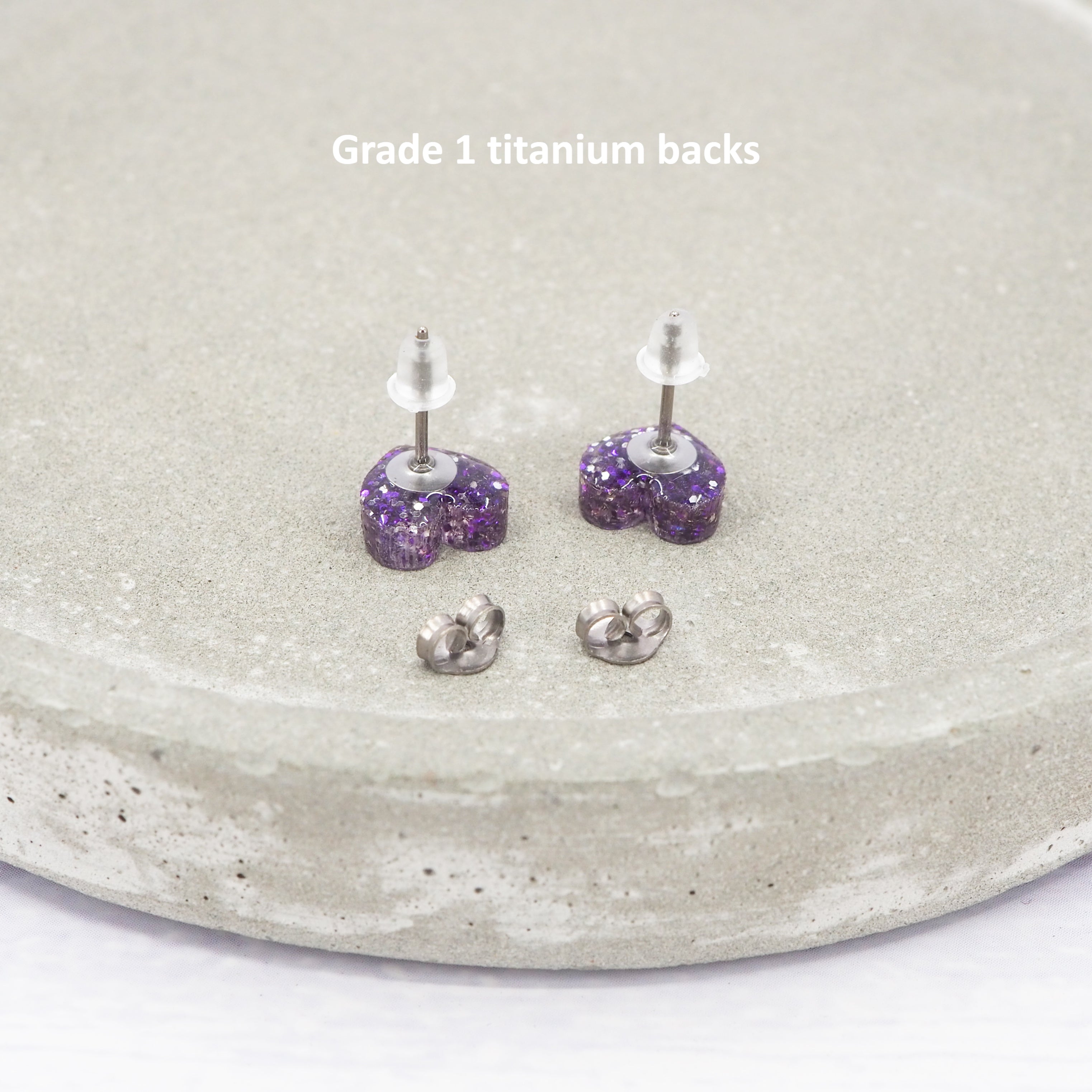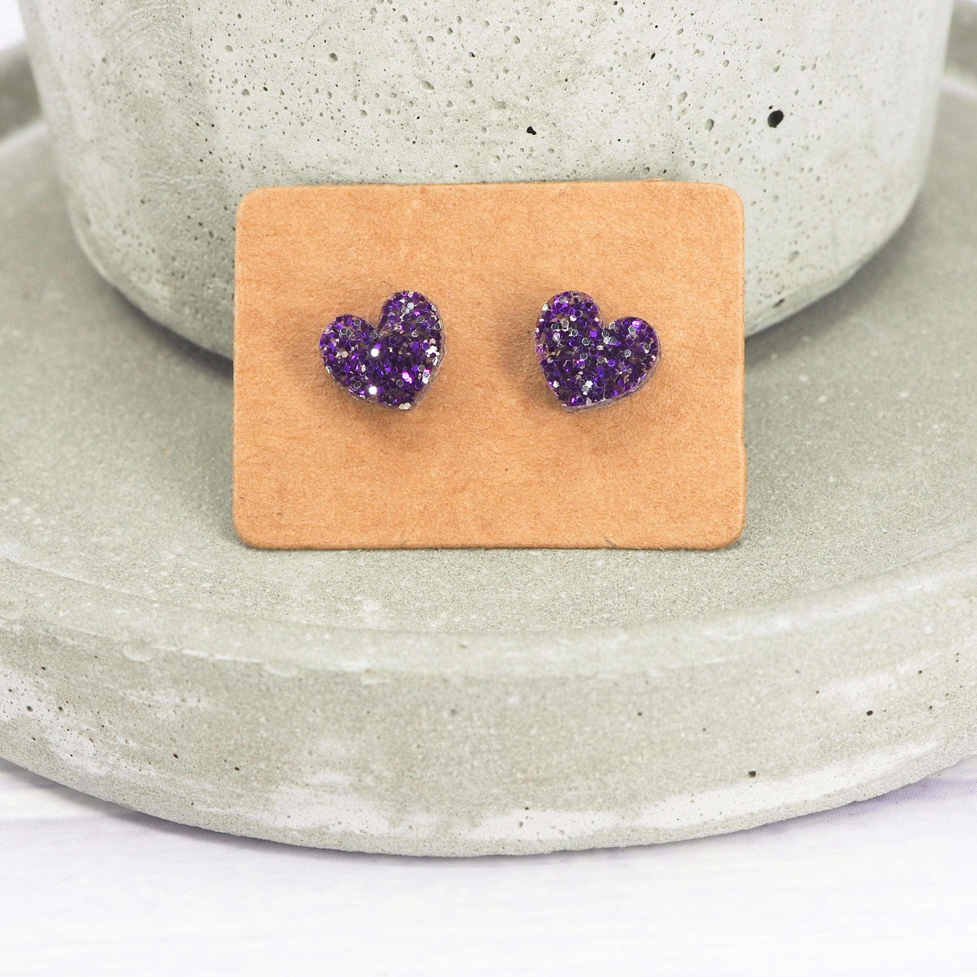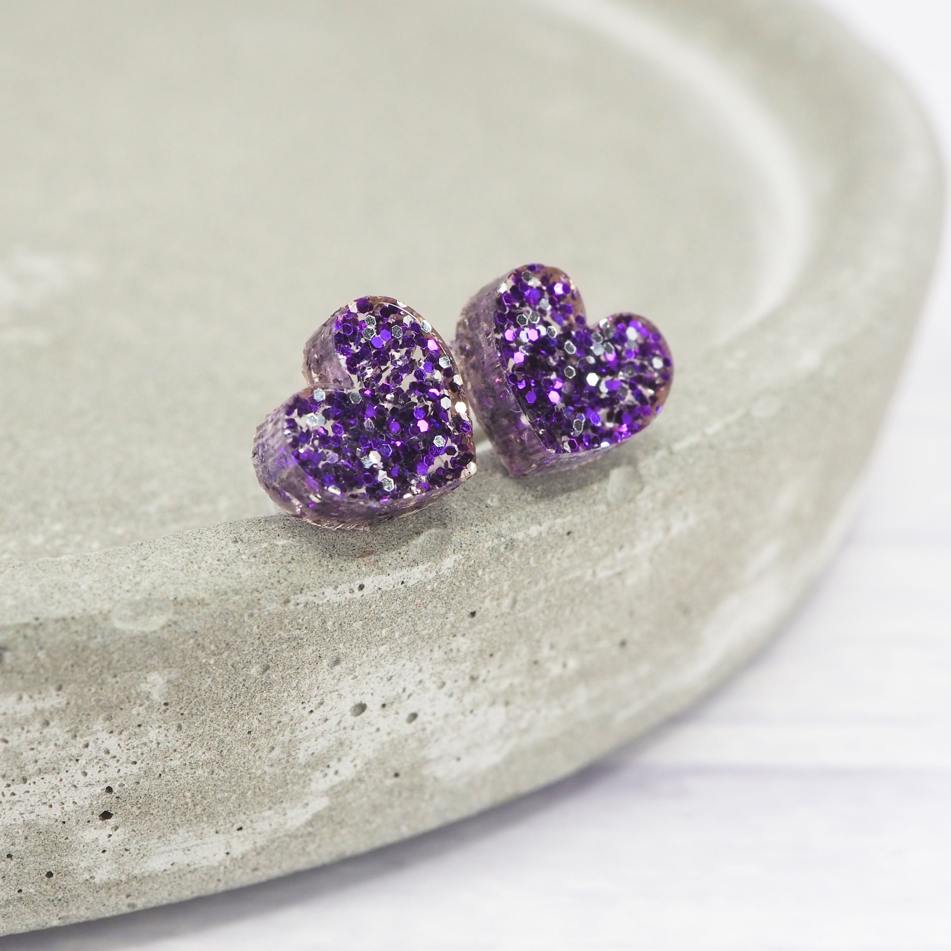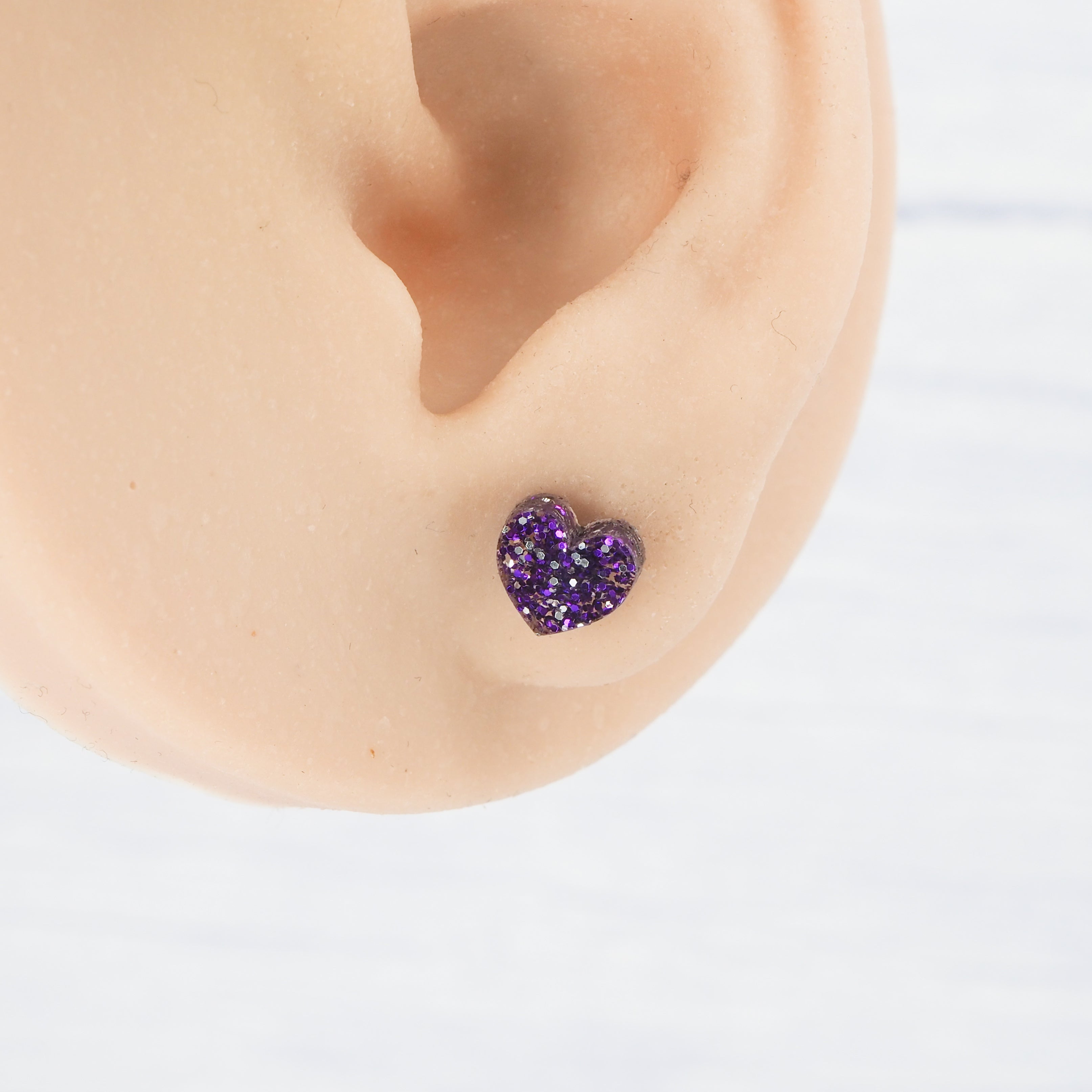 Purple glitter small heart acrylic studs with 0.7mm ear stems.