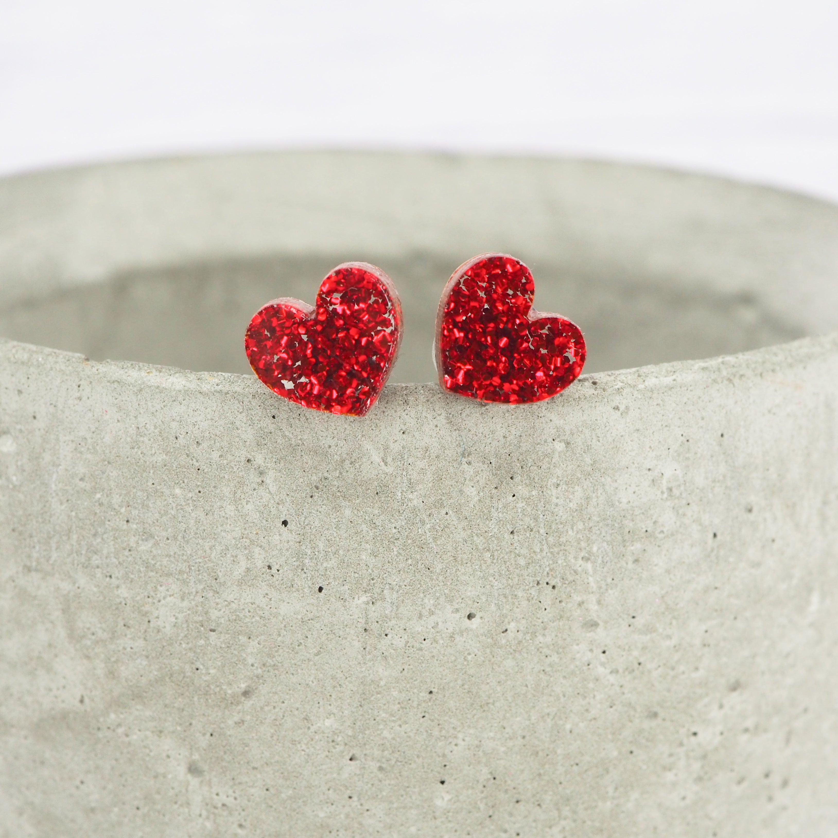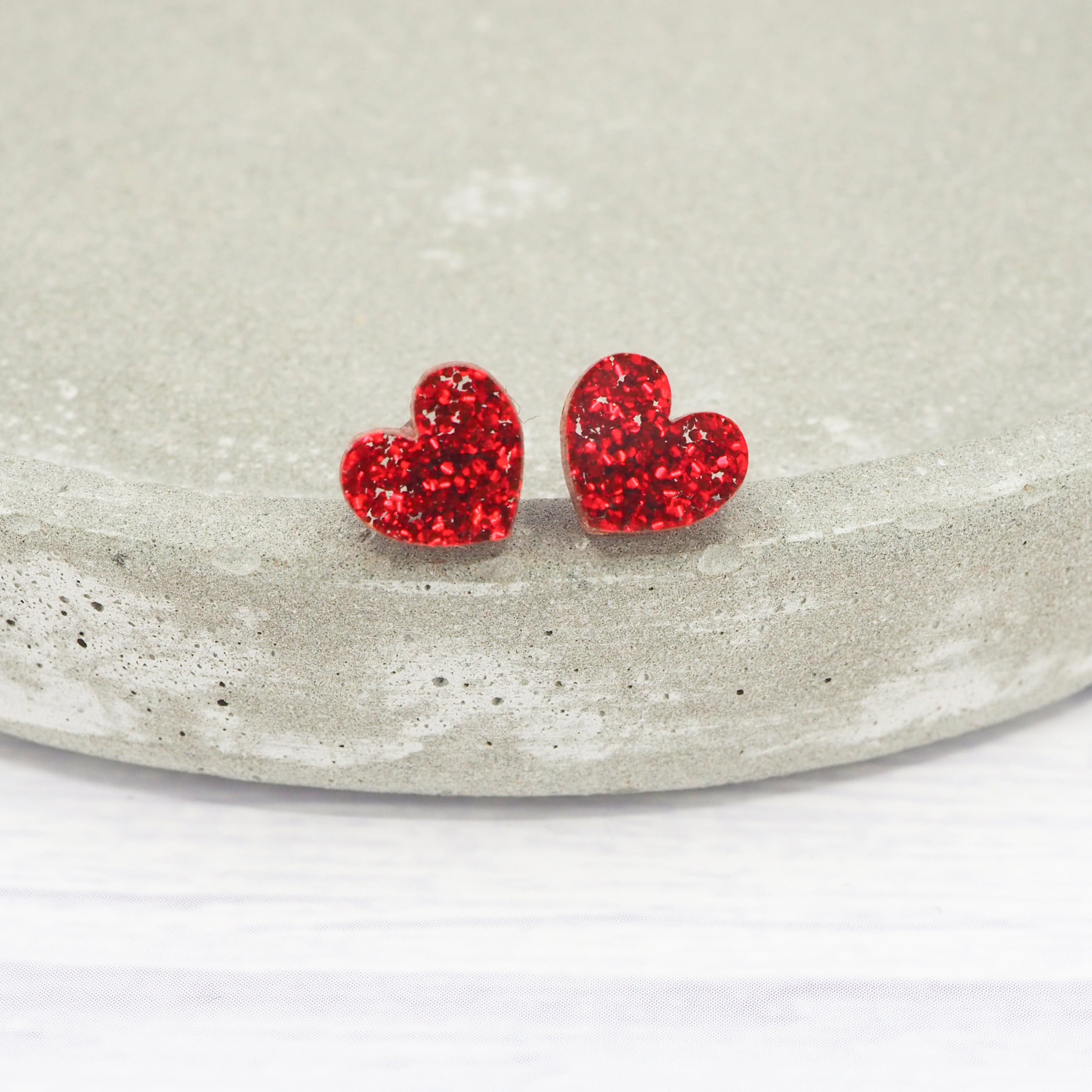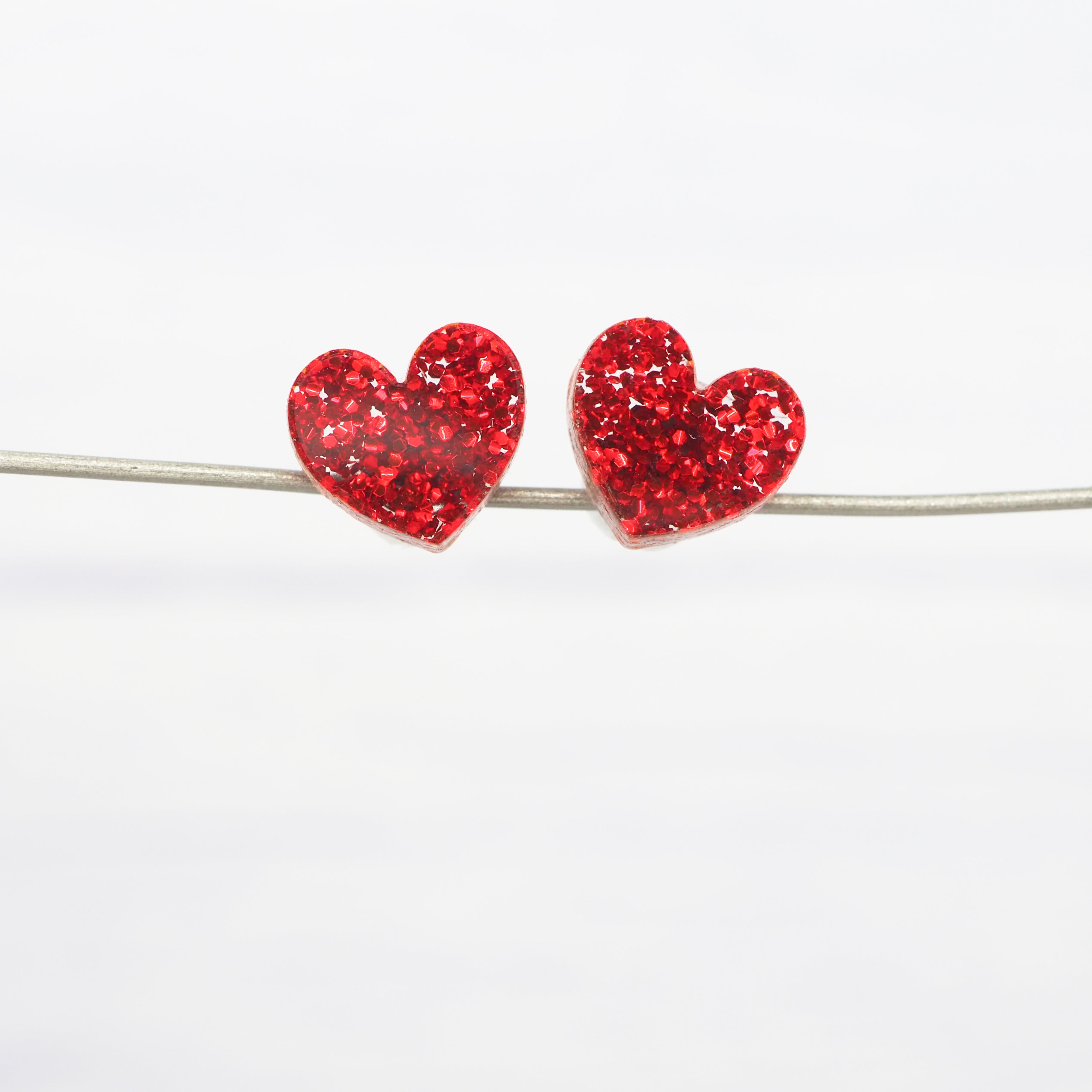 Red glitter small heart acrylic studs with 0.7mm ear stems.