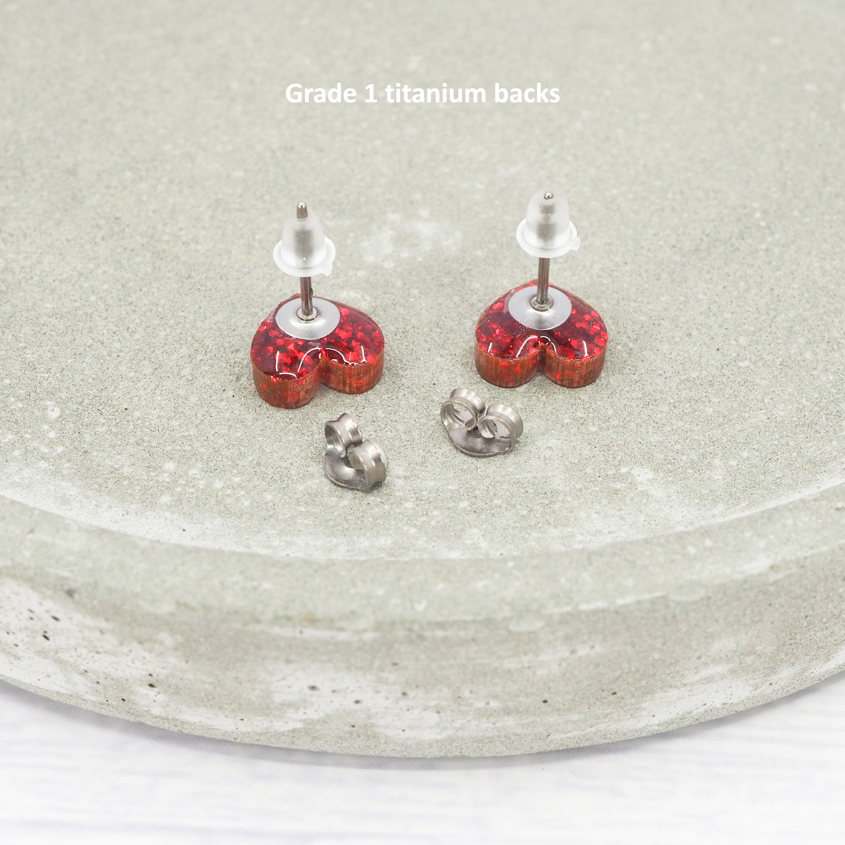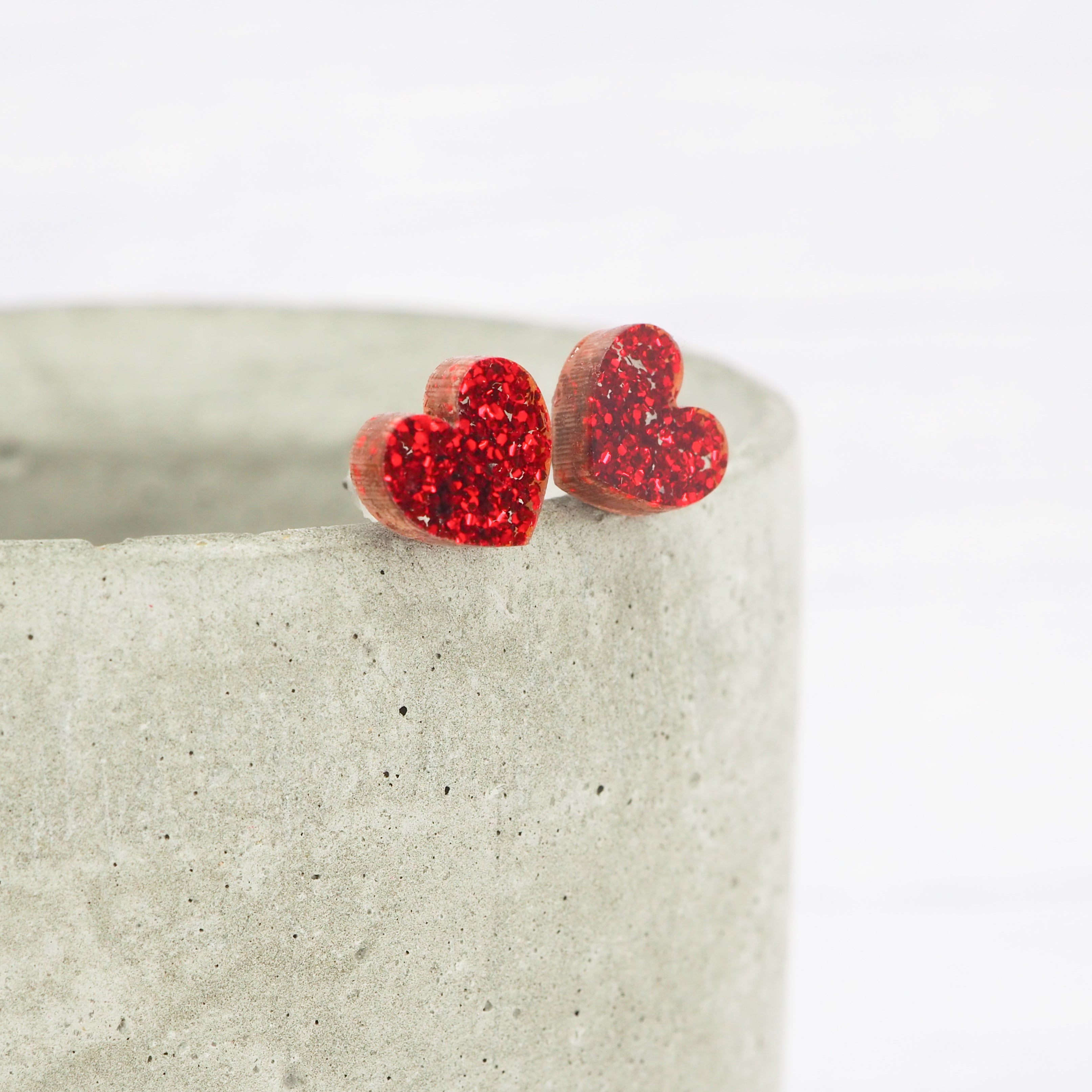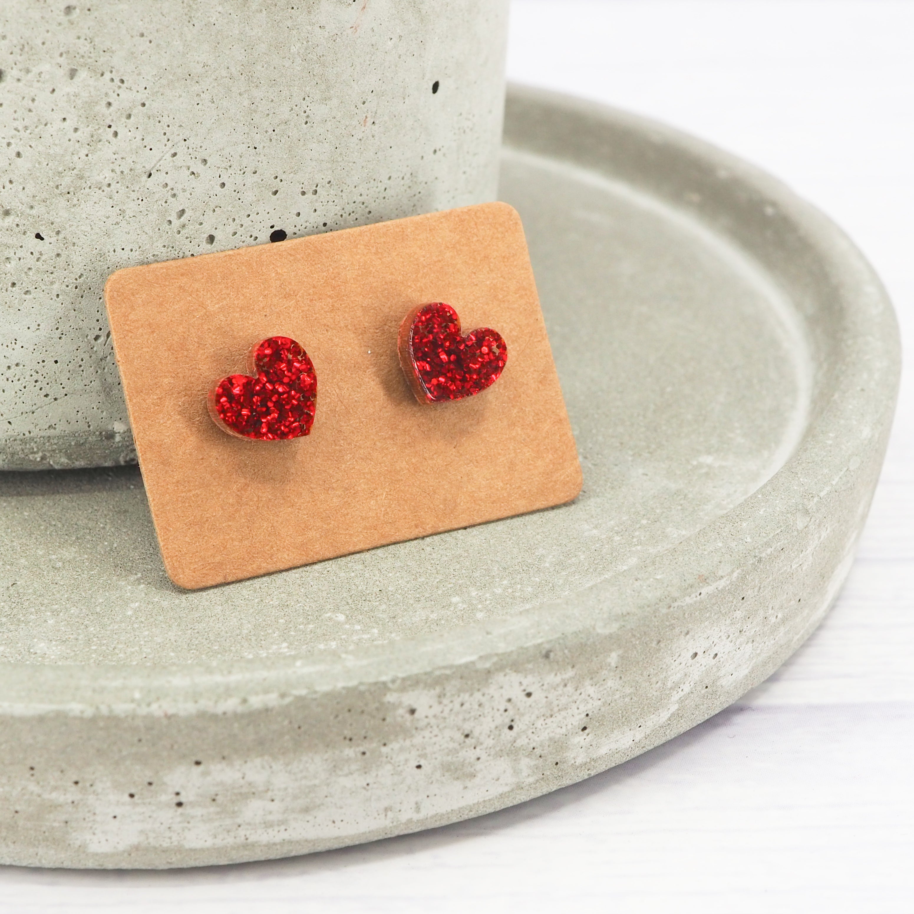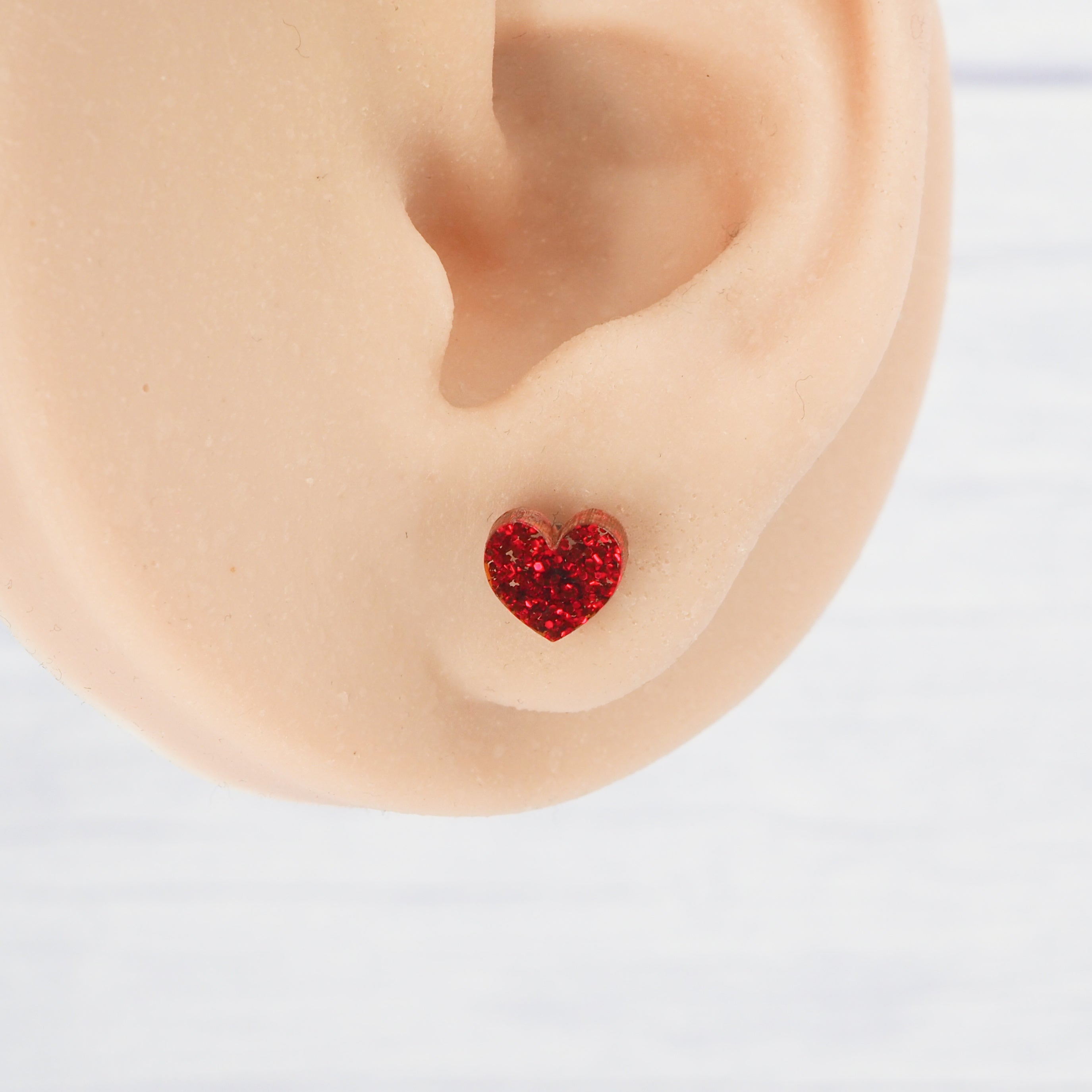 Red glitter small heart acrylic studs with 0.7mm ear stems.