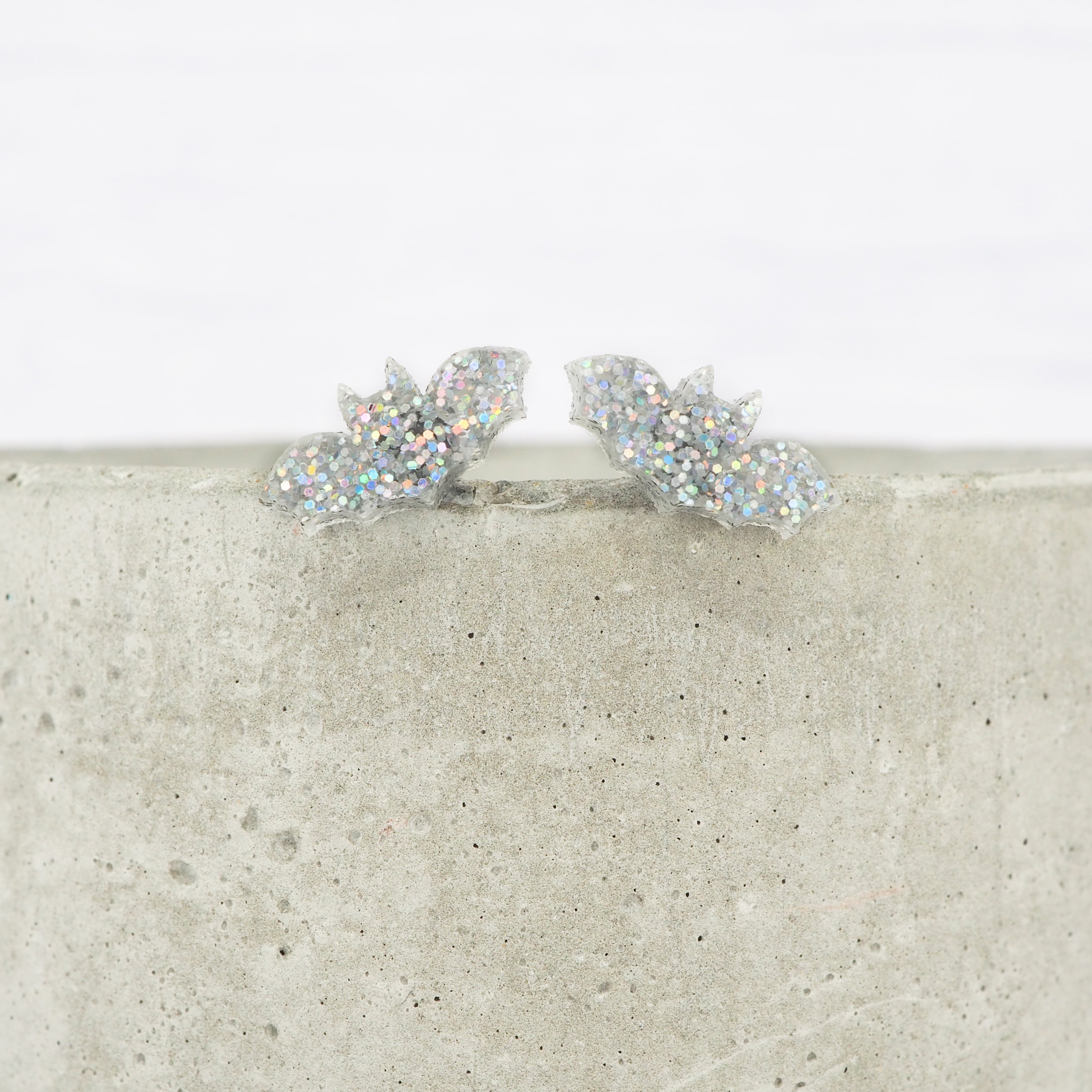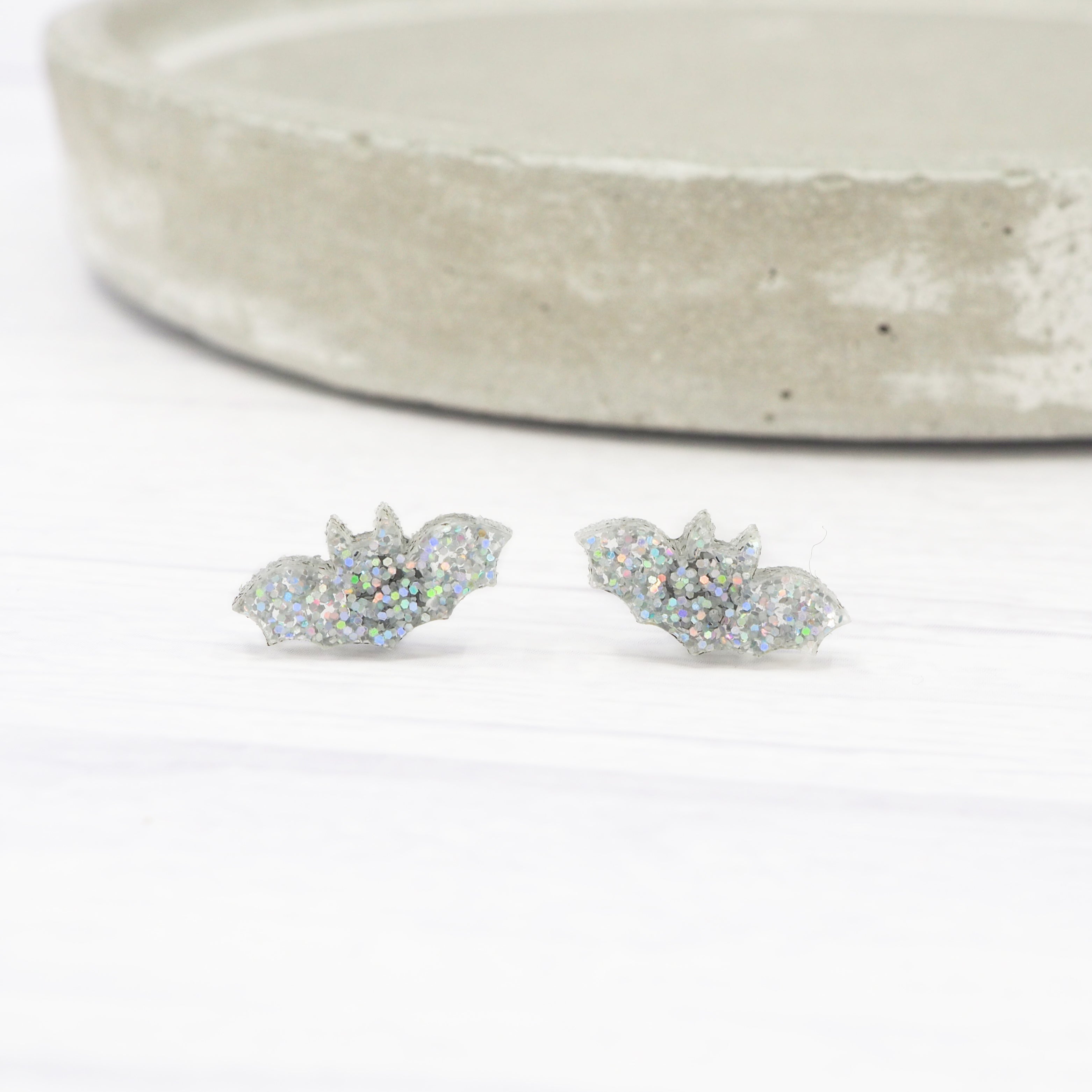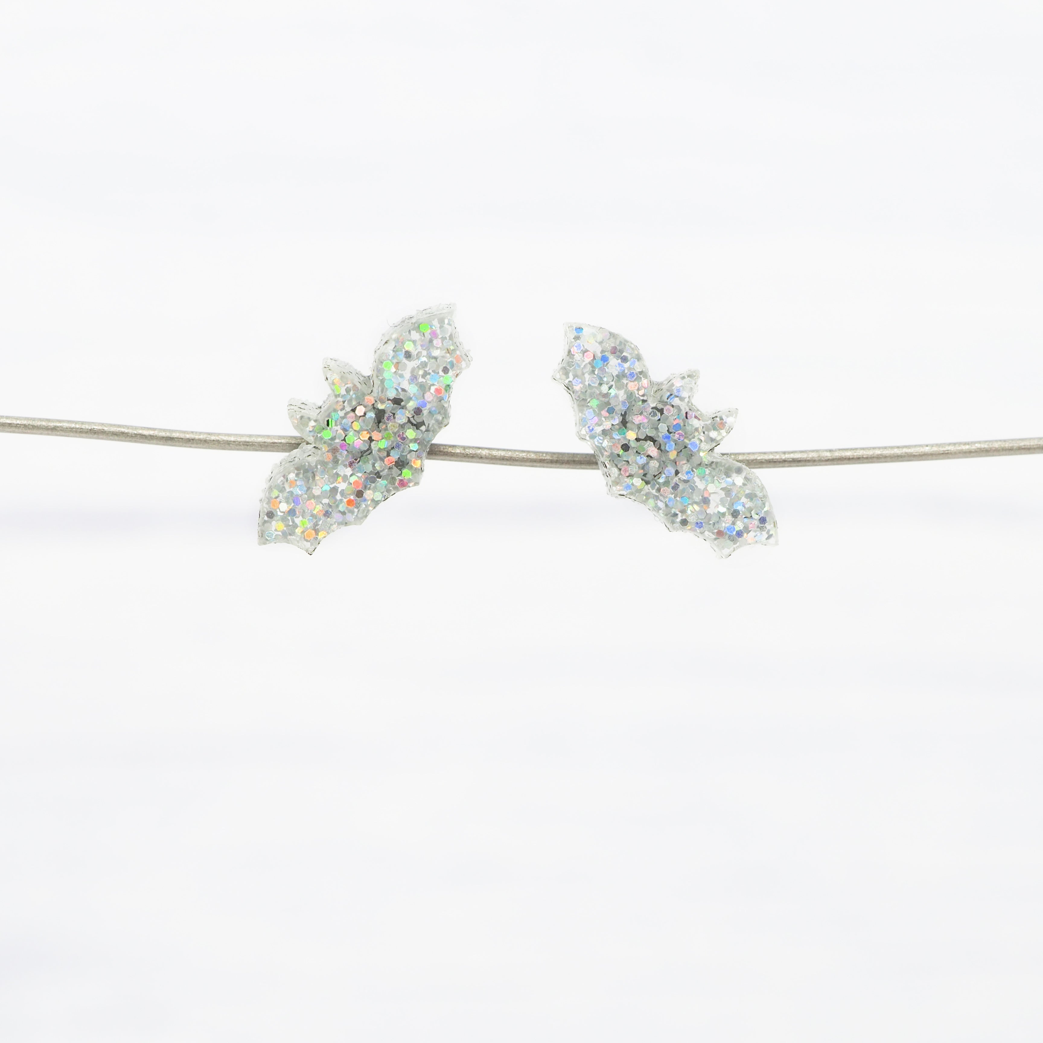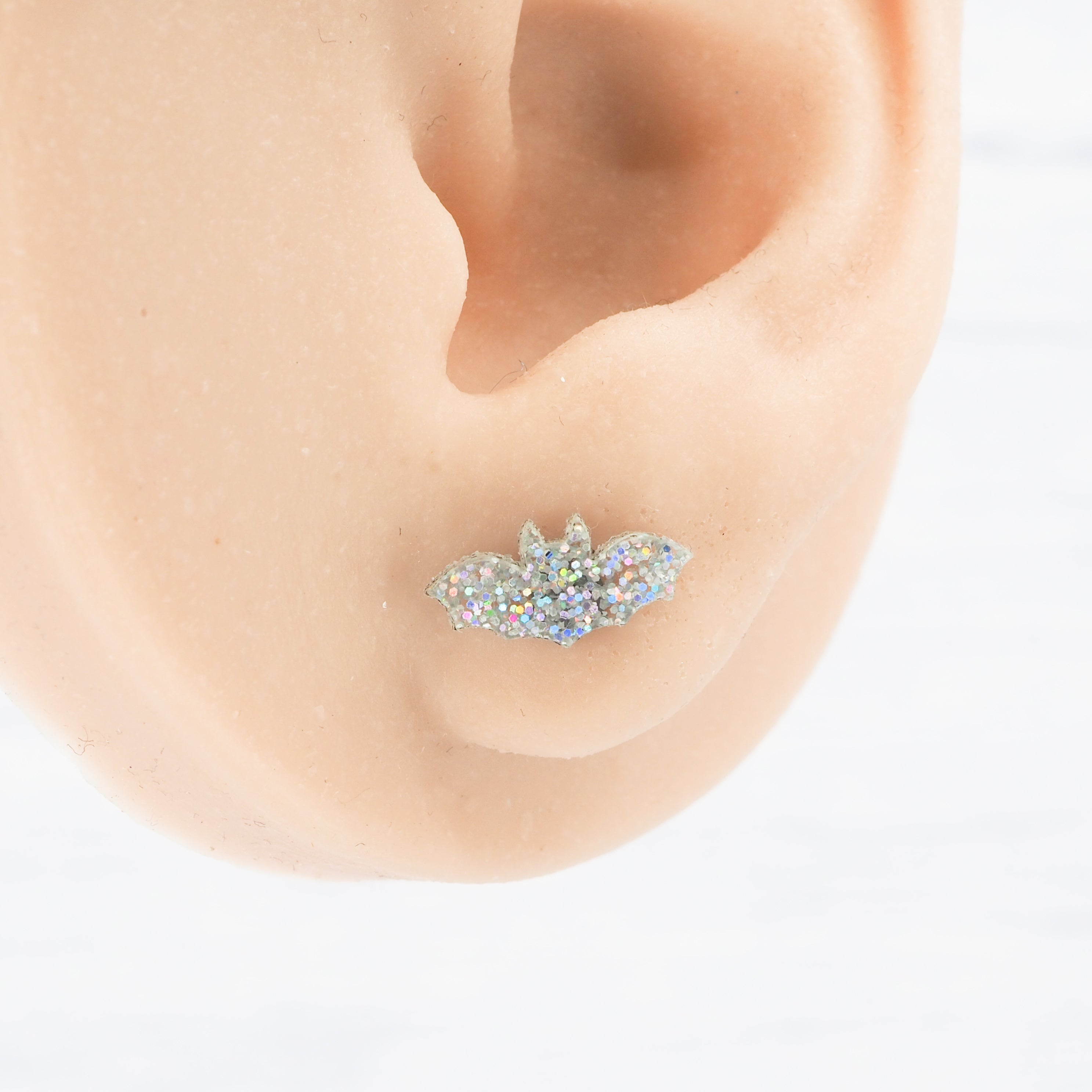 Silver holographic glitter bat studs with 0.7mm titanium ear stems.