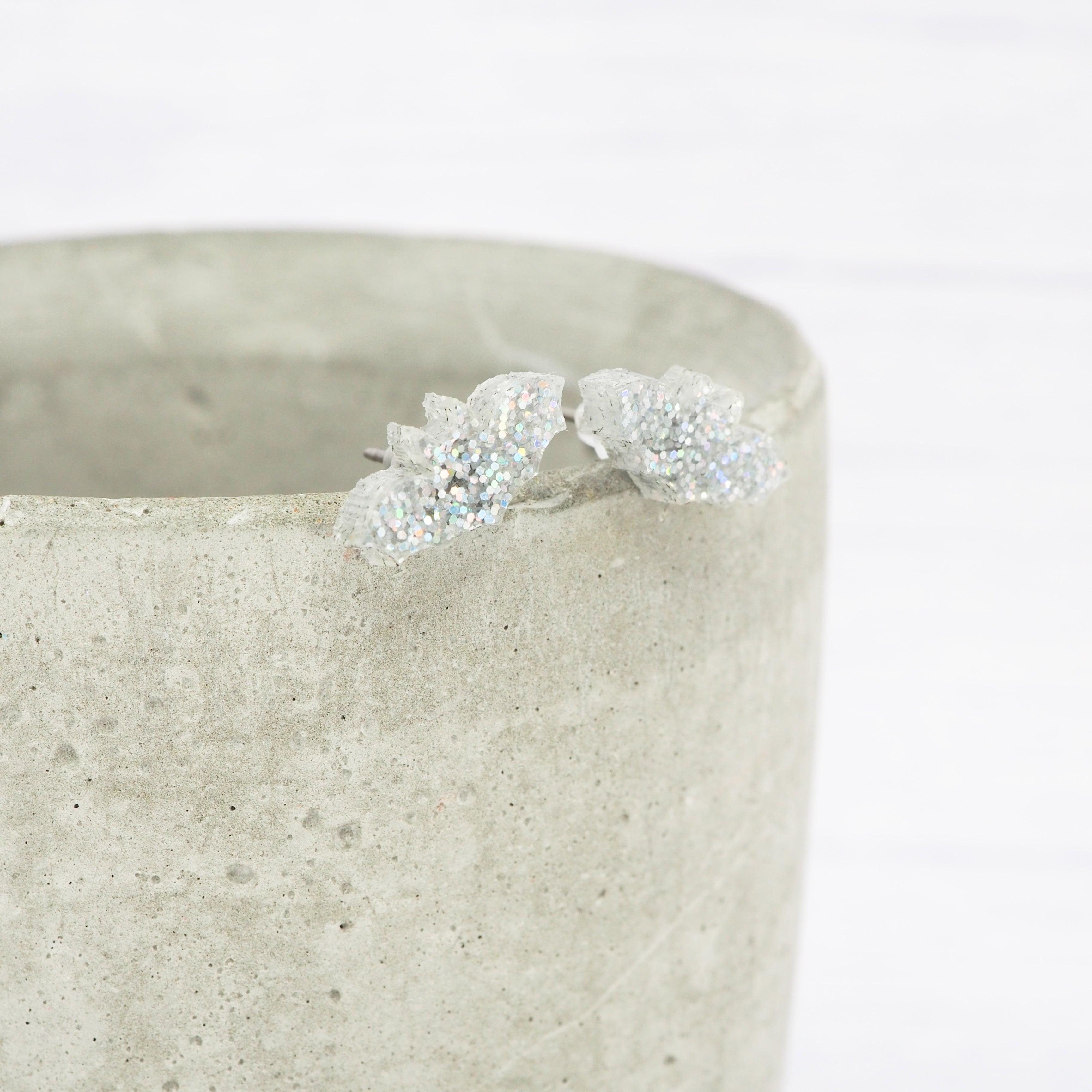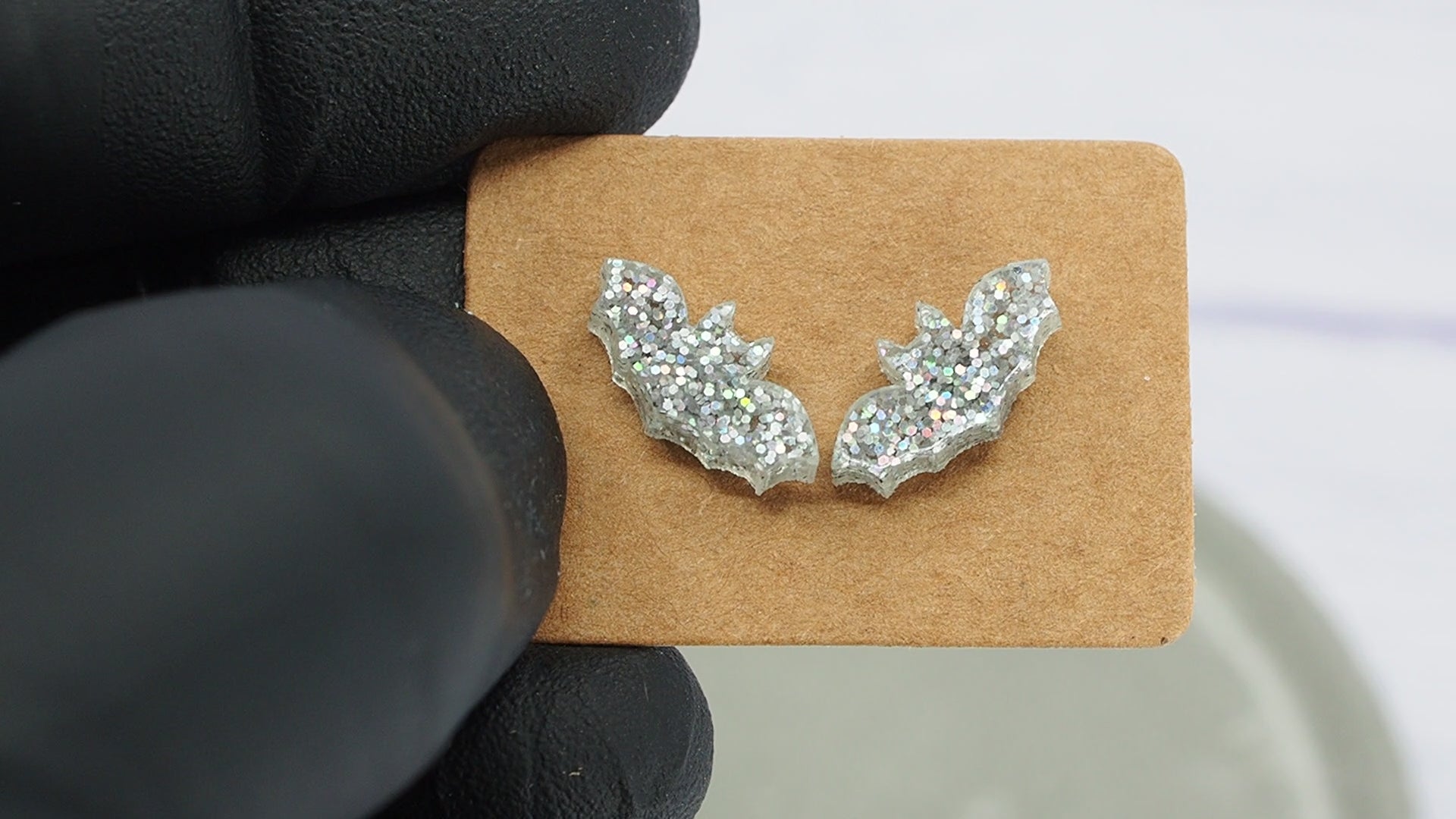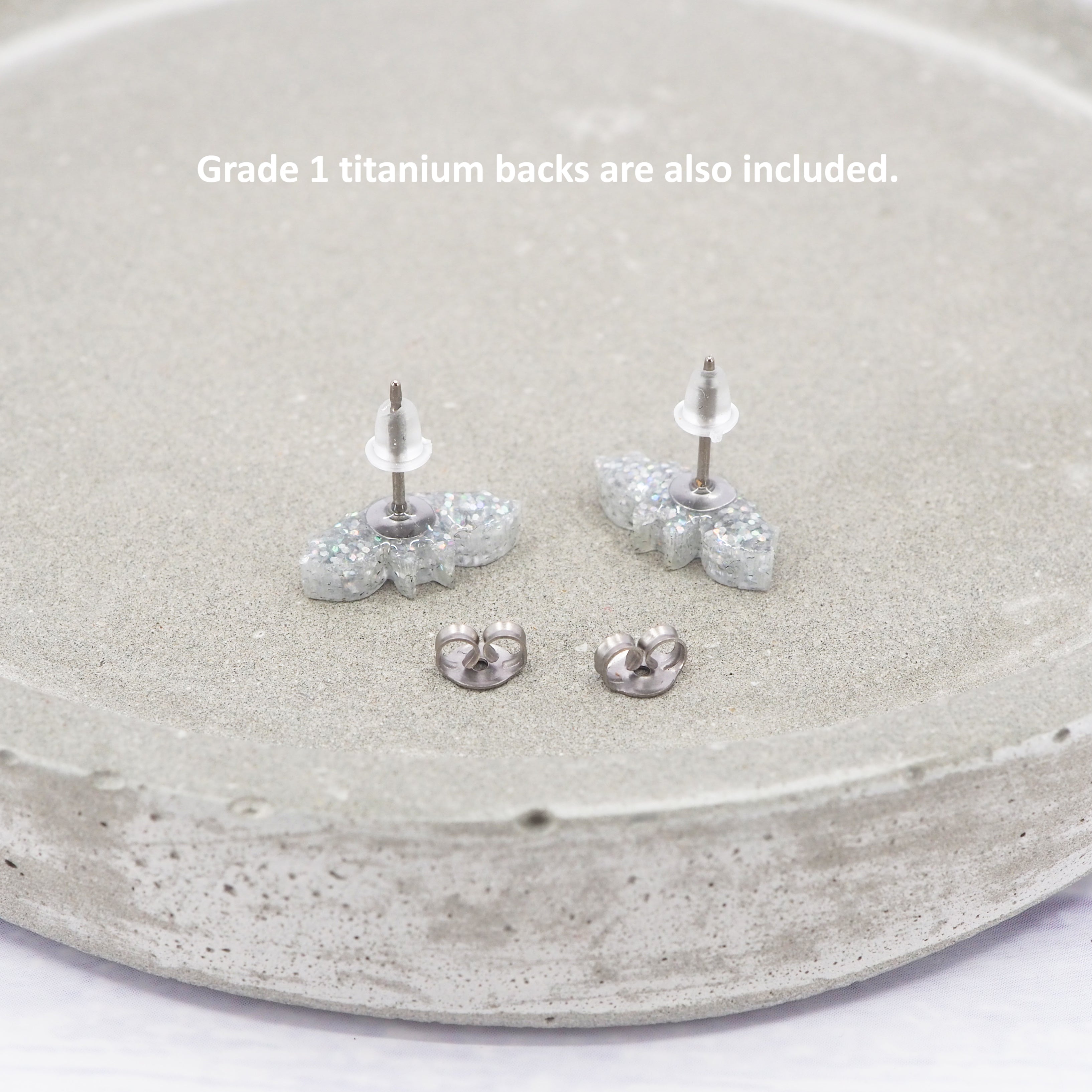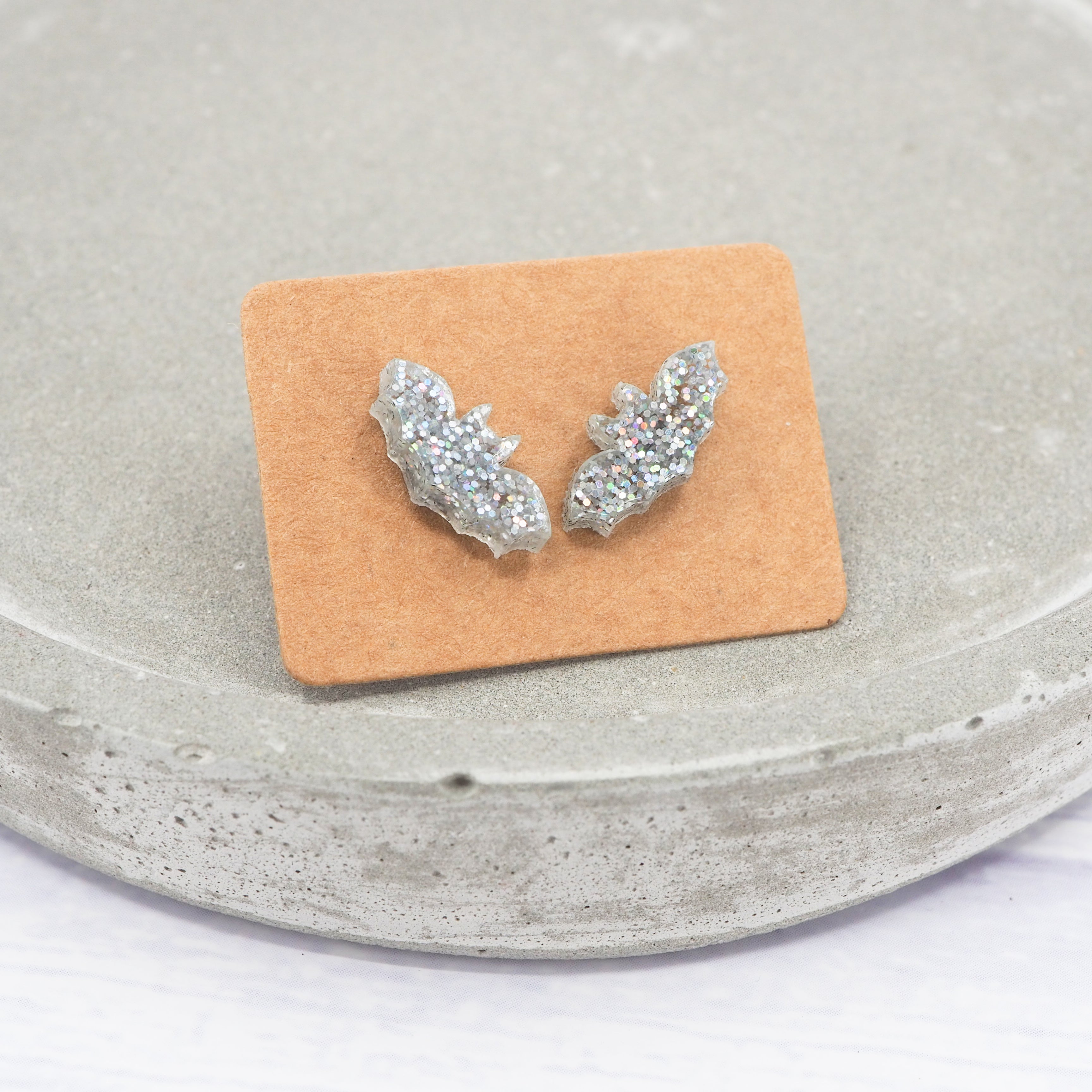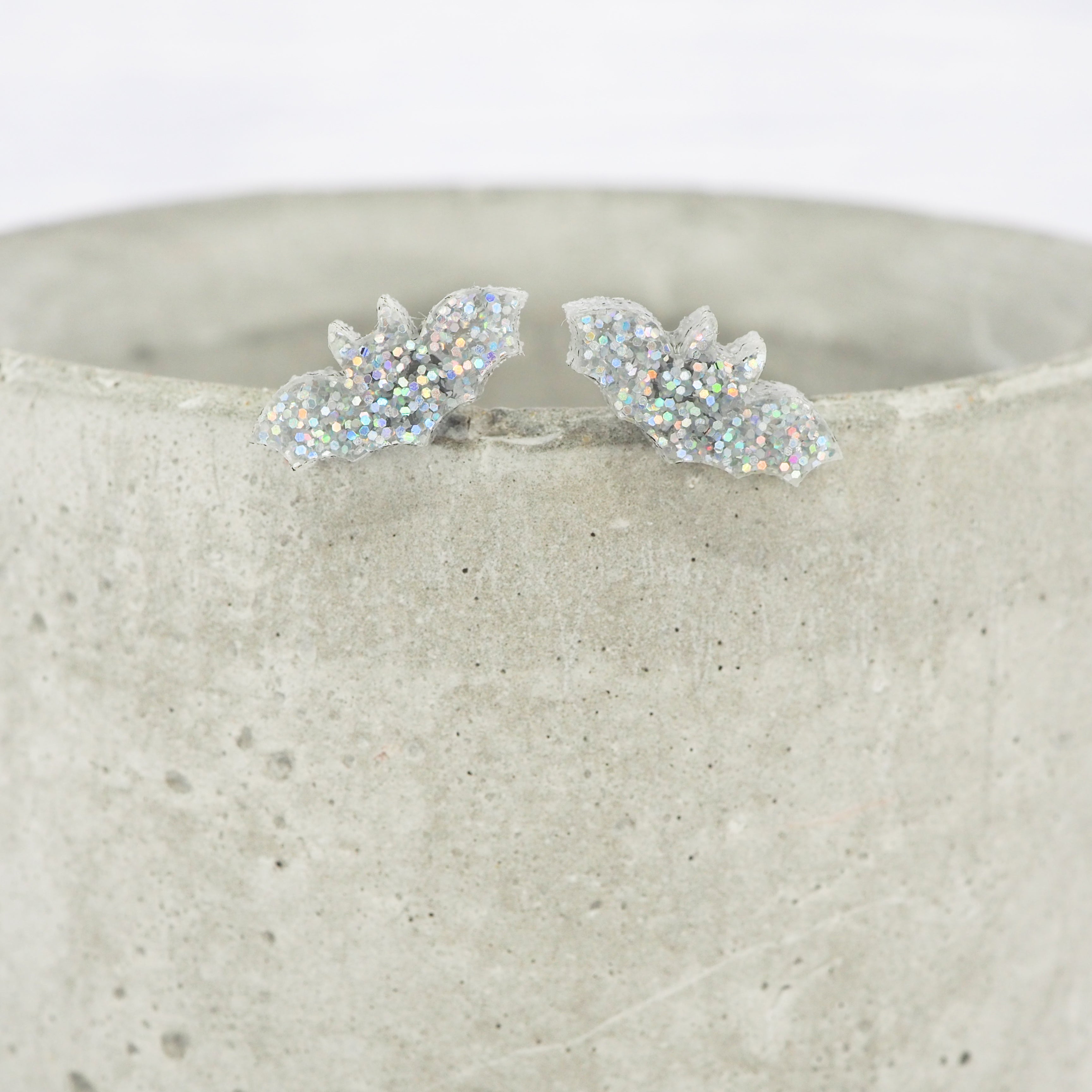 Silver holographic glitter bat studs with 0.7mm titanium ear stems.