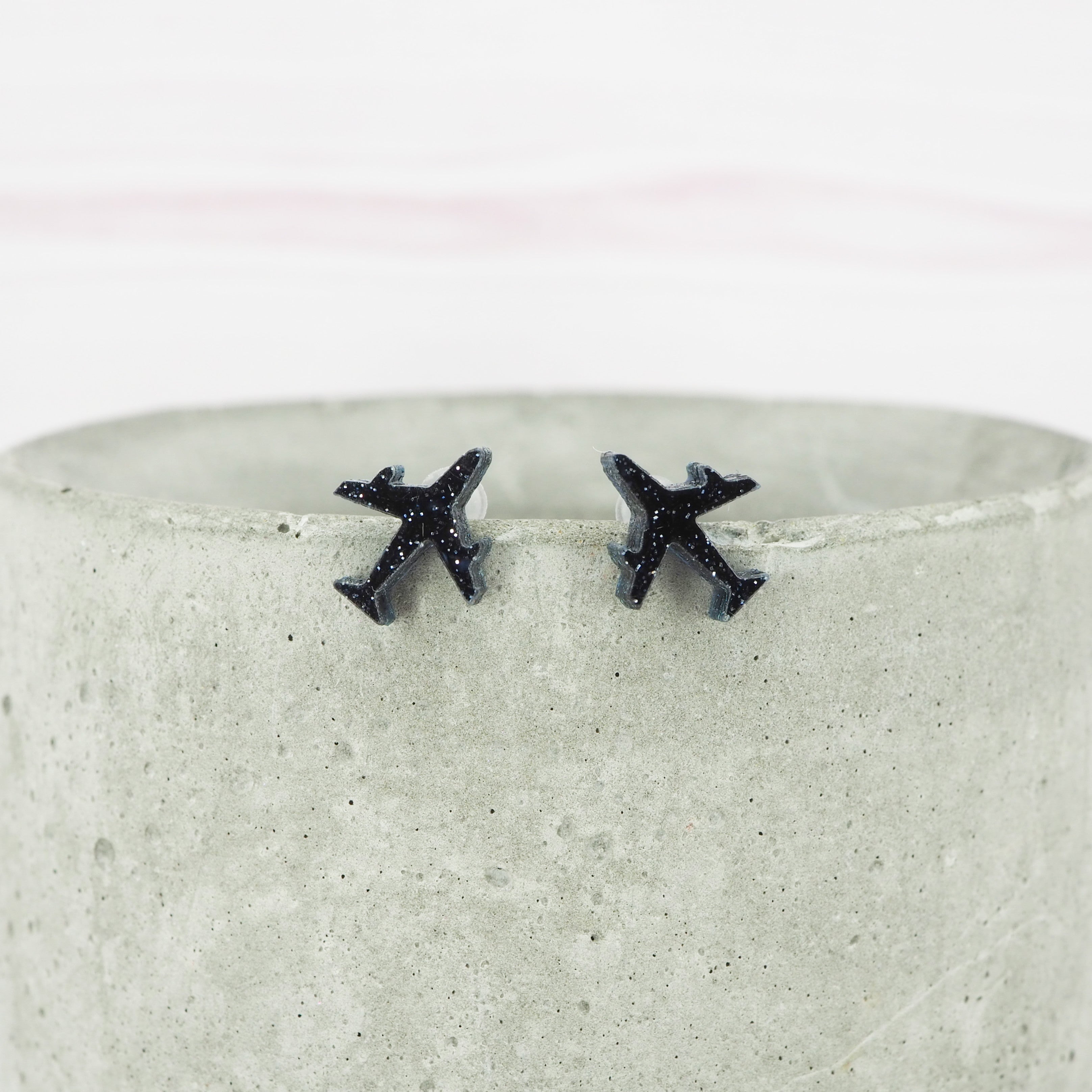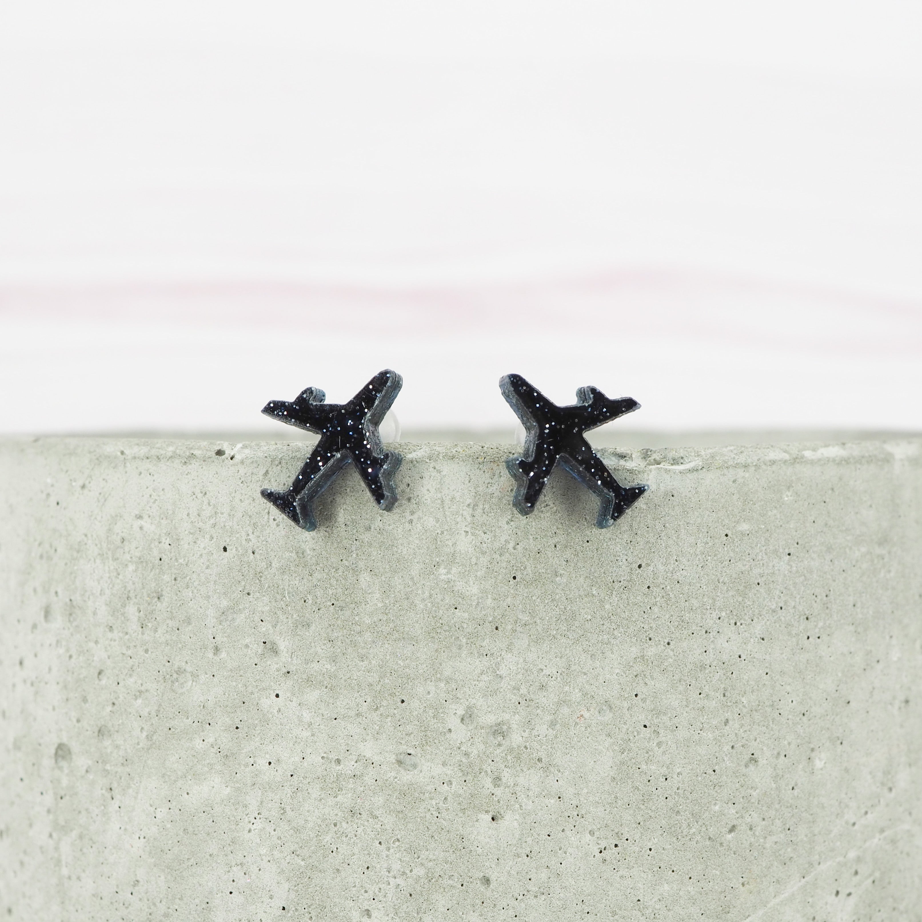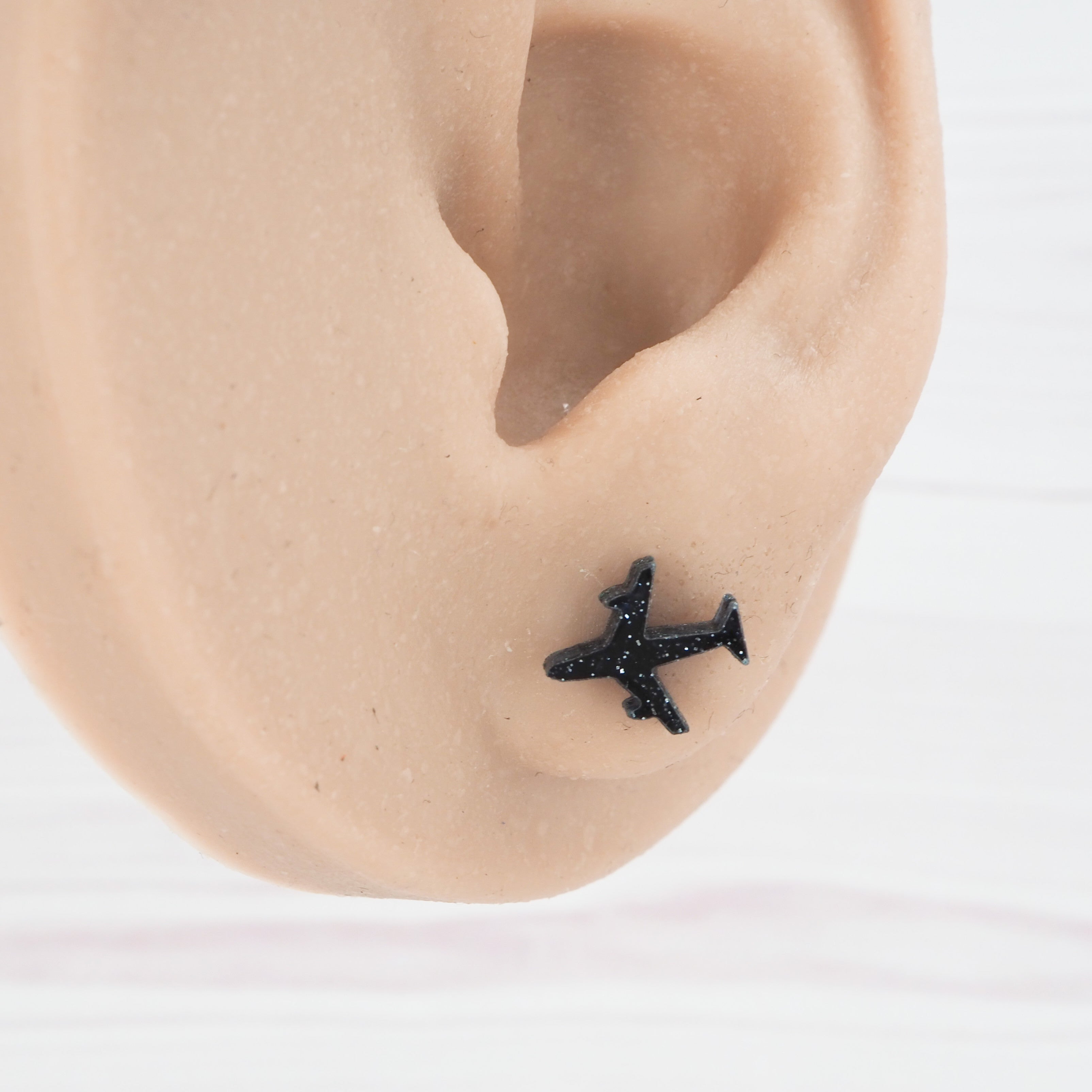 Small Black glitter plane acrylic studs with 0.7mm ear stems.