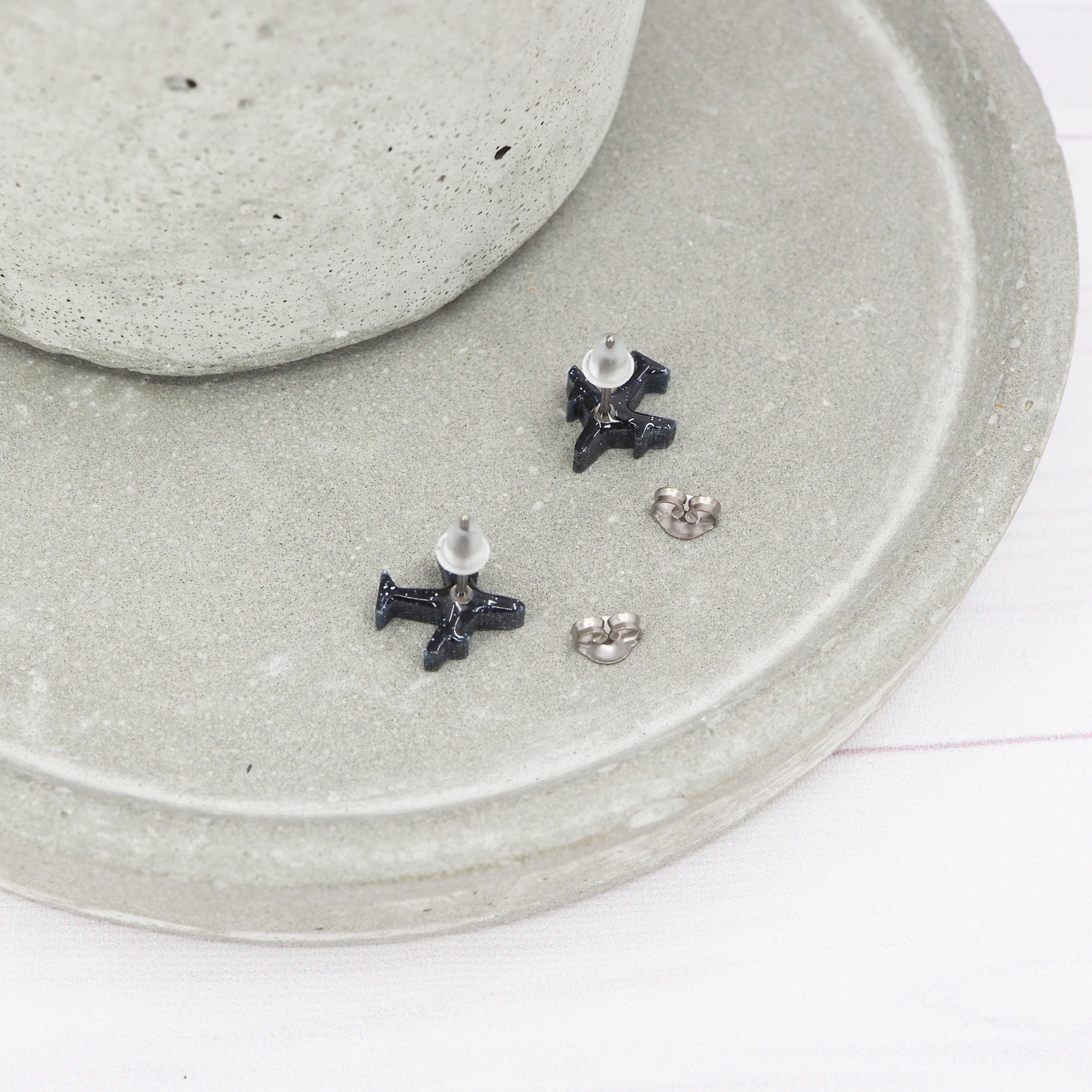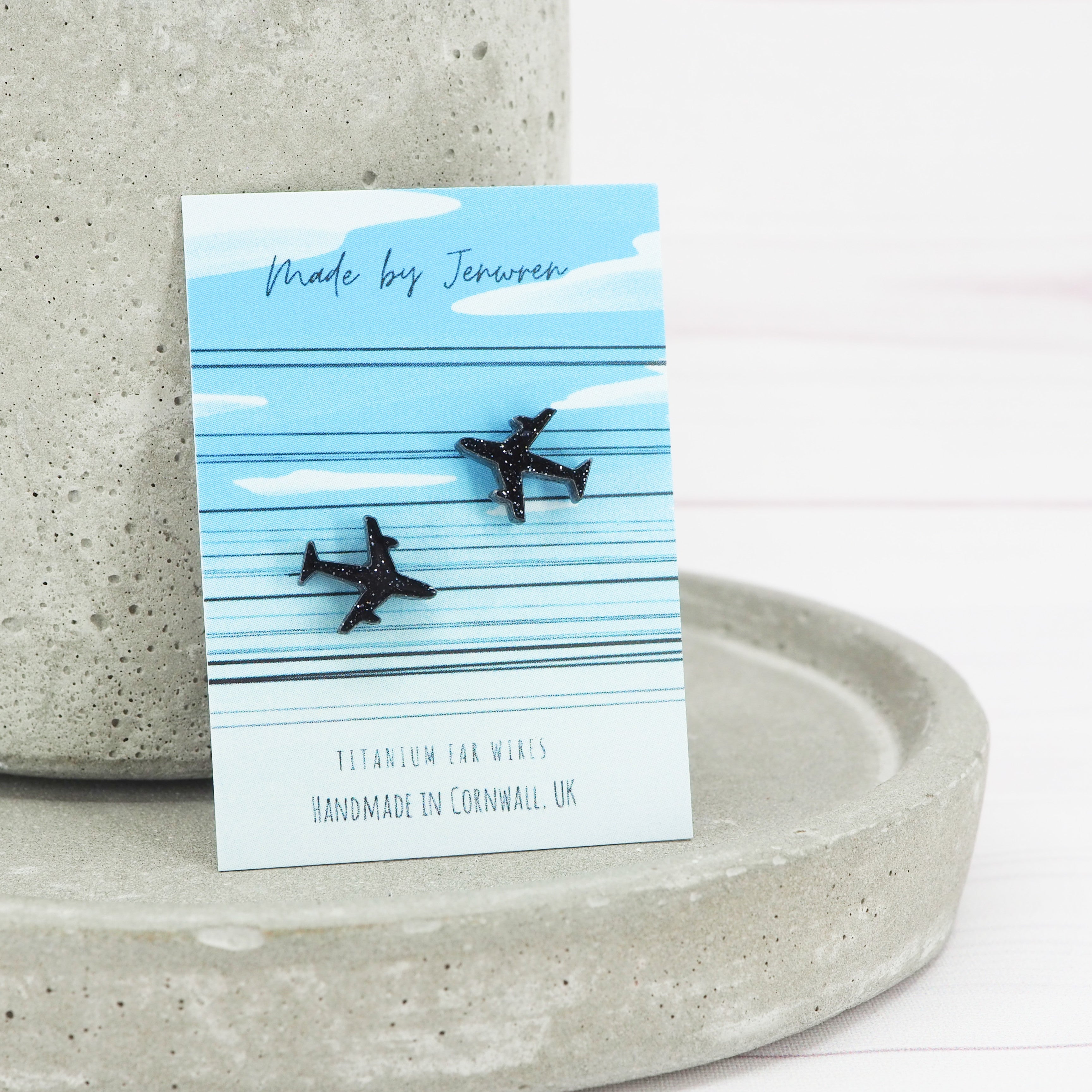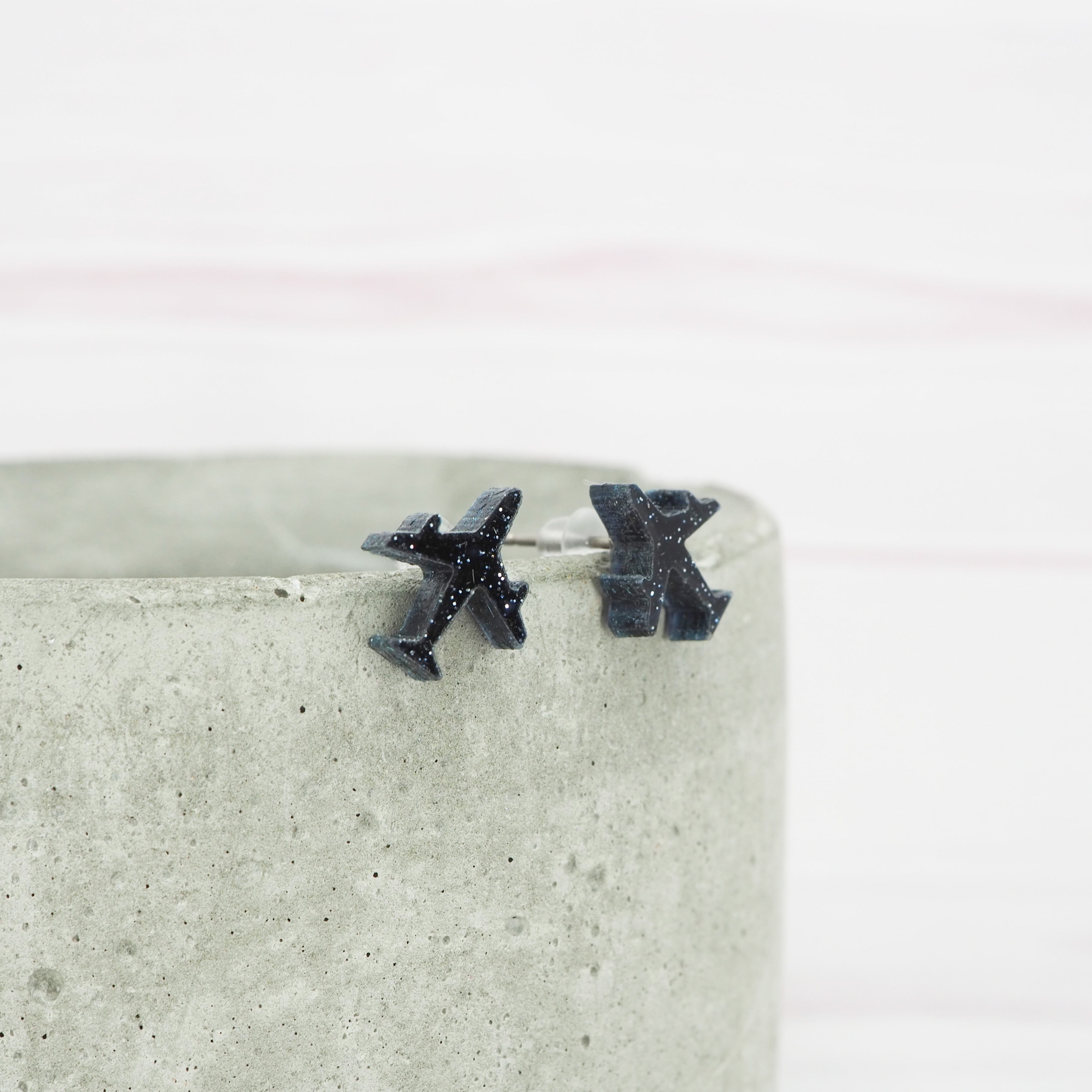 Small Black glitter plane acrylic studs with 0.7mm ear stems.