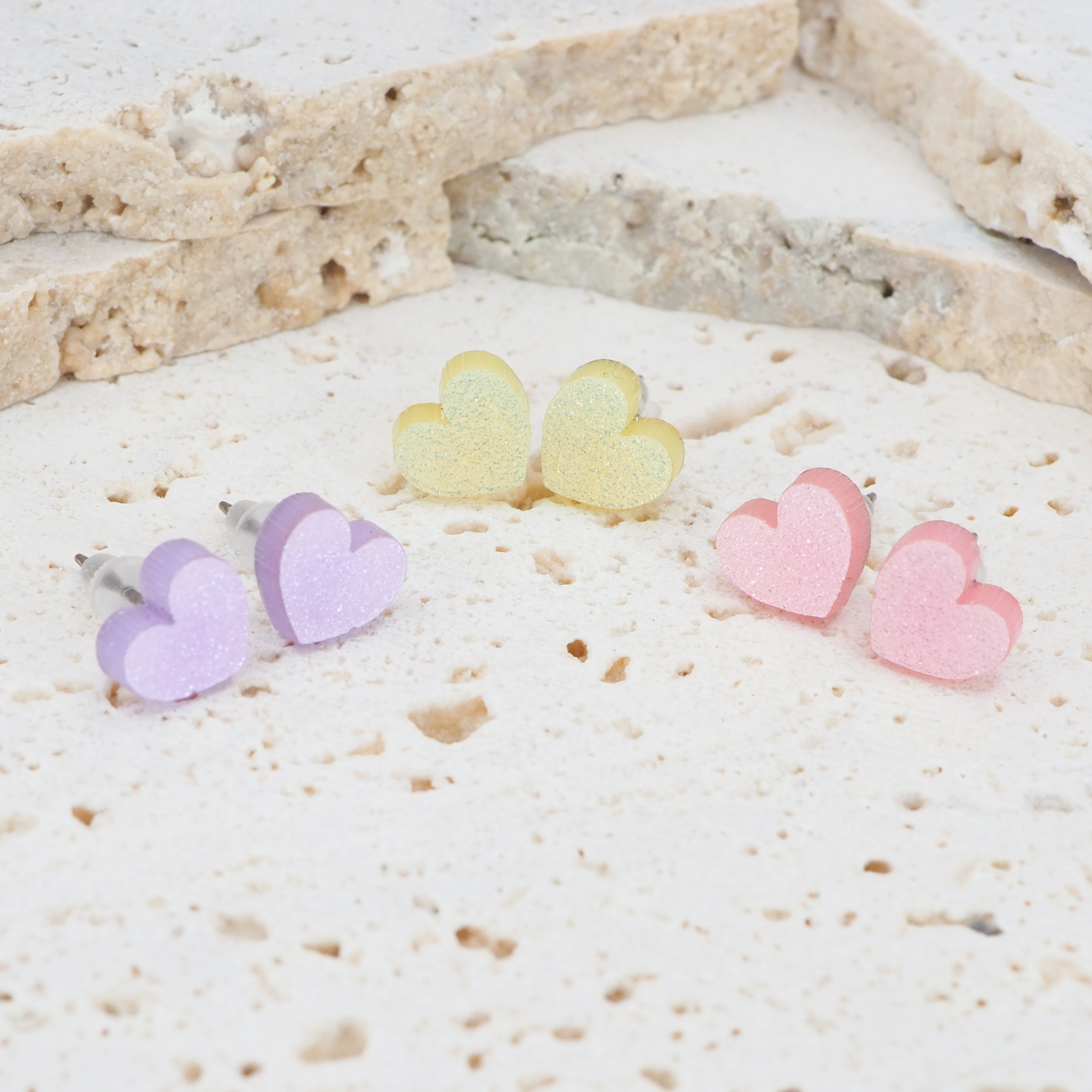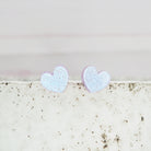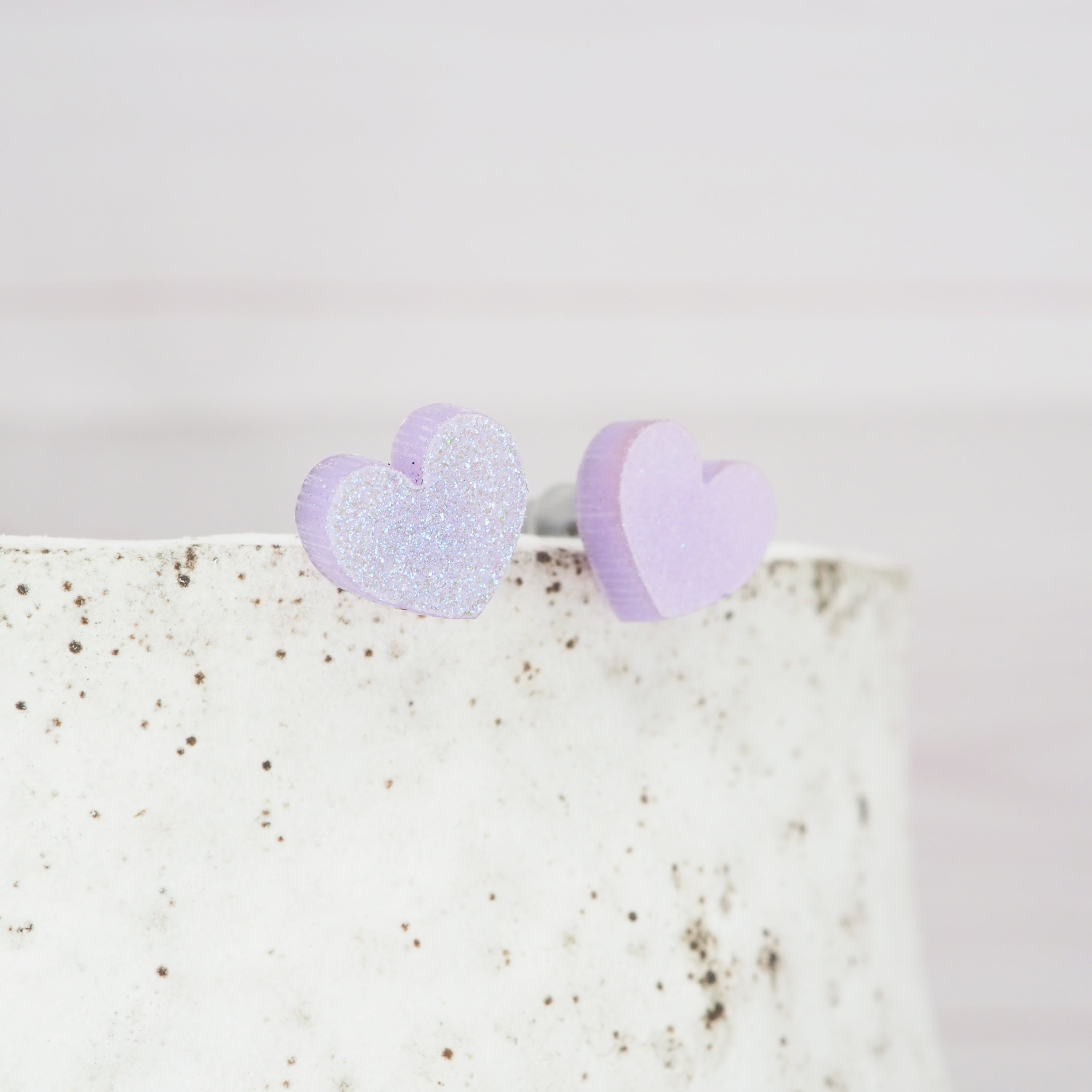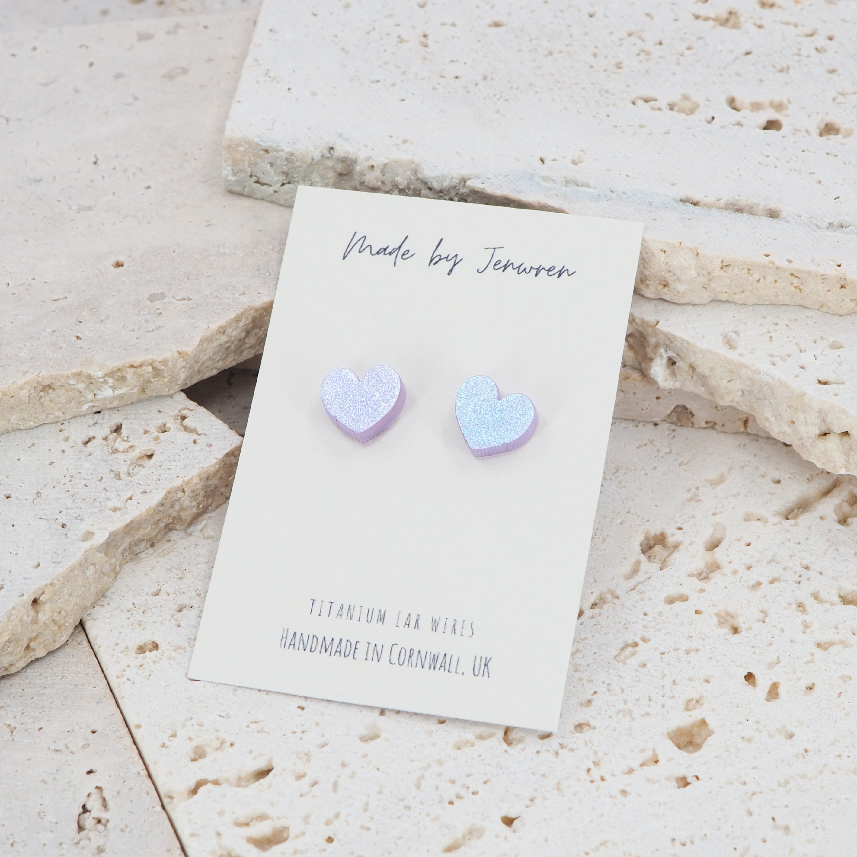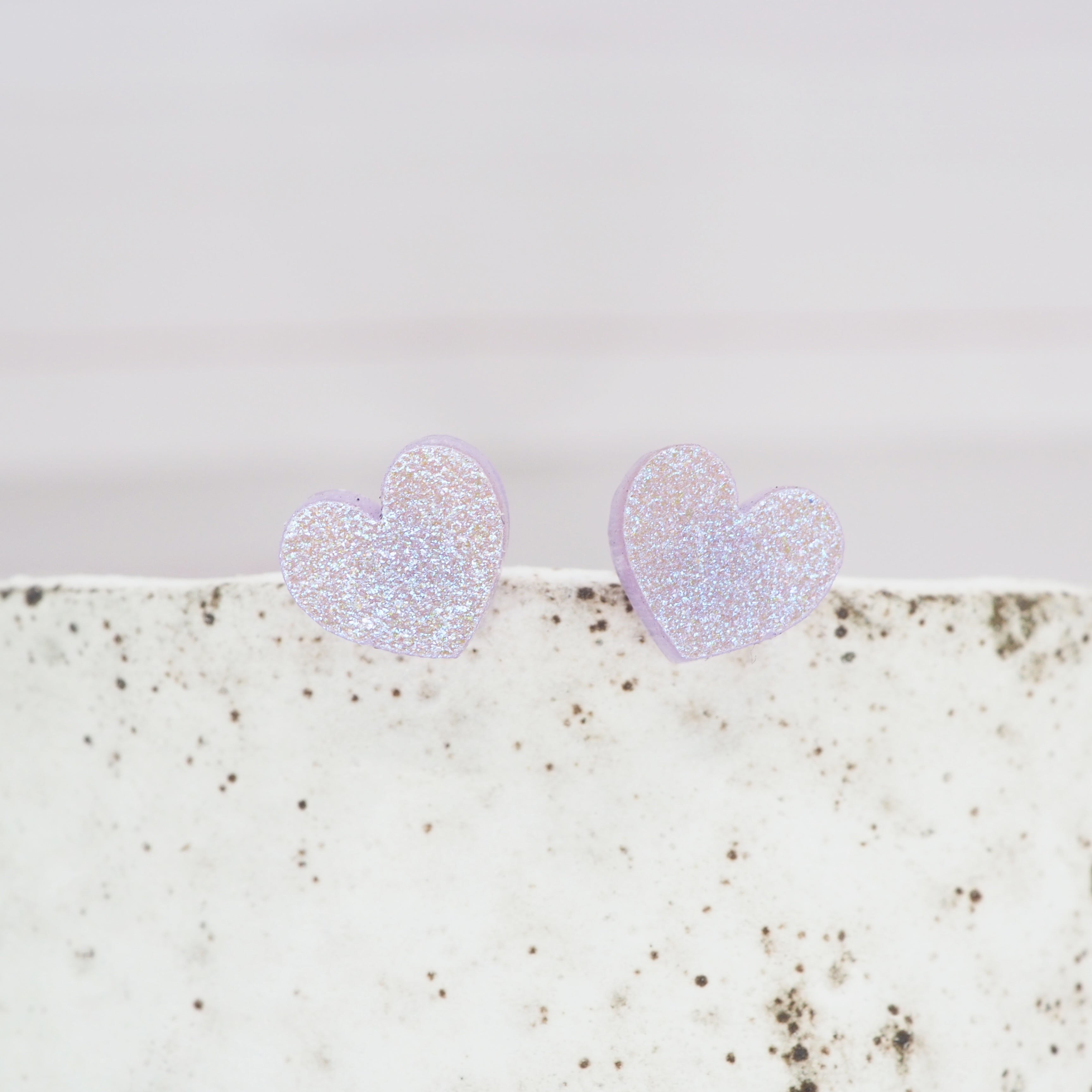 Small Lilac iridescent heart acrylic studs with 0.7mm ear stems.