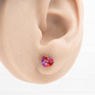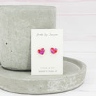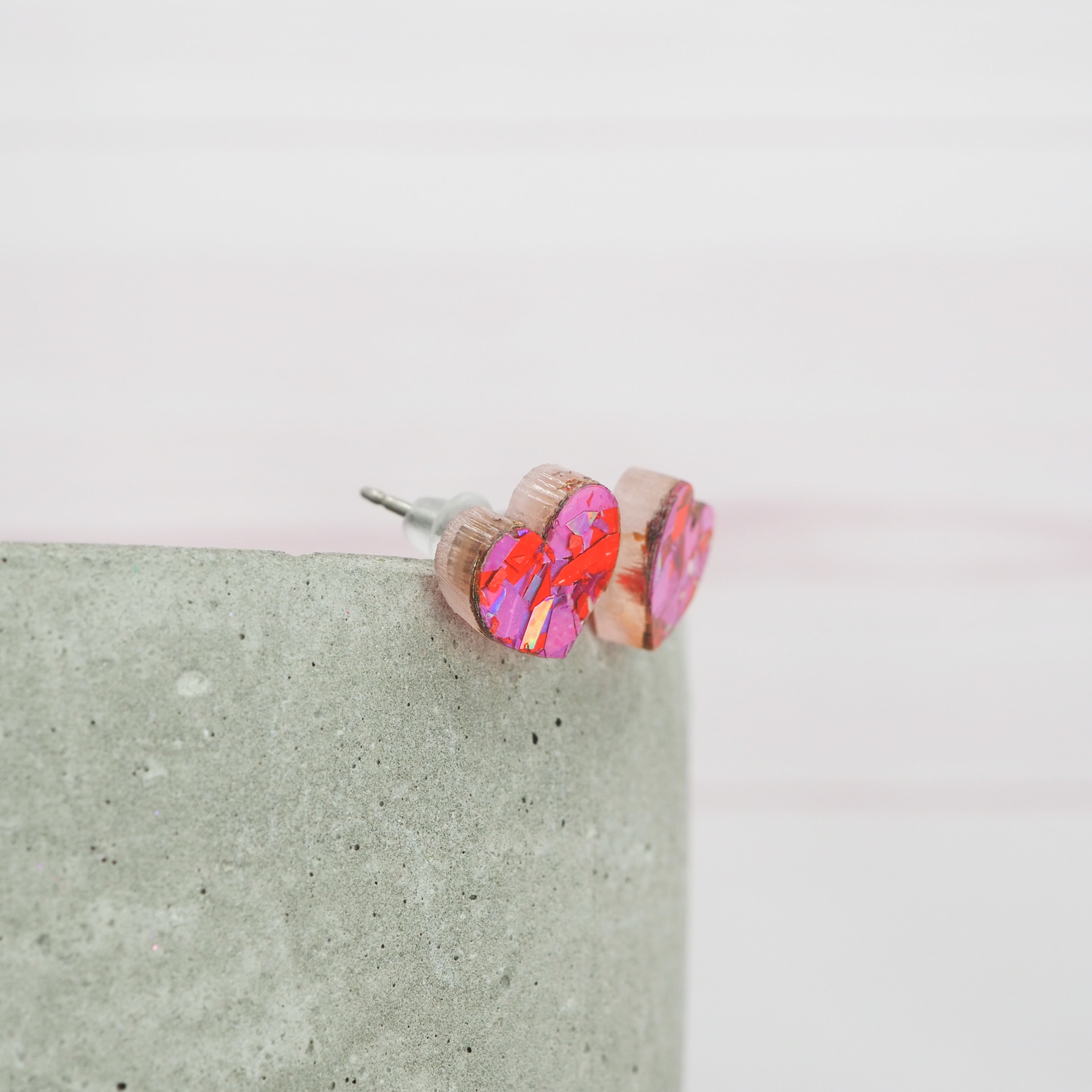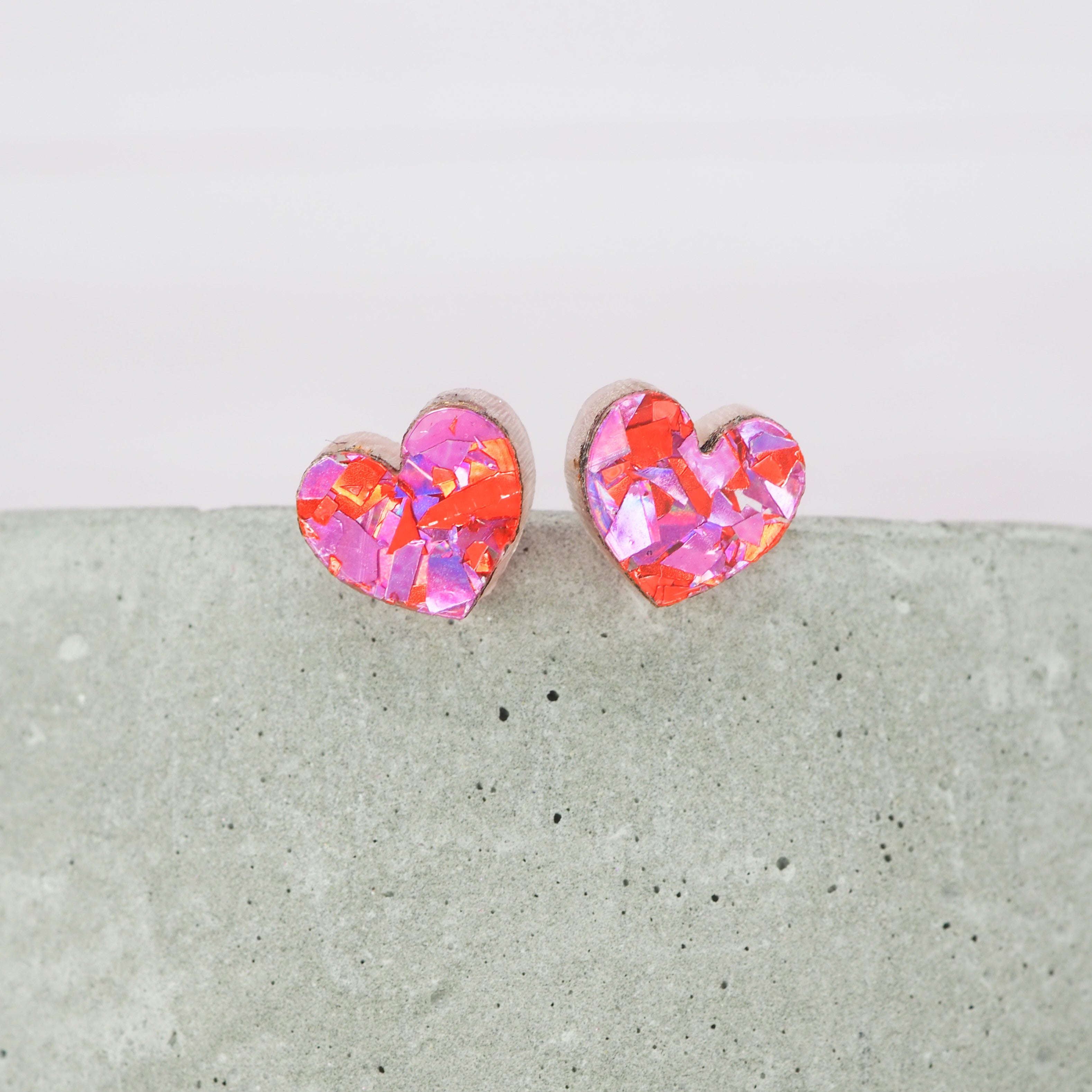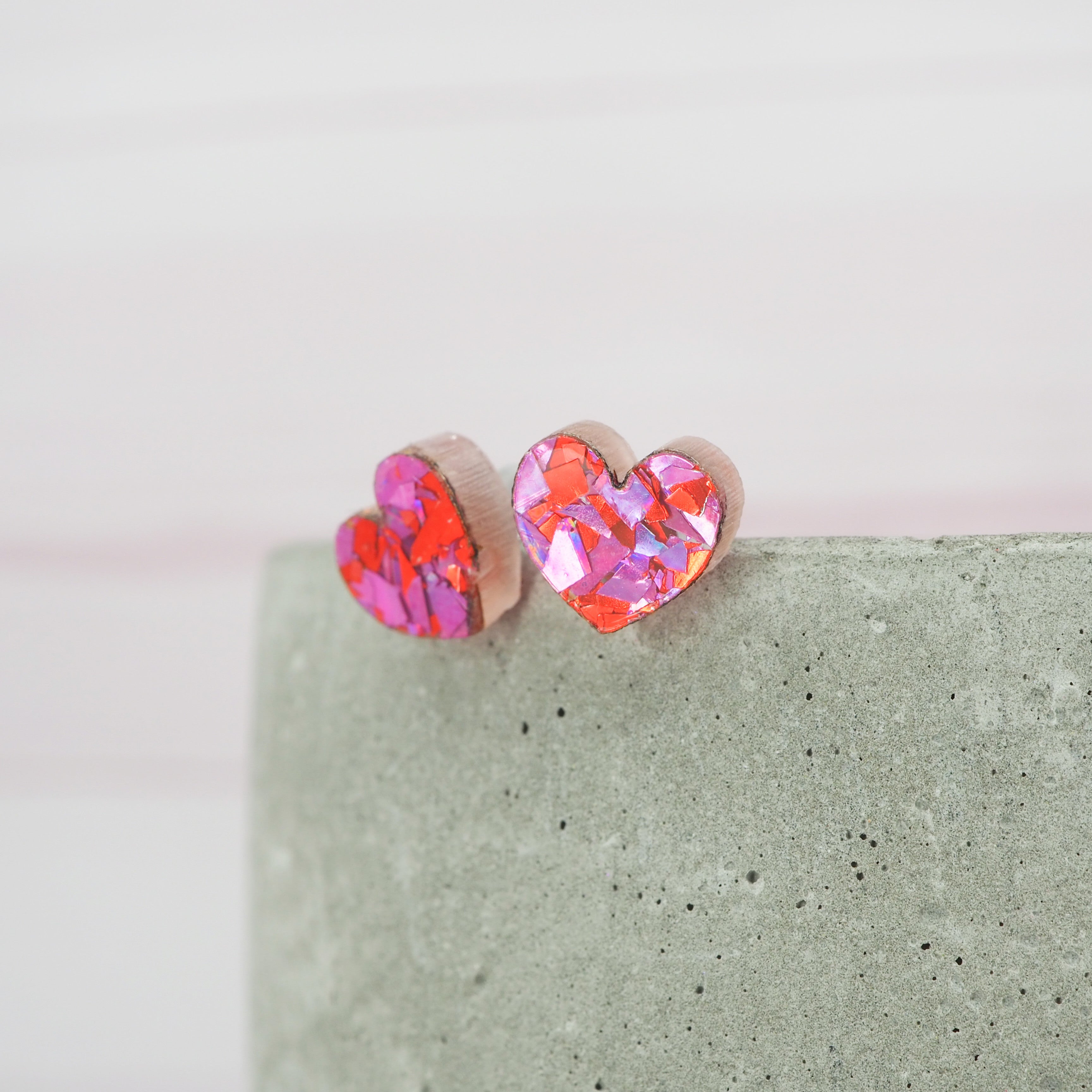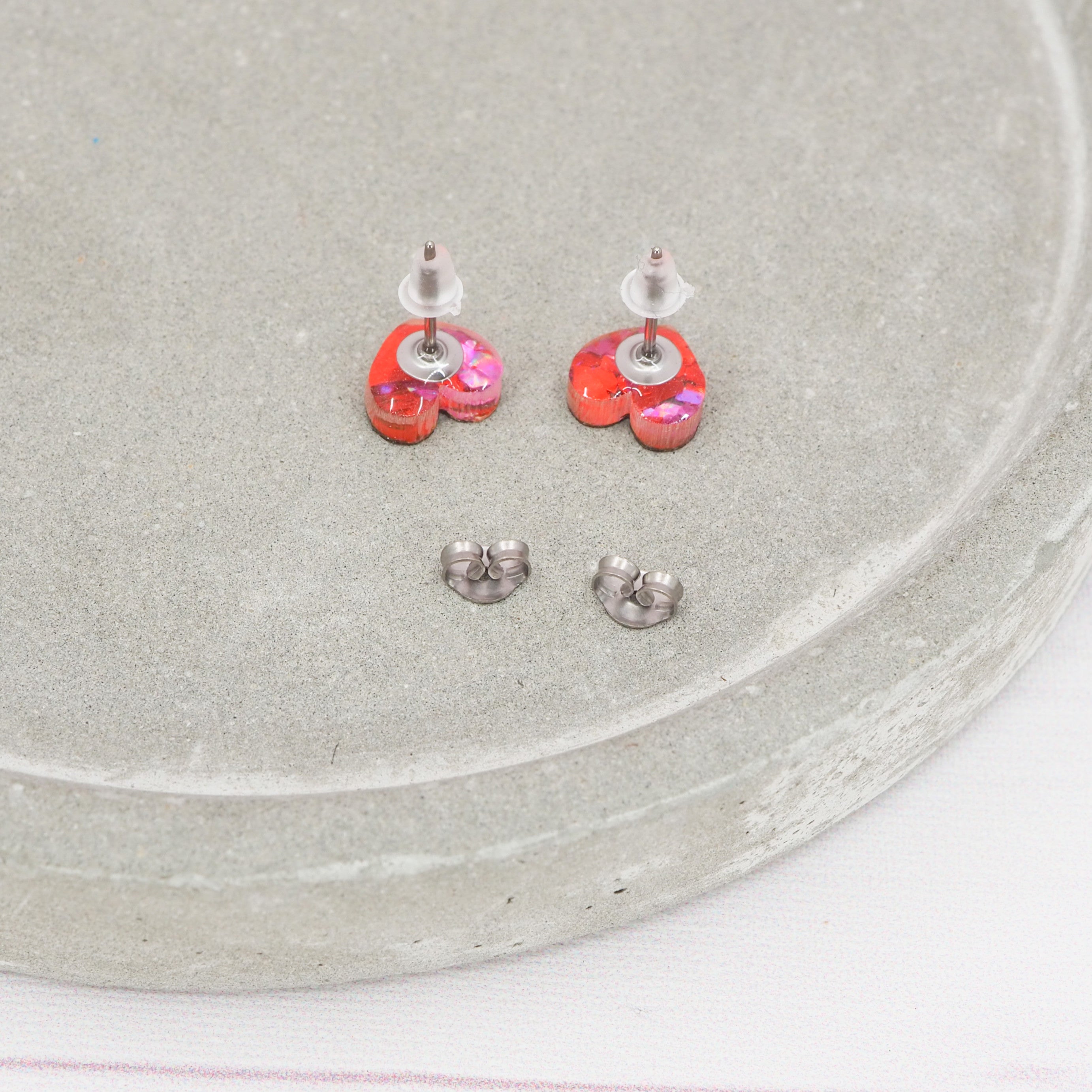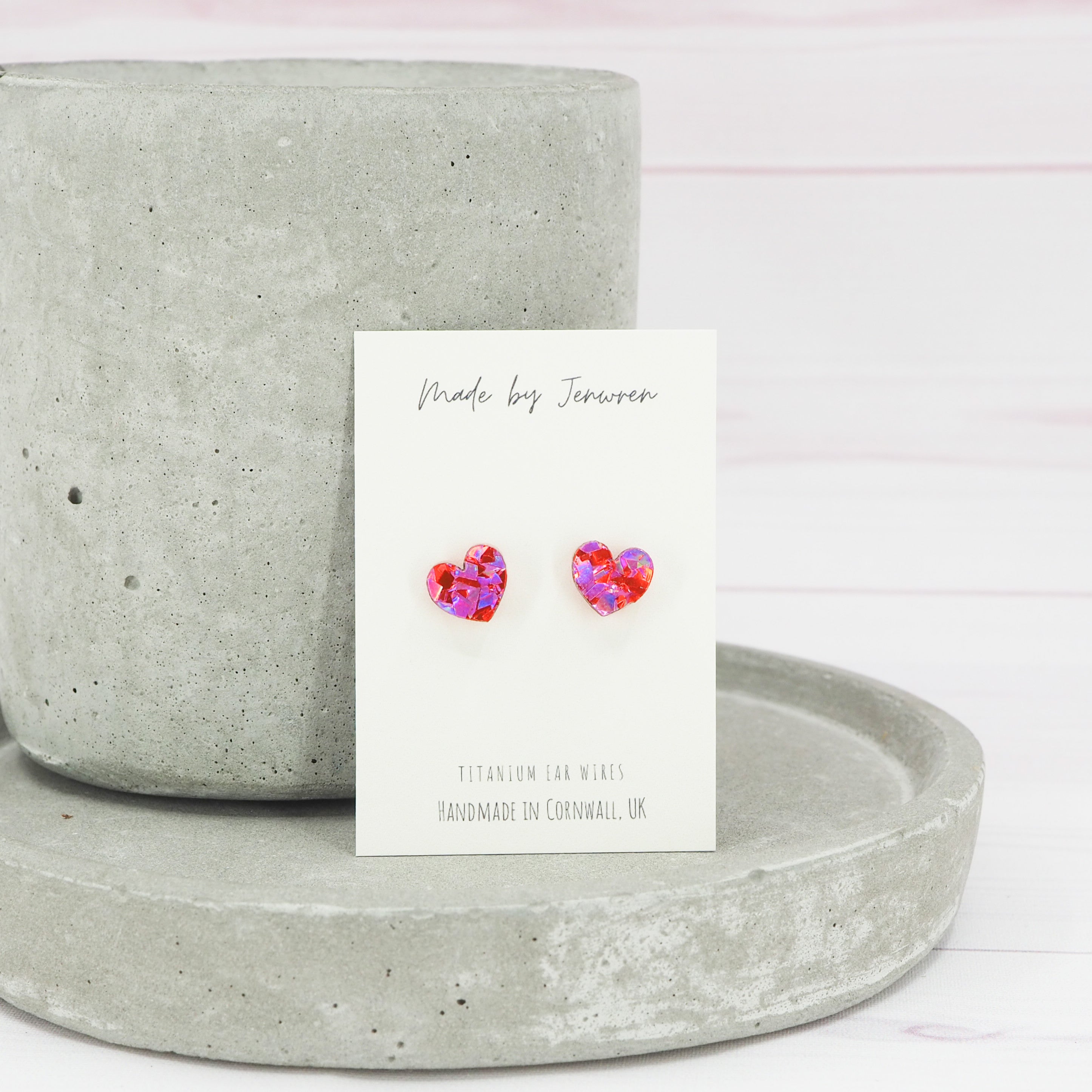 Pink and Red flake glitter small heart acrylic studs with 0.7mm ear stems.