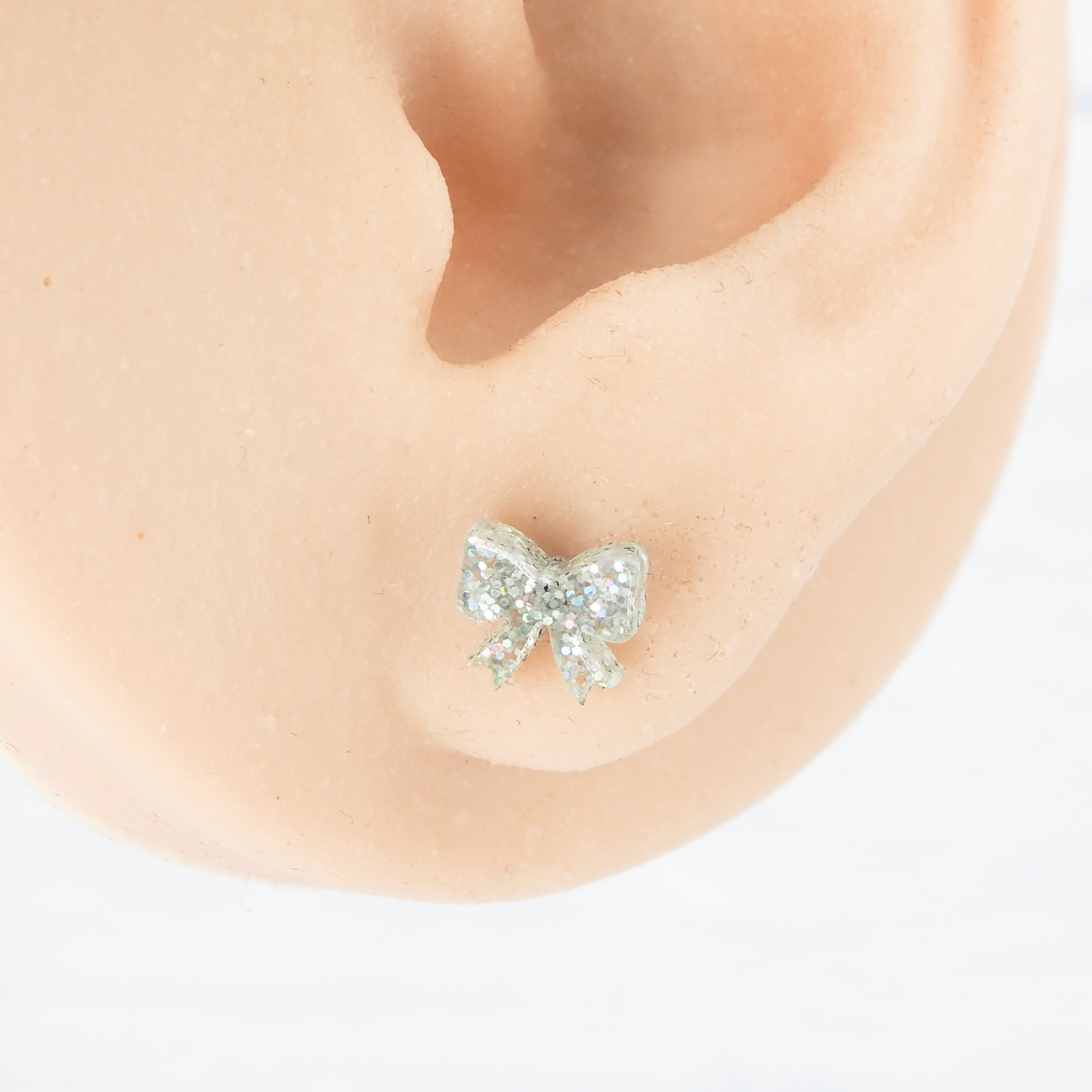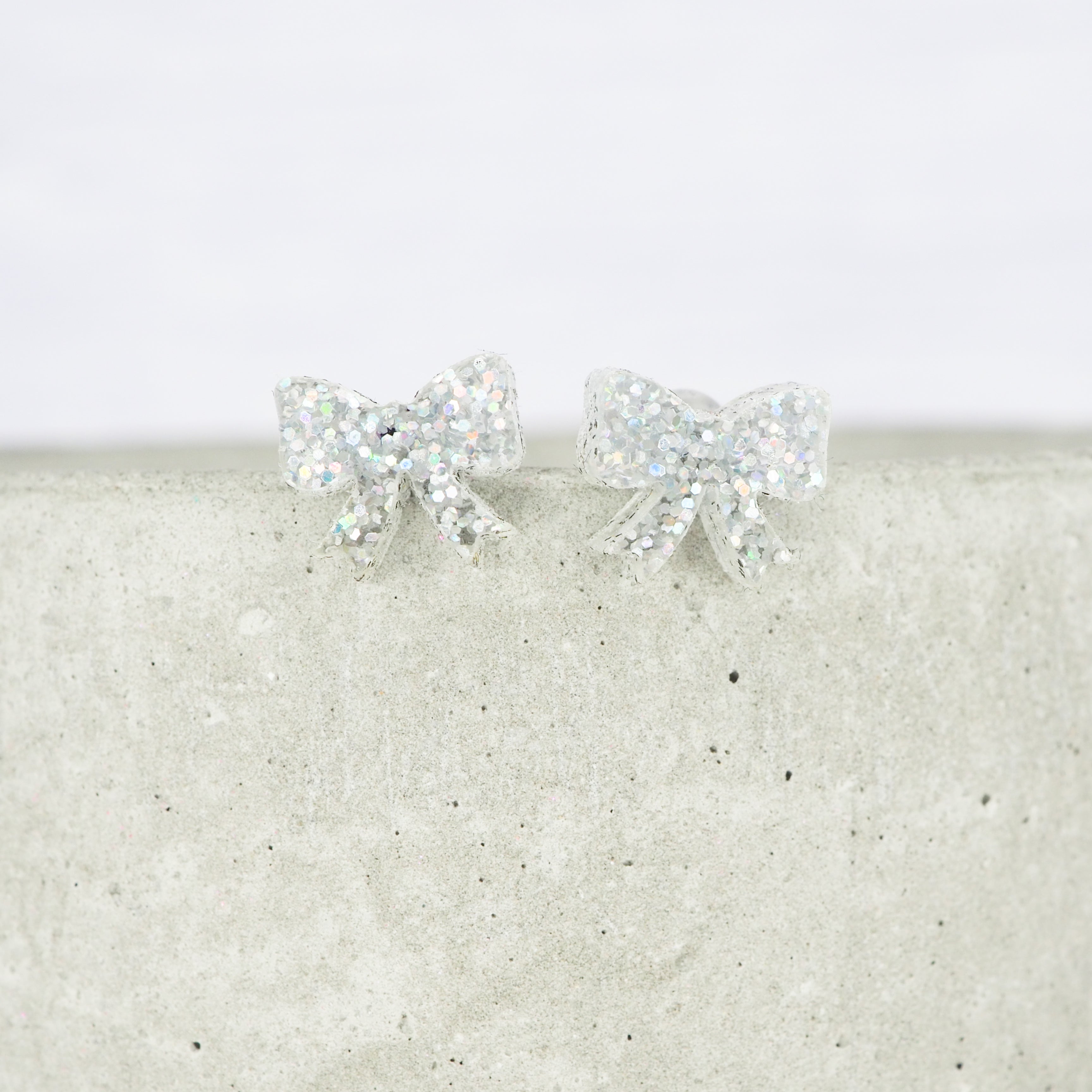 Silver holographic glitter bow studs with 0.7mm ear stems.