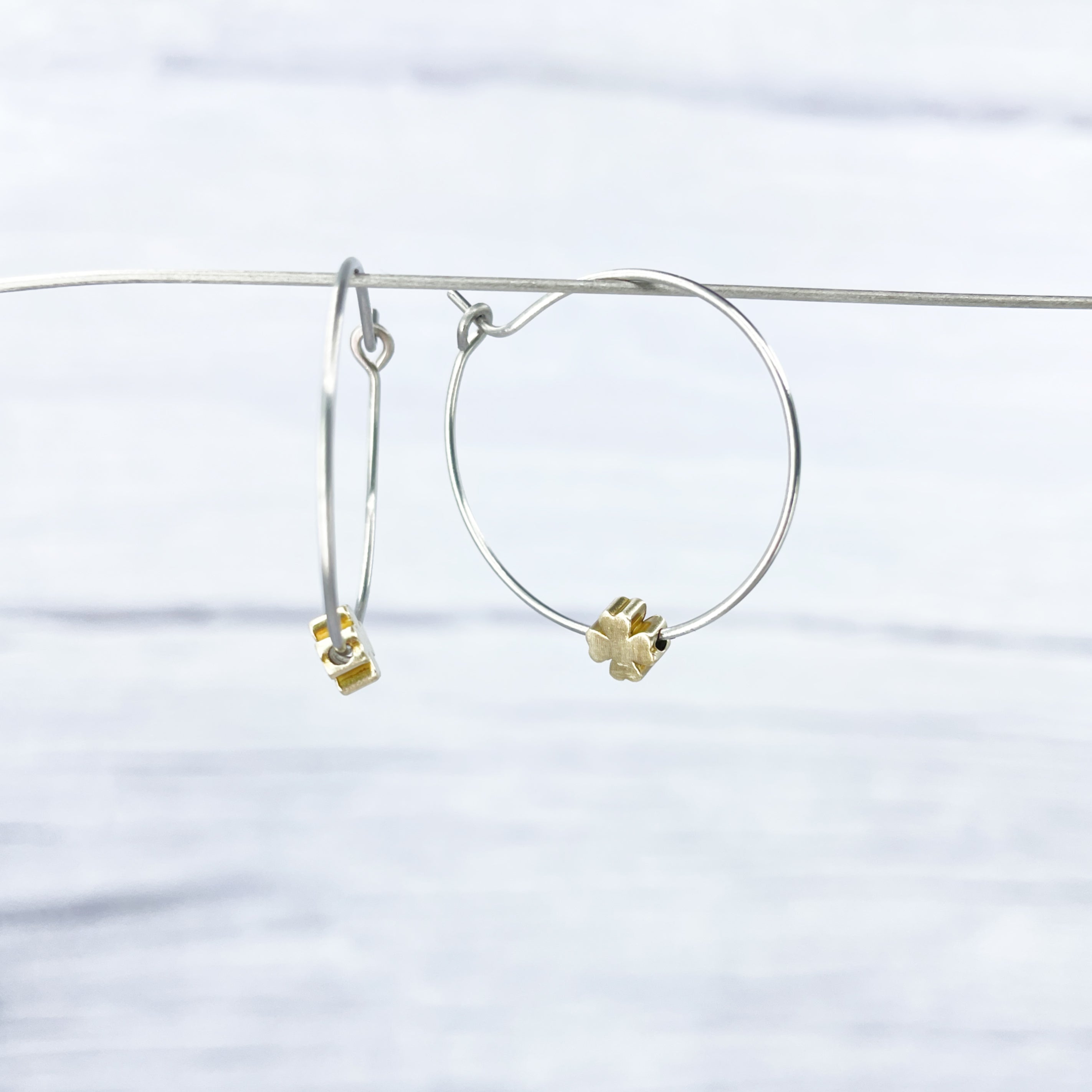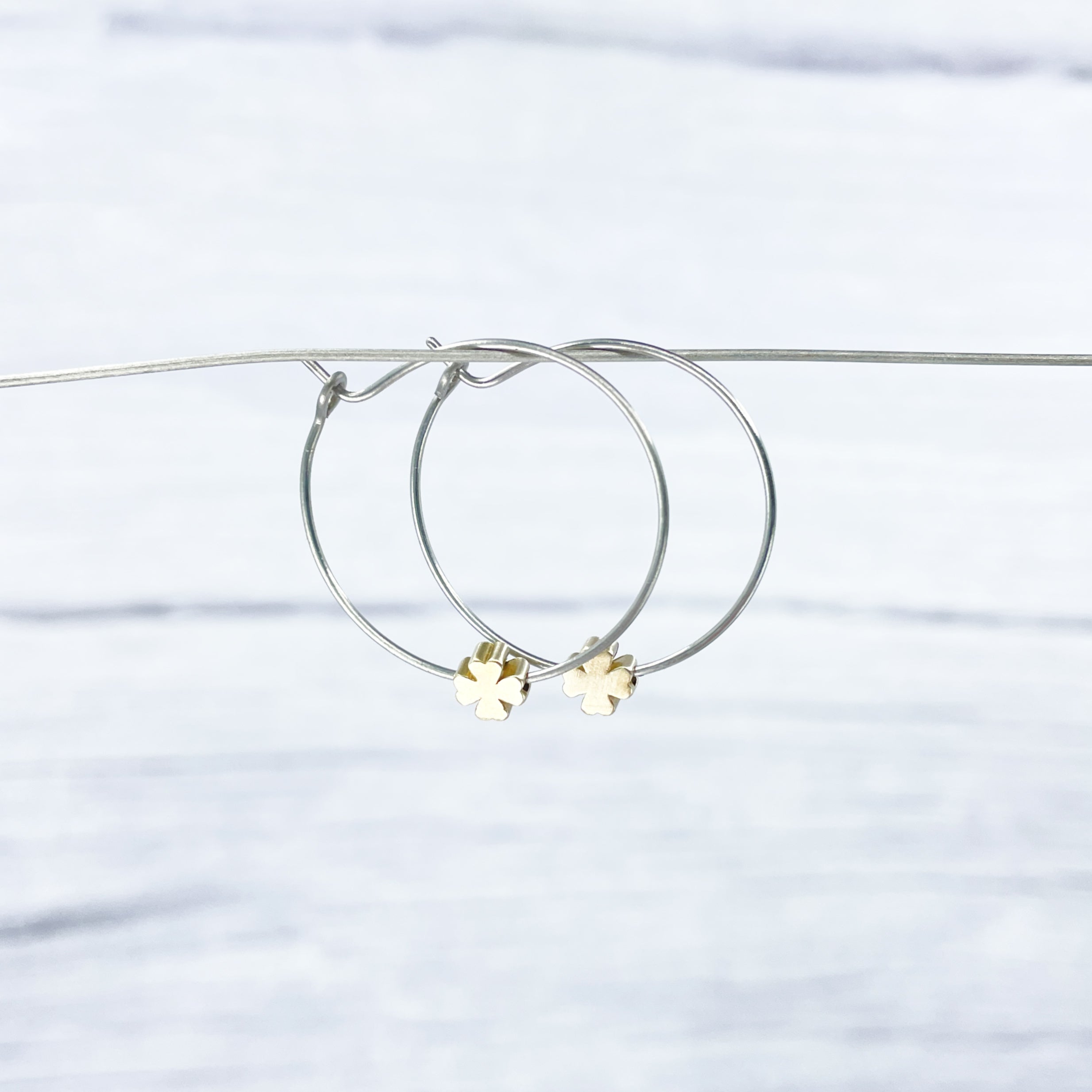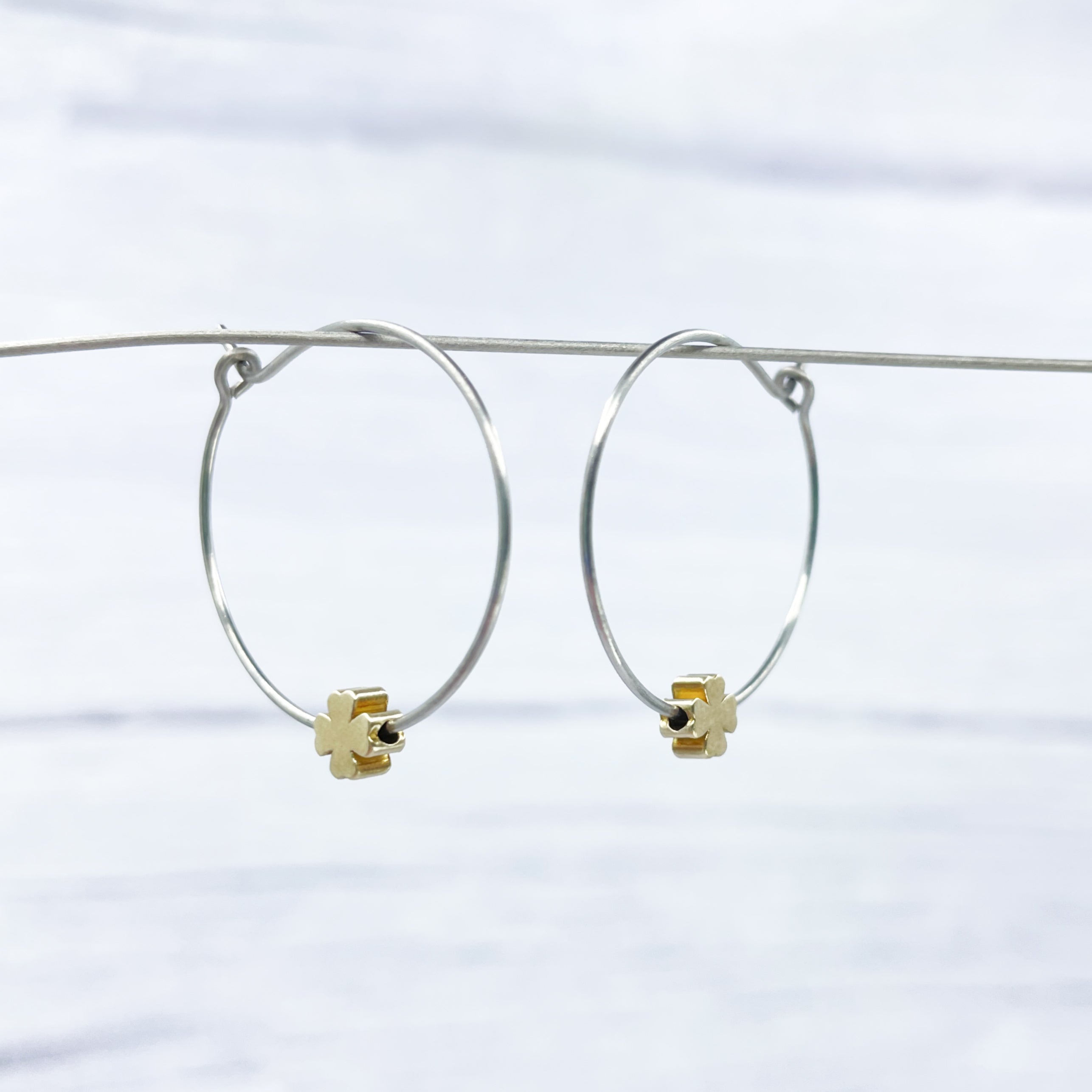 1 inch polished titanium hoops - Brass four leaf clover charm