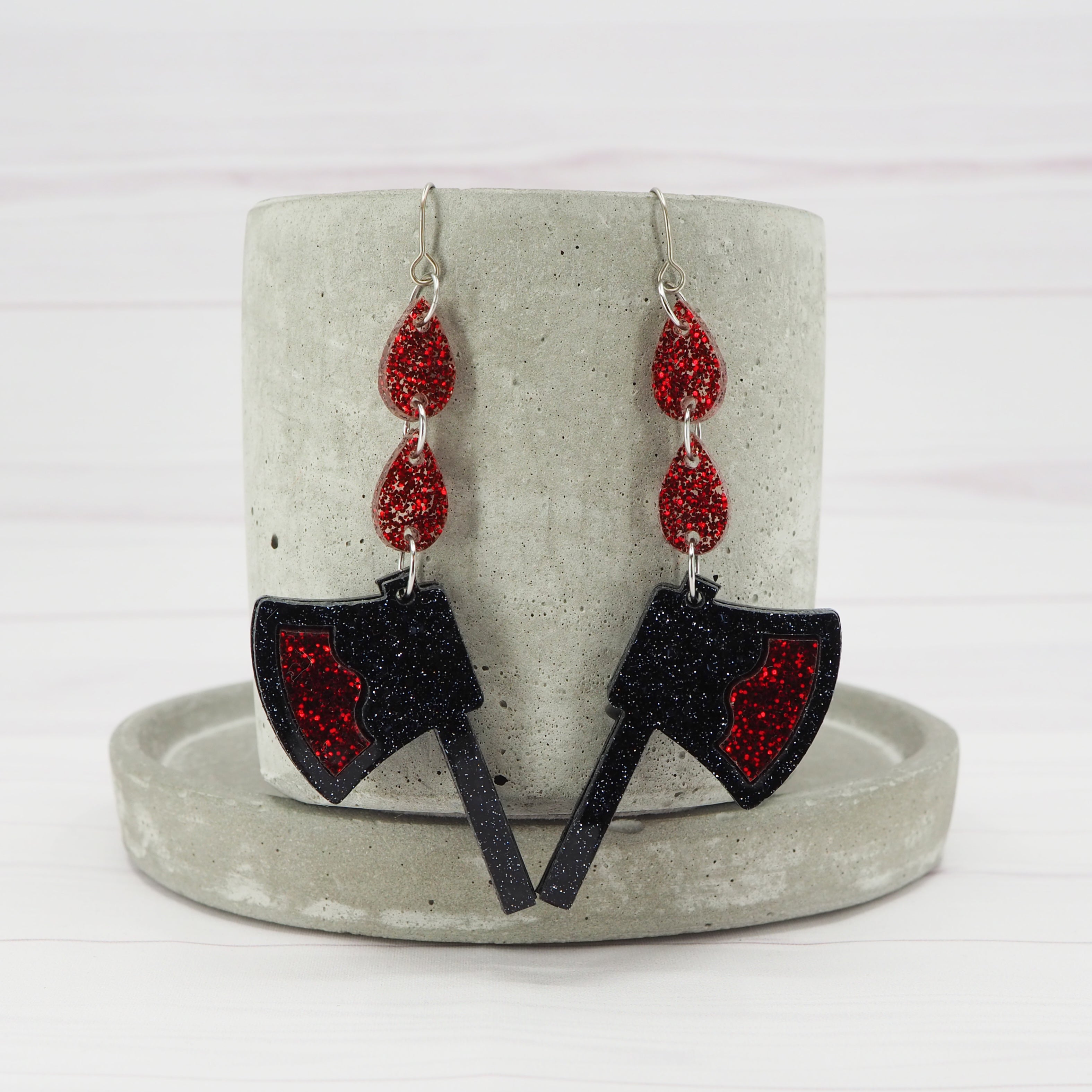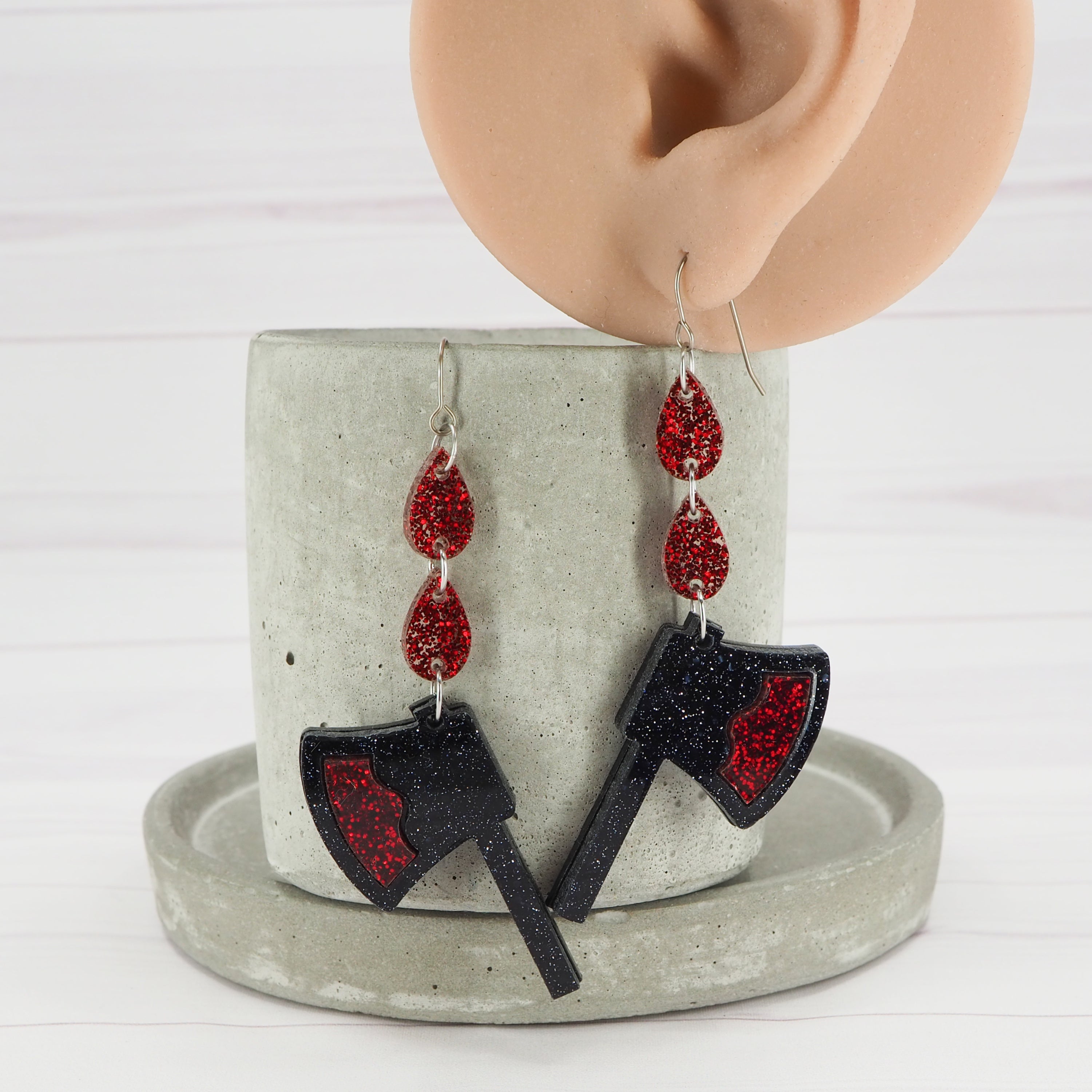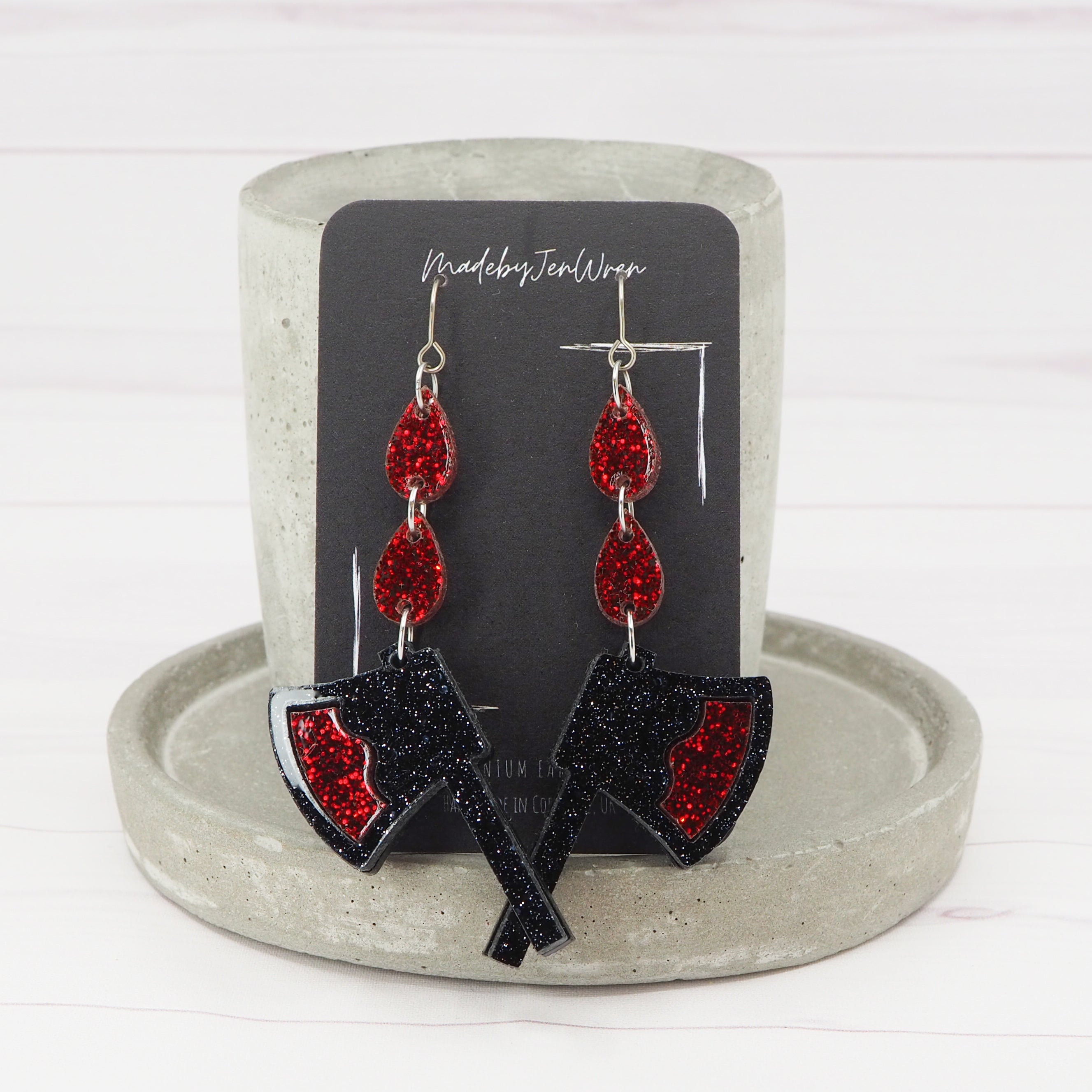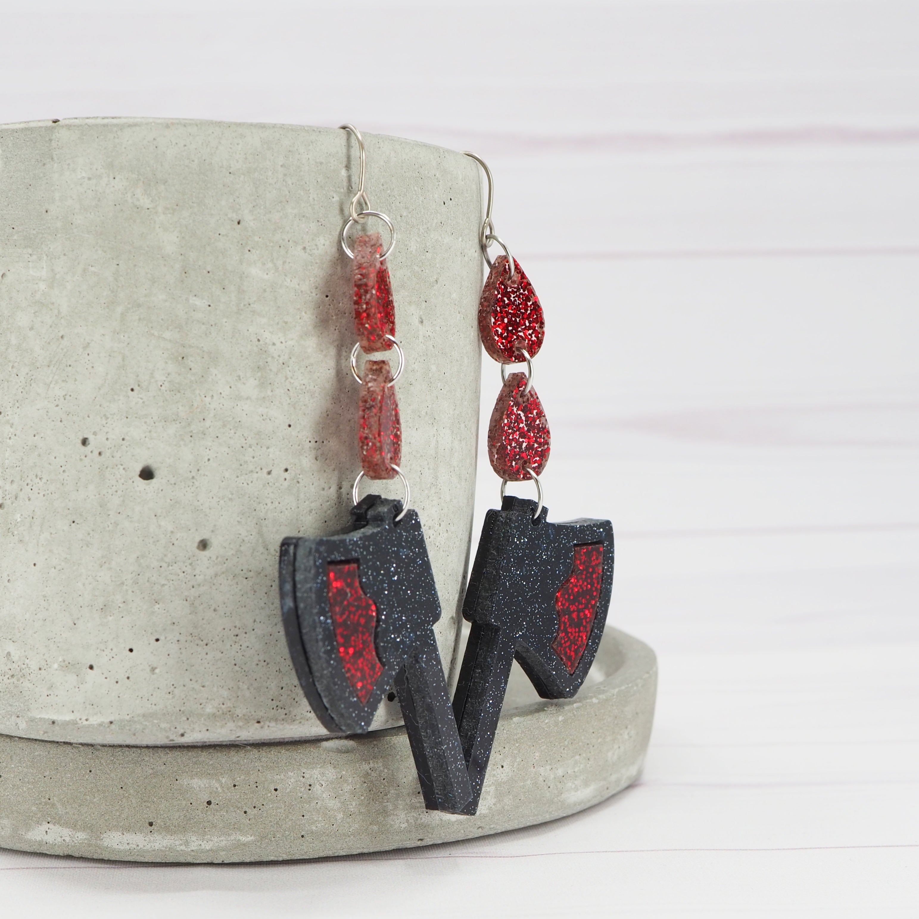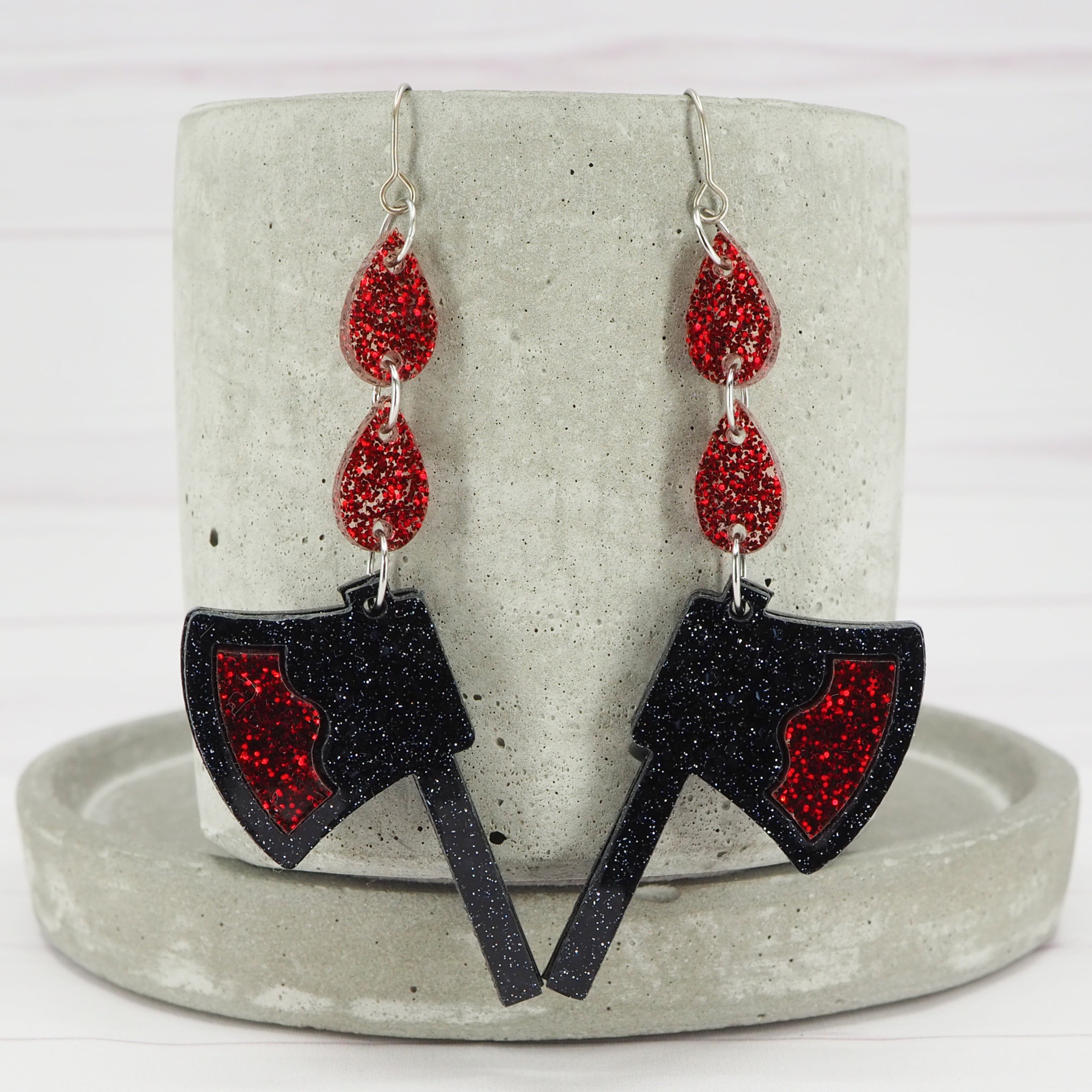 The earrings have a total drop length of 3.5" (9cm) from the top of the ear wire to the bottom of the axes.