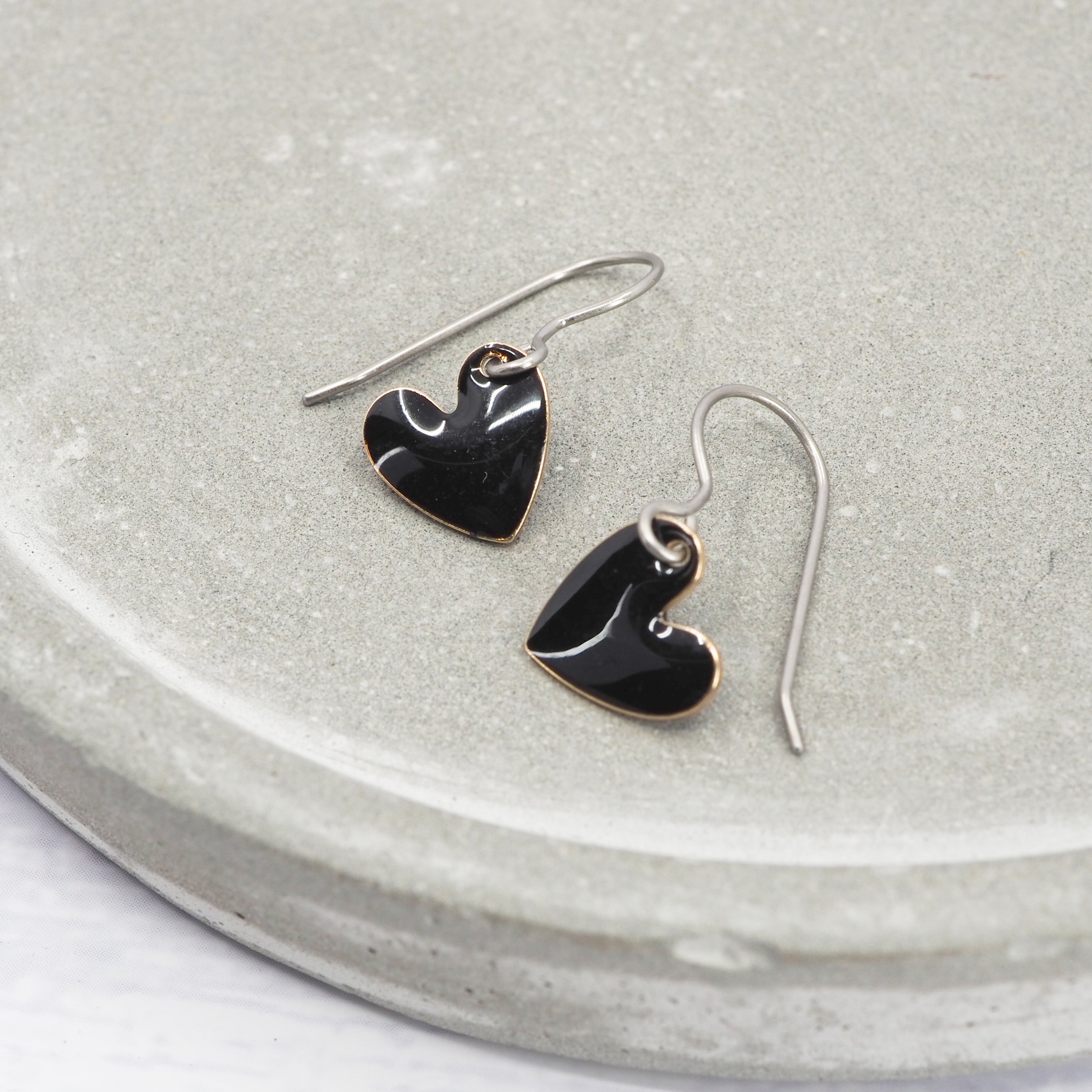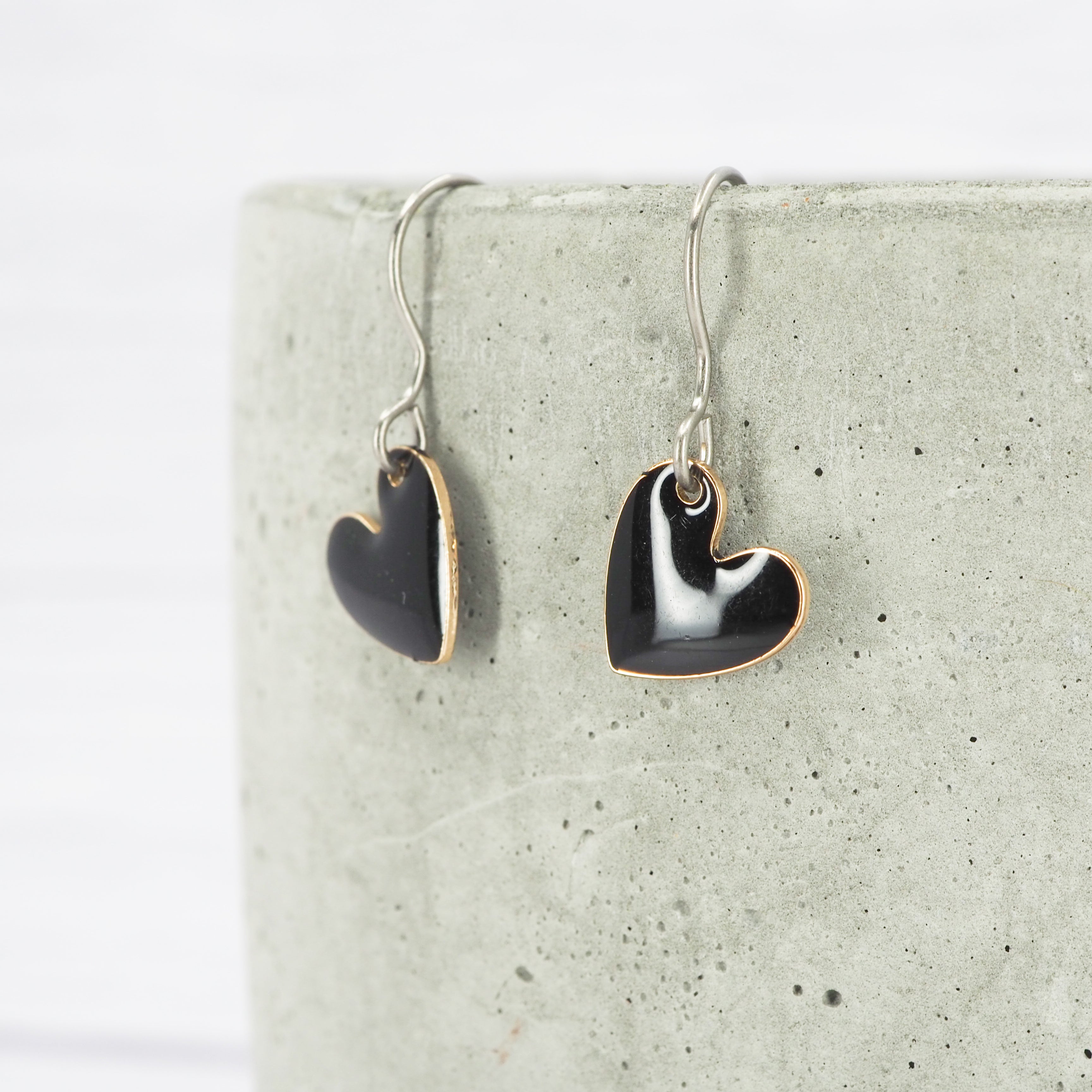 Black enamel heart dangle earrings. Great for all occasions.