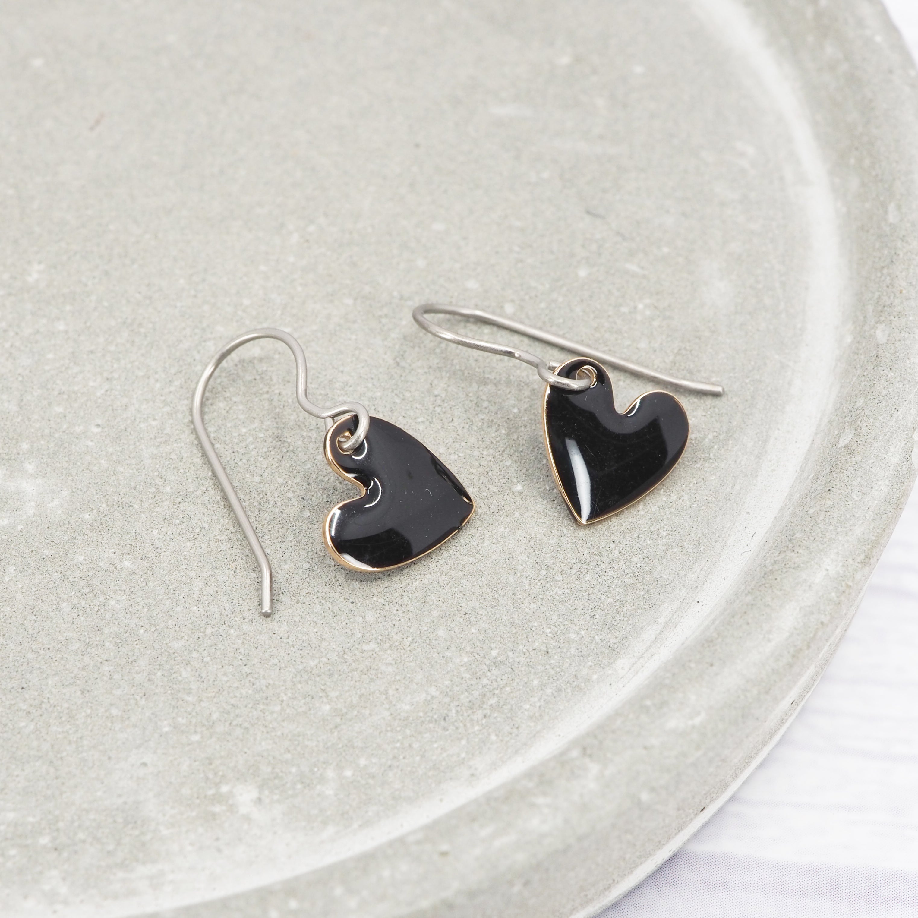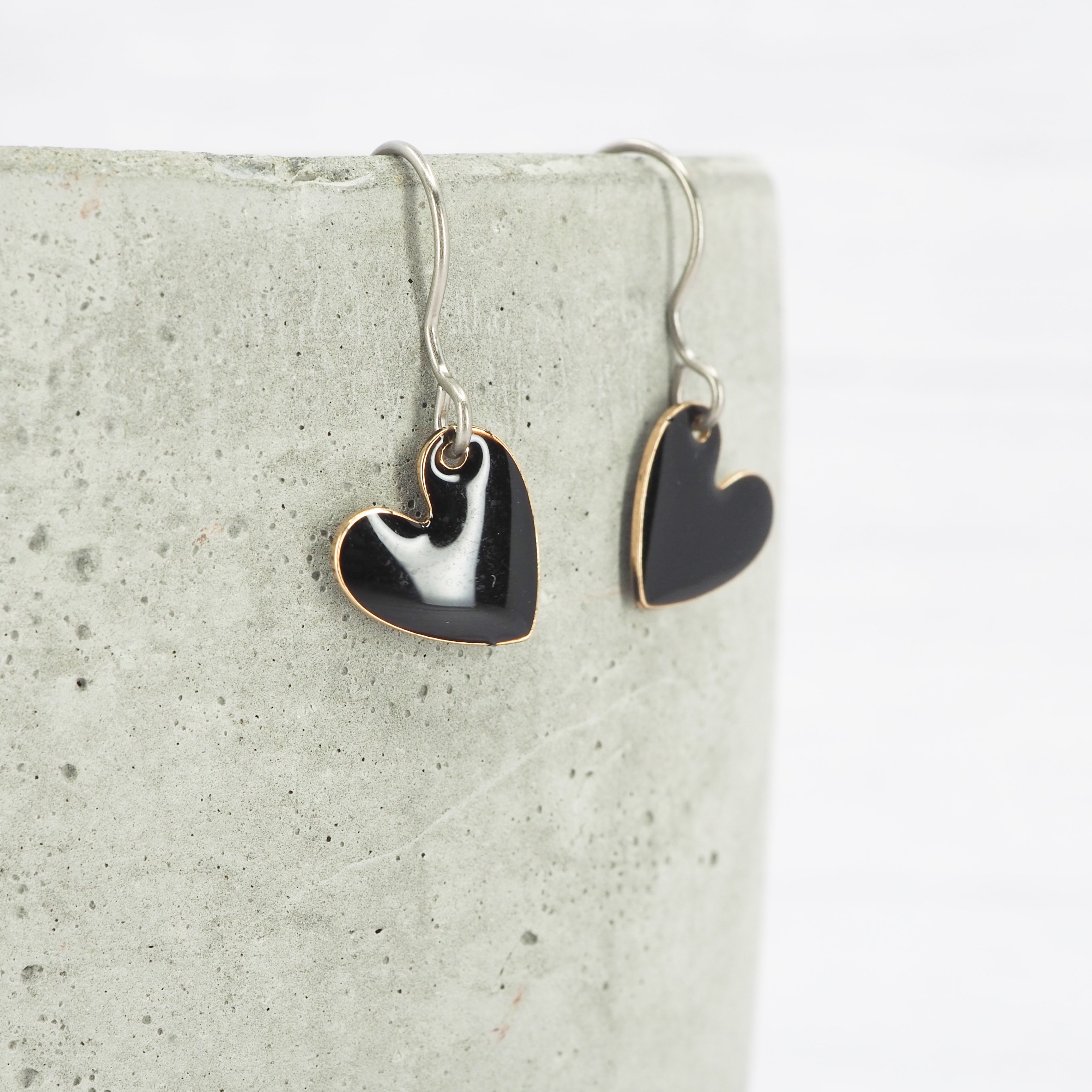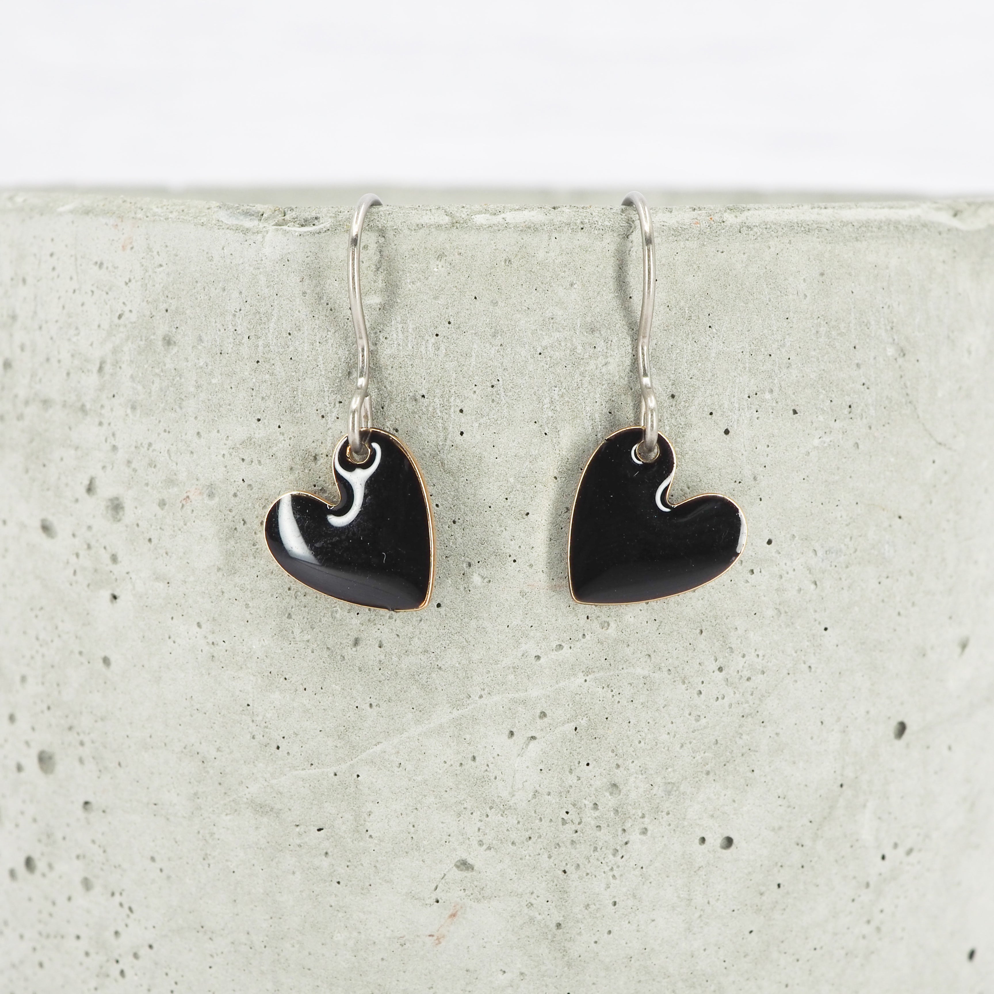 Black enamel heart dangle earrings