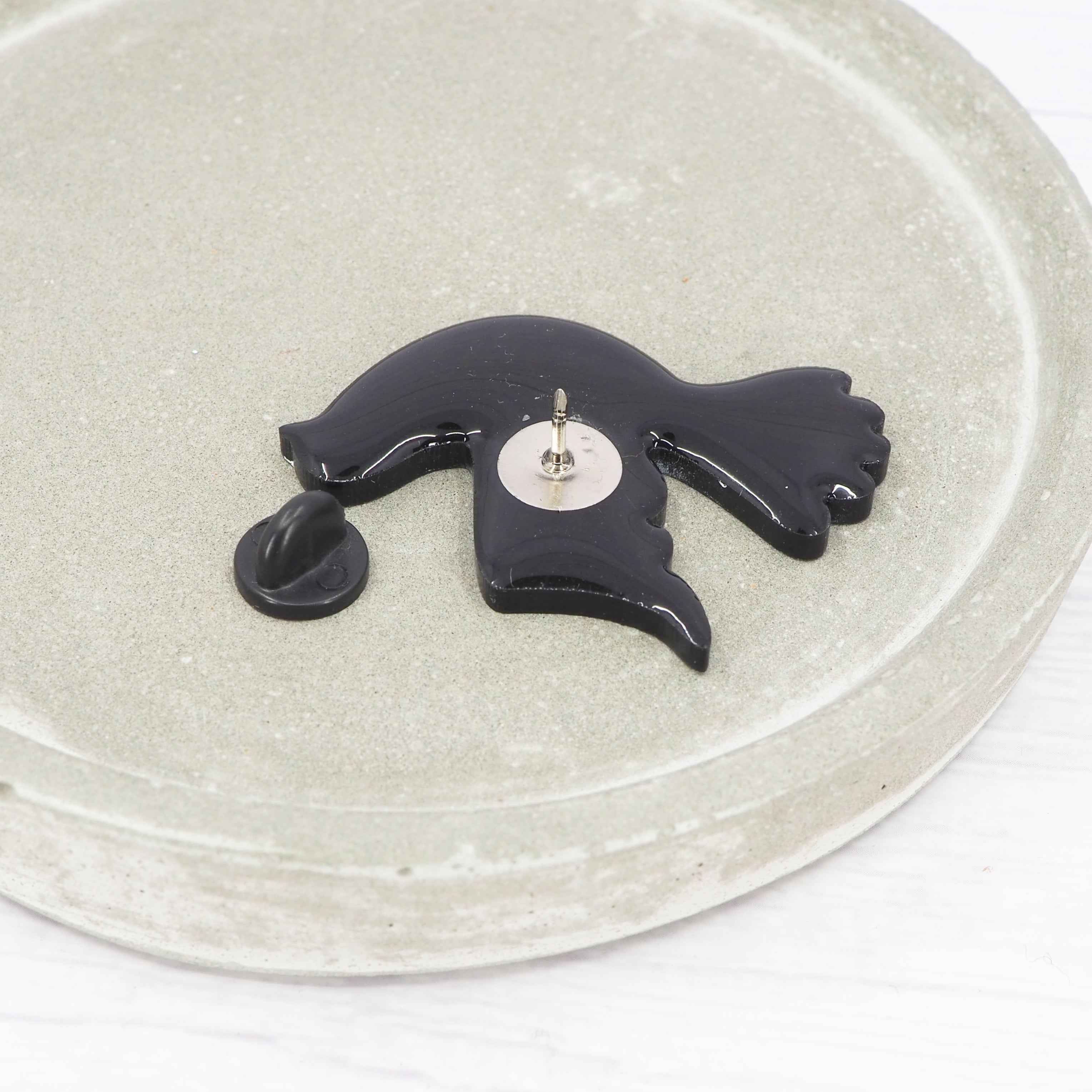 Stainless steel pin back with a black rubber stopper.