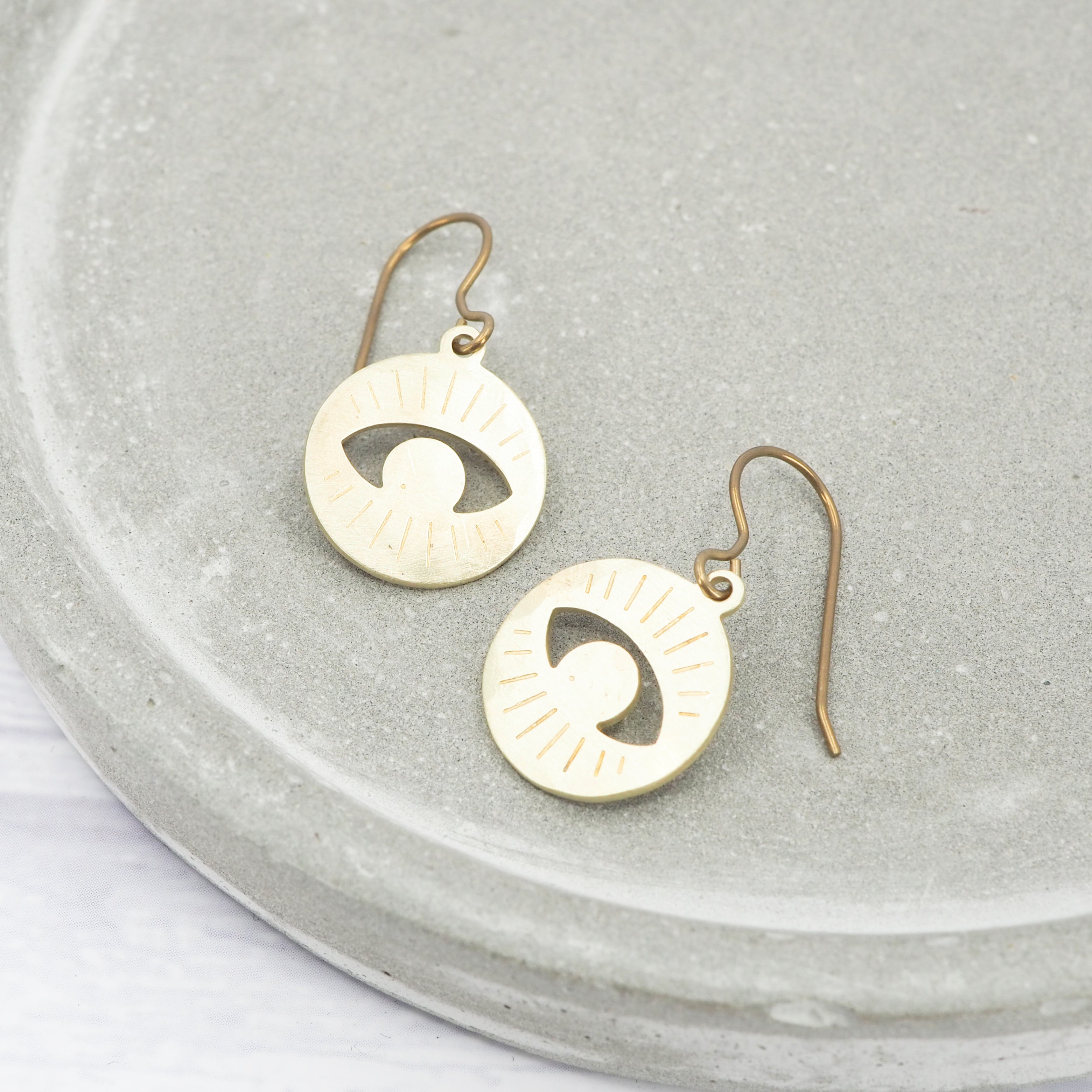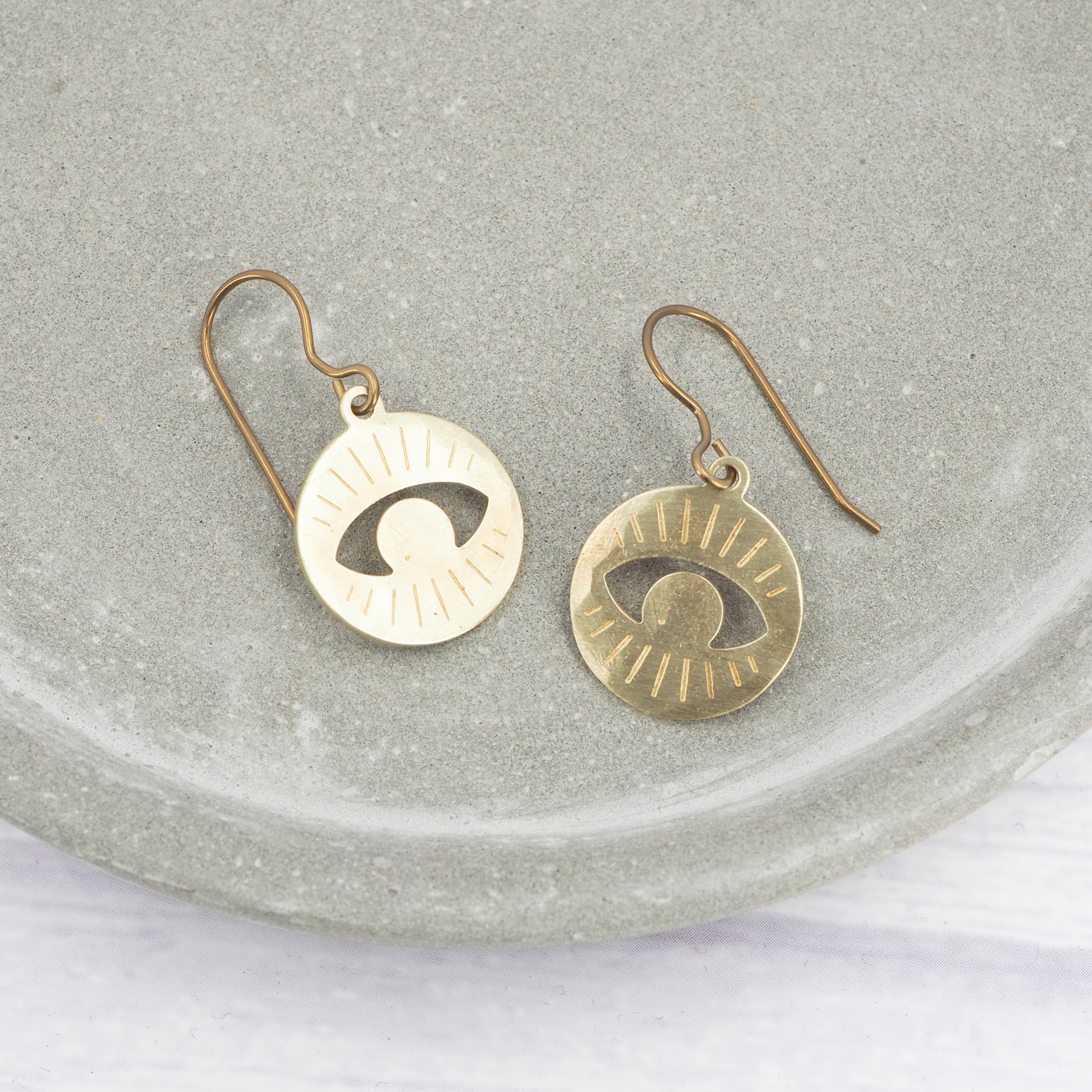 Brass Eye disk dangle earrings.