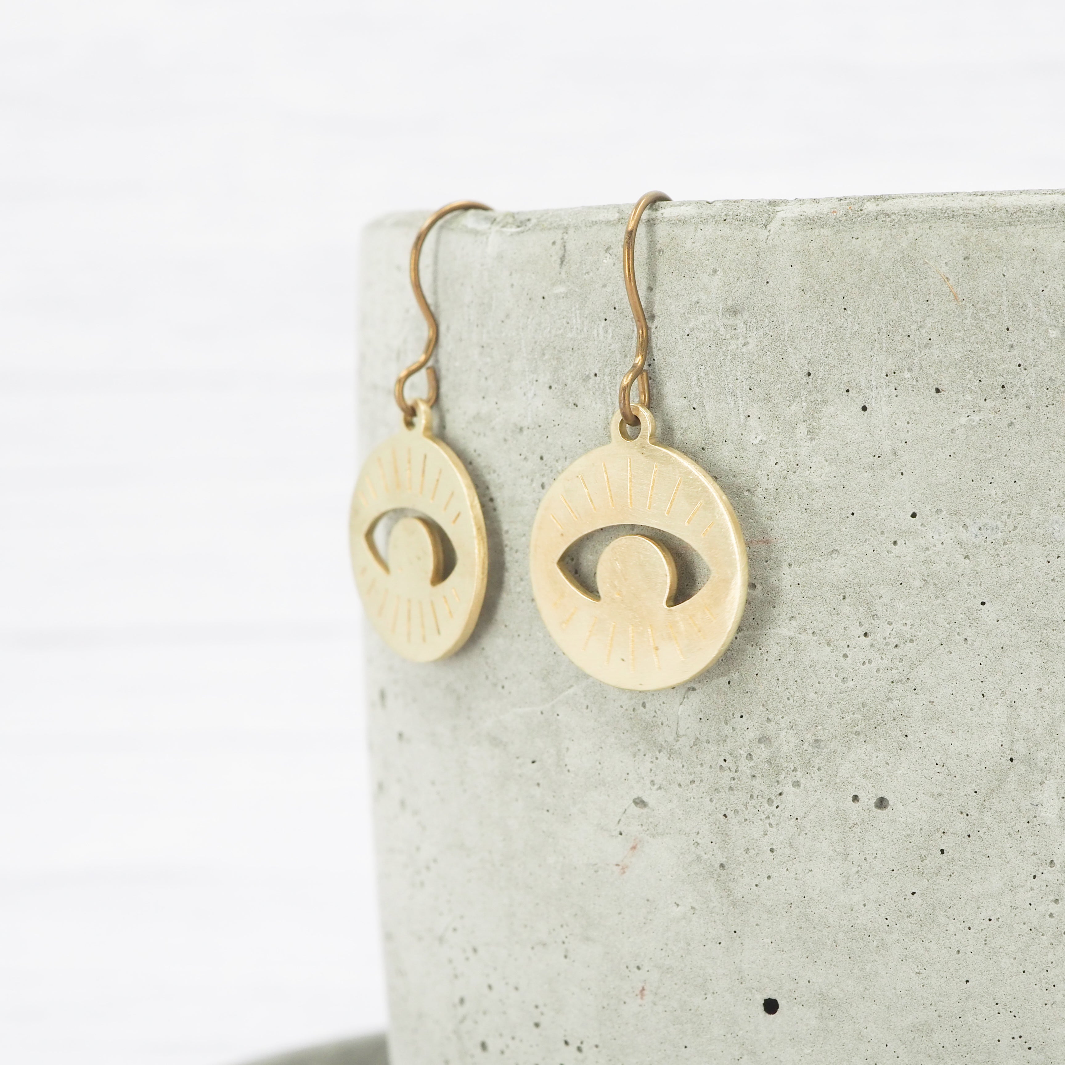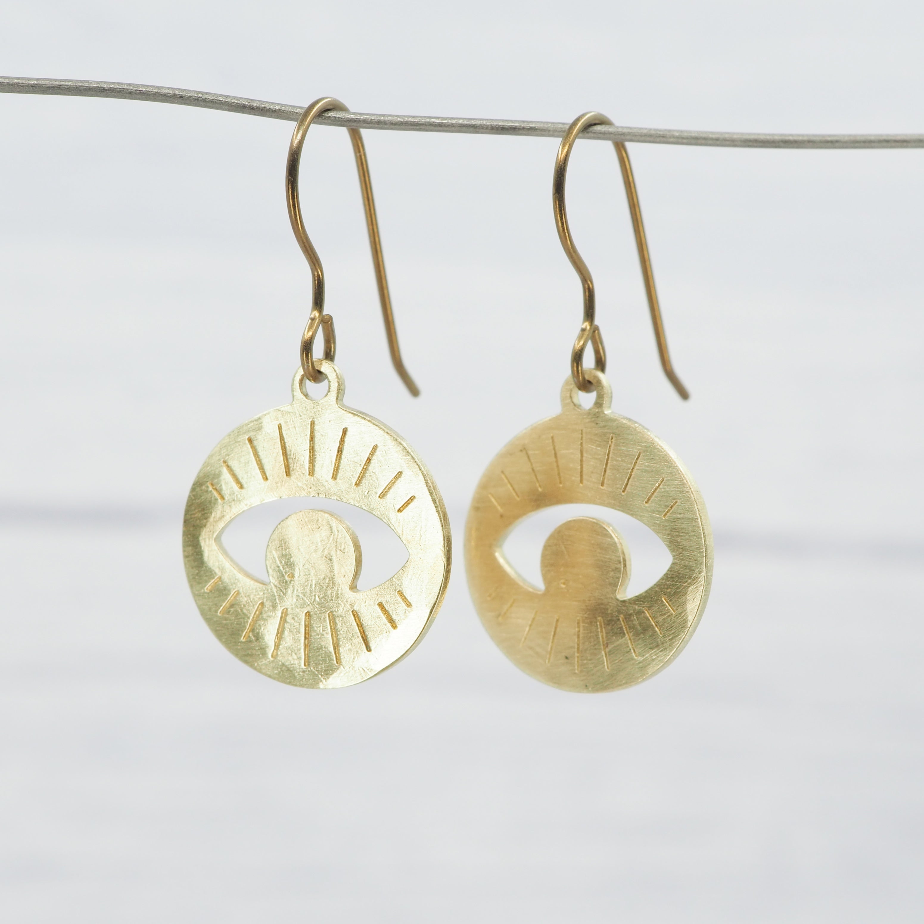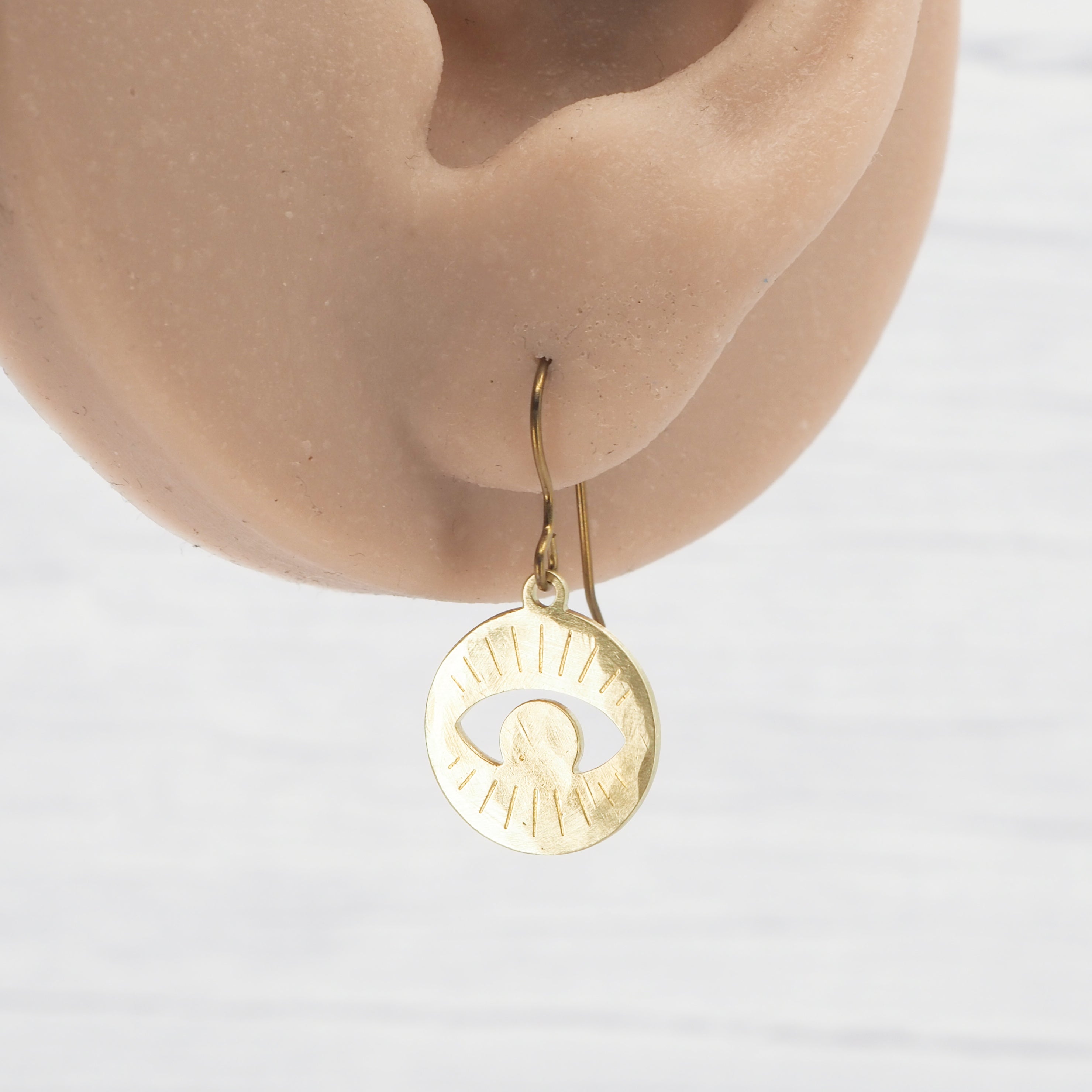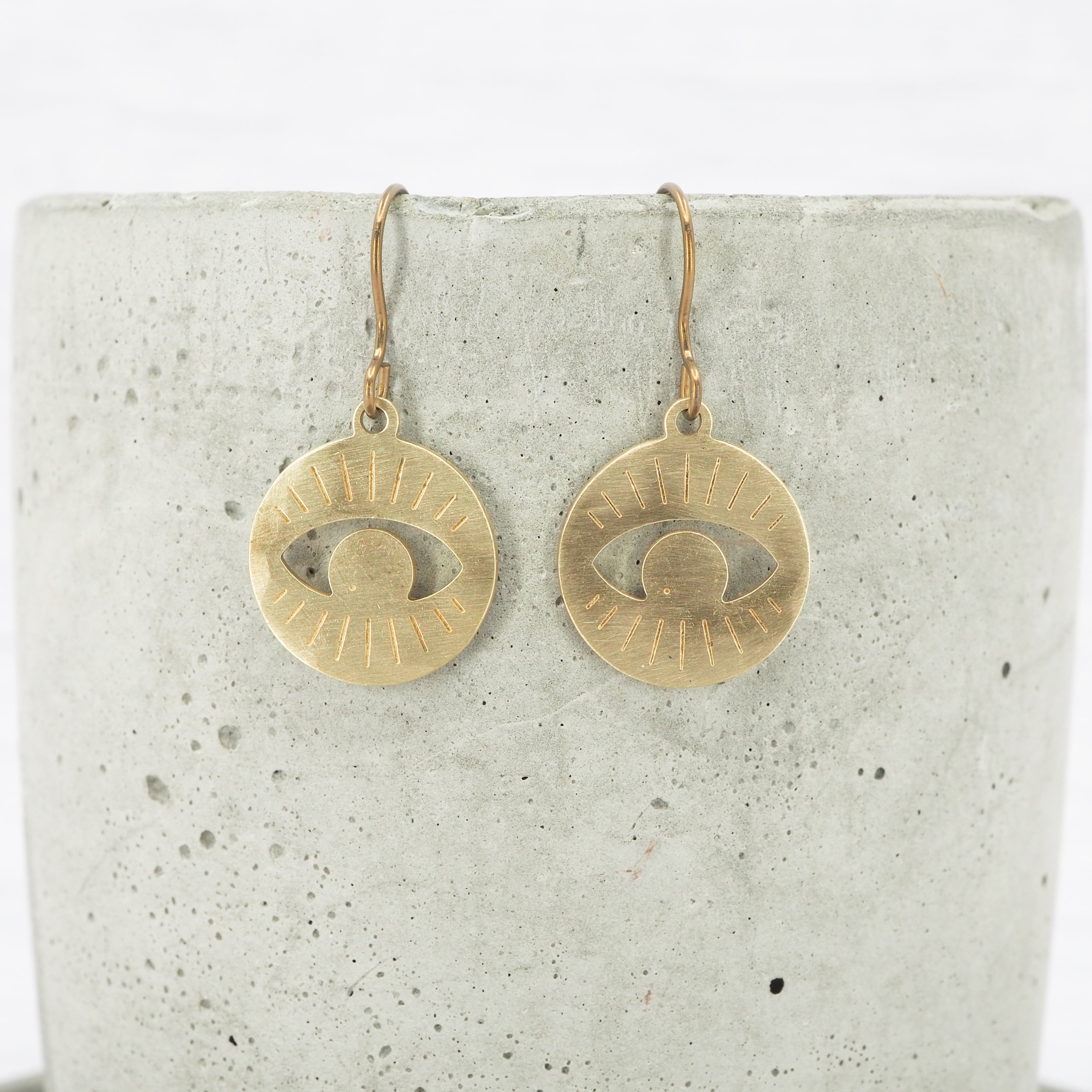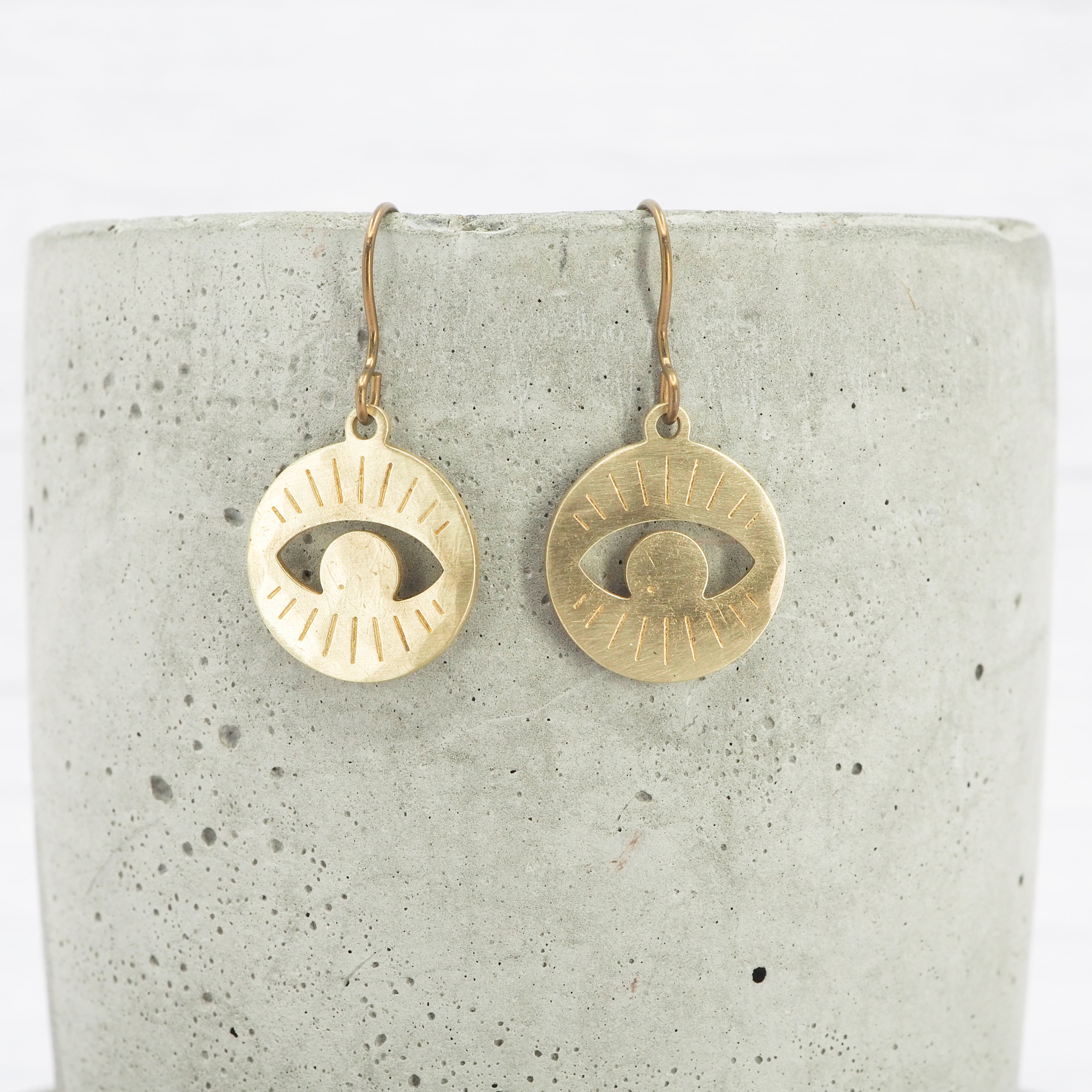 Brass hand-hammered Eye disk dangle earrings.