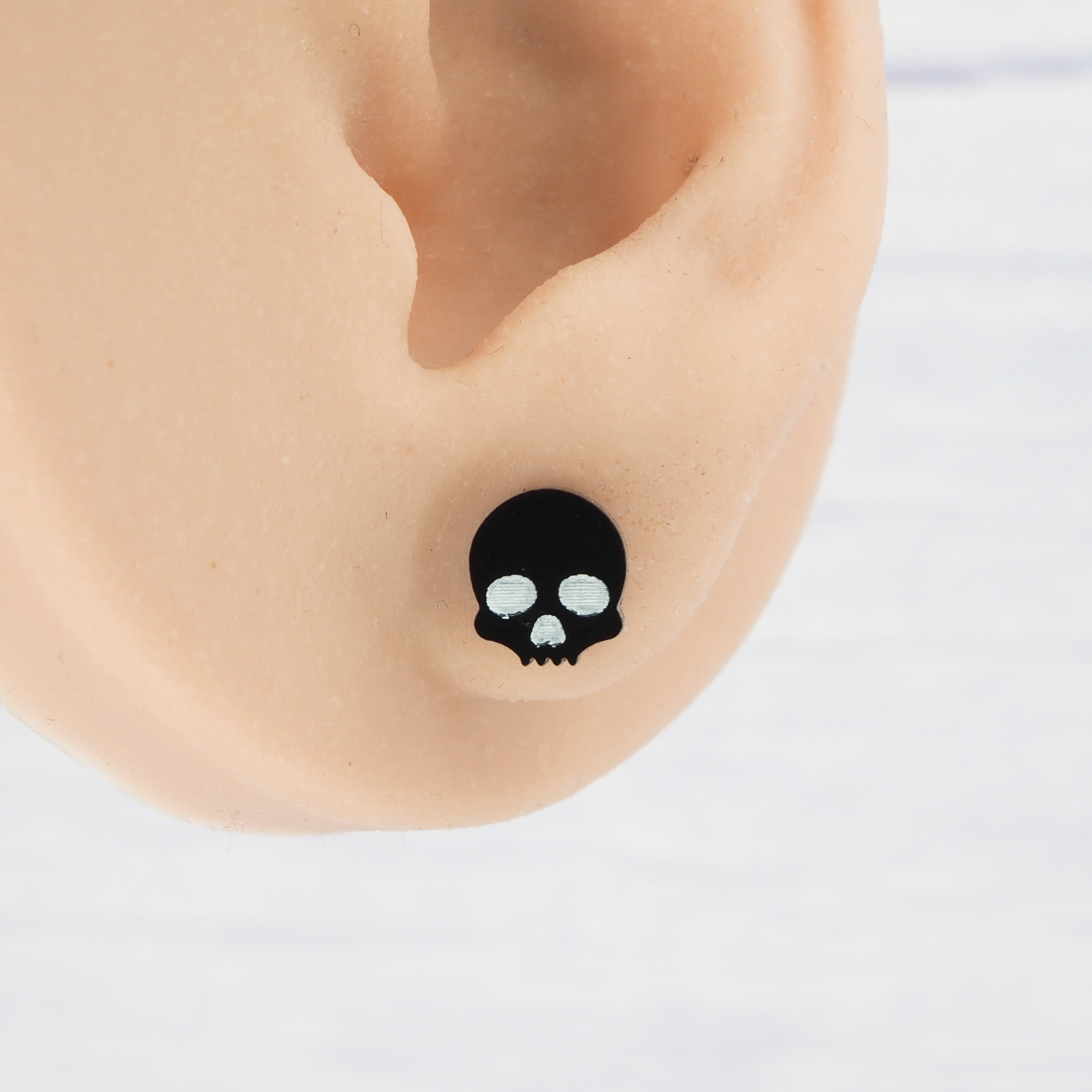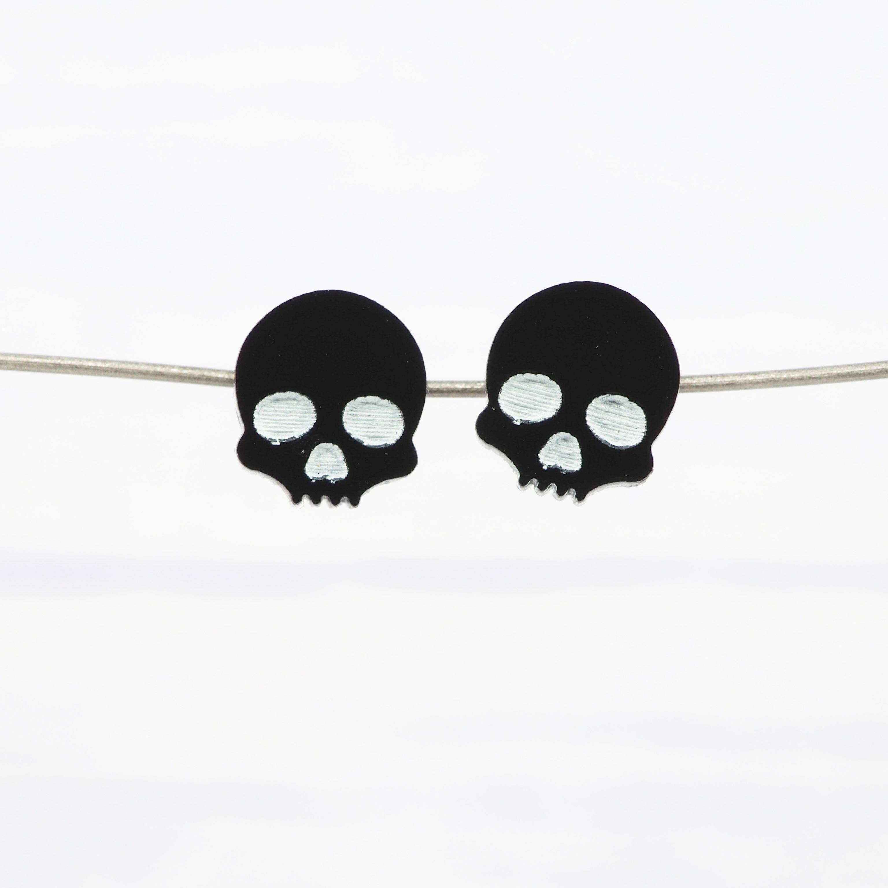 Glossy black small skull acrylic studs with 0.7mm ear stems.
