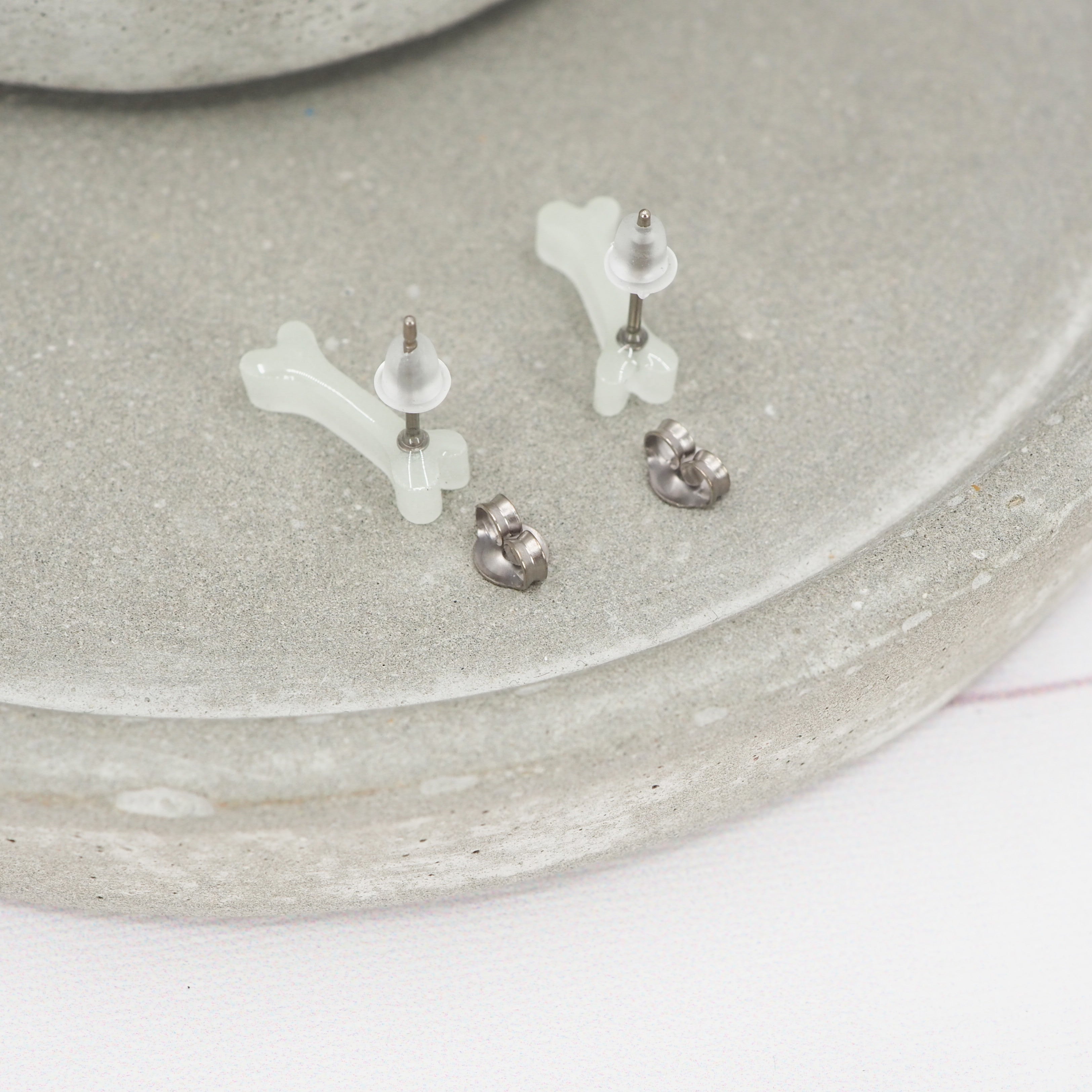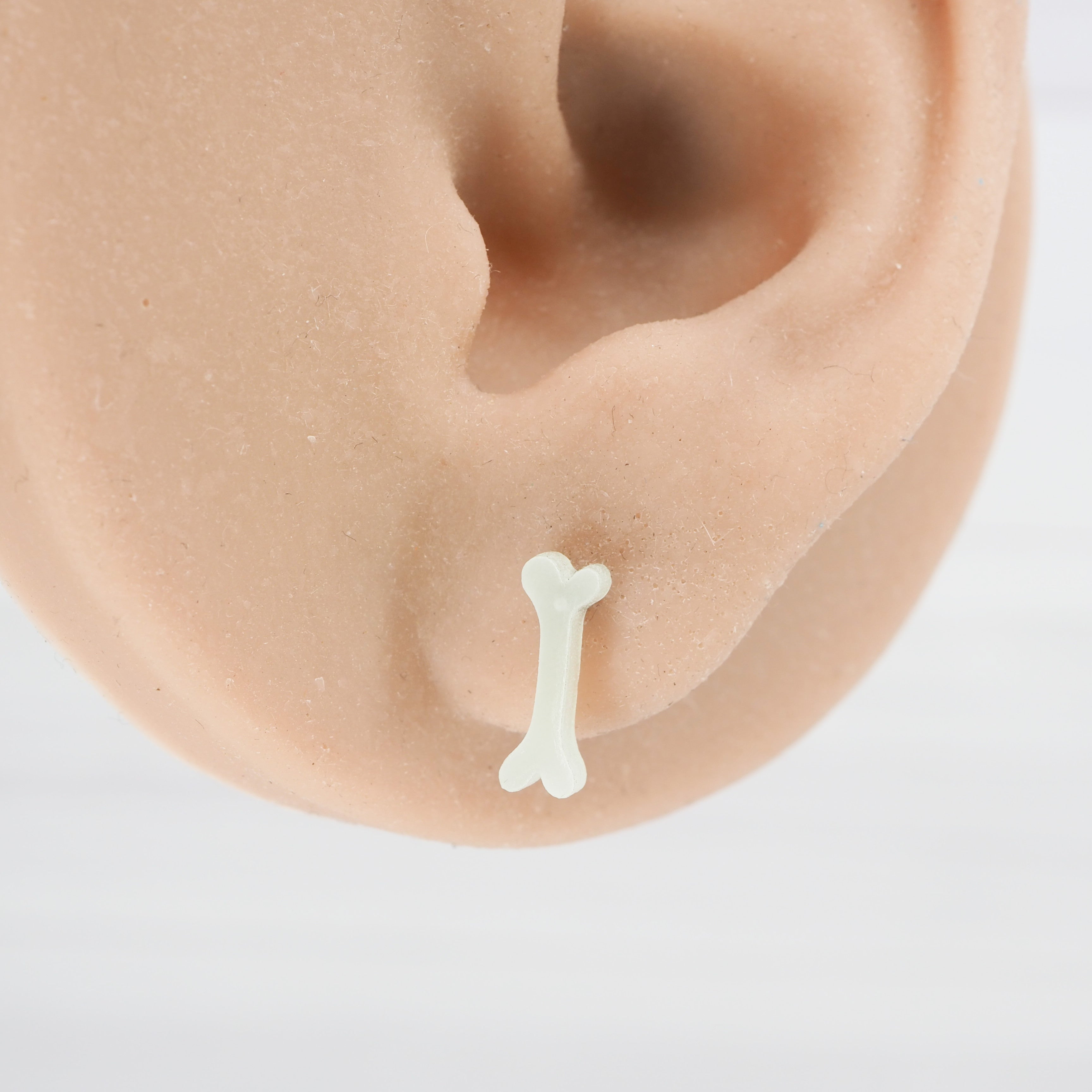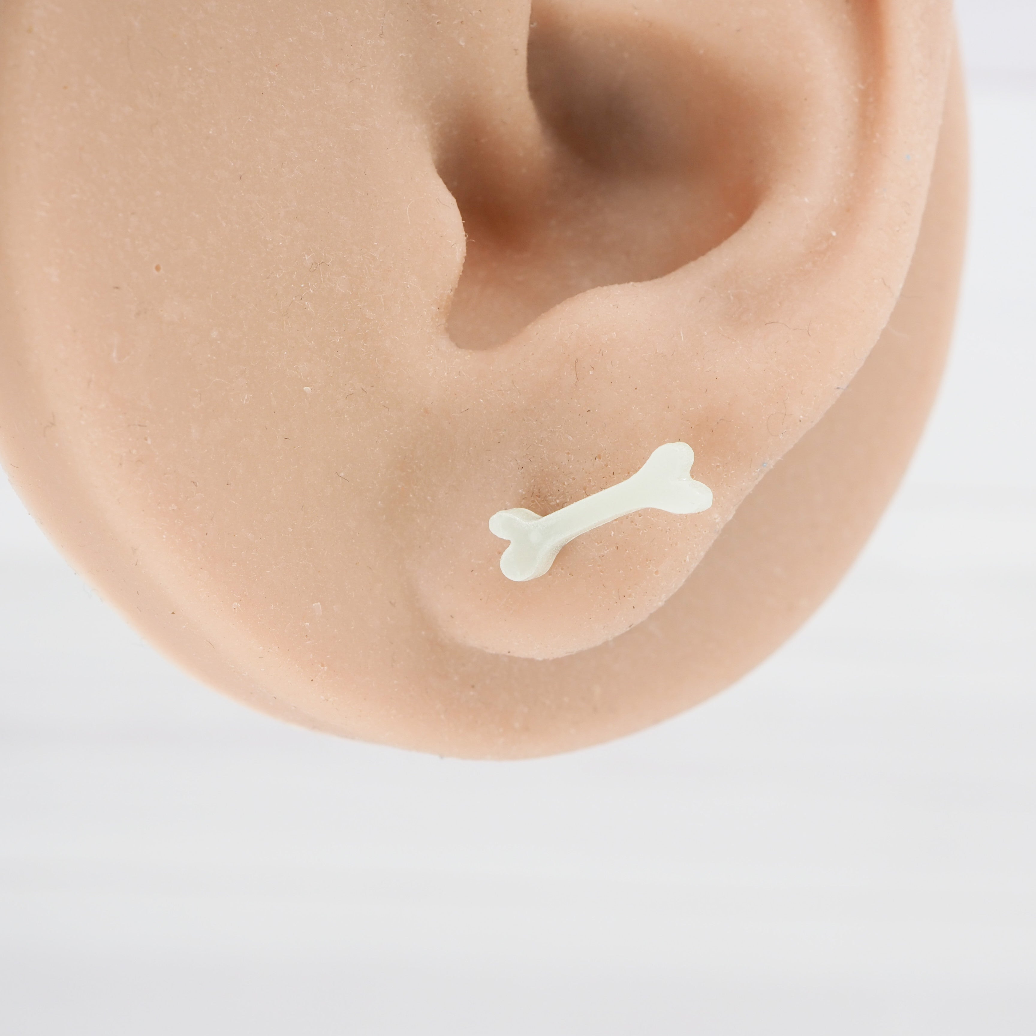 Glow in the dark bone studs with 0.7mm Grade 1 titanium ear stems.