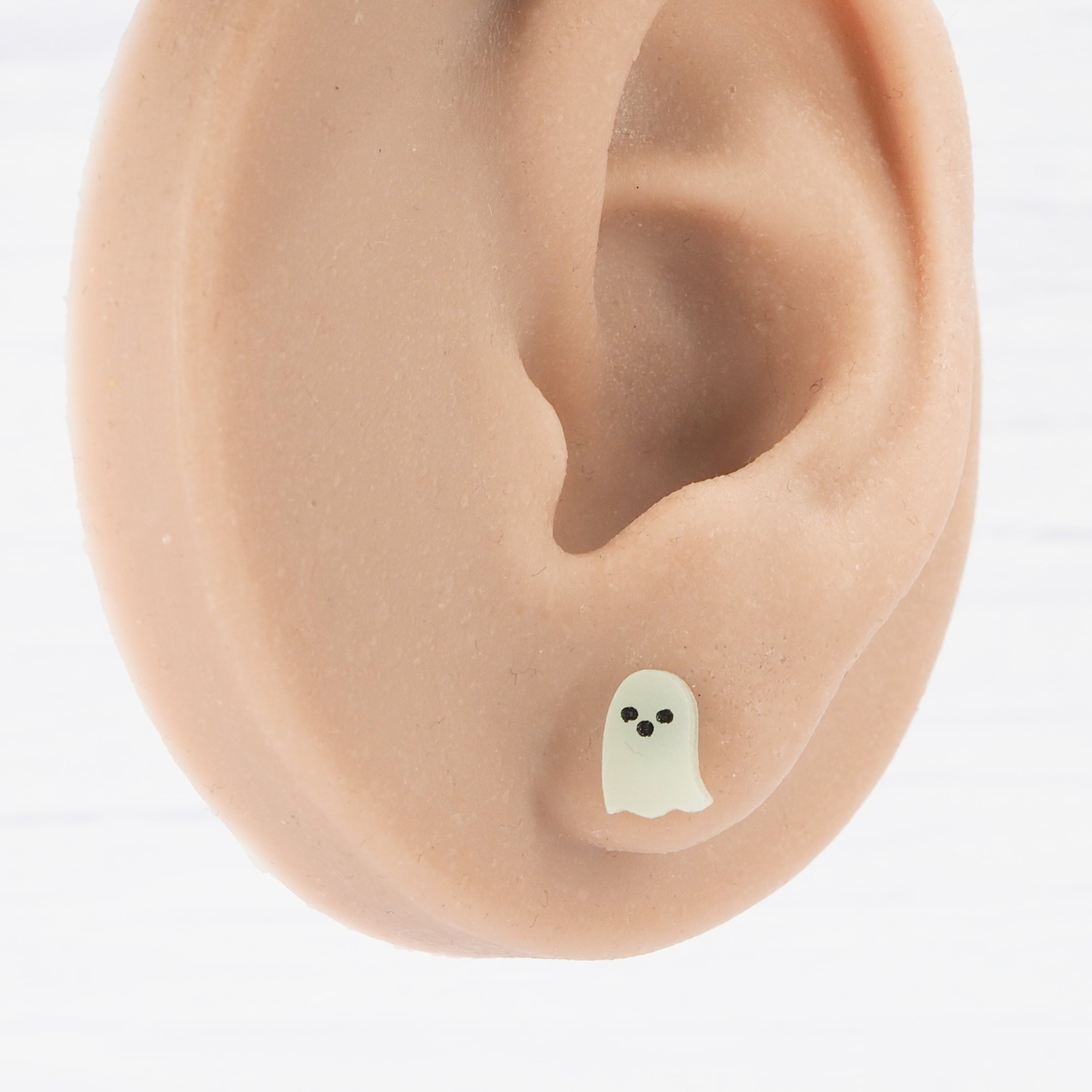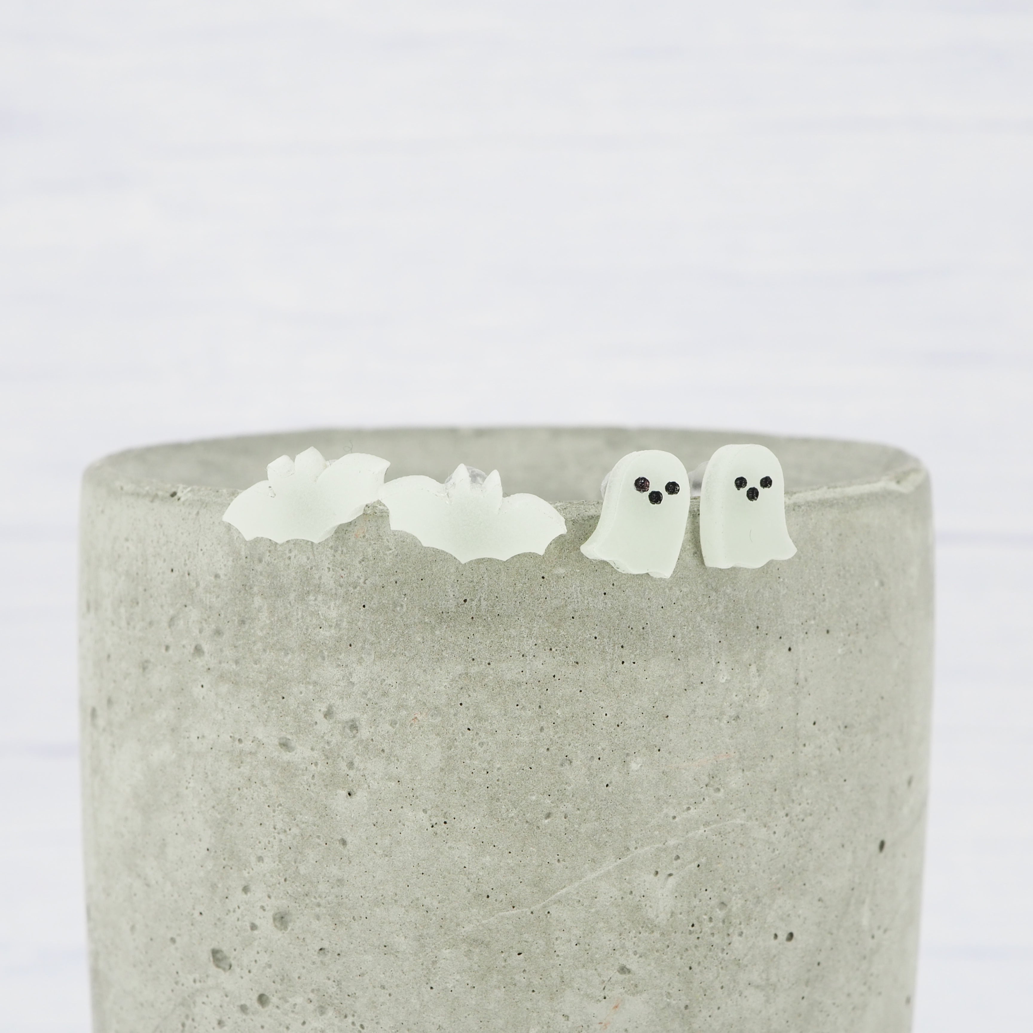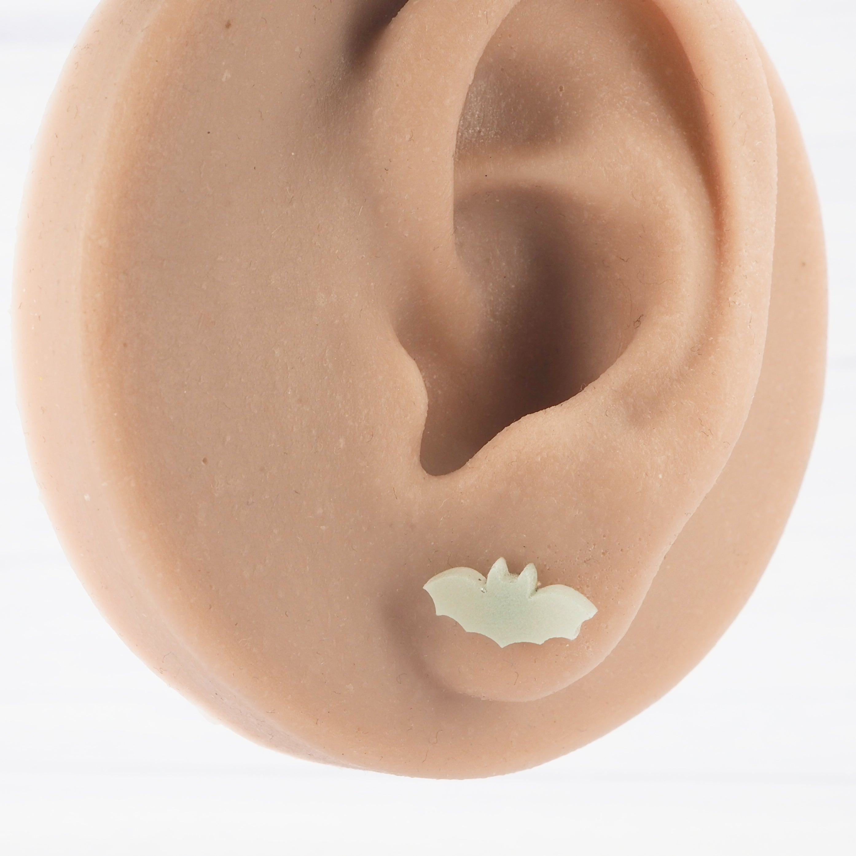 Glow-in-the-dark mini Ghost and Bat studs with 0.7mm Grade 1 titanium ear stems.