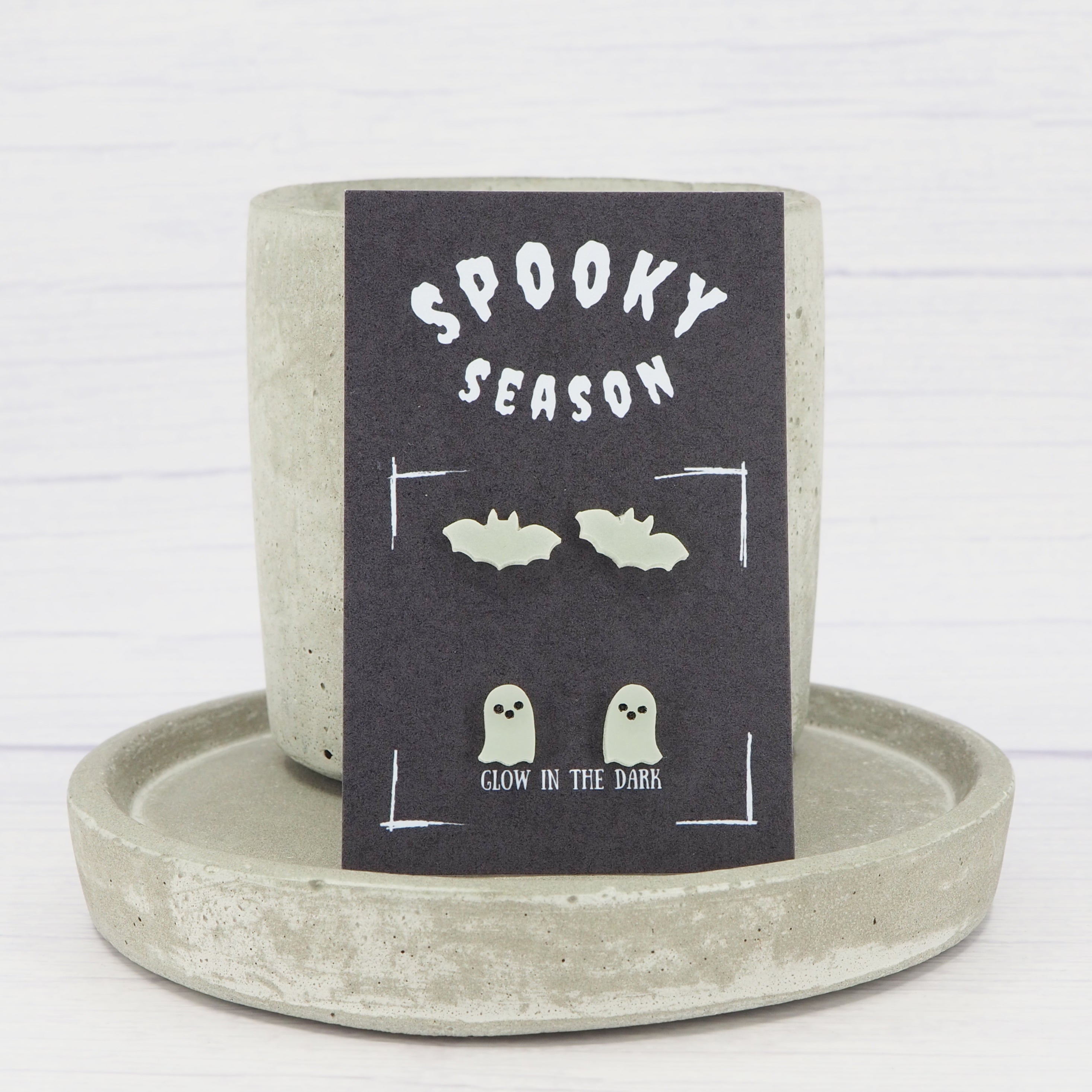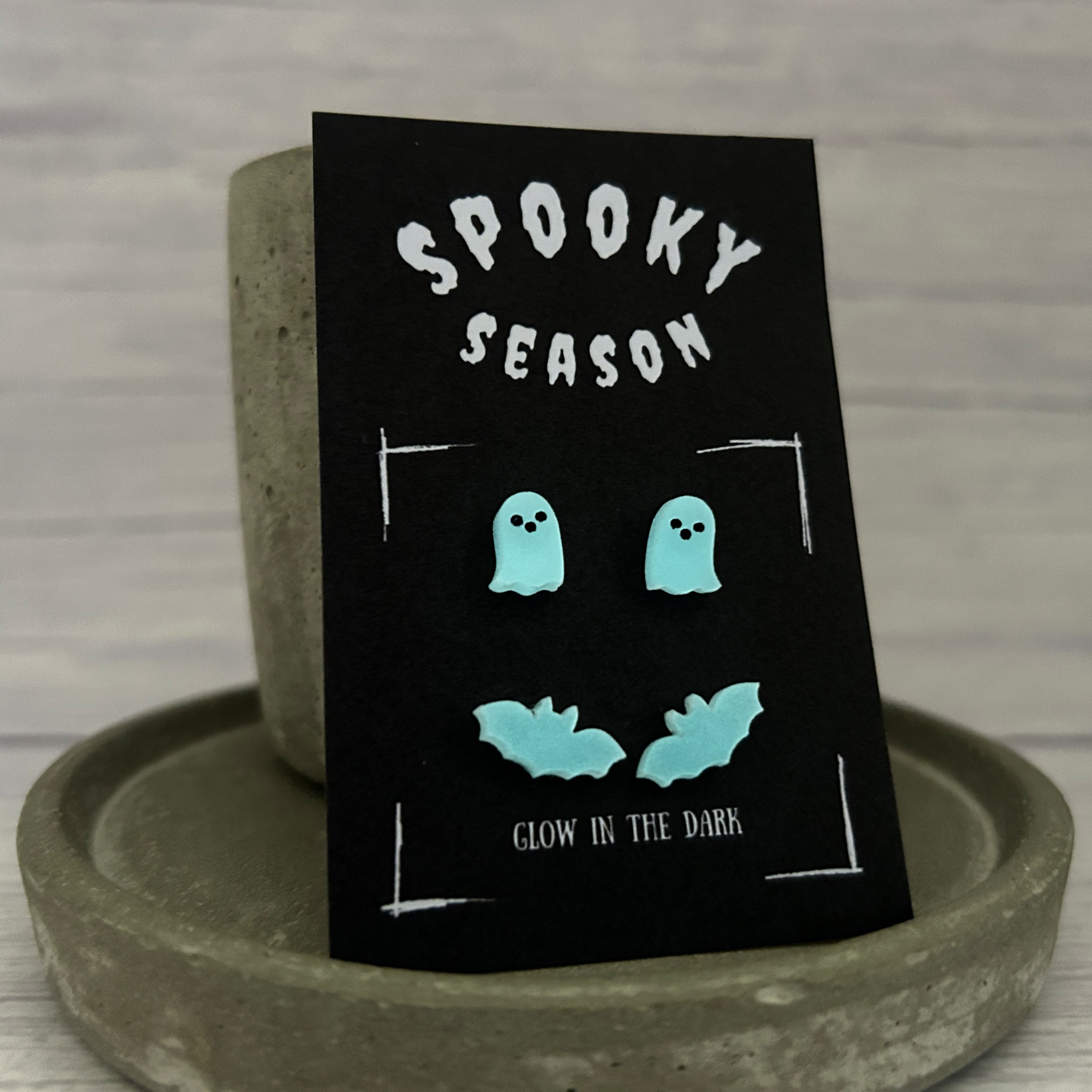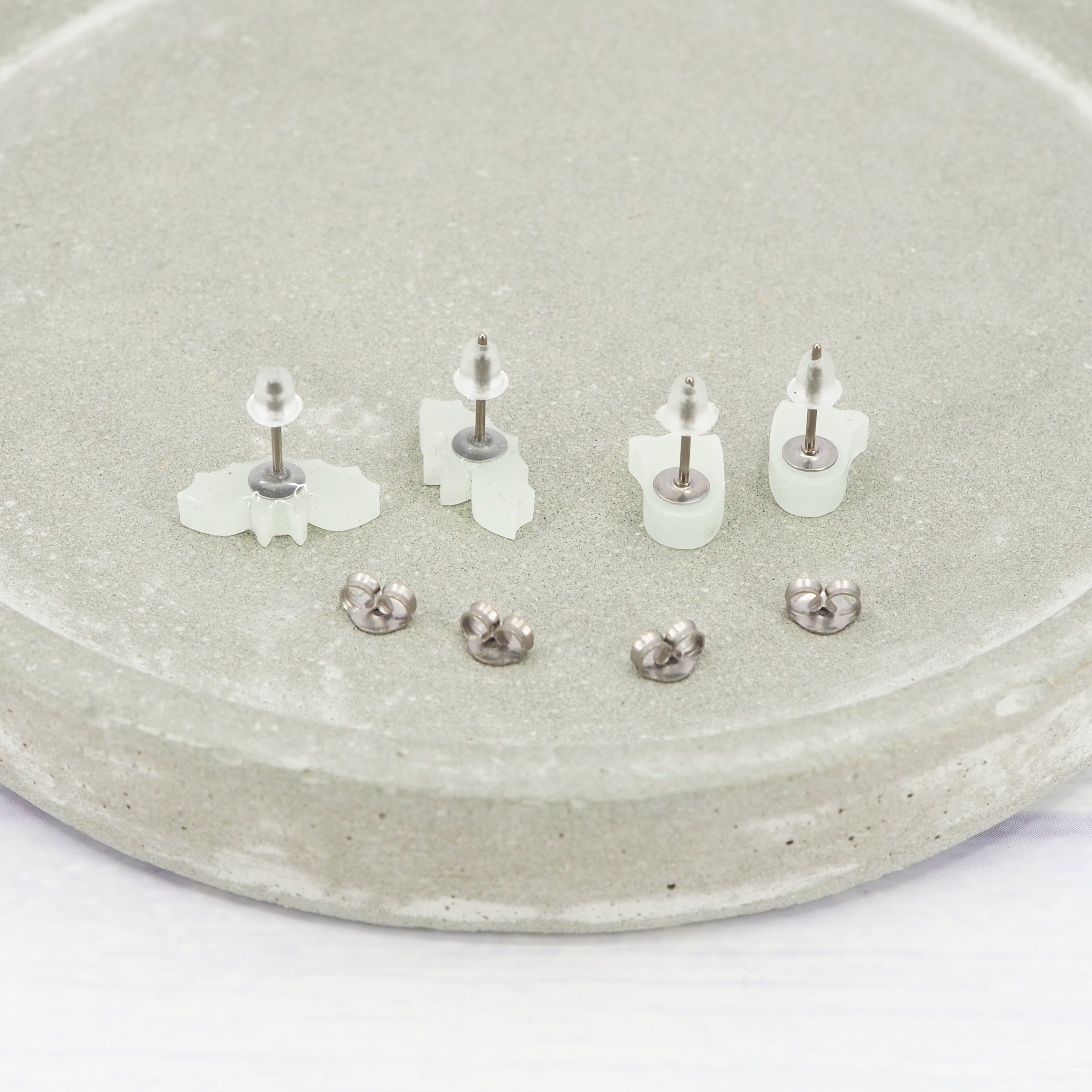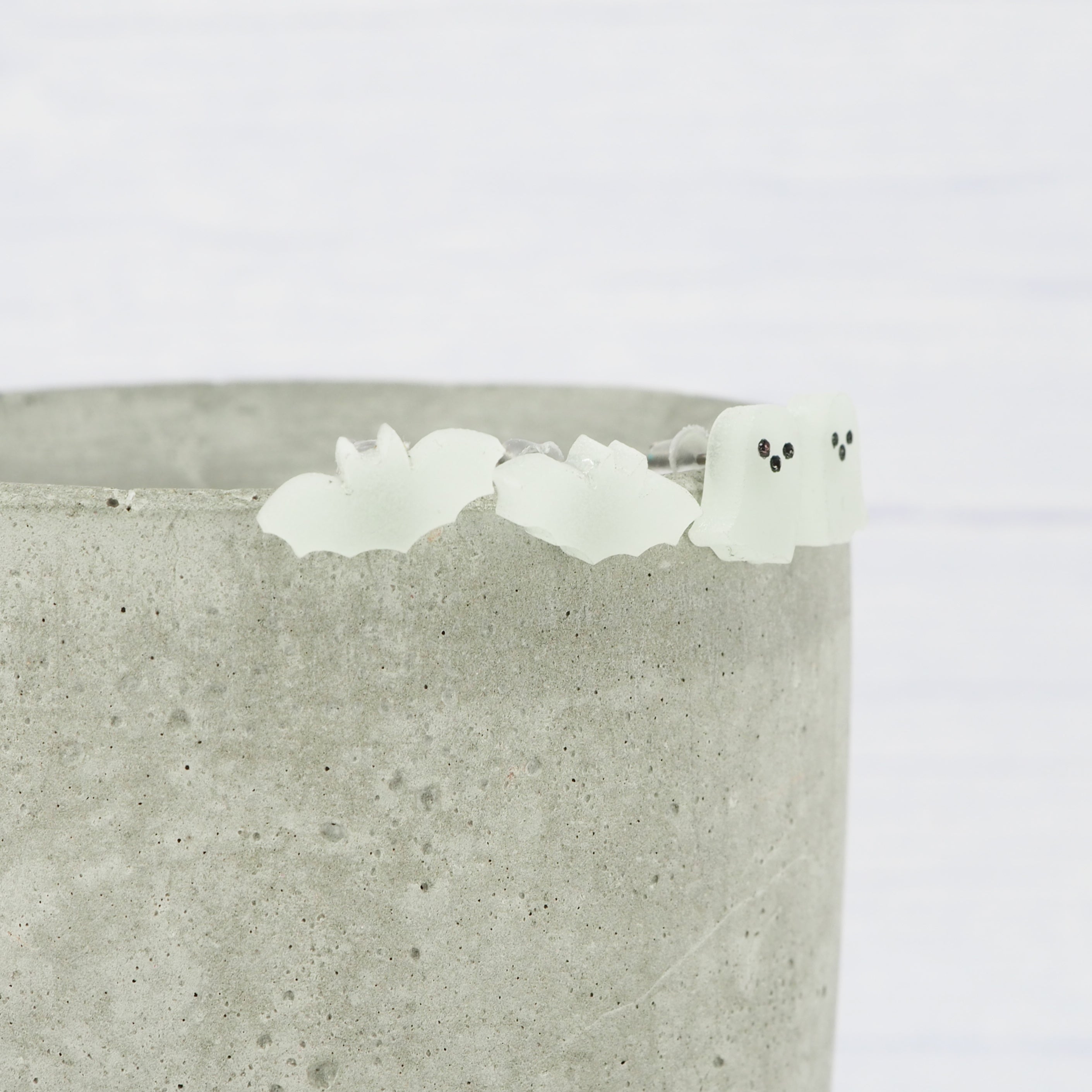 Glow-in-the-dark mini Ghost and Bat studs with 0.7mm Grade 1 titanium ear stems.