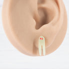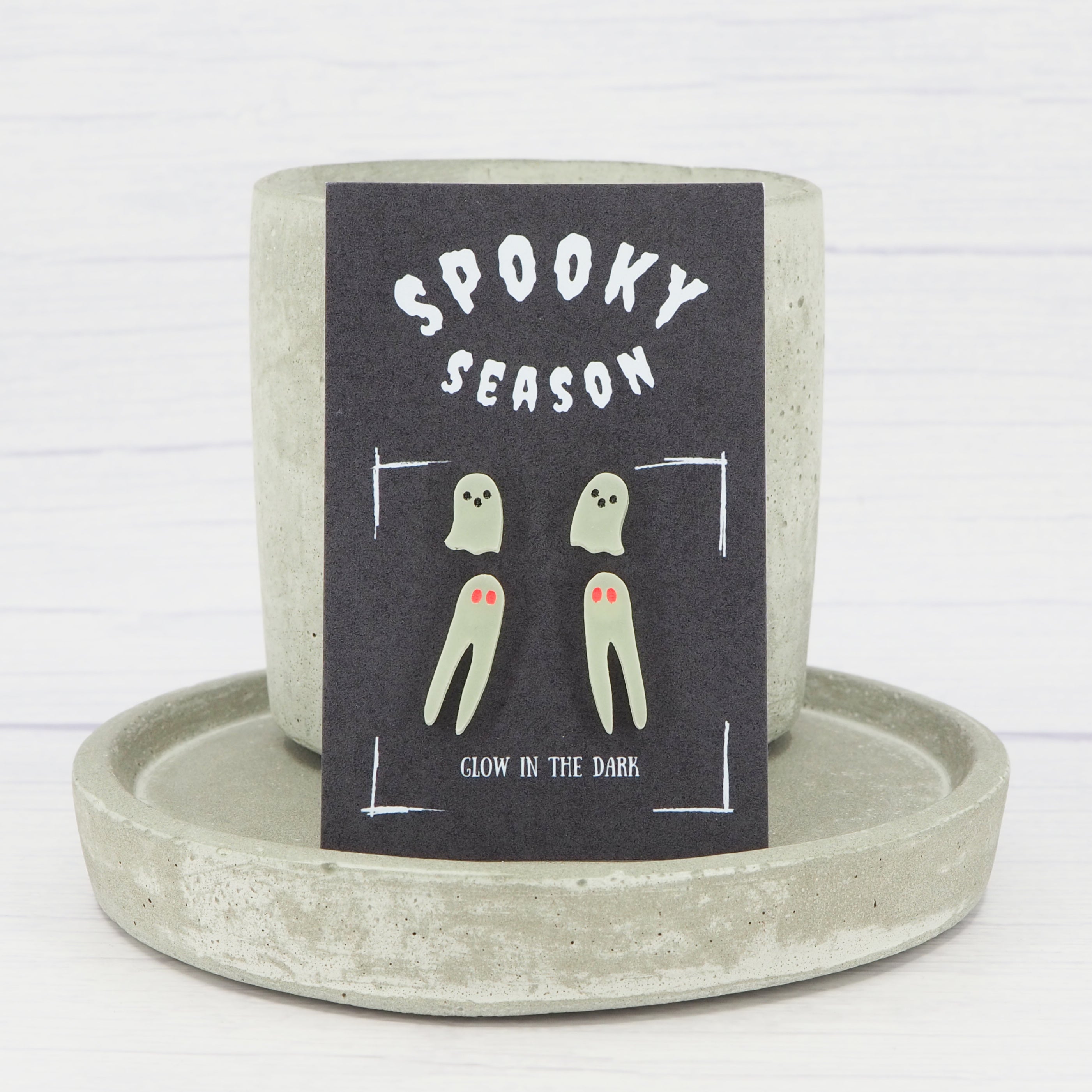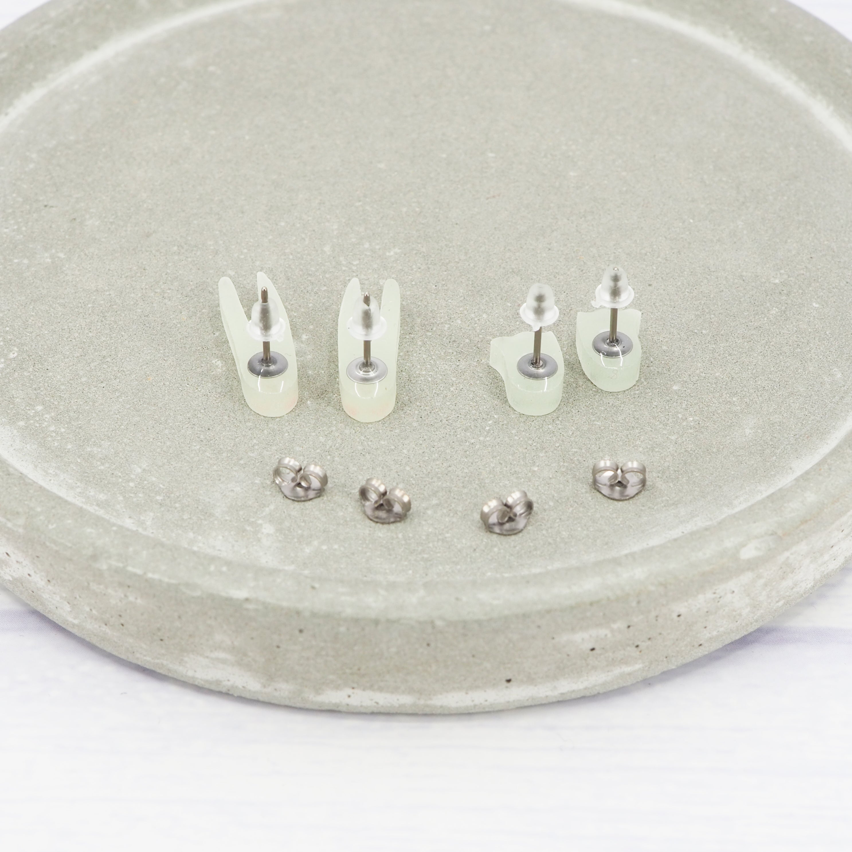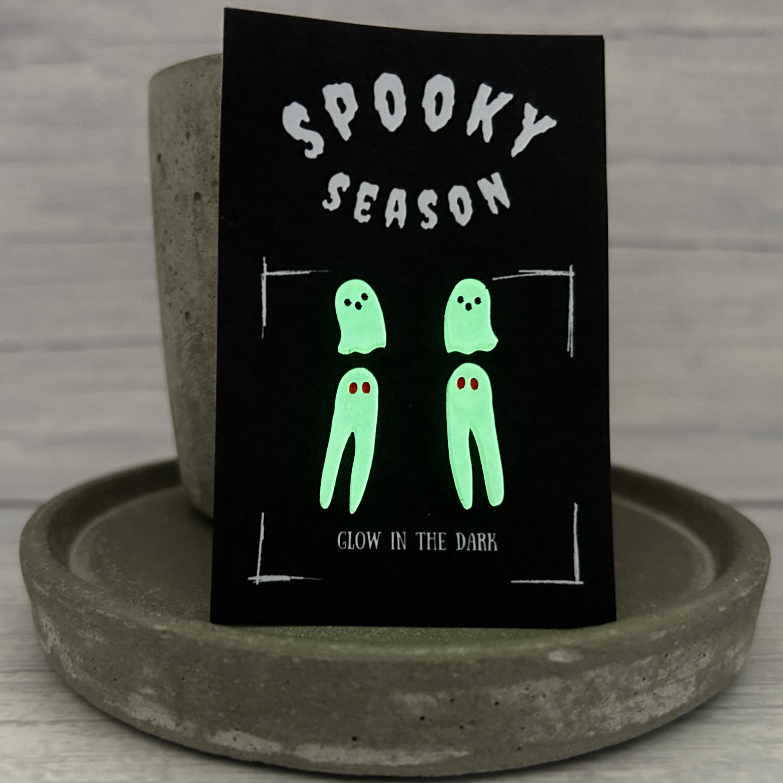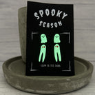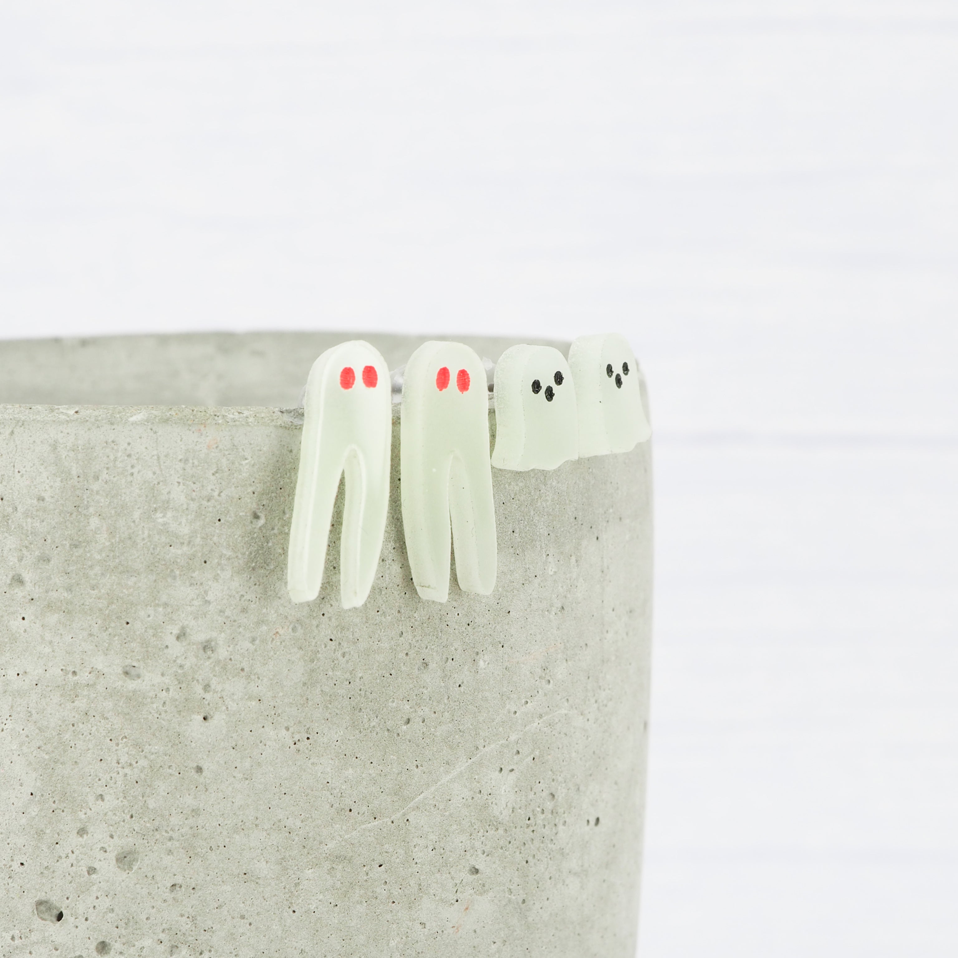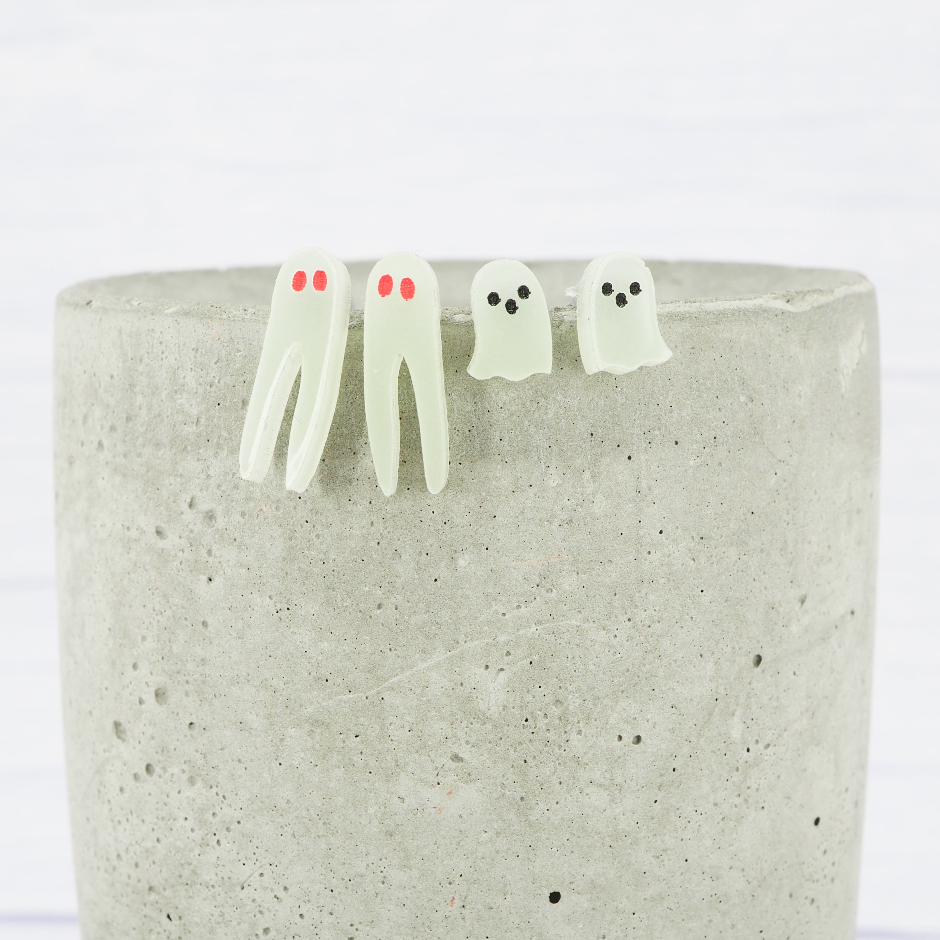 Glow-in-the-dark mini Ghost and Fresno Nightcrawler studs with 0.7mm Grade 1 titanium ear stems.