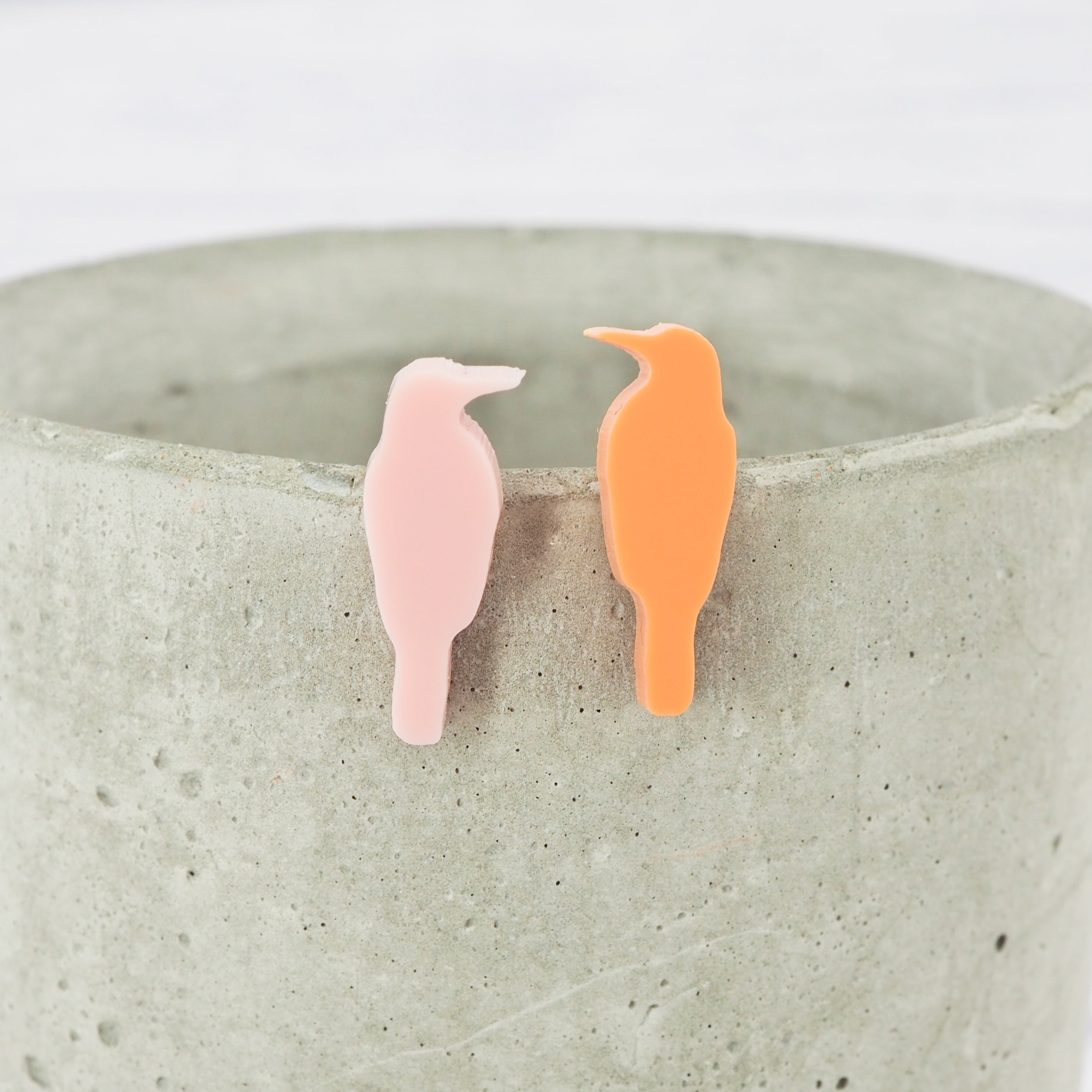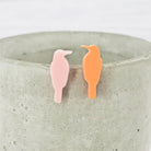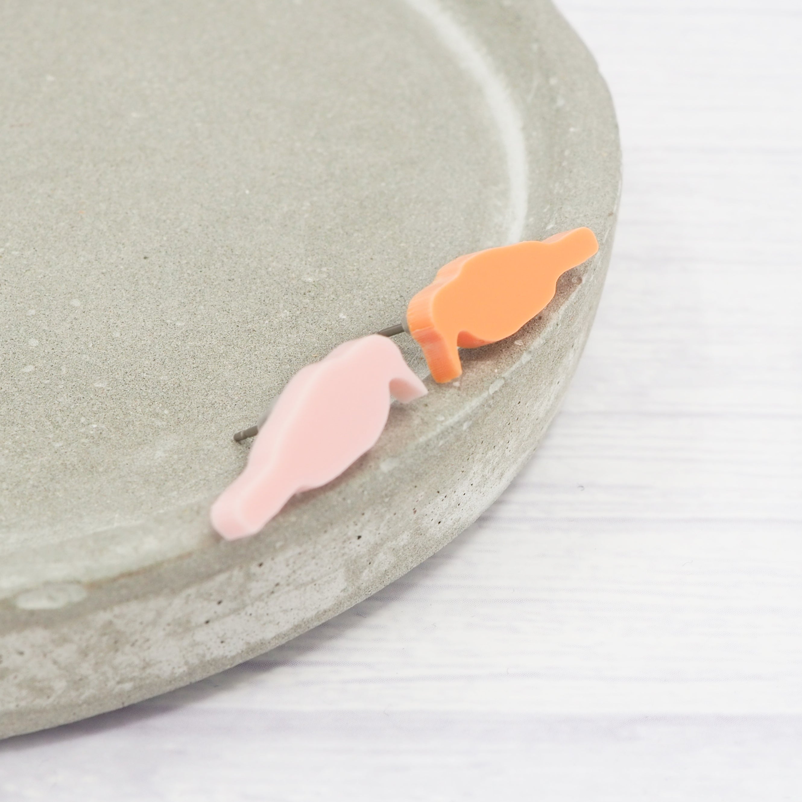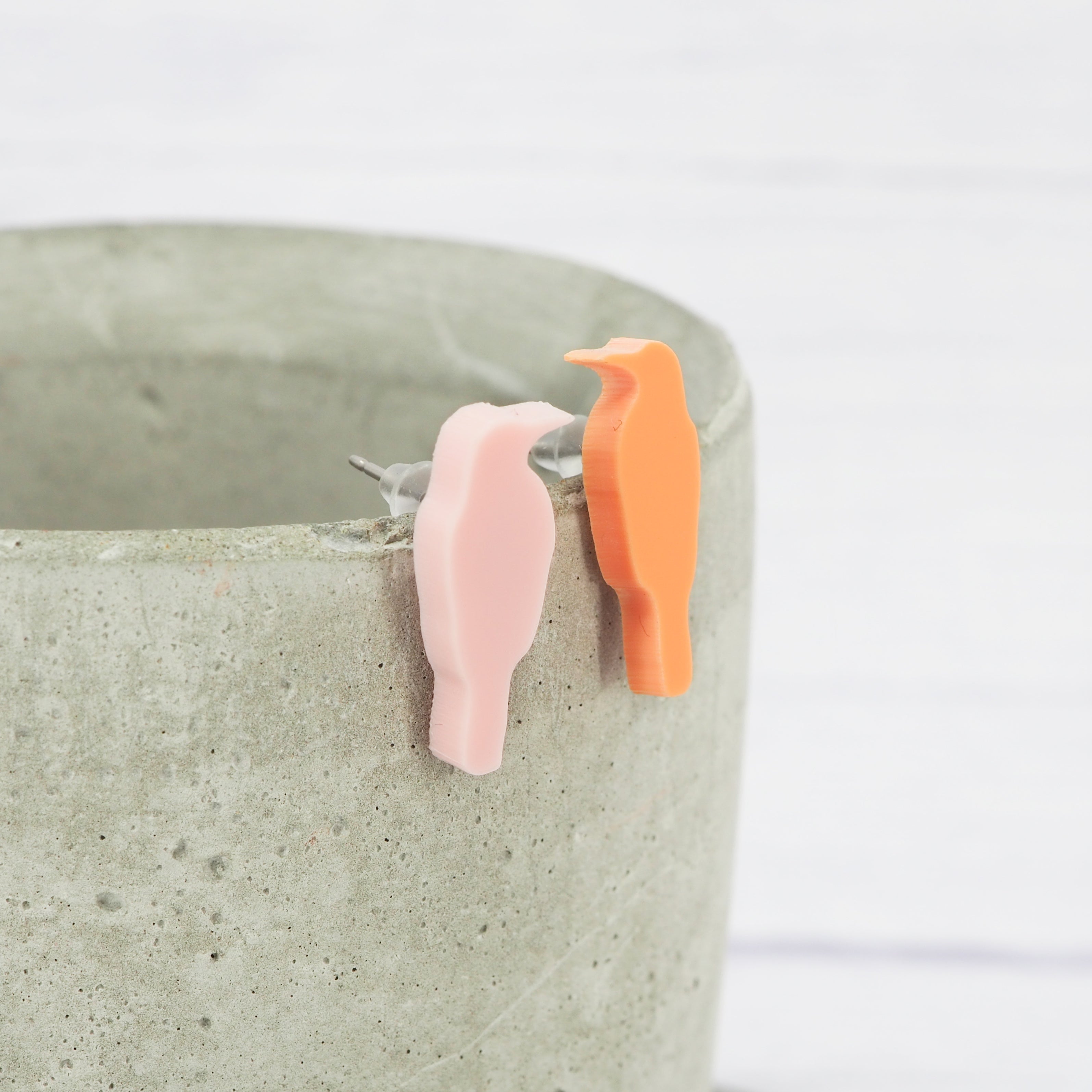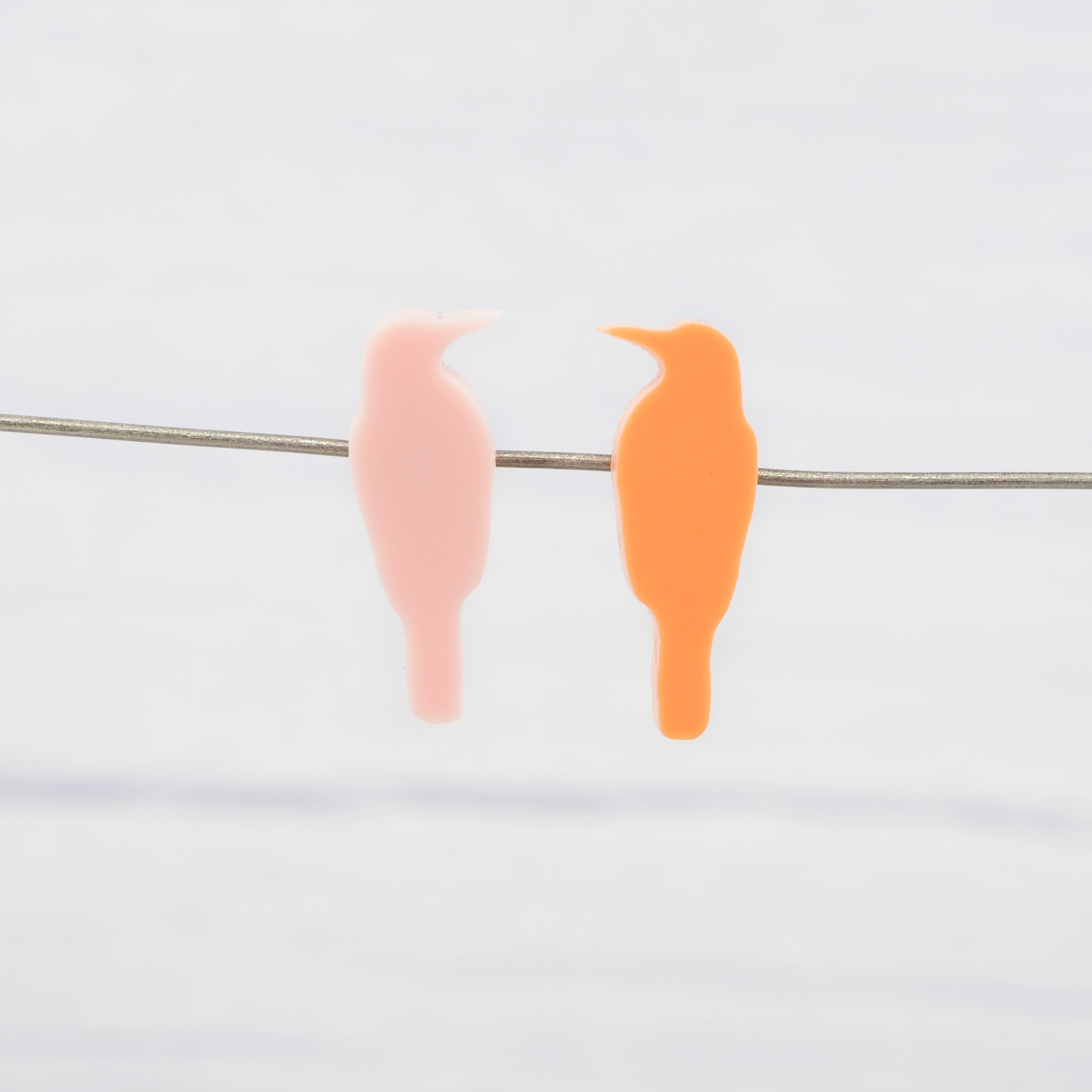 Matte silky orange and glossy pink mismatch birds with 0.7mm grade 1 titanium ear stems.