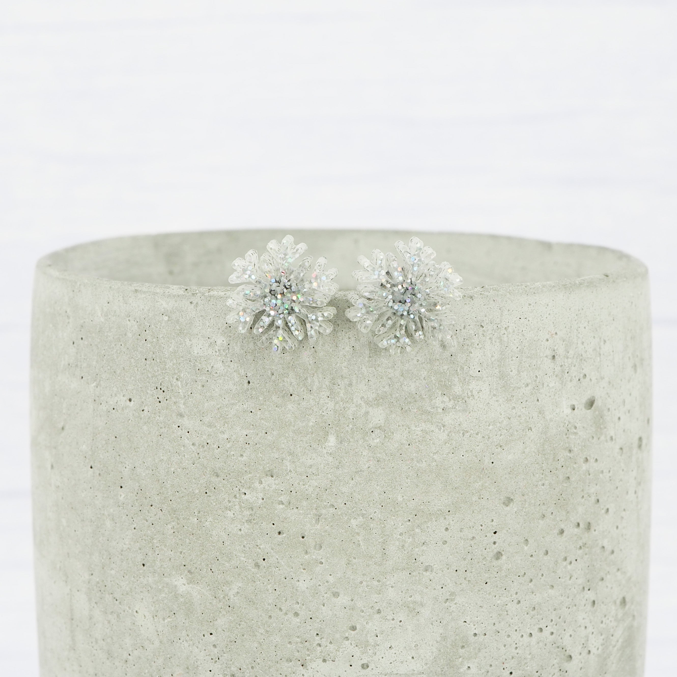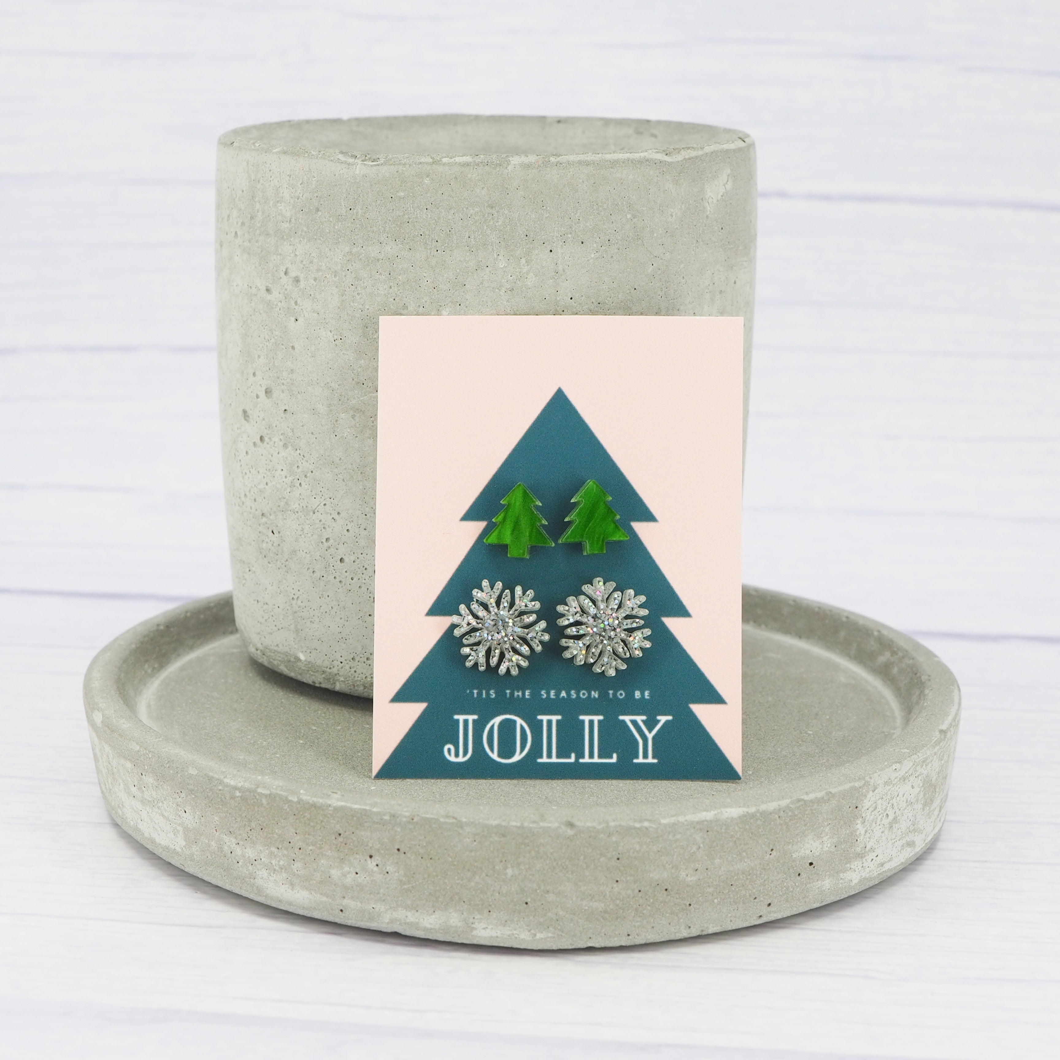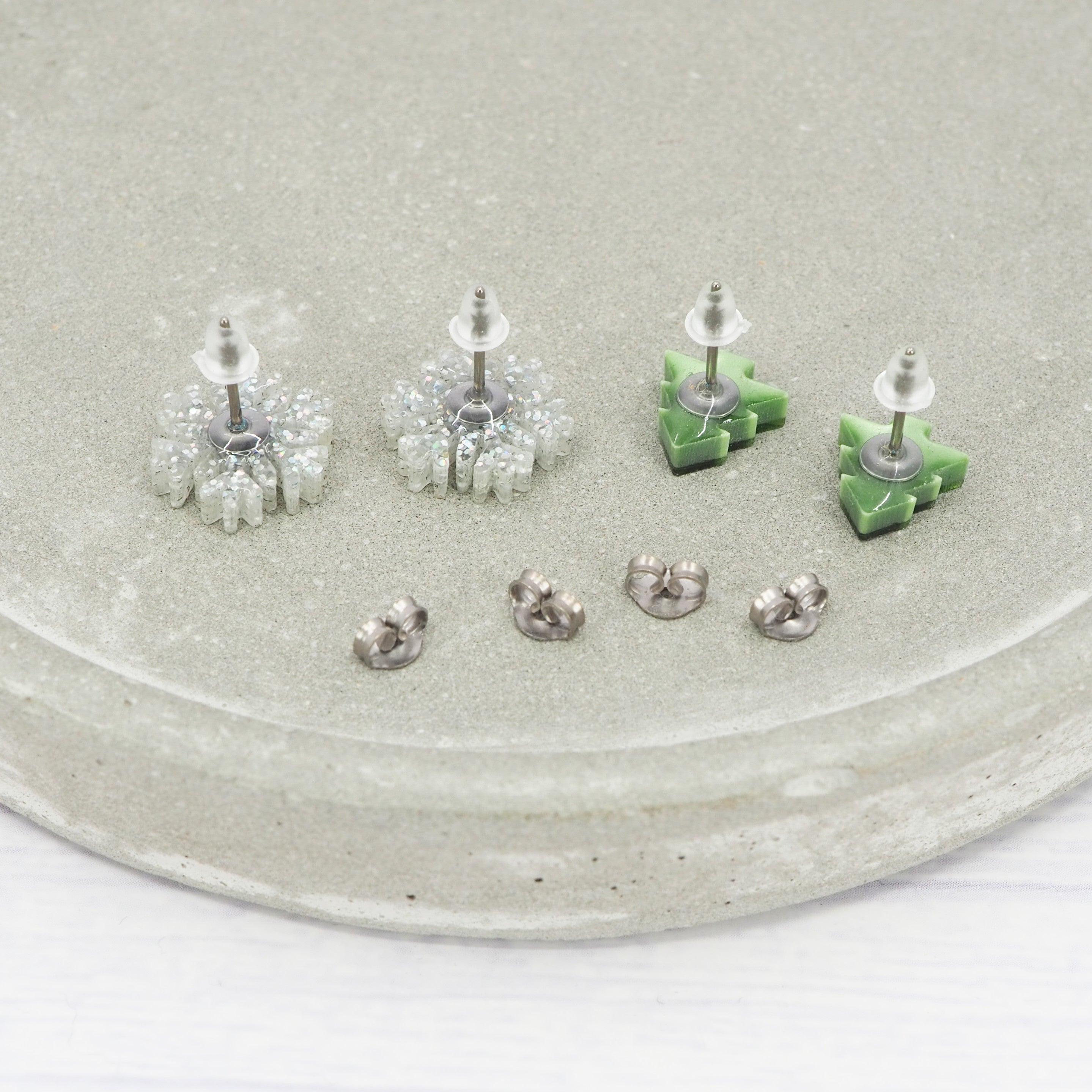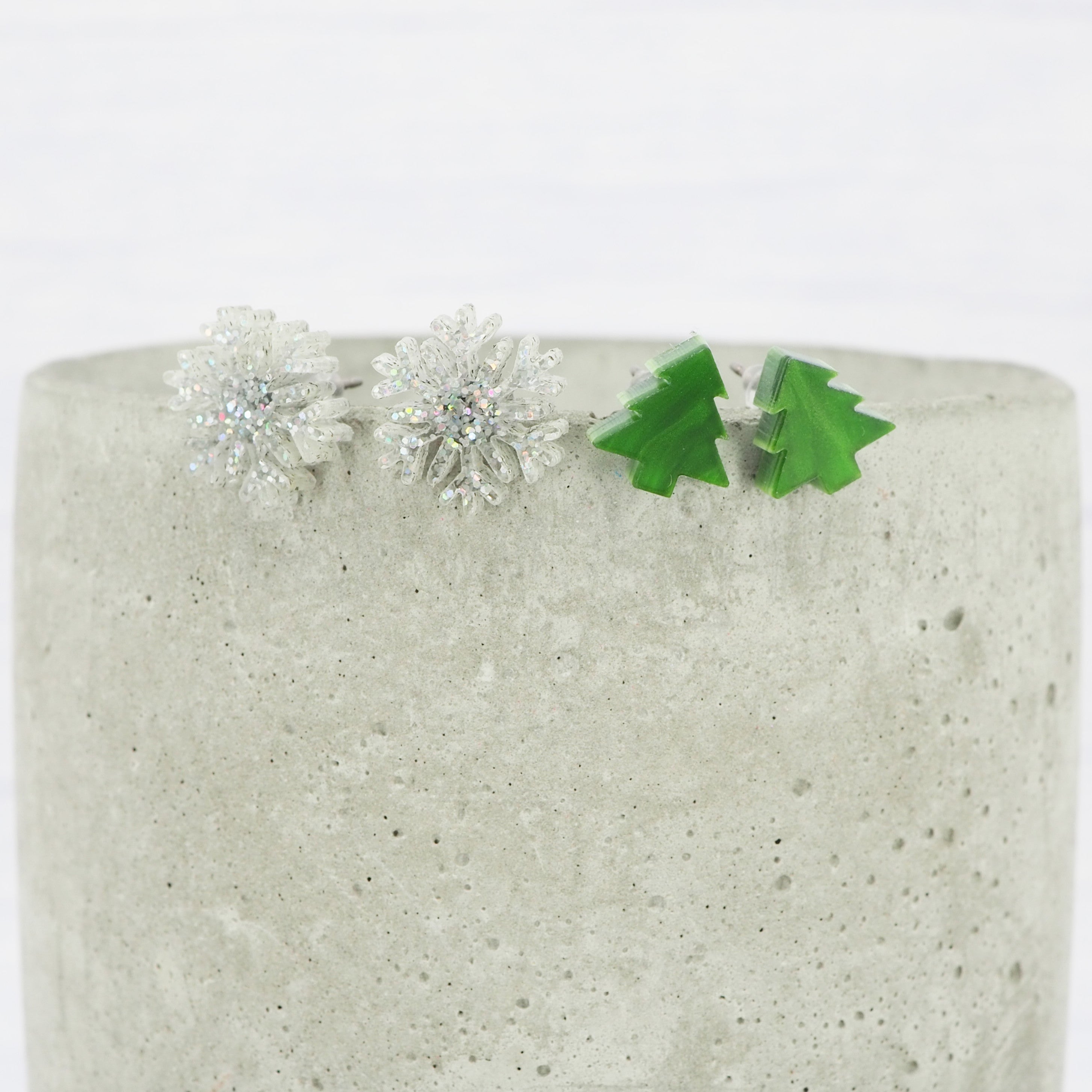 Holographic glitter snowflake and Pearly green Christmas tree acrylic stud set with 0.7mm ear stems.